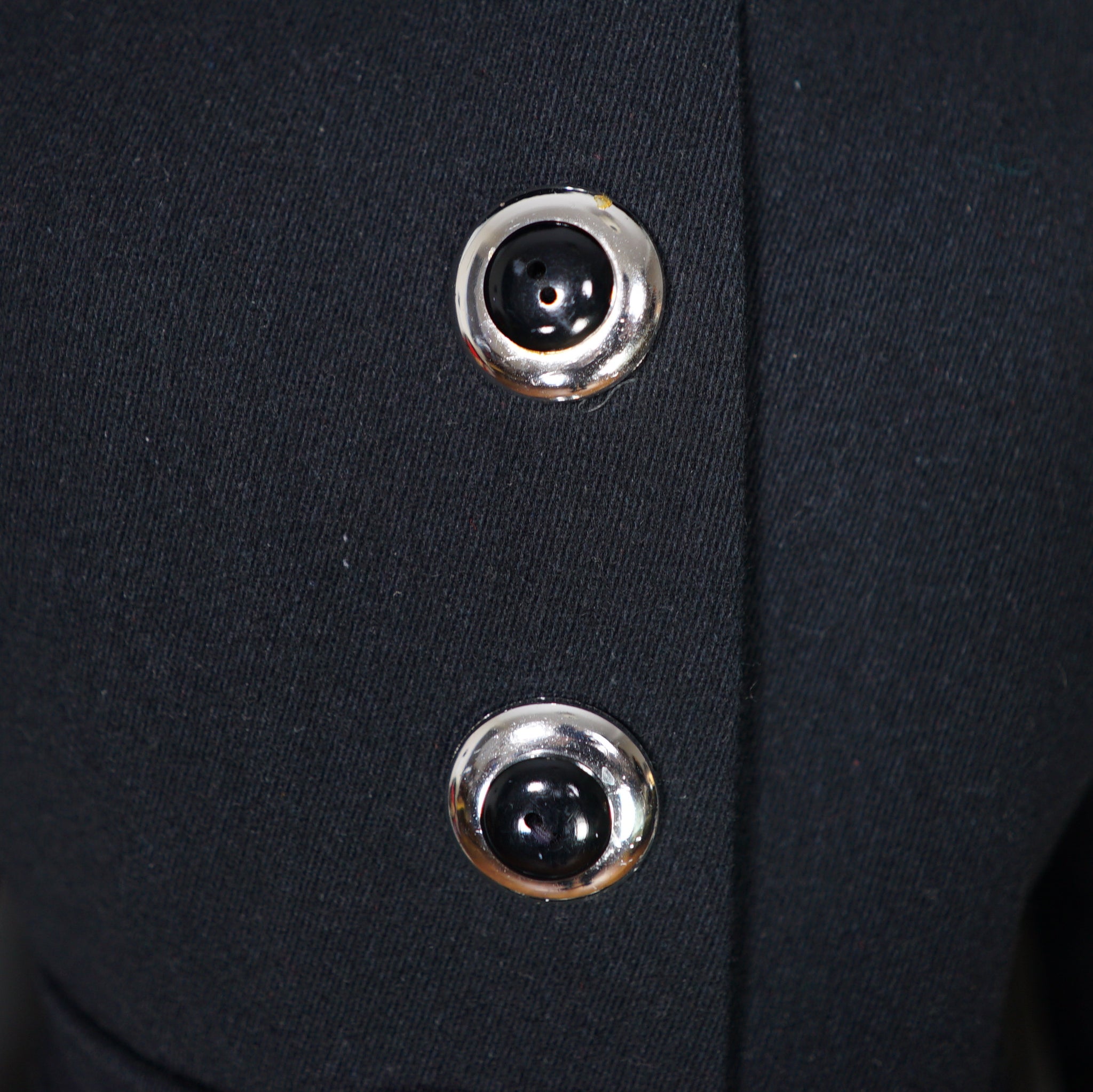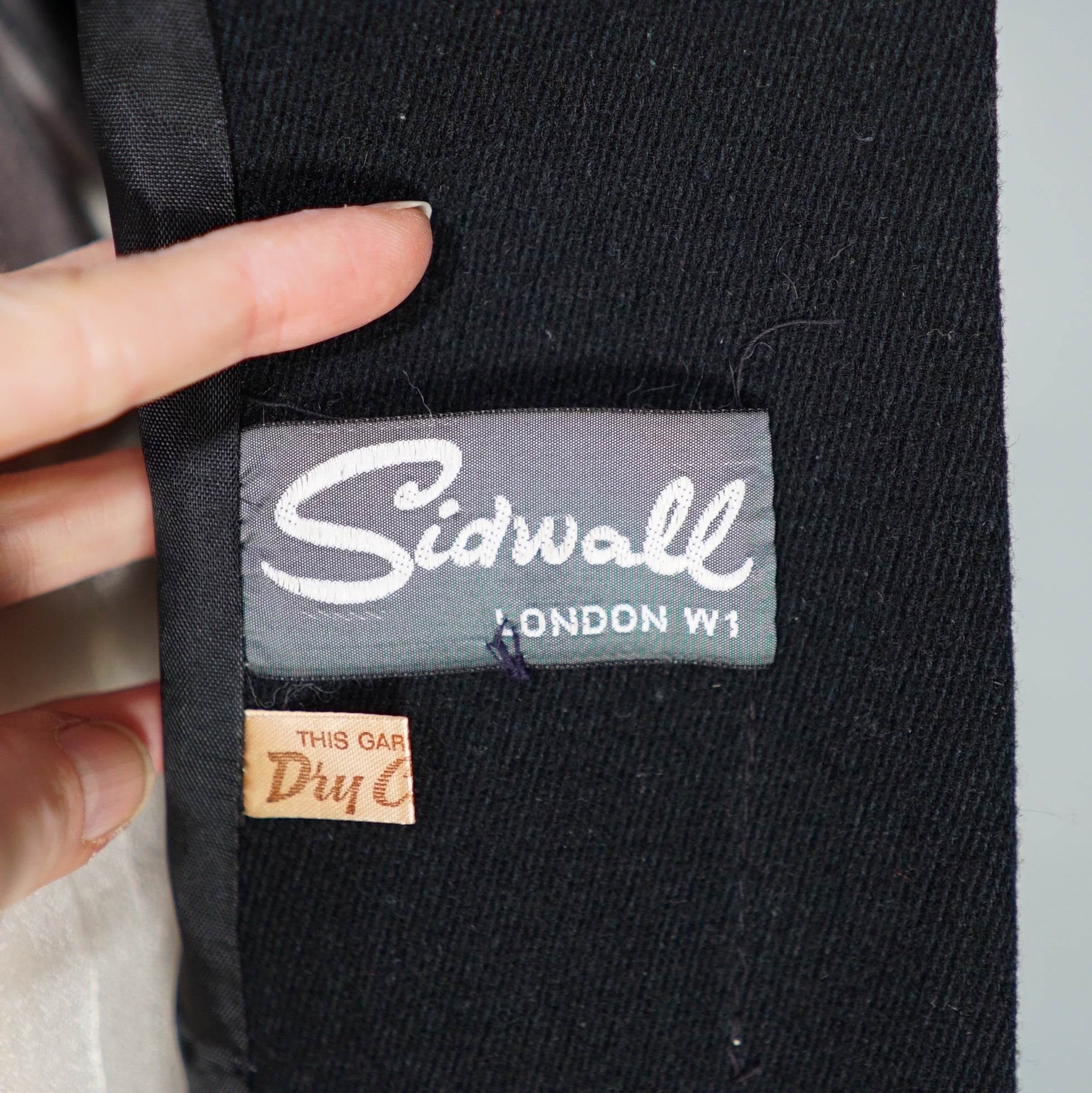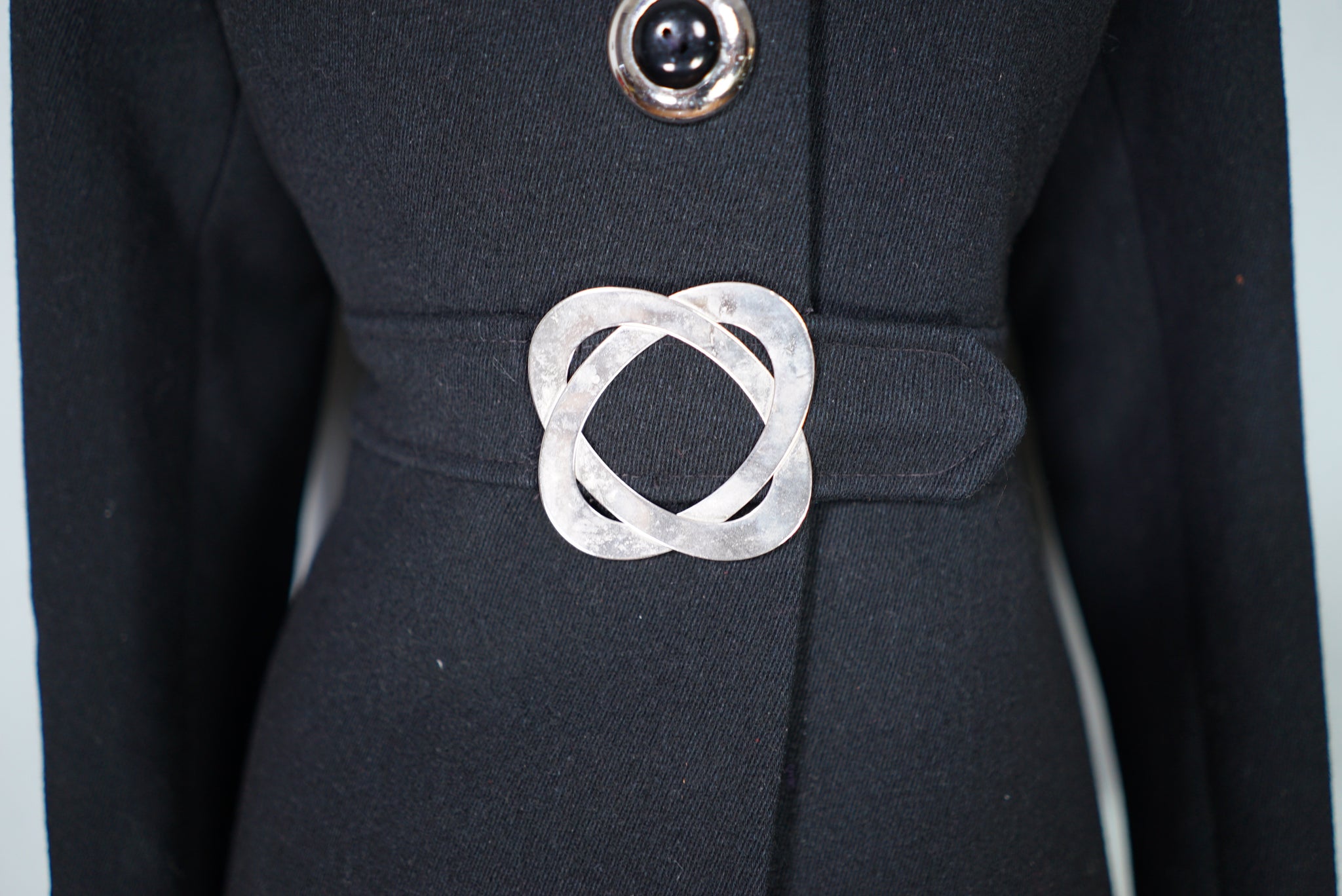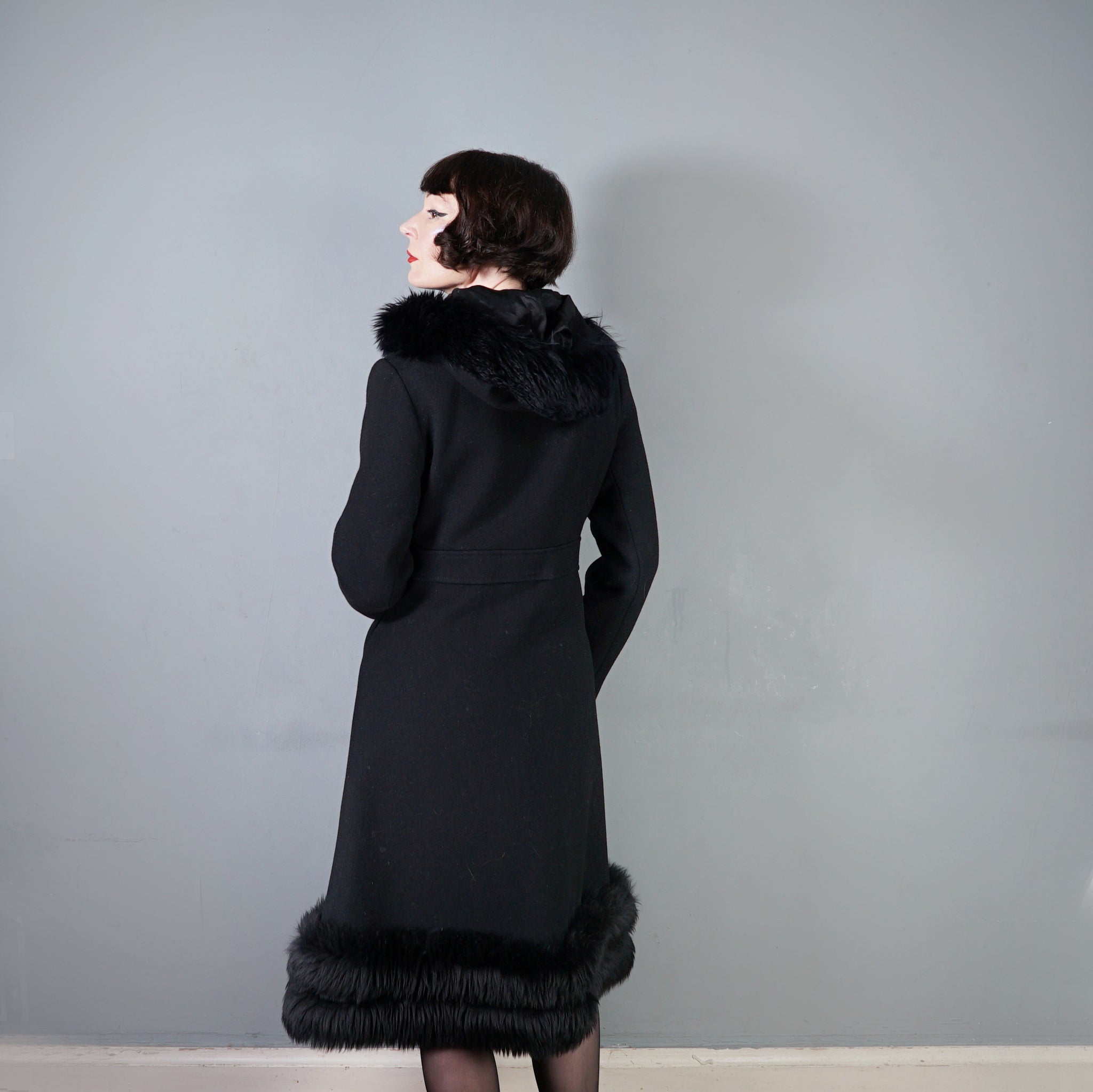 Lovely 60s showstopper coat by Sidwall. Made in London. Black, fairly thick, wool with a tiered sheepskin trim to the hem and matching trim to the hooded neck. Elegant silhoutte with a softly a-lined skirt and fitted long sleeves and bodice with a wide waistband with a snap buttoned strap and a big decorative celtic buckle. Front fasten with three conceled chunky popper buttons and have three large black and silver huge statement buttons on the top of the front. Hooded neck. Slot pockets on the hip. Fully lined in black synthetic.
