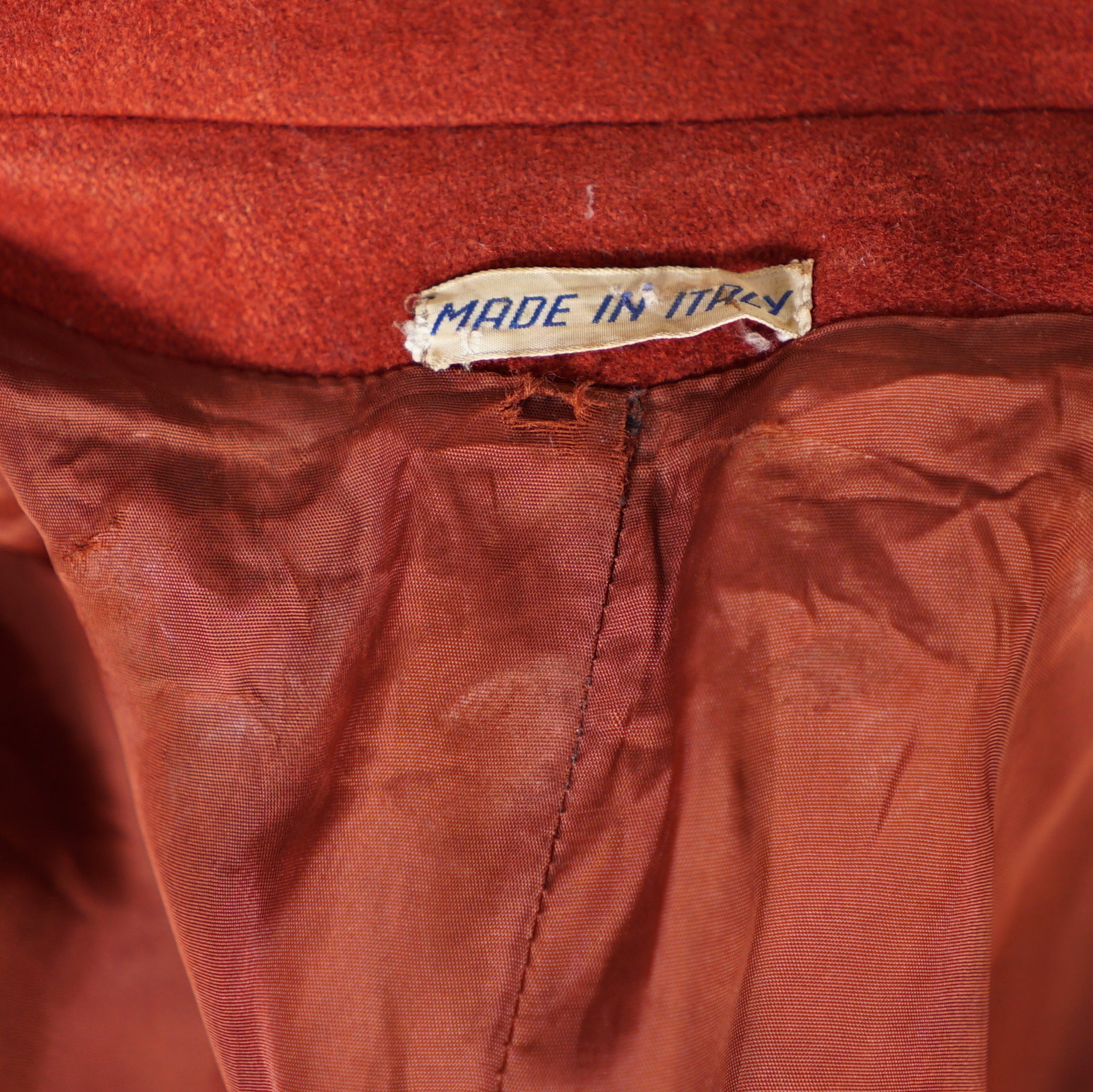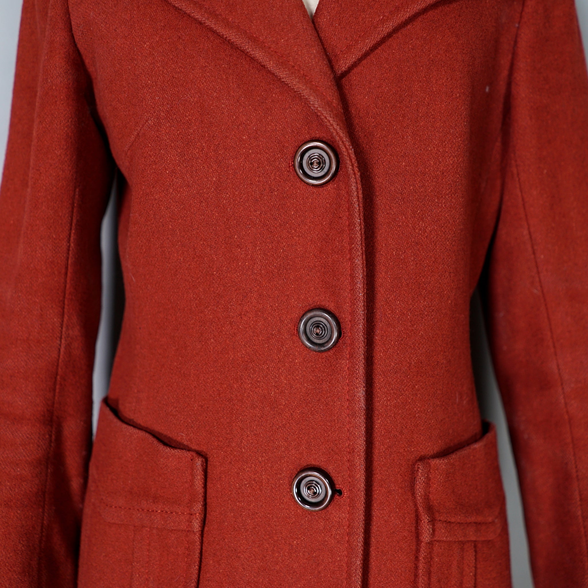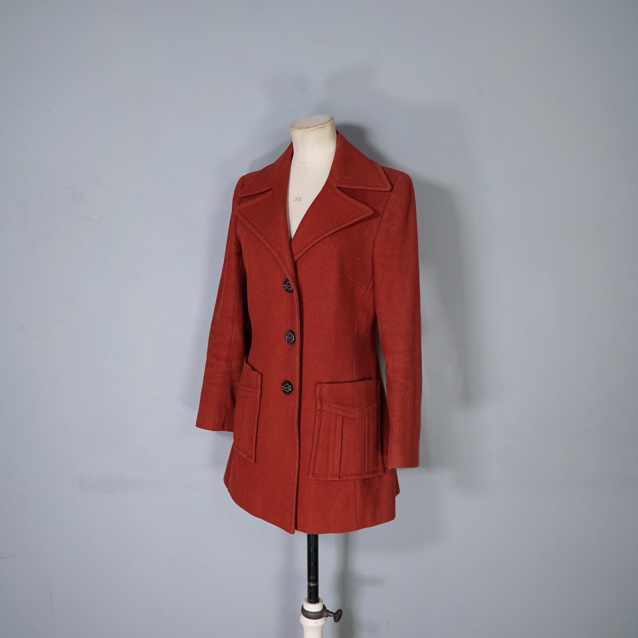 Beautiful 60s heavy russet red heavy wool jacket, made in Italy by Beghe. Elegant fitted silhouette with three chunky brown buttons to the chest and large patch pockets on the hip. Big lapel and strong padded shoulder. Lined in matching coloured satin synthetic. Perfect autumn coat and such a lovely rich colour.