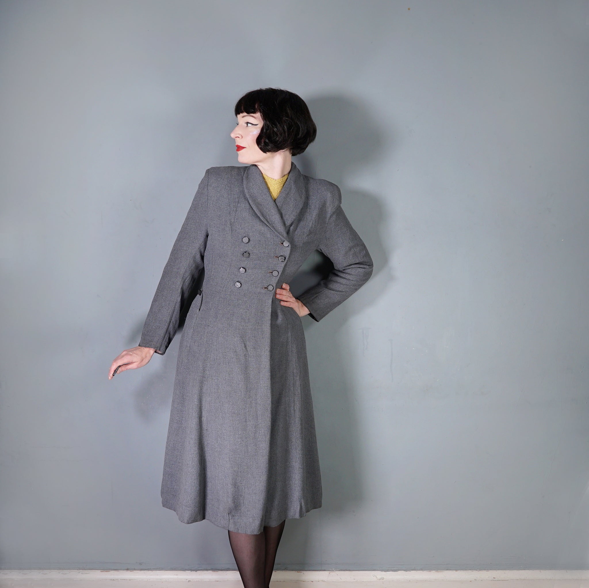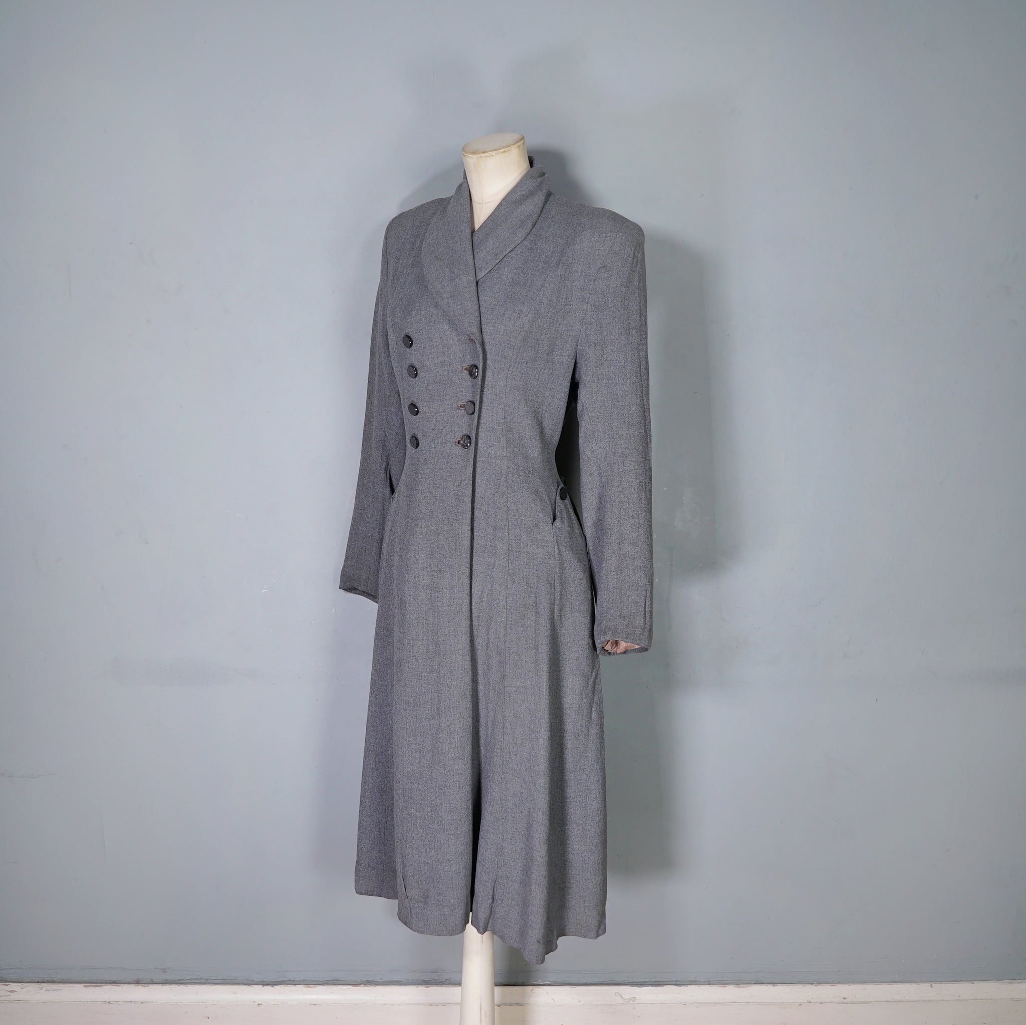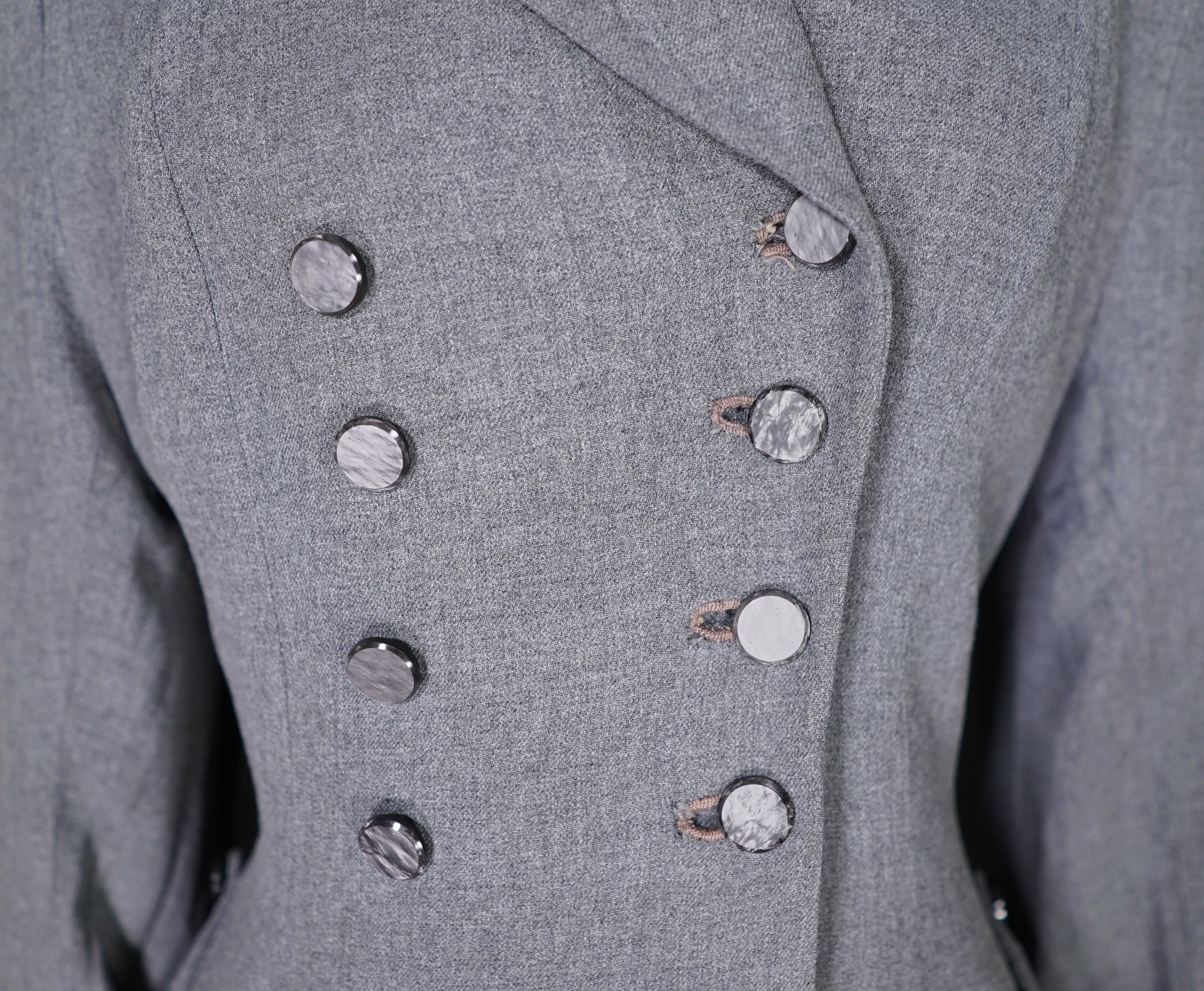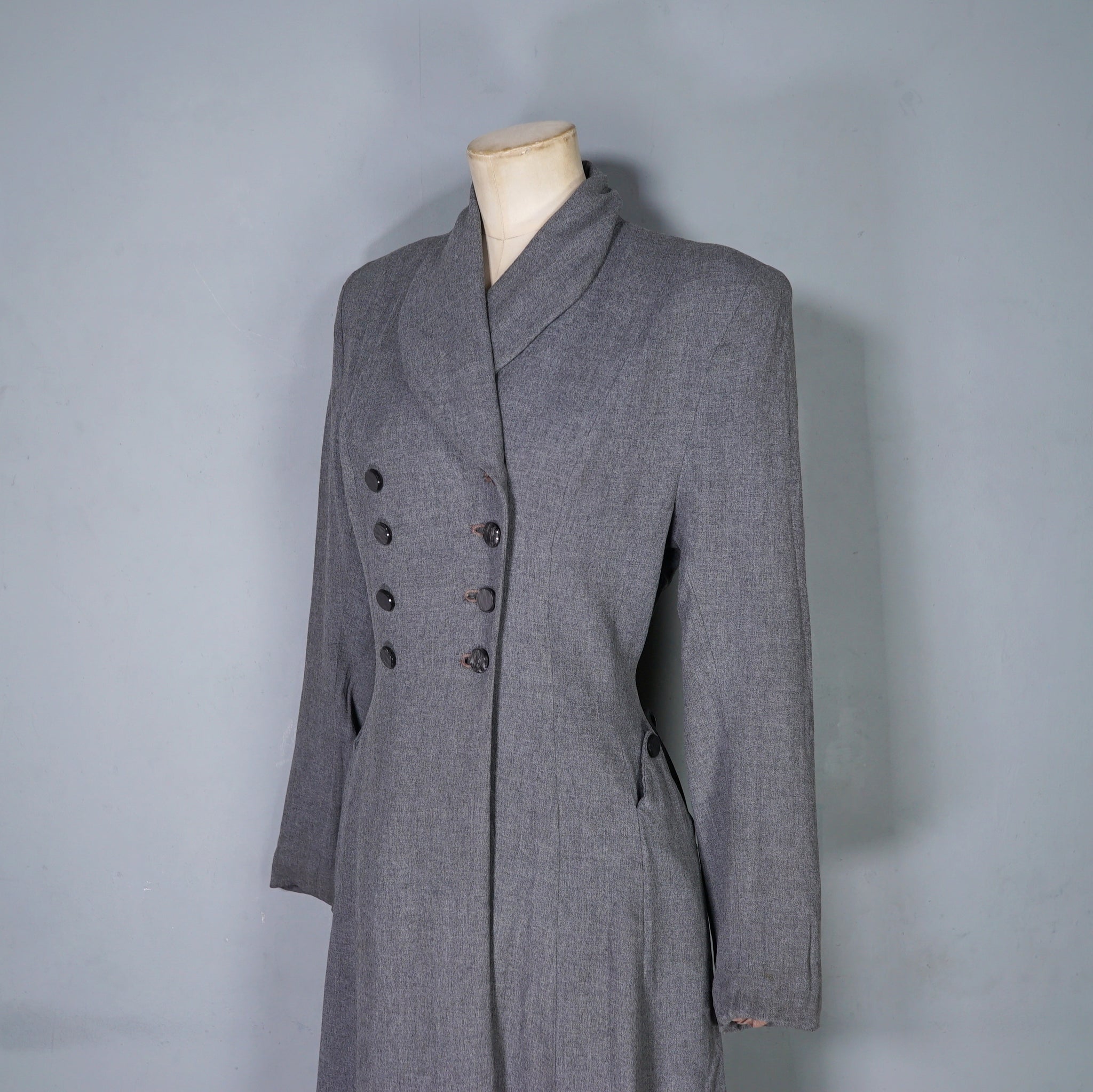 Beautiful lightweight grey 40s autumn coat. Double breasted design with eight small marled shank buttons to the chest. High neck with rounded collar. Very strong shoulder with firm pads and long sleeves. Decorative fitted pockets on the hip with peaked edges that are sewn on with buttons. Soft fit and flare silhouette. Outer fabric is a soft fine woven wool. Lined in a dusky mauve-pink synthetic. This is a great transitional coat, not very warm so not suitable for winter weather, but elegant and light and ideal for autumn and spring.