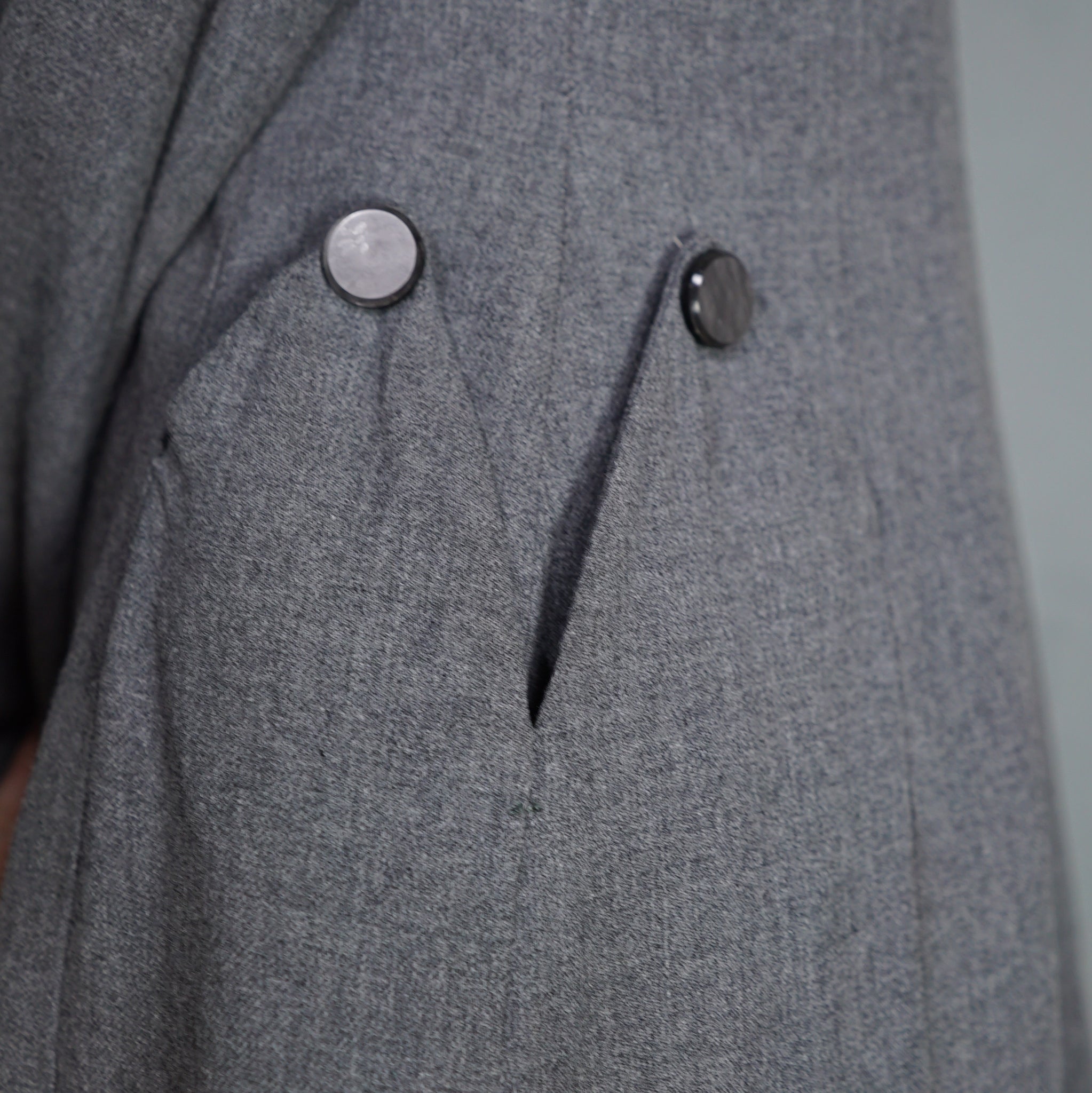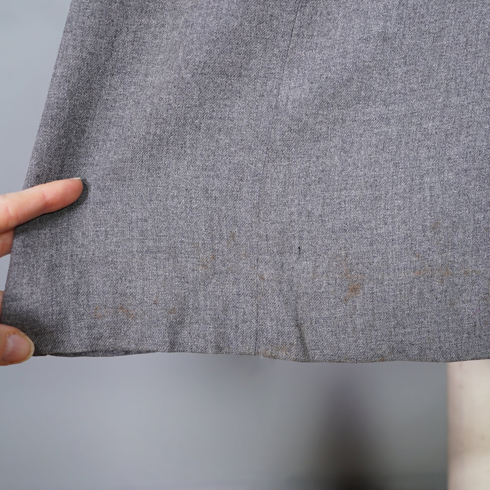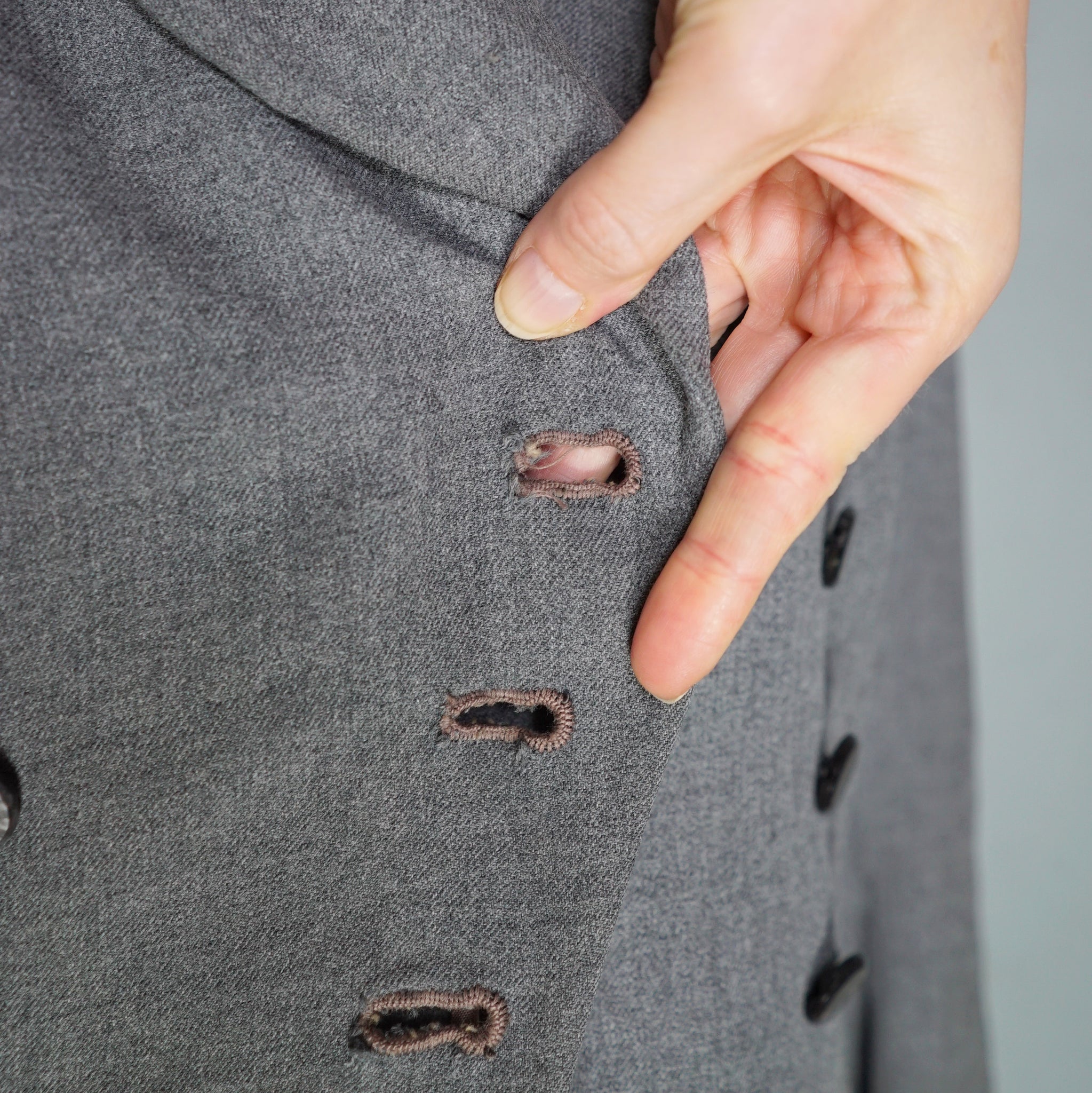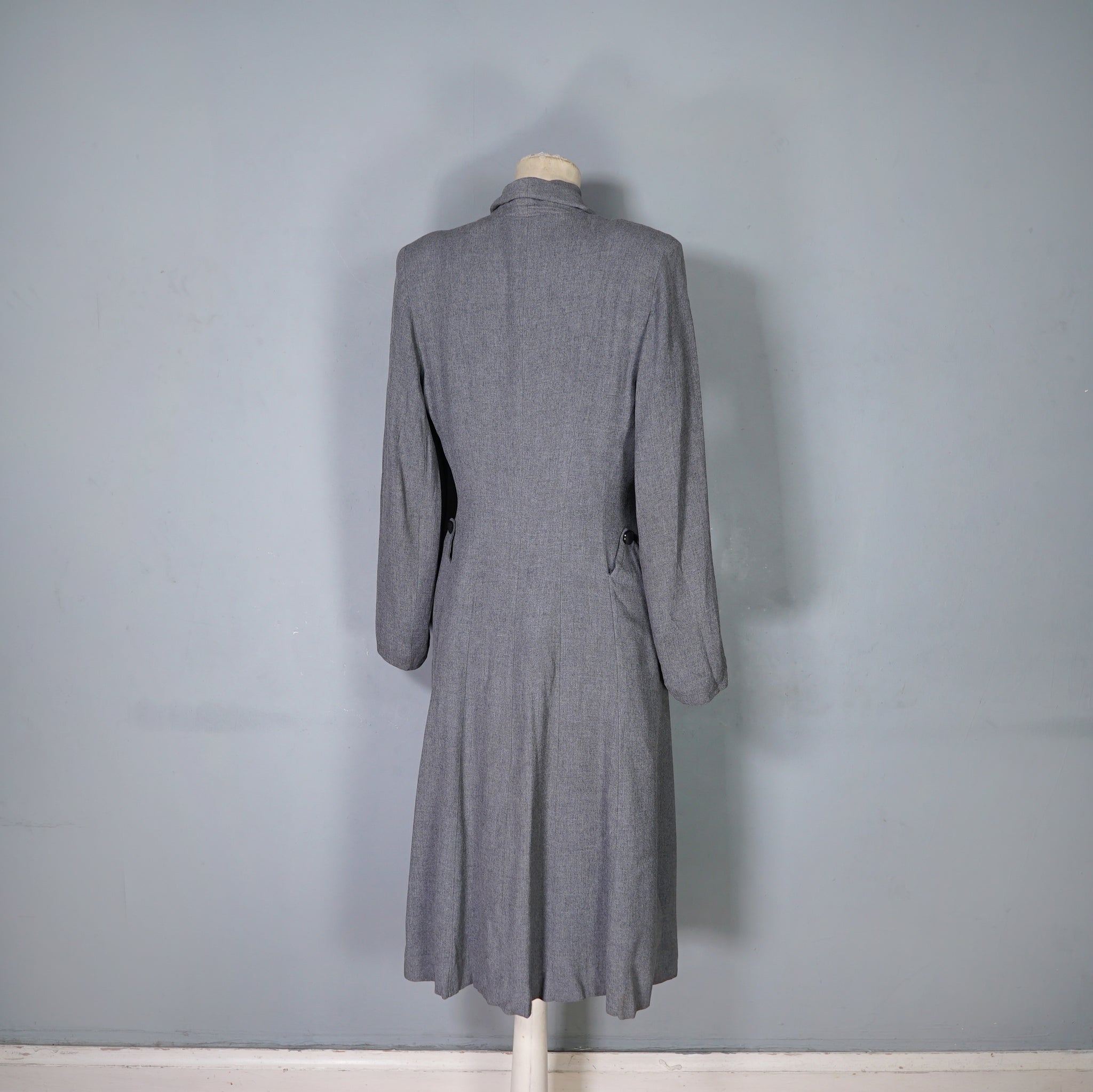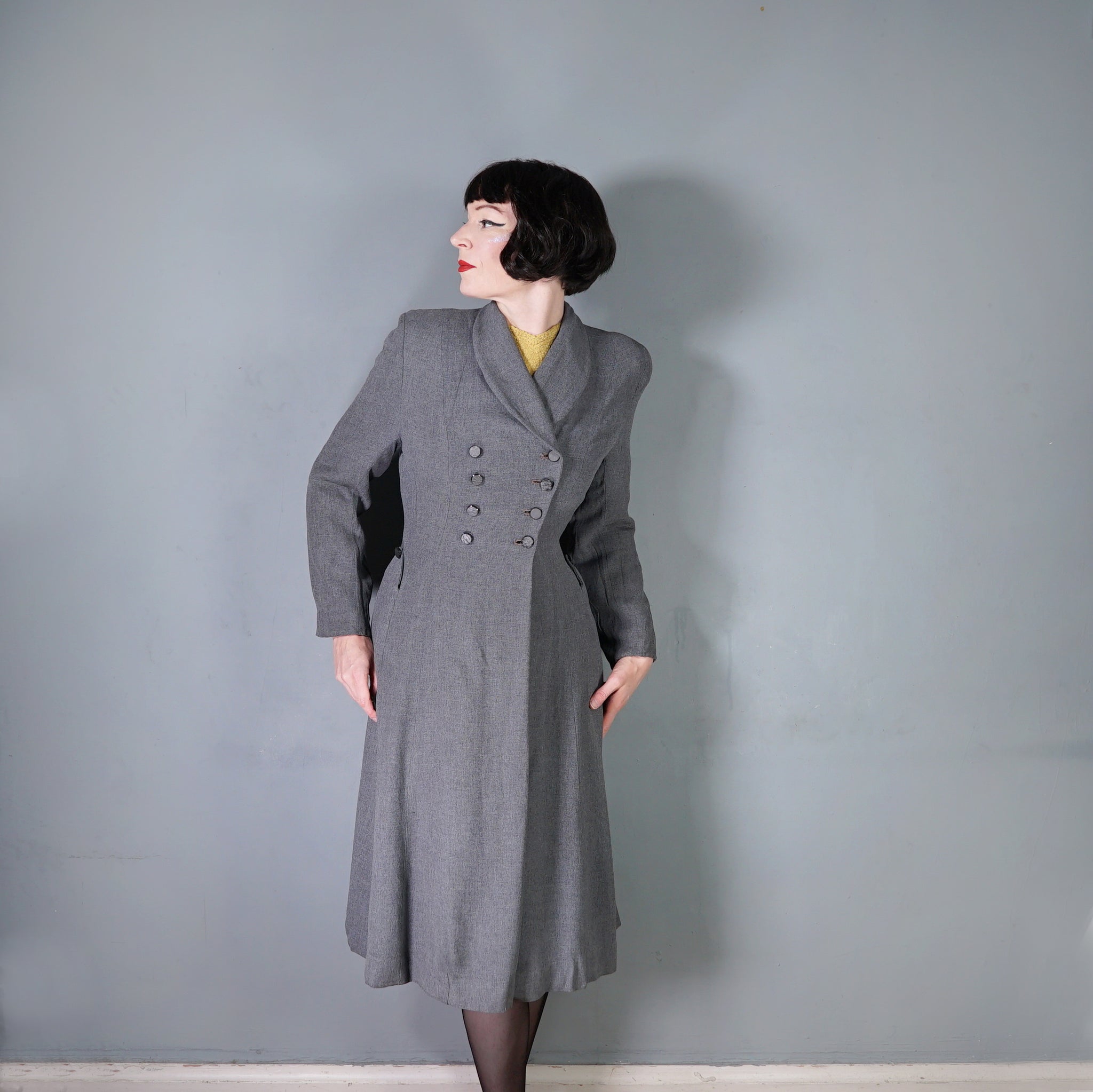Beautiful lightweight grey 40s autumn coat. Double breasted design with eight small marled shank buttons to the chest. High neck with rounded collar. Very strong shoulder with firm pads and long sleeves. Decorative fitted pockets on the hip with peaked edges that are sewn on with buttons. Soft fit and flare silhouette. Outer fabric is a soft fine woven wool. Lined in a dusky mauve-pink synthetic. This is a great transitional coat, not very warm so not suitable for winter weather, but elegant and light and ideal for autumn and spring.