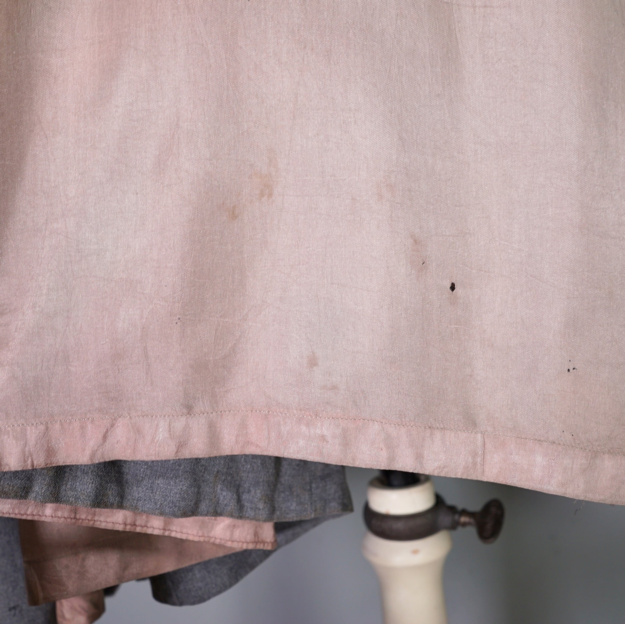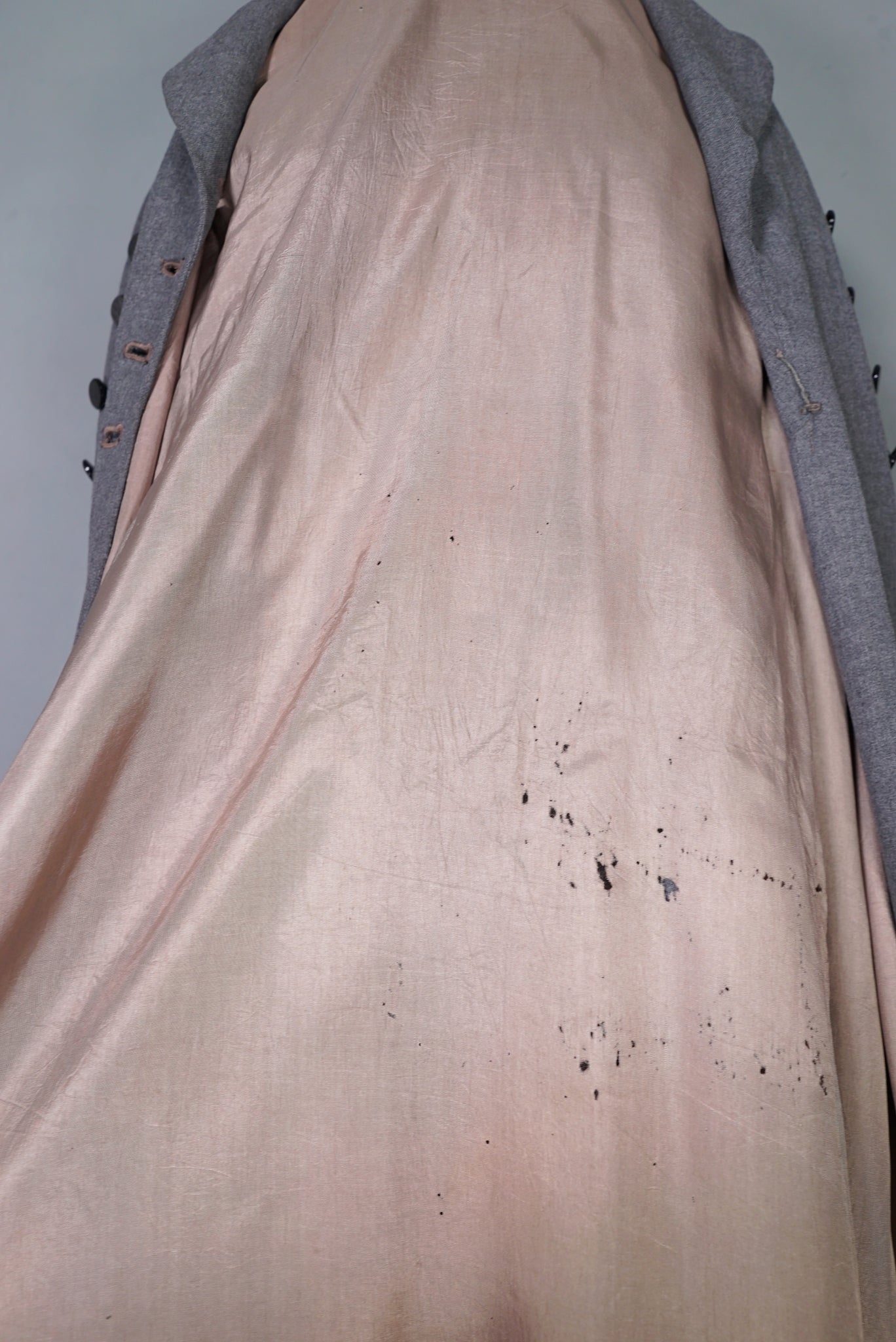 -Externally this is in pretty good condition without any overly noticeable flaws, presents very nicely. There is one small linear repair on the hem, near the placket at the front, see photo. There is also slight discolouration on the hemline at the back, also shown. One of the button holes is a bit worn.