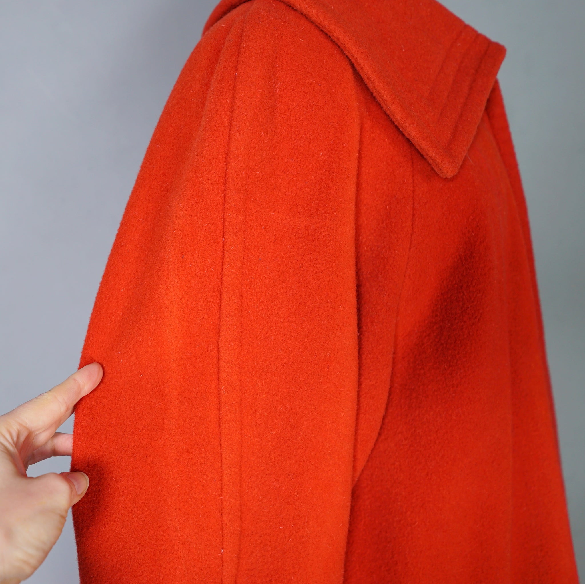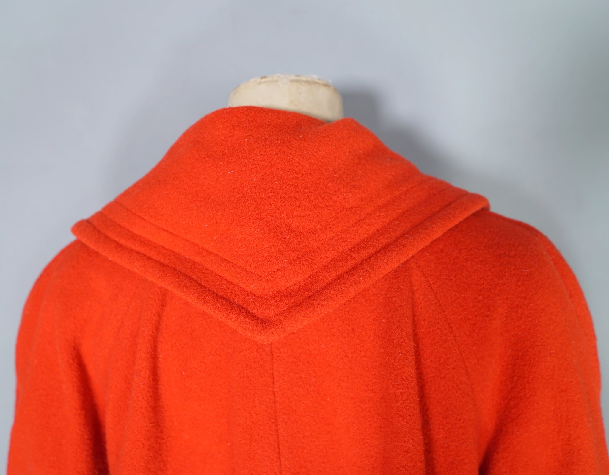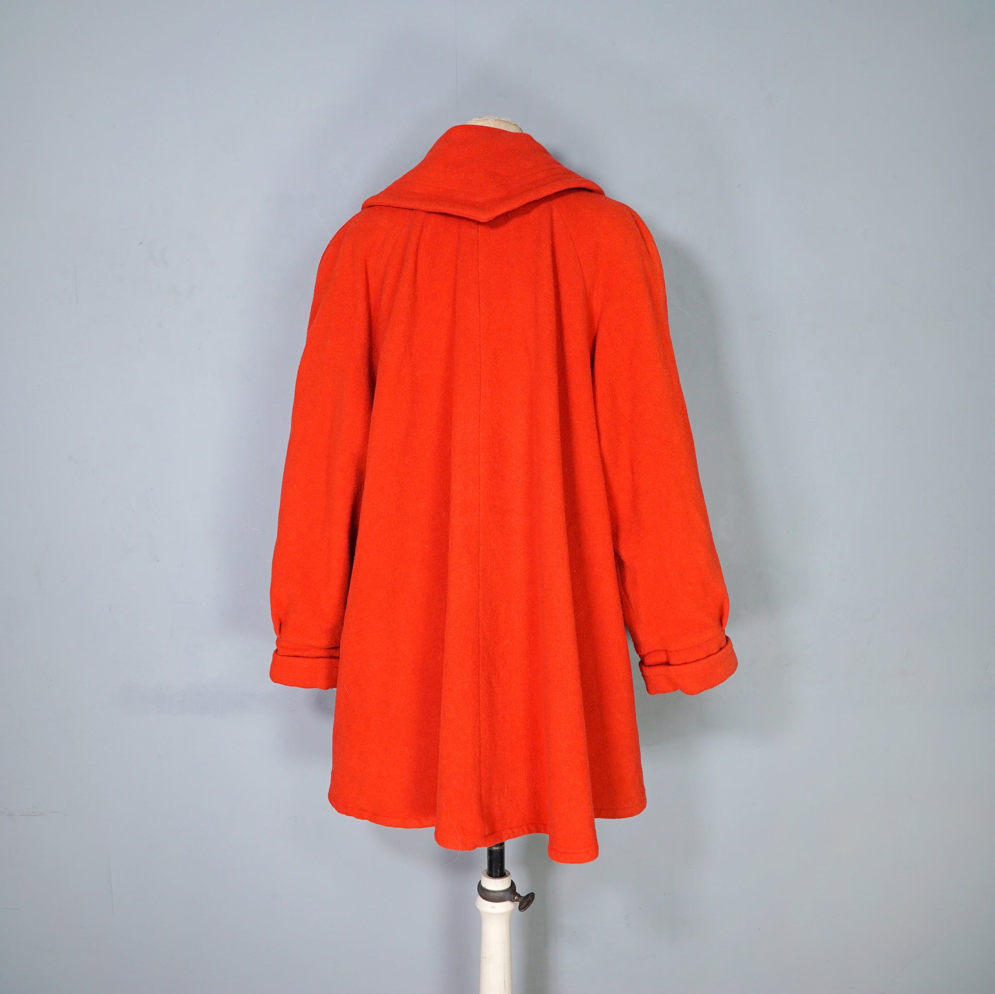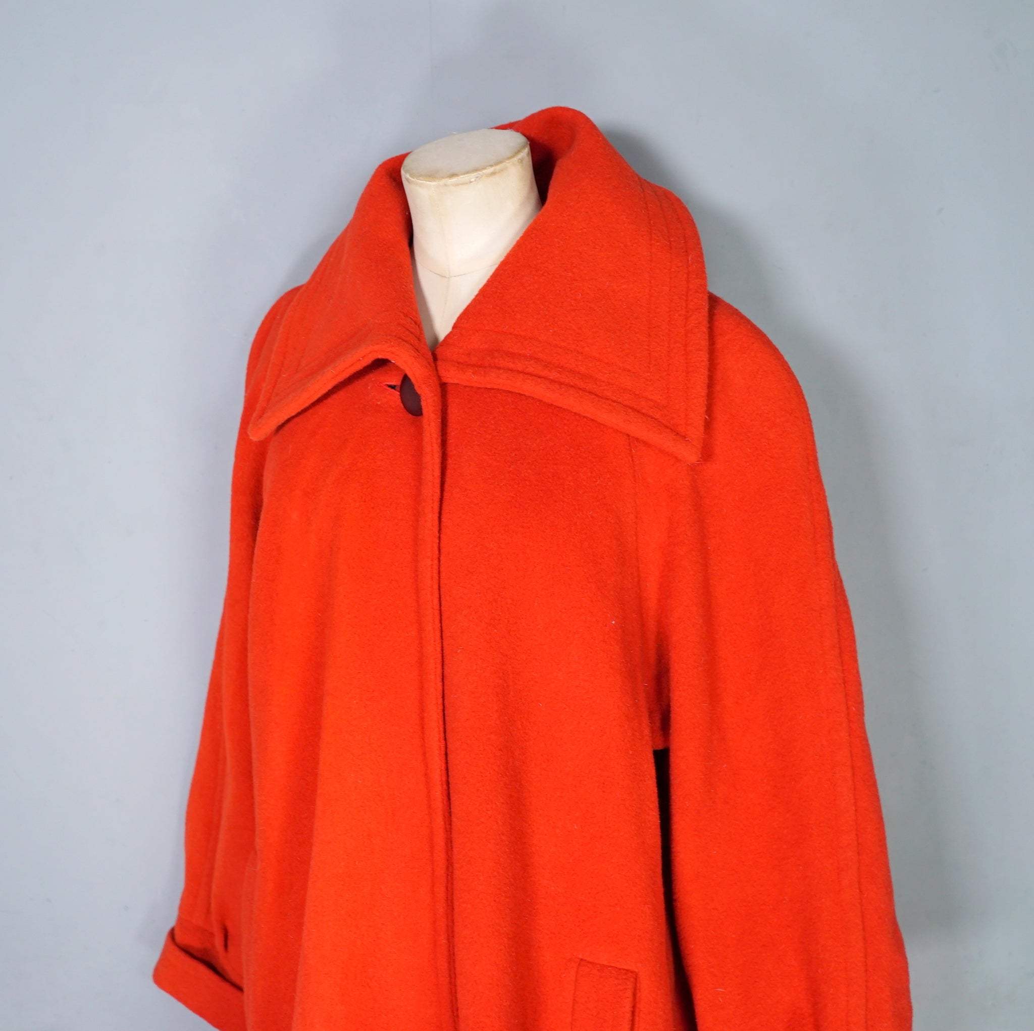 Boldest brightest orange 80s coat in a soft 80% wool and nylon blend. Strong silhouette with big padded shoulders and long raglan balloon sleeve with fitted turn up cuffs. Huge swing silhouette with slot pockets on the waist and a single button to the neck. Lined in a lightweight orange synthetic.