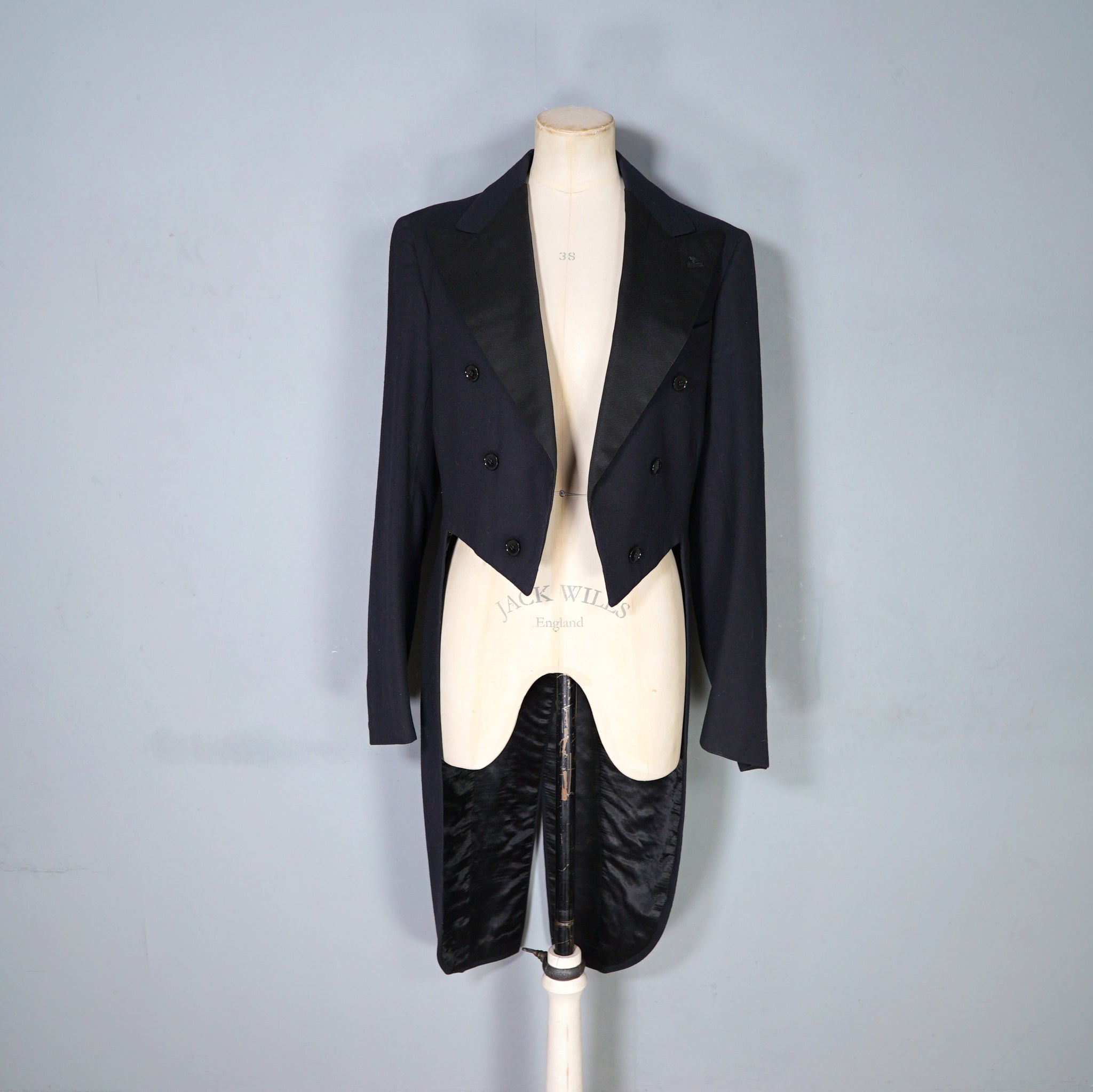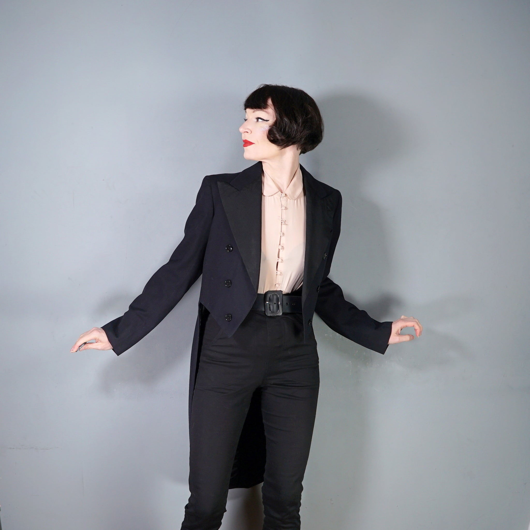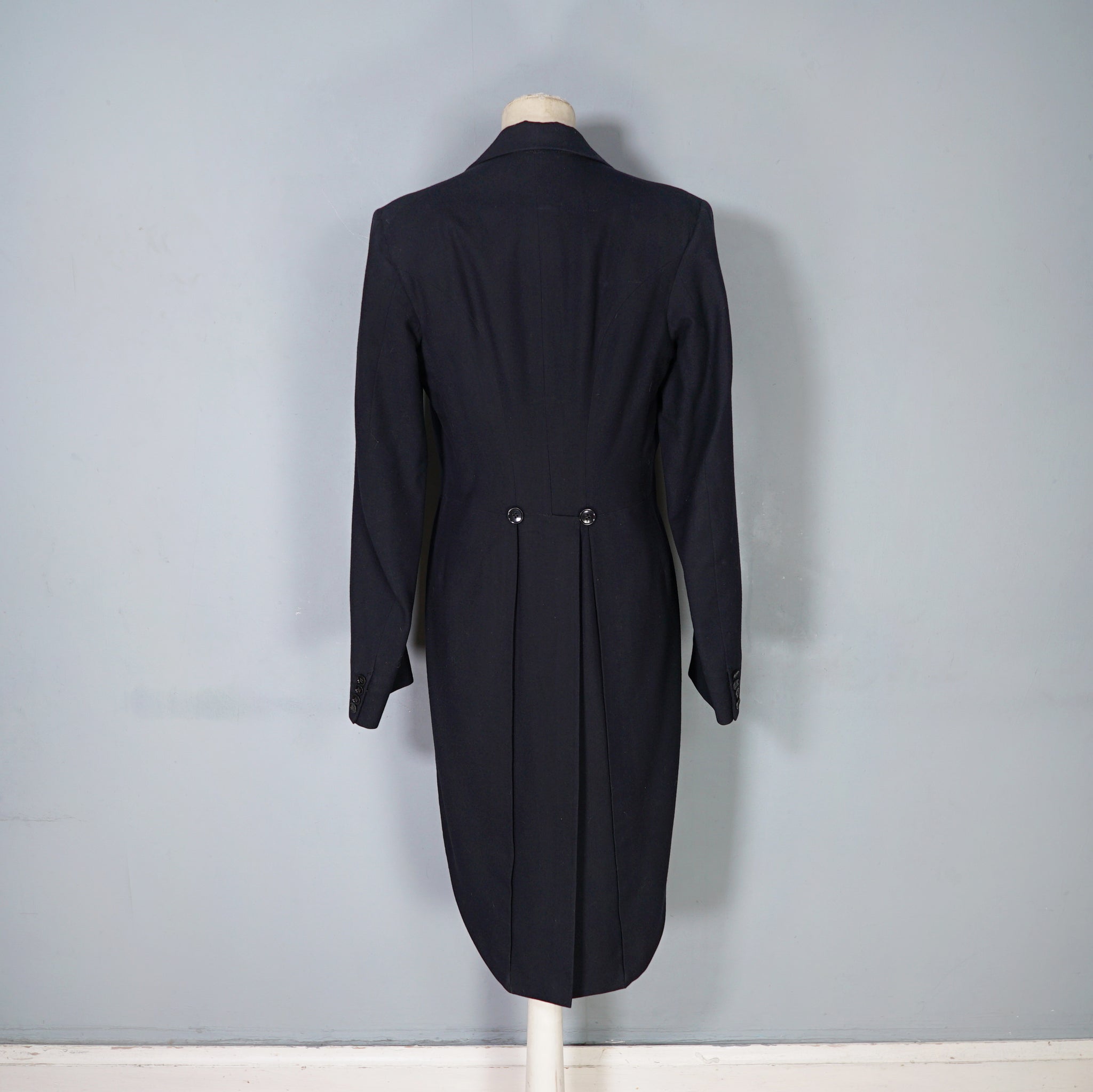 Vintage evening tails tailcoat in black fine wool with peaked texuted lapel and open cut front with three decorative diagonal buttons to either side of the chest. Padded shoulder and long sleeve with four smaller buttons to the cuffs. Cropped waist length in front and a long slit tail to the back. Fully lined in black satin with white sleeve lining. One slot pocket to the inside of the bust. Outer fabric feels like a suitweight-wool. No makers labels. As it is a traditionally tailor made piece, not easy to date, internally lining largely handsewn. Definitely vintage, but hard to day, would estimate maybe 60s era. Beautifully tailored and a great smaller size.