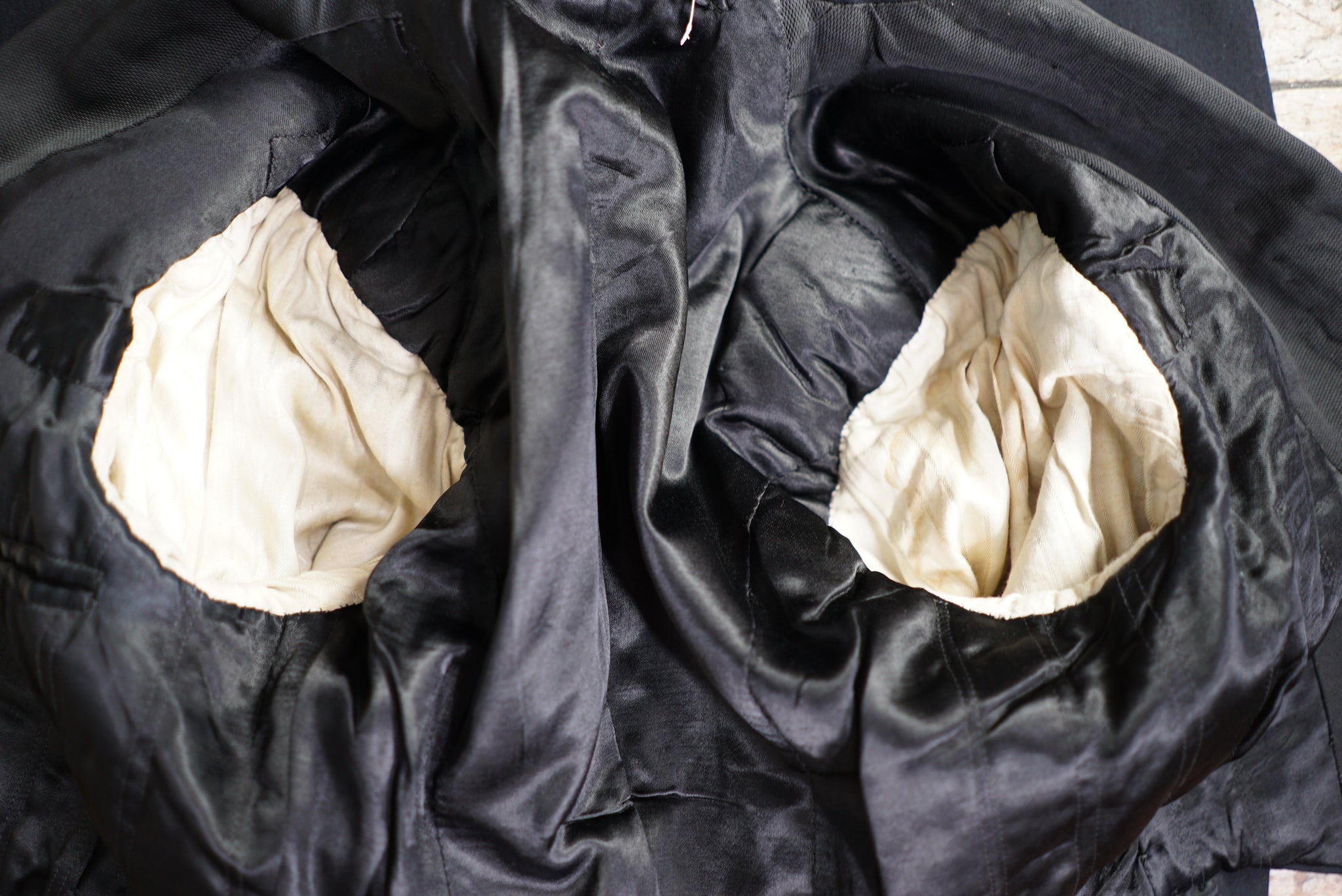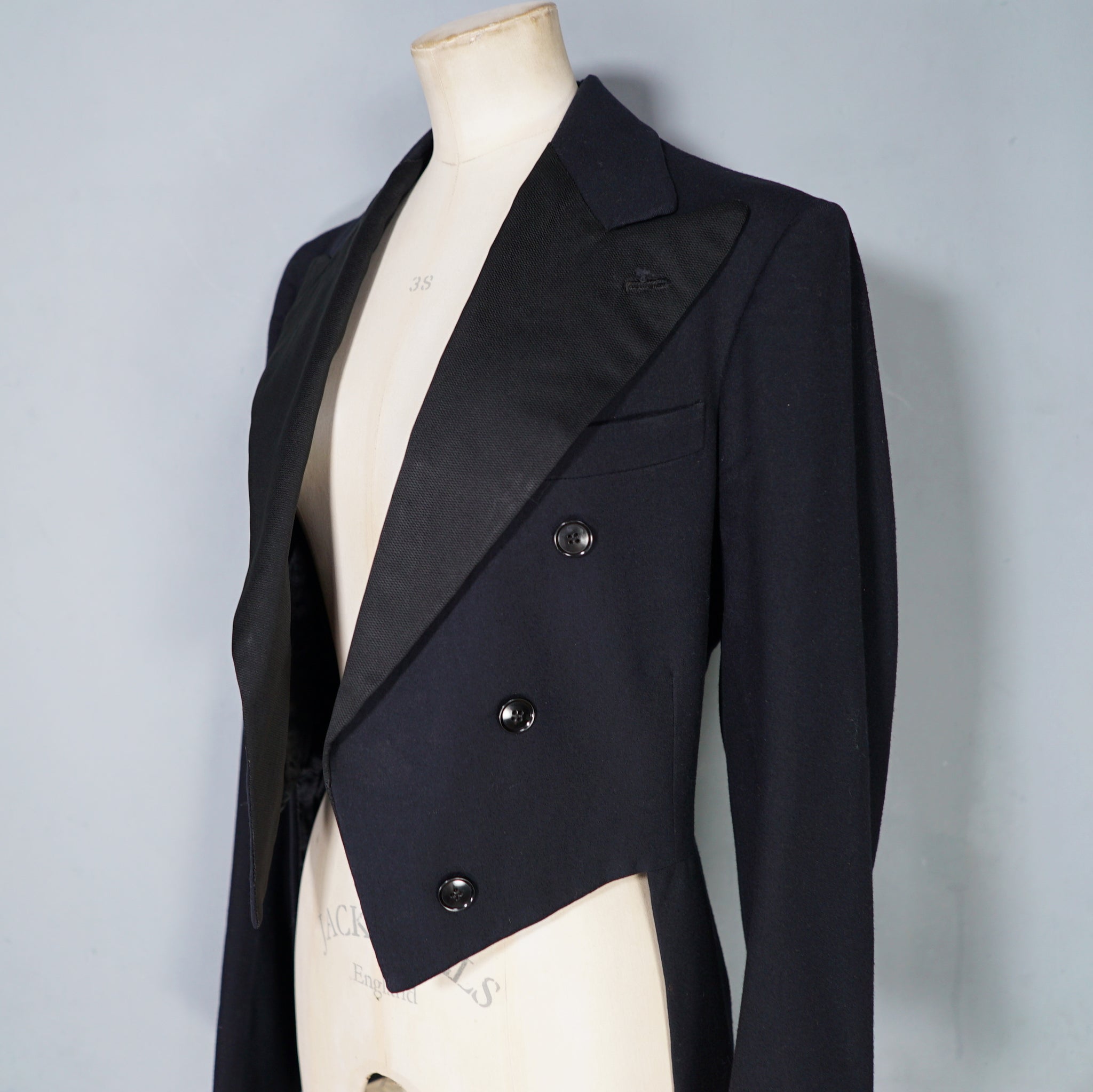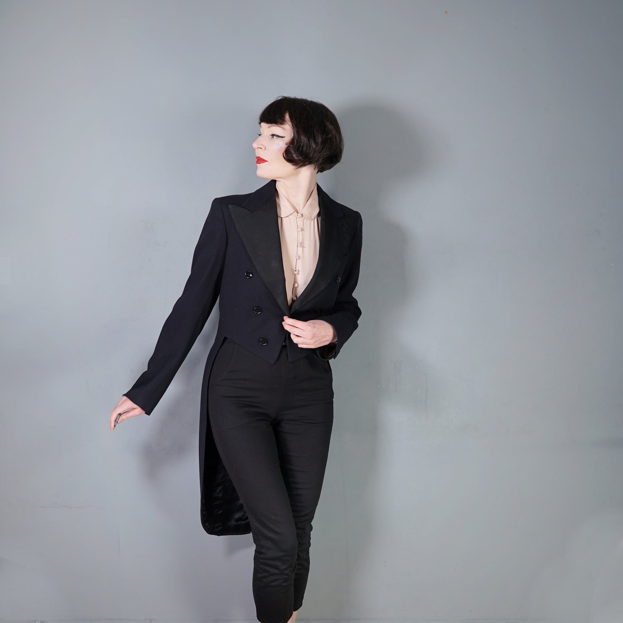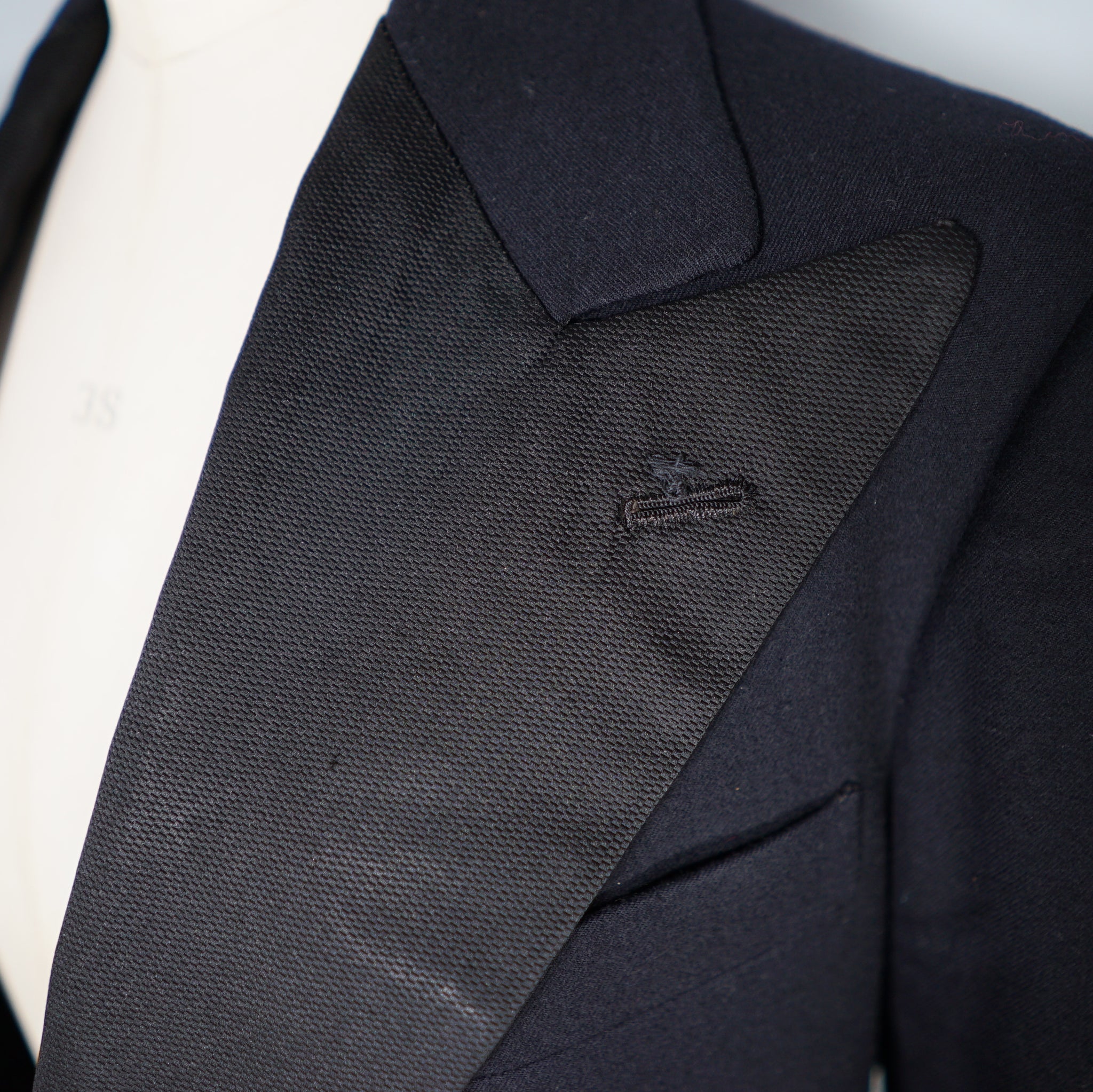 Vintage evening tails tailcoat in black fine wool with peaked texuted lapel and open cut front with three decorative diagonal buttons to either side of the chest. Padded shoulder and long sleeve with four smaller buttons to the cuffs. Cropped waist length in front and a long slit tail to the back. Fully lined in black satin with white sleeve lining. One slot pocket to the inside of the bust. Outer fabric feels like a suitweight-wool. No makers labels. As it is a traditionally tailor made piece, not easy to date, internally lining largely handsewn. Definitely vintage, but hard to day, would estimate maybe 60s era. Beautifully tailored and a great smaller size.
