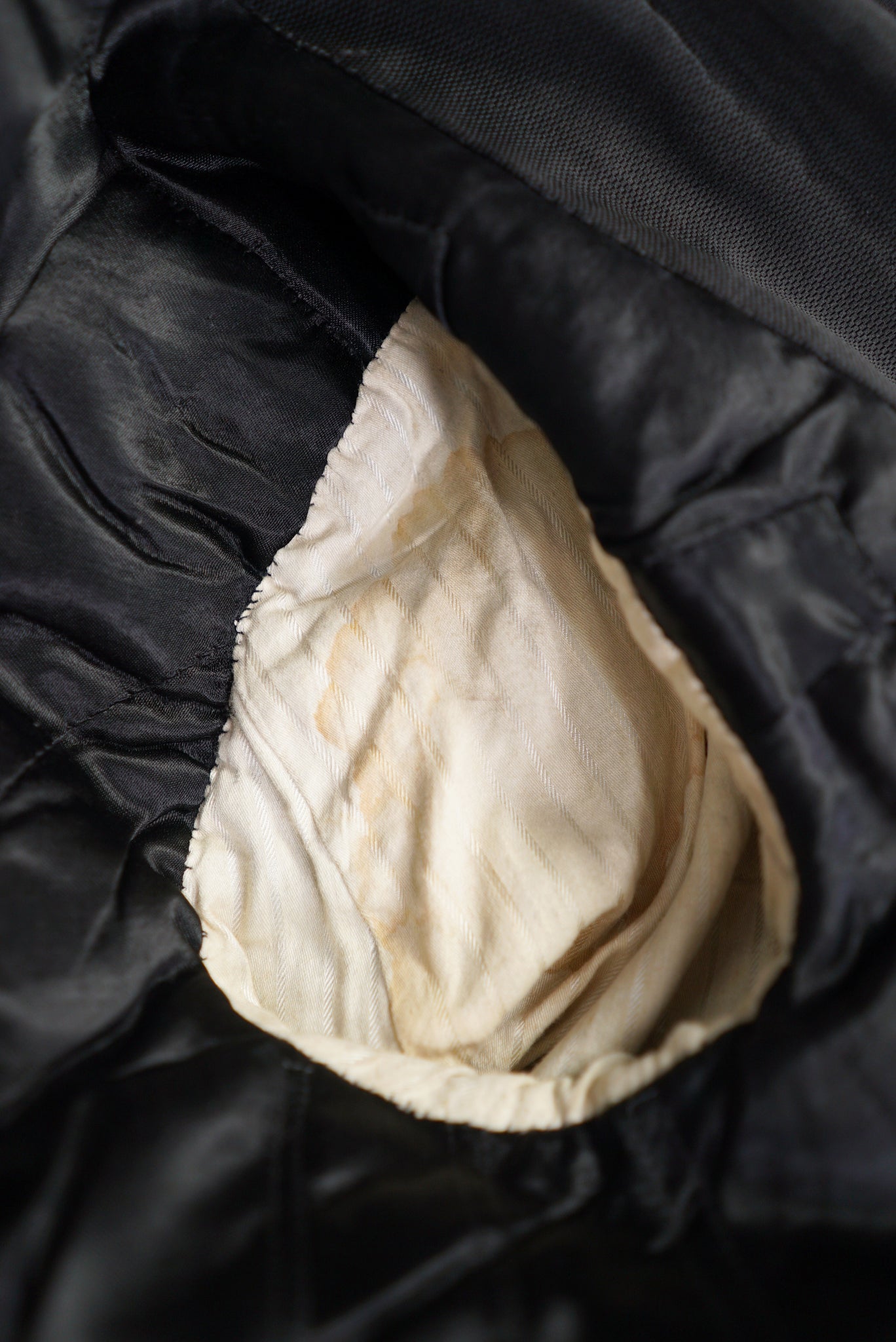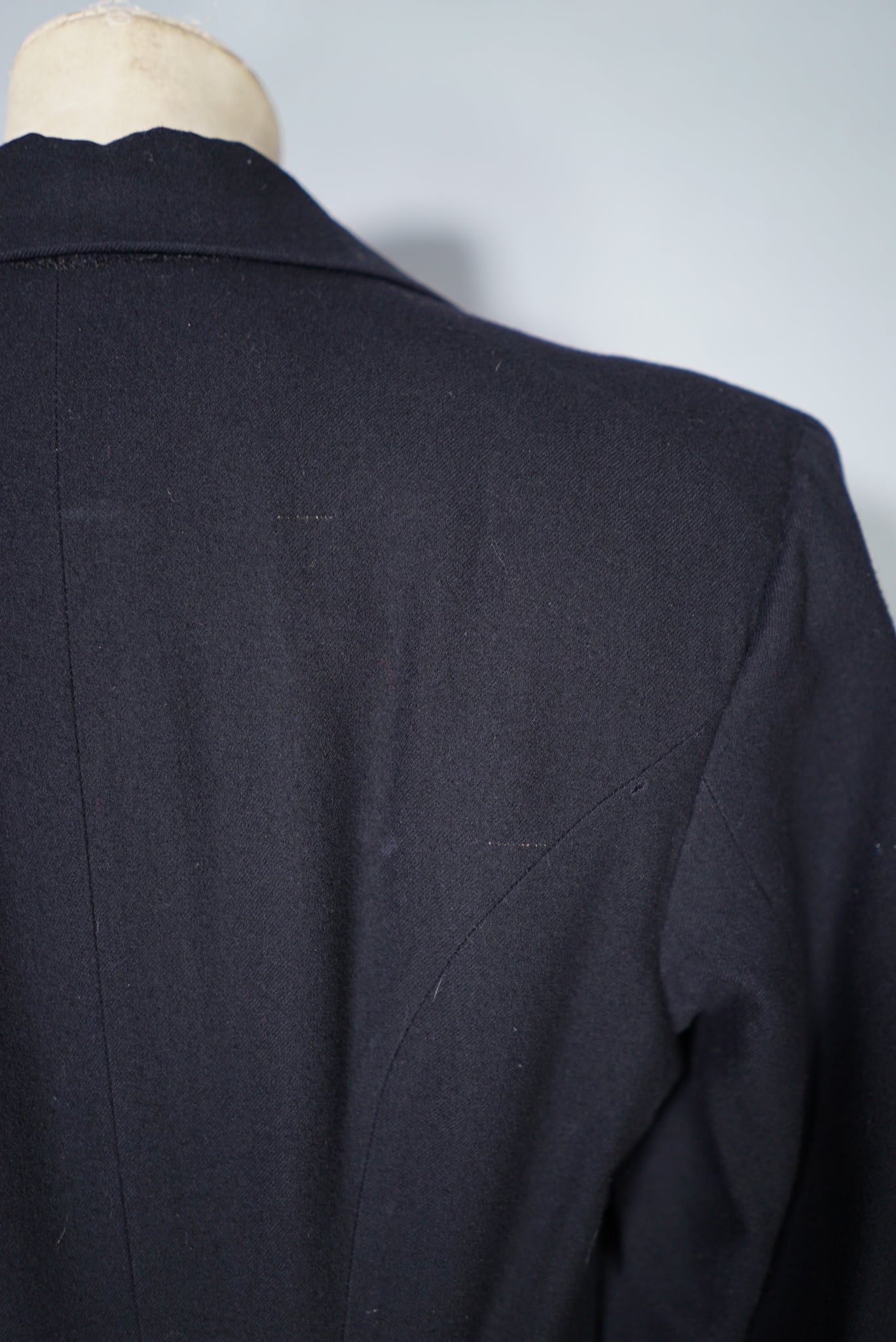 Very good condition. One of the back buttons have been replaced, closely matched so hardly shows. Lining to the sleeves, mainly to the shoulders, has discolouration. A couple of tiny scuffs in the wool. One of the back button is very very very slightly different than the other.