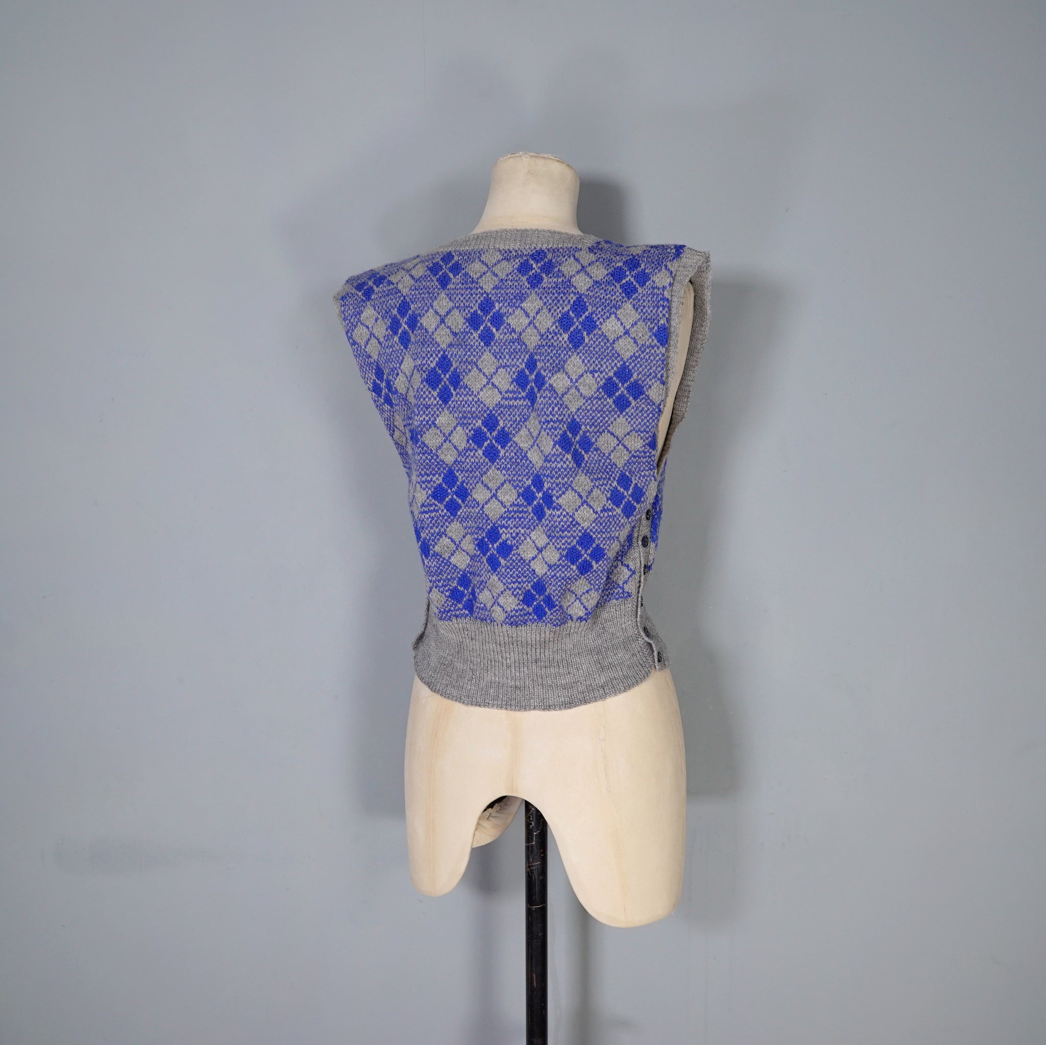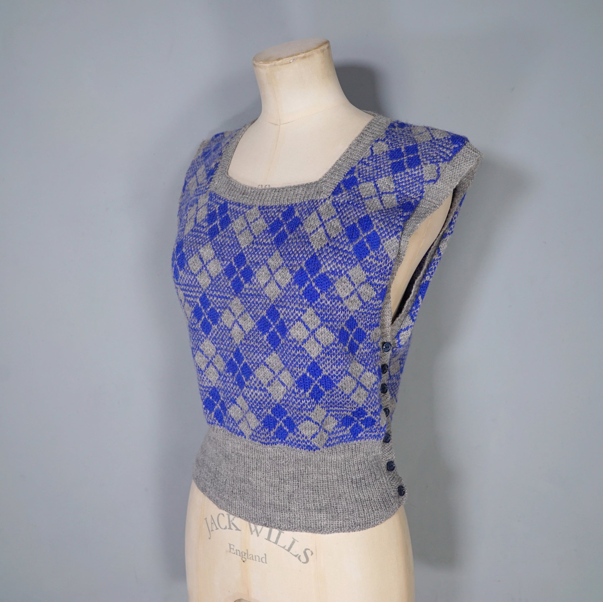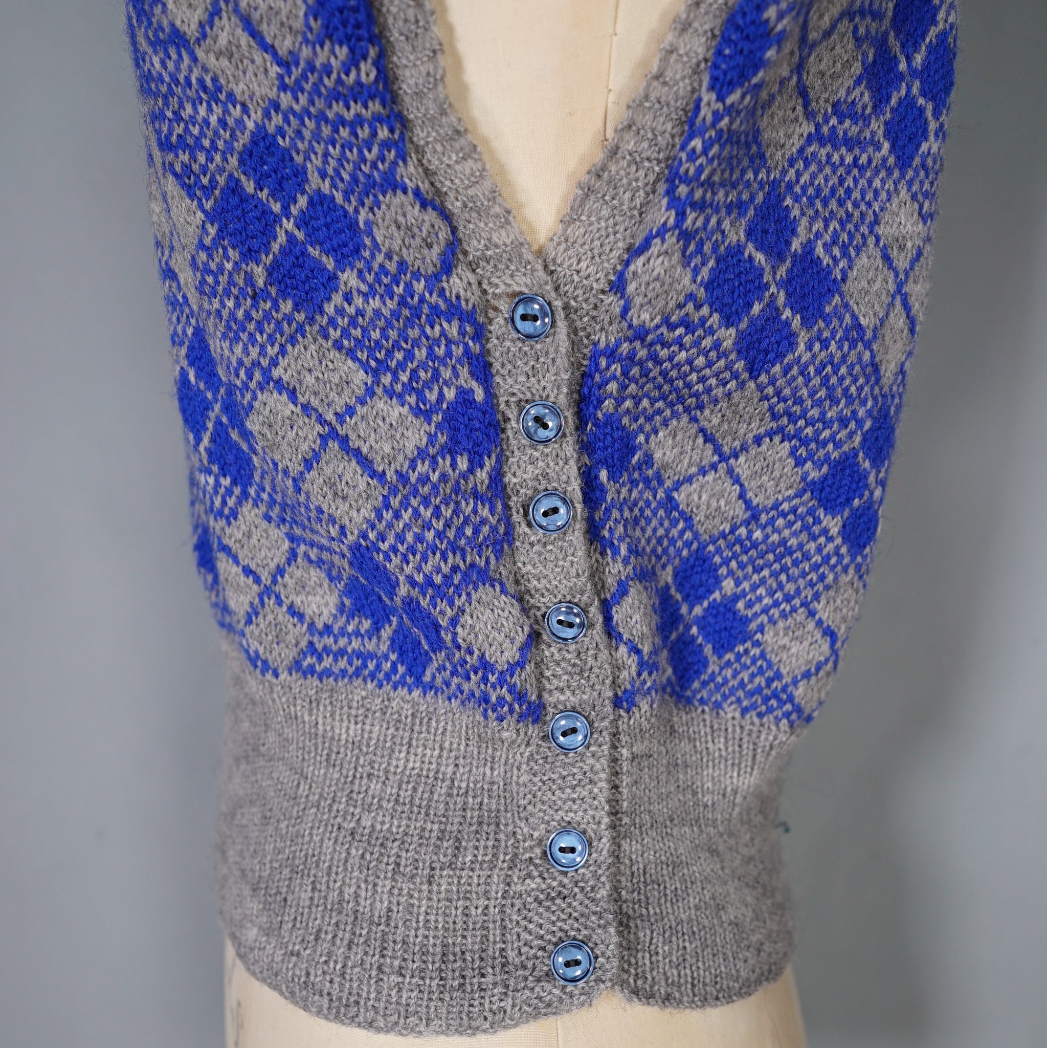 Absolutely so perfect grey and vivid blue soft fine wool handknit tank top in an argyle check. Square neck and sleeveless fit. Wide ribbed waistand. Side buttoning on both sides. No labels. Handknitted most likely from a vintage pattern, hard to know when it has been made, but the style is beautifully 40s, with small vintage buttons down the sides.