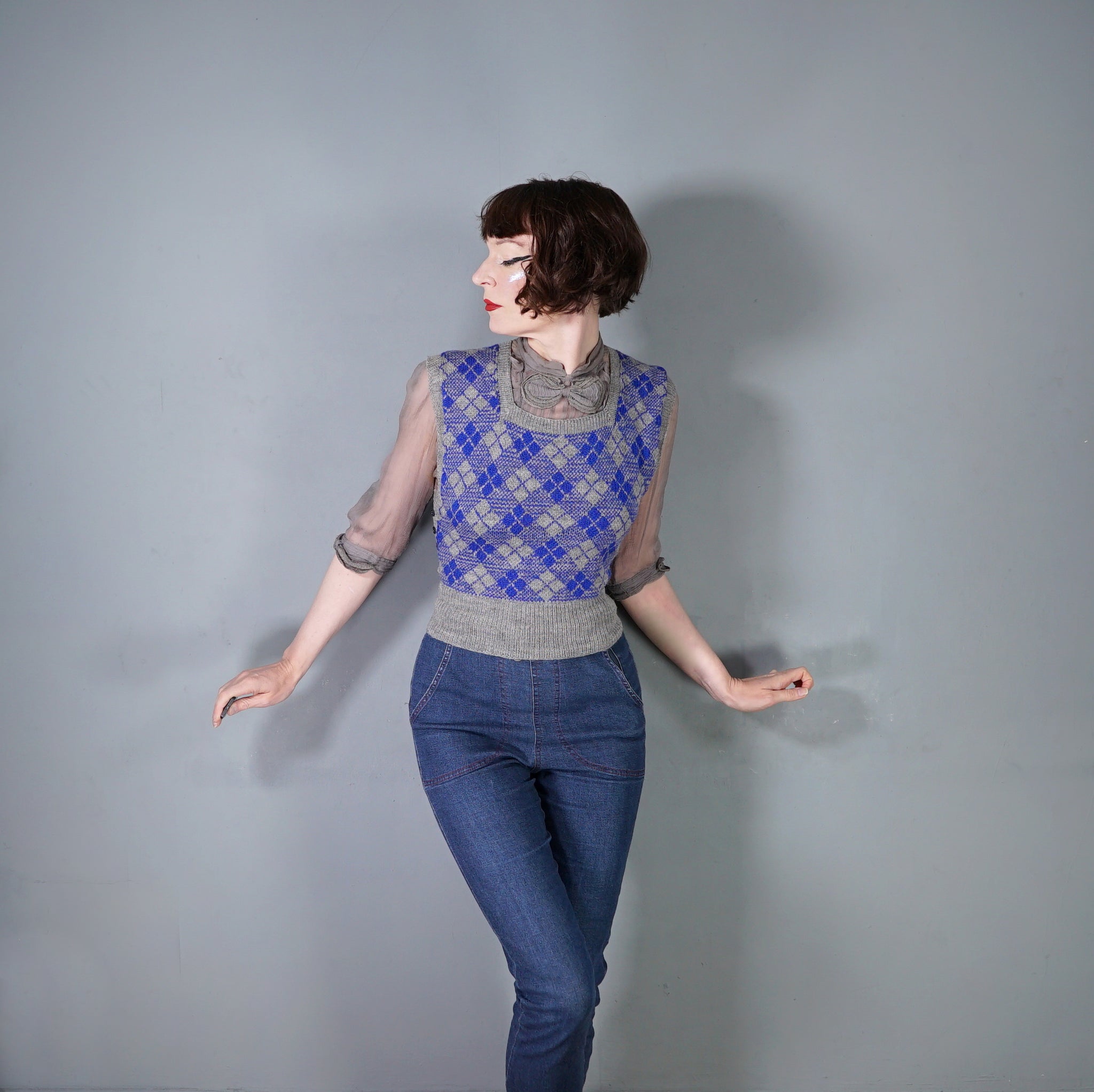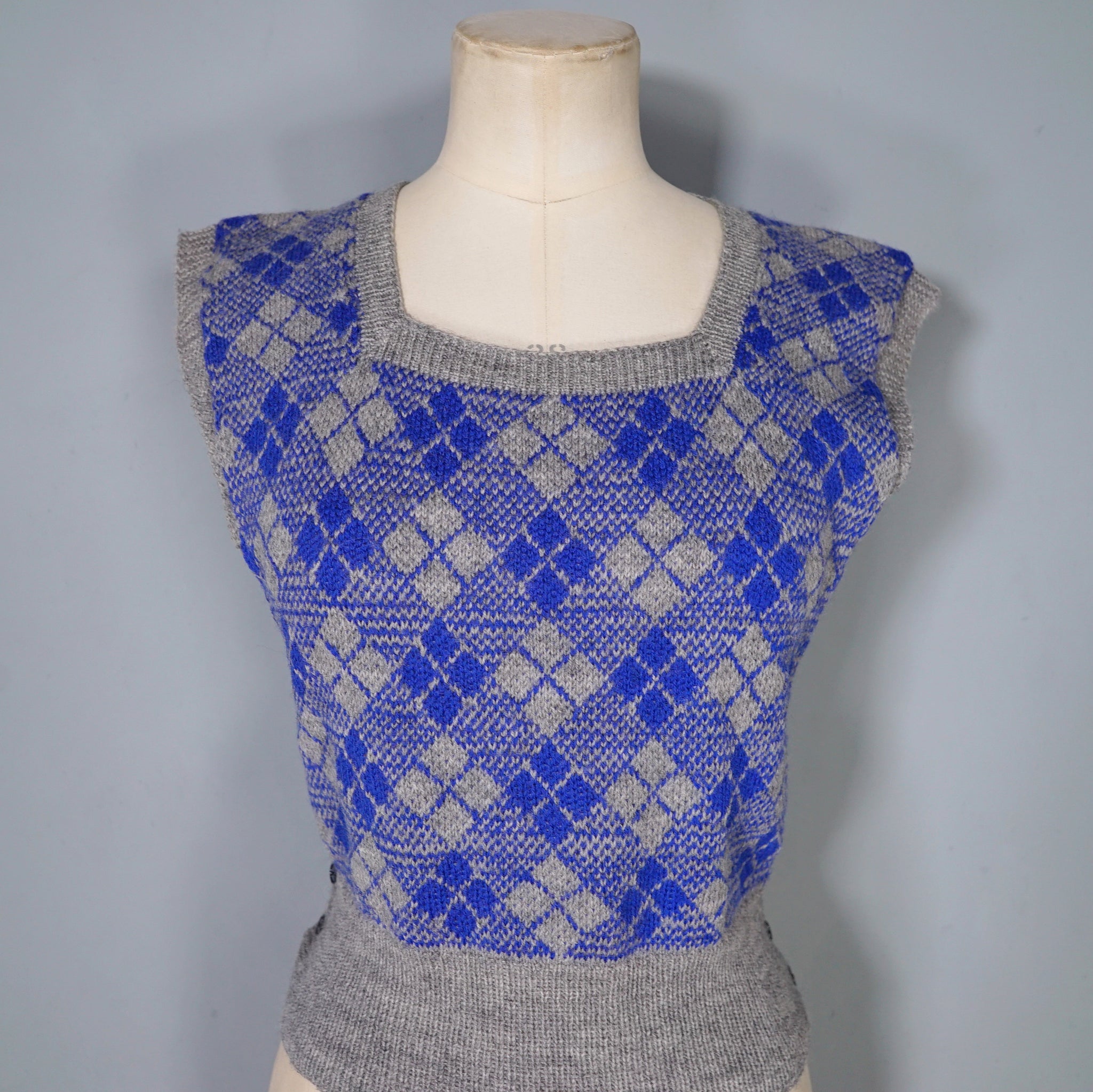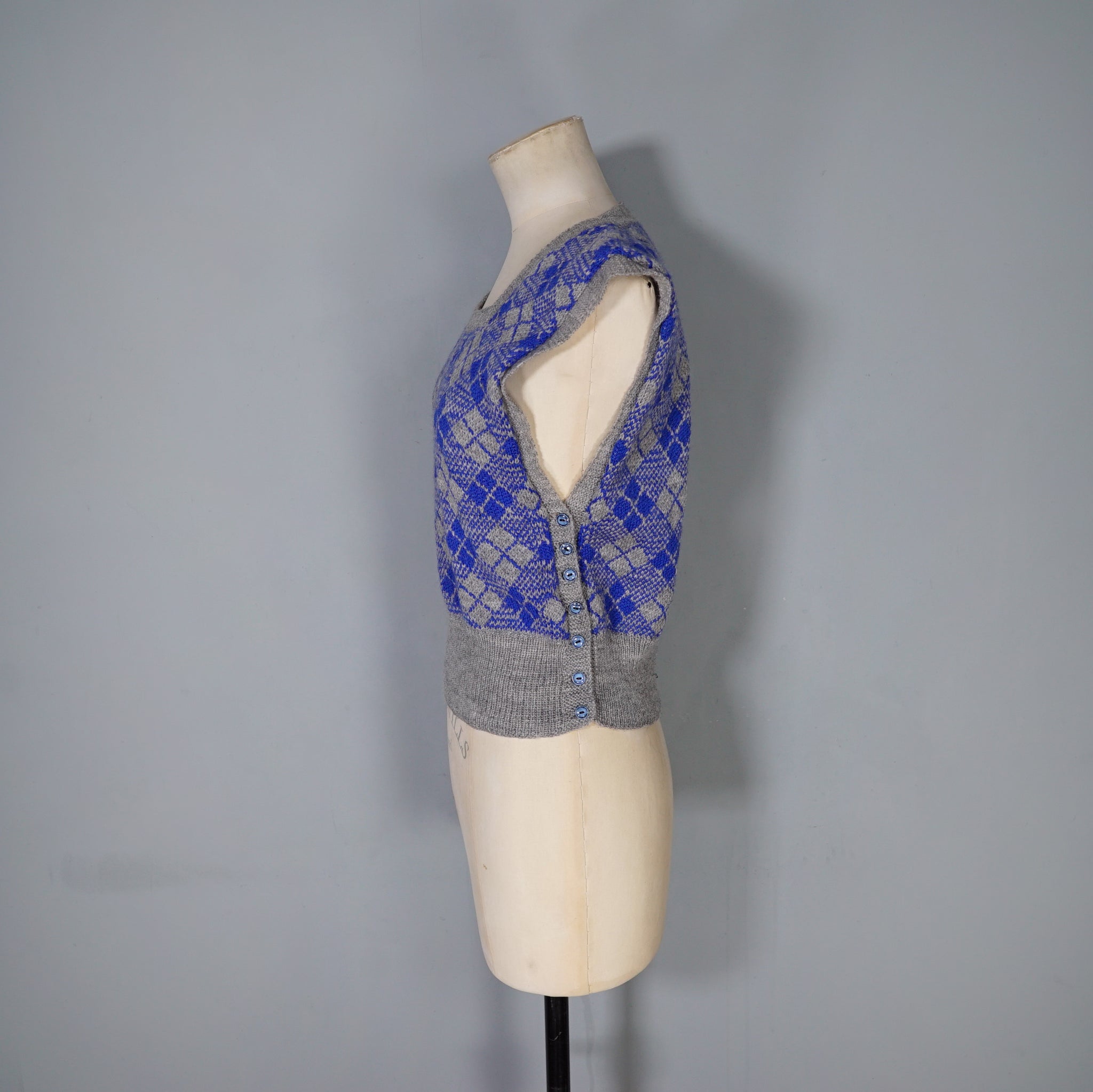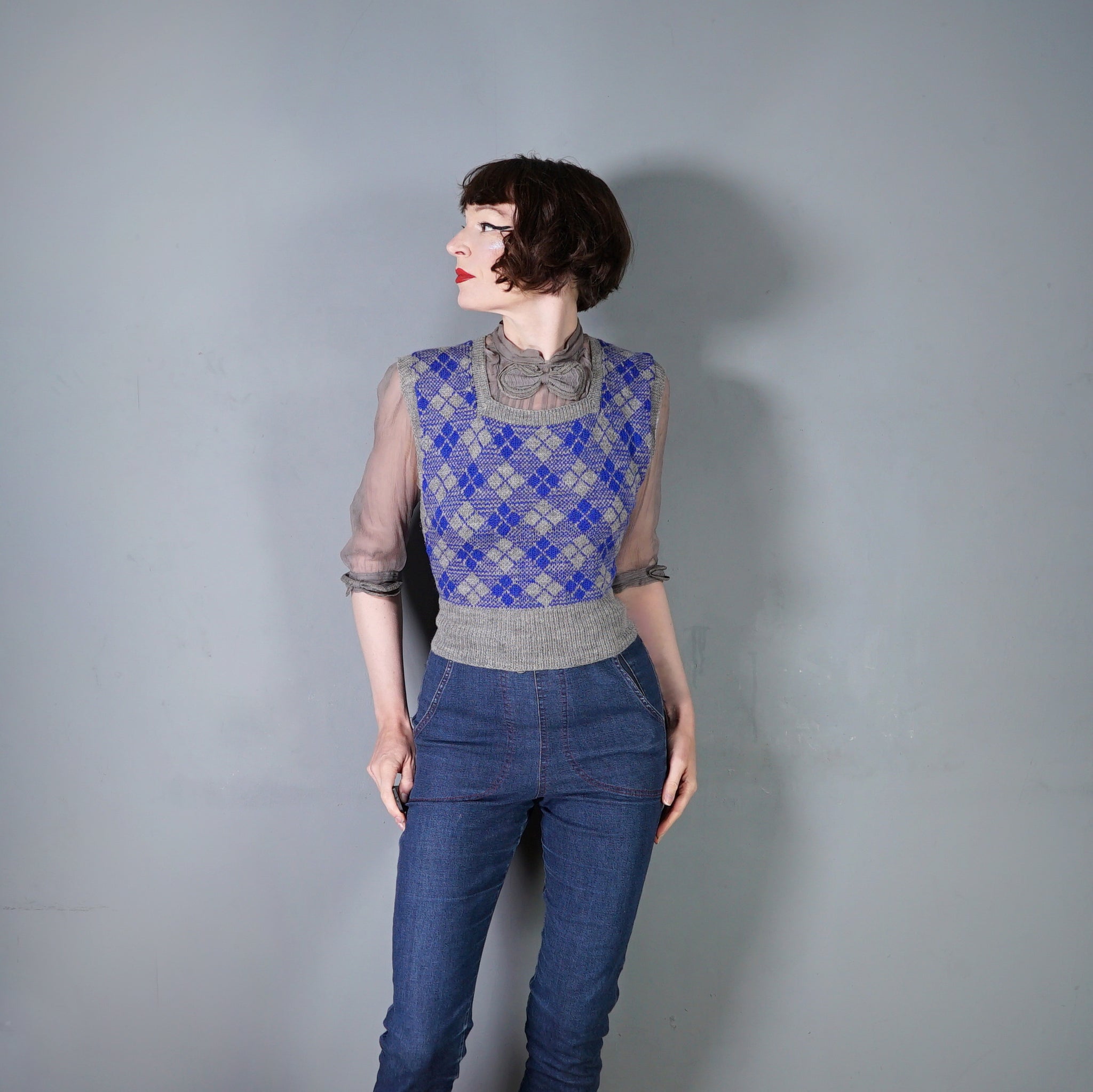 Absolutely so perfect grey and vivid blue soft fine wool handknit tank top in an argyle check. Square neck and sleeveless fit. Wide ribbed waistand. Side buttoning on both sides. No labels. Handknitted most likely from a vintage pattern, hard to know when it has been made, but the style is beautifully 40s, with small vintage buttons down the sides.