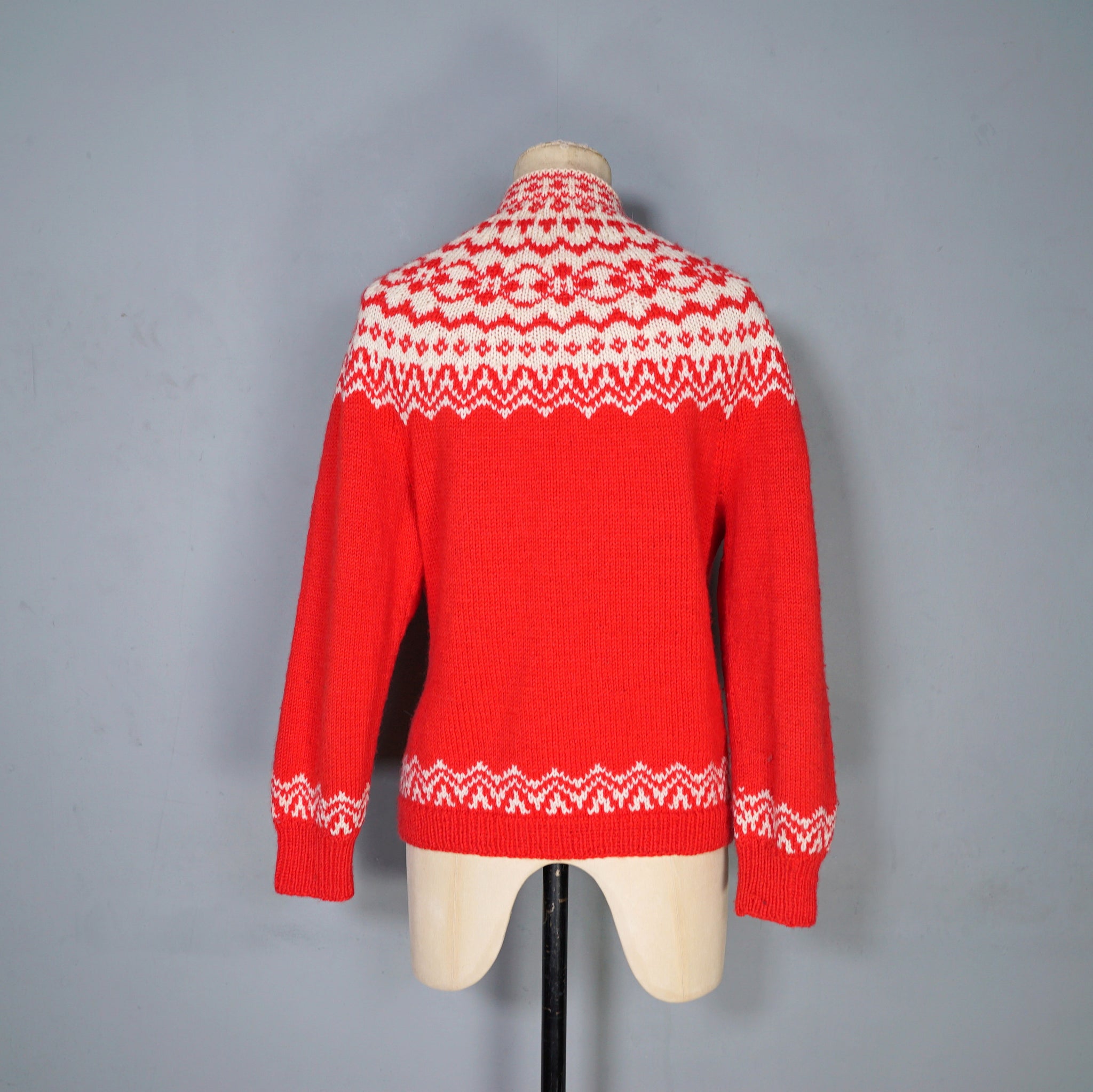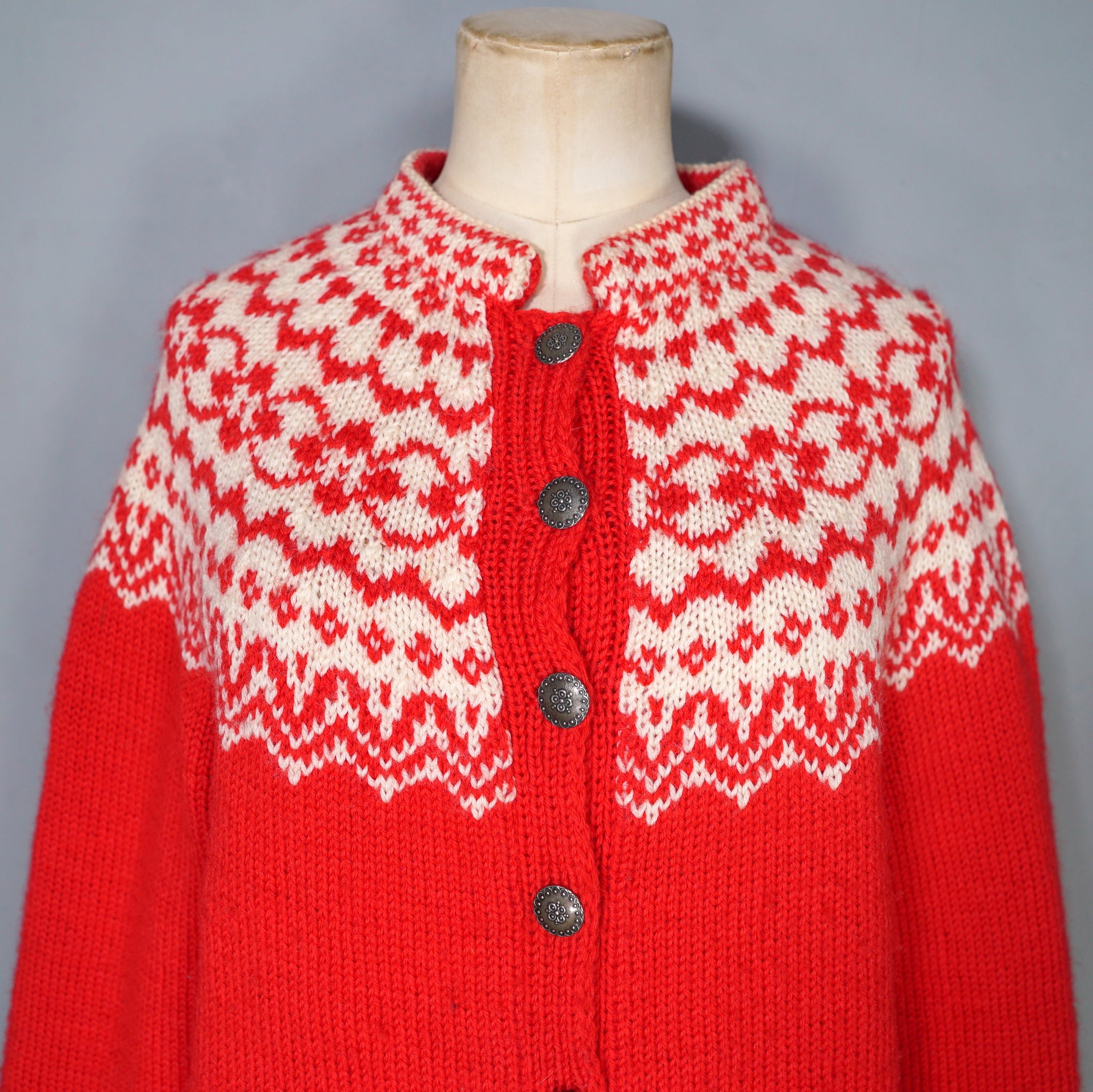 Beautiful handknitted Norwegian cardigan in bright red and white with a fairilse pattern around the neckline and a high collar. Long raglan sleeve. Ribbed waist. Front fastens with small metal embossed buttons. No labels. Would estimate 60s/70s era.