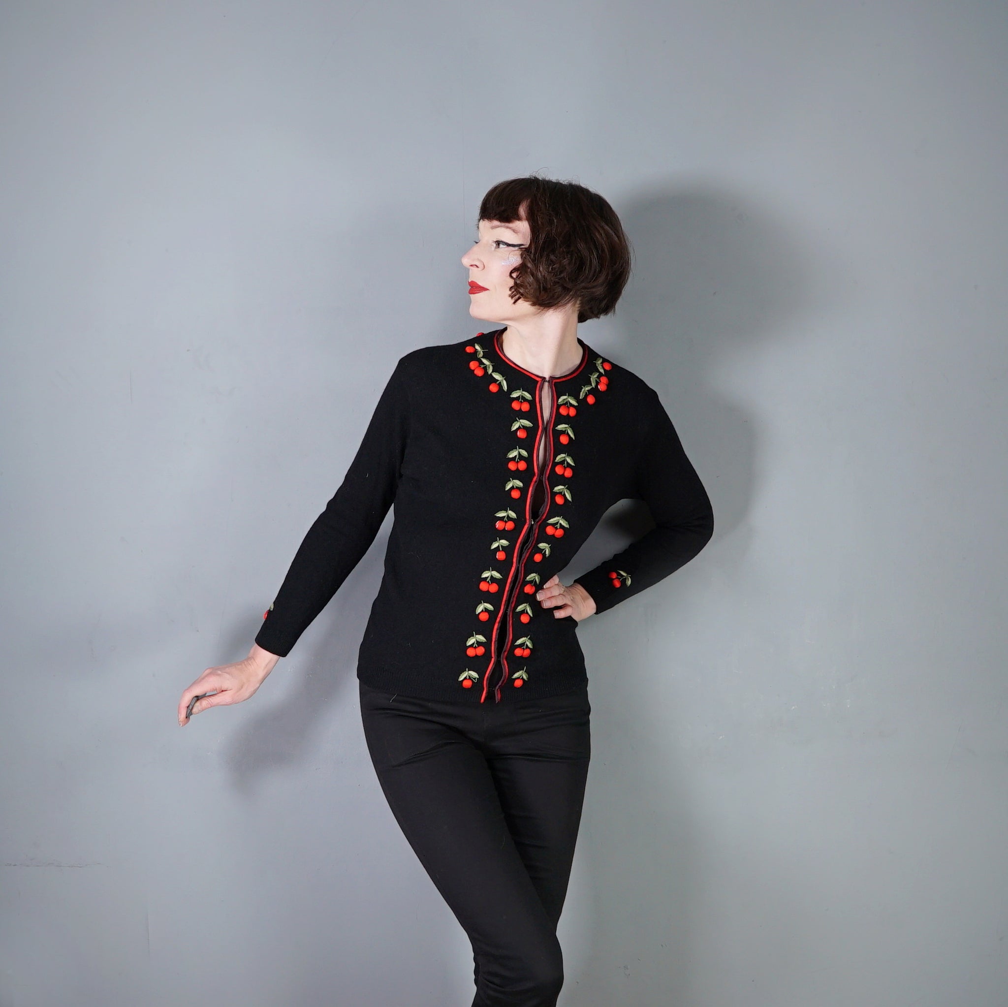 Black soft fine knit wool 60s cardigan with red and brown satin piping and amazing cherry embroidery around the neck and placket. The cherries are slightly padded to give them a rounded 3D effect. Fastens to the front with tiny hooks and eyes. Bracelet sleeve with ribbed cuffs. Ribbed waistband. Fully lined in black. No makers label but a small size tag to the neck.