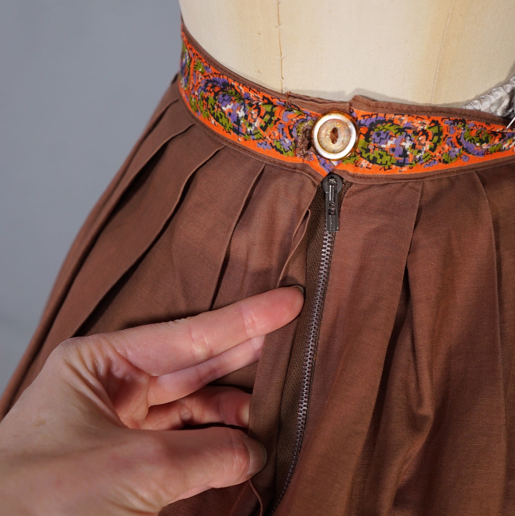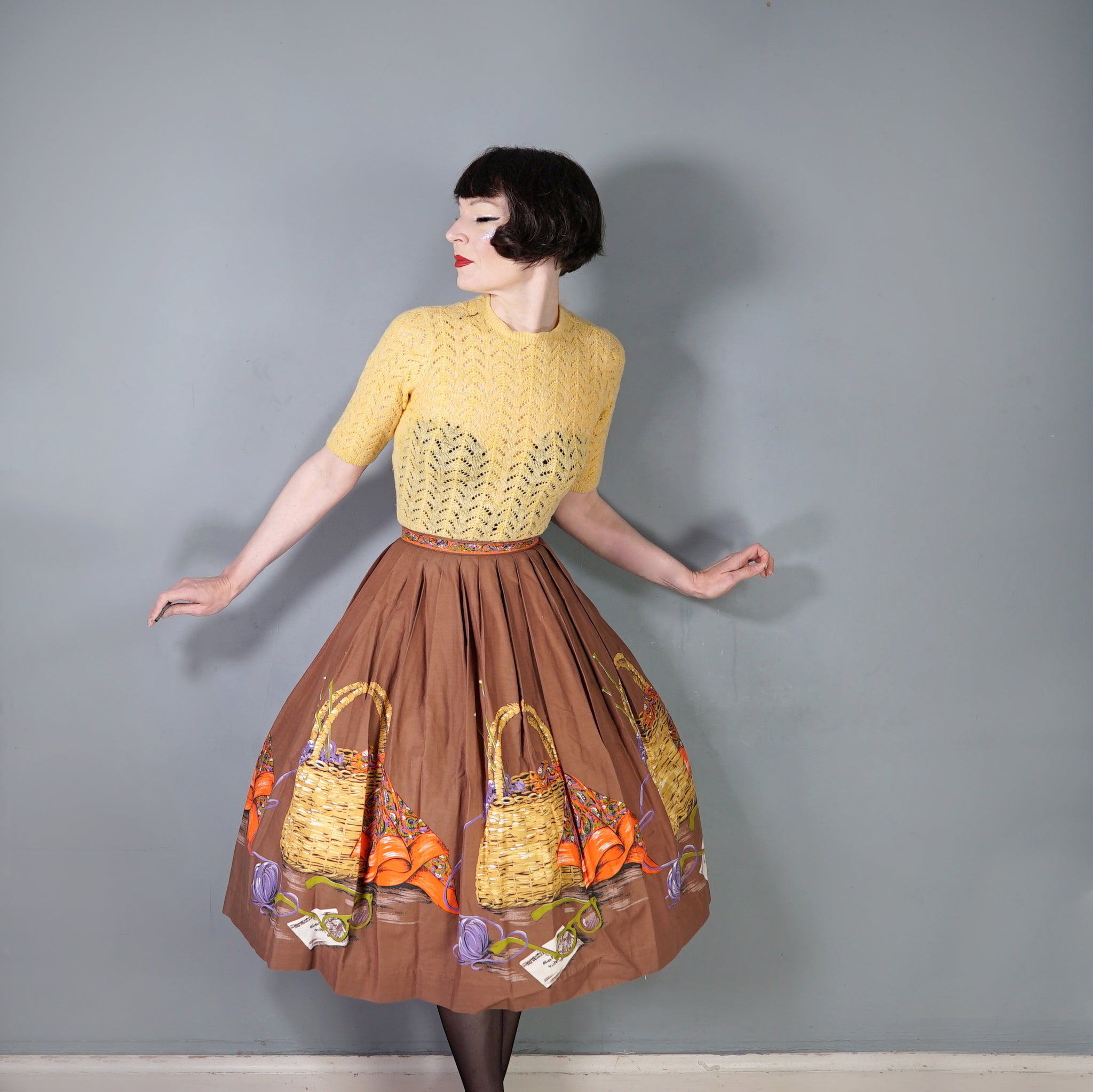 One for the knitters! I love this one so much, such a perfect novelty print by John Wolf. Brown cotton with a big border print with a knitting basket theme. So many cute details, with little letters and green catseye glasses. Wide fitted waistband and lovelty full fit sewn in neat pleats. Metal zip and button to fasten. No labels, very neatly dressmaker made.