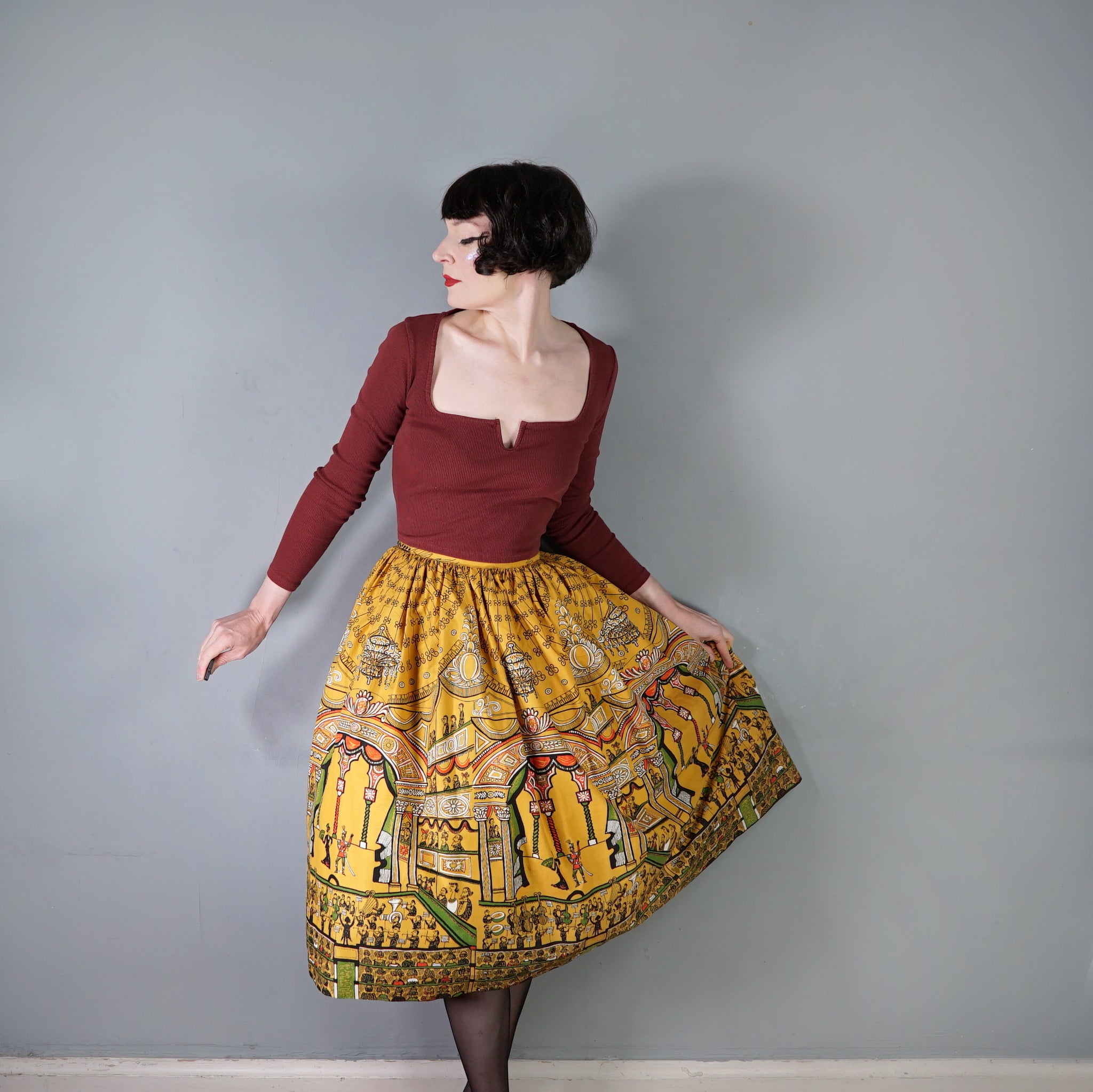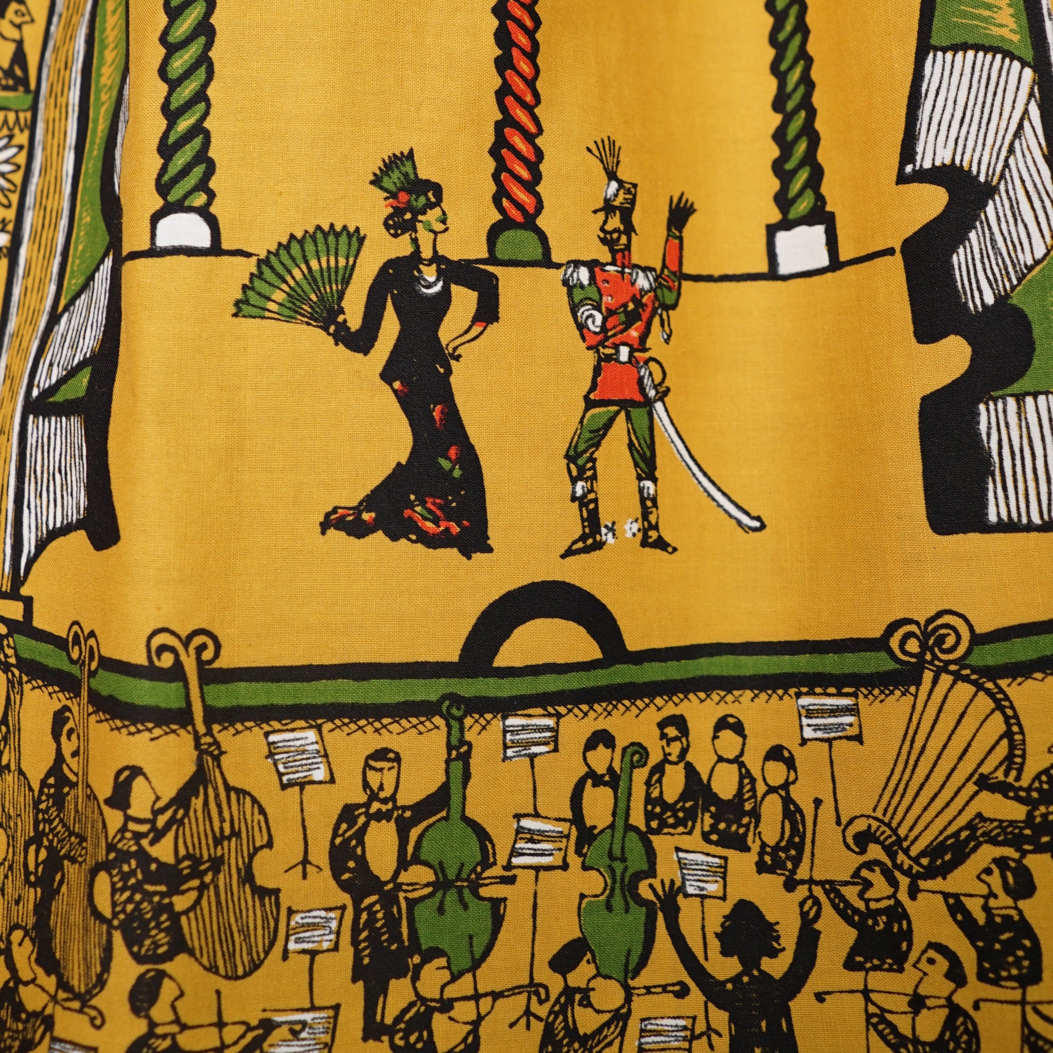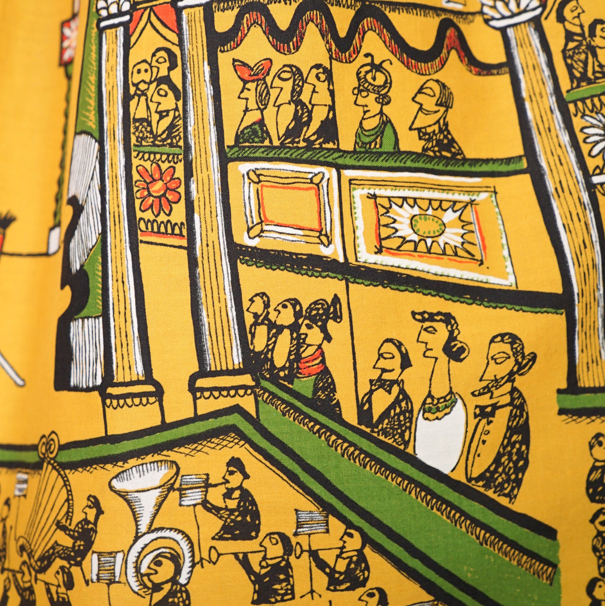 Absolutely stunning 1950s Saul Steinberg print novelty skirt in a goldenrod yellow with the most amazing Mid Century opera print with a beautiful ornate theatre scene with audience and orchestra. Deep yellow with print in black, white, green and red. Slim fitted waistband with button and metal zip to fasten. No labels.