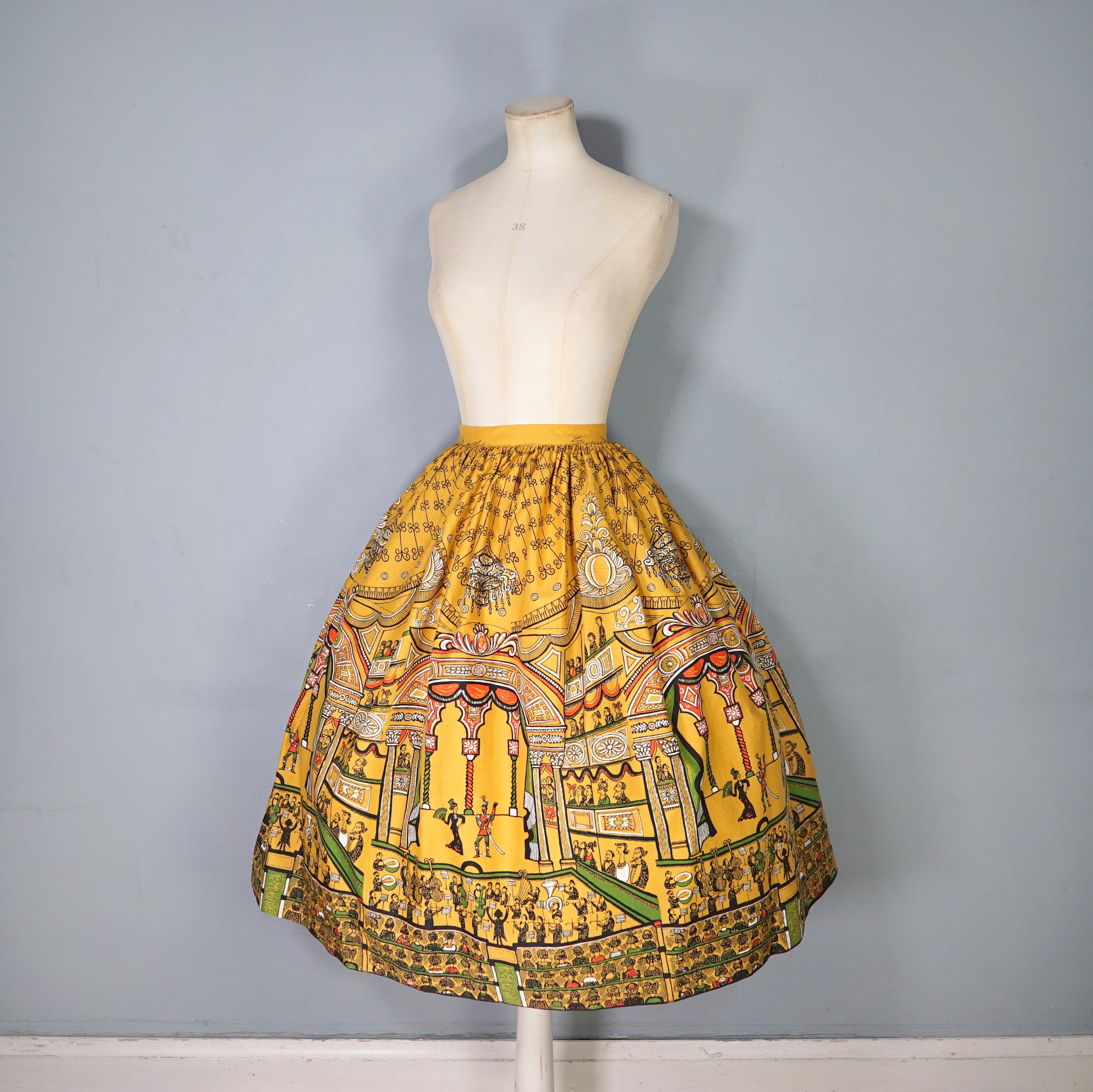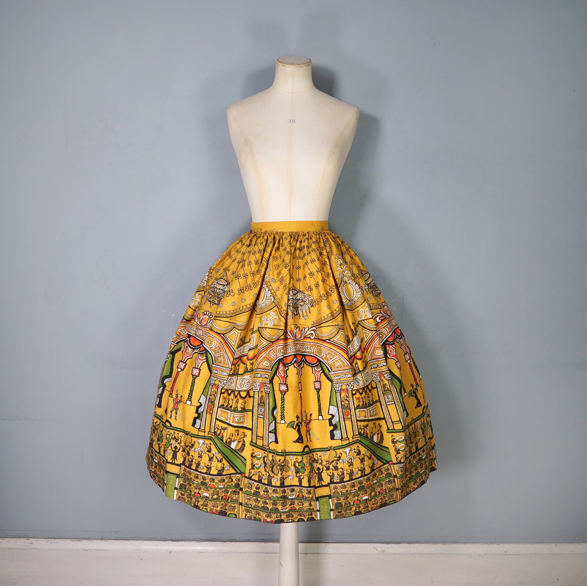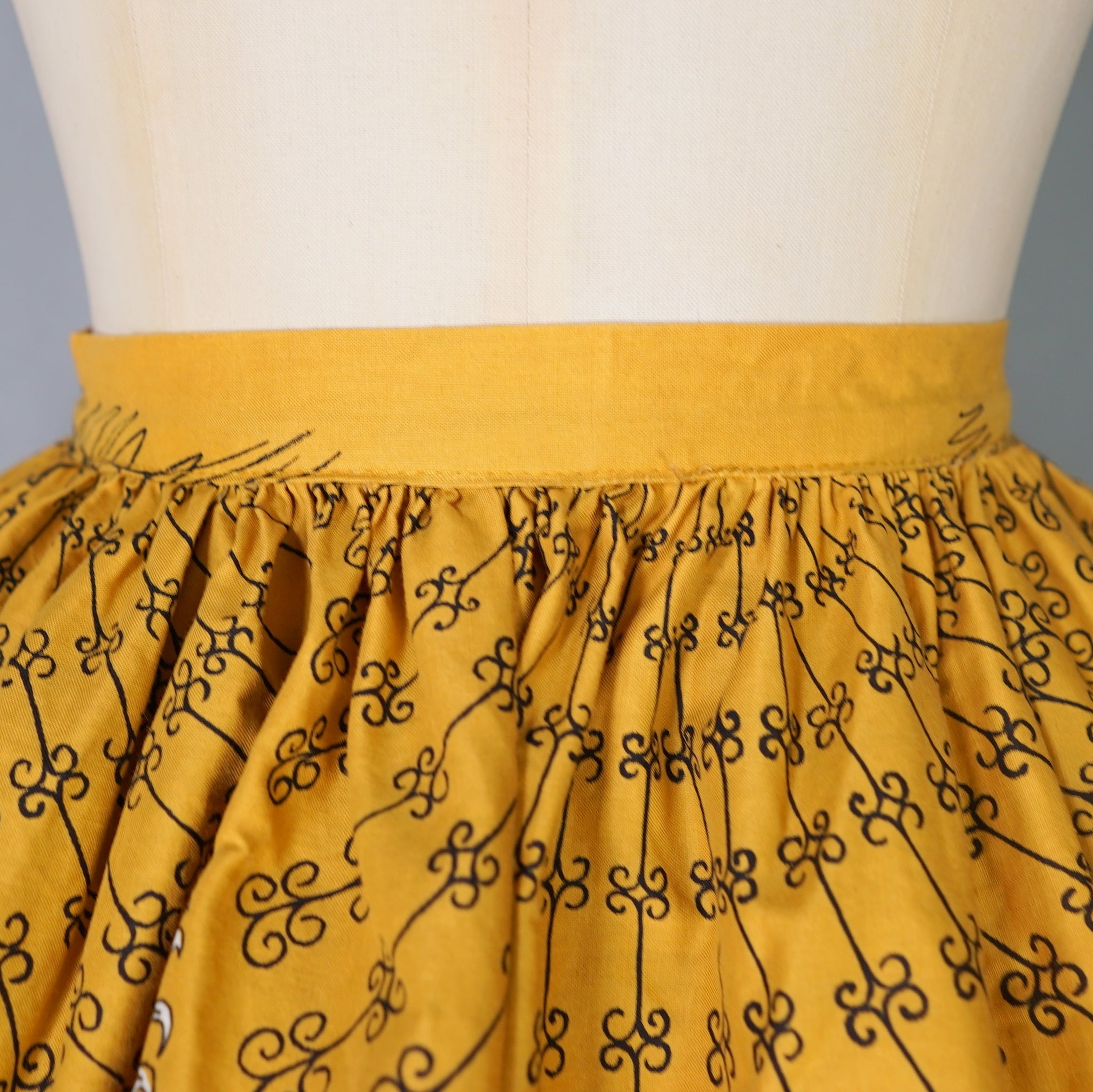 Absolutely stunning 1950s Saul Steinberg print novelty skirt in a goldenrod yellow with the most amazing Mid Century opera print with a beautiful ornate theatre scene with audience and orchestra. Deep yellow with print in black, white, green and red. Slim fitted waistband with button and metal zip to fasten. No labels.