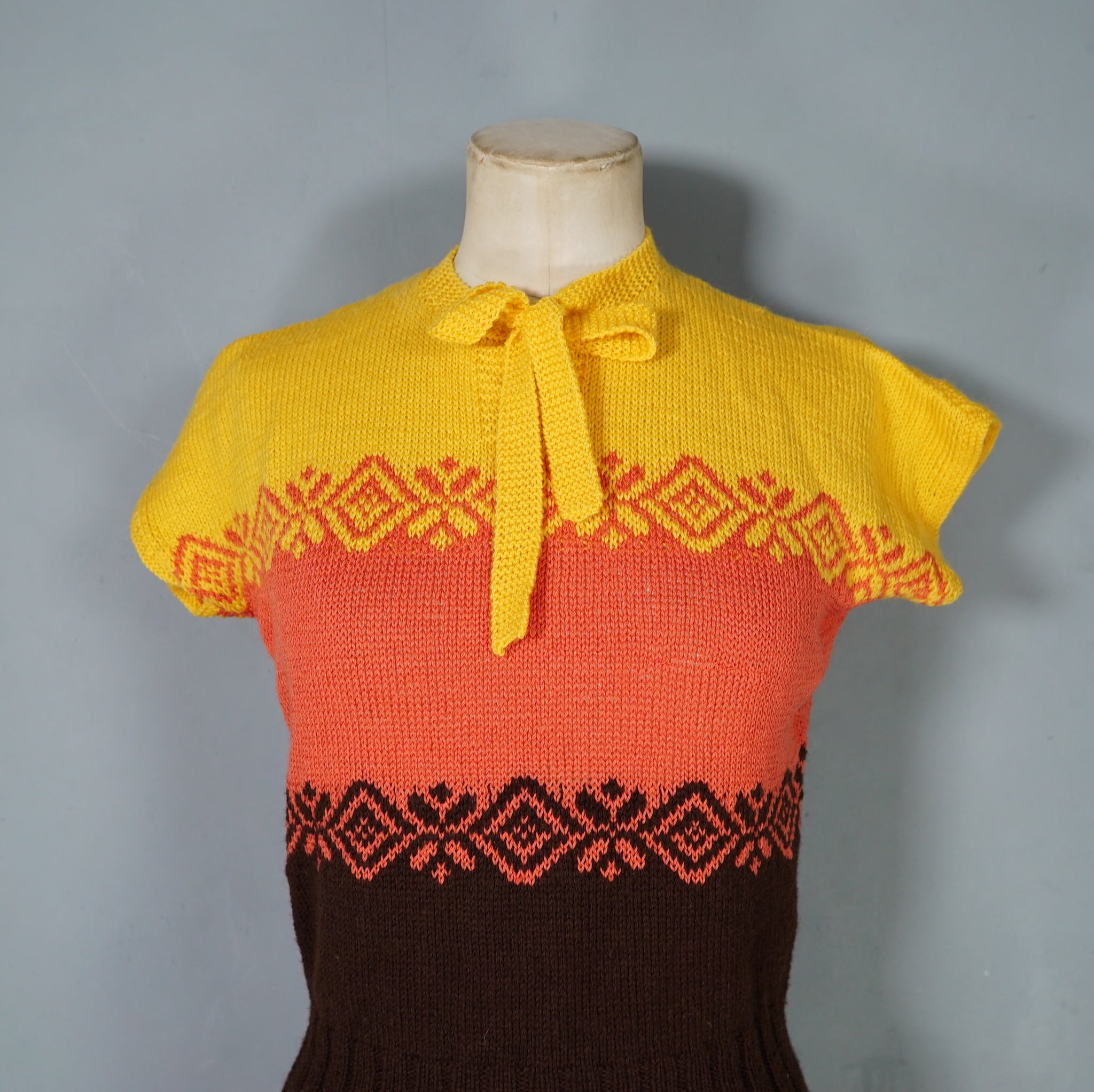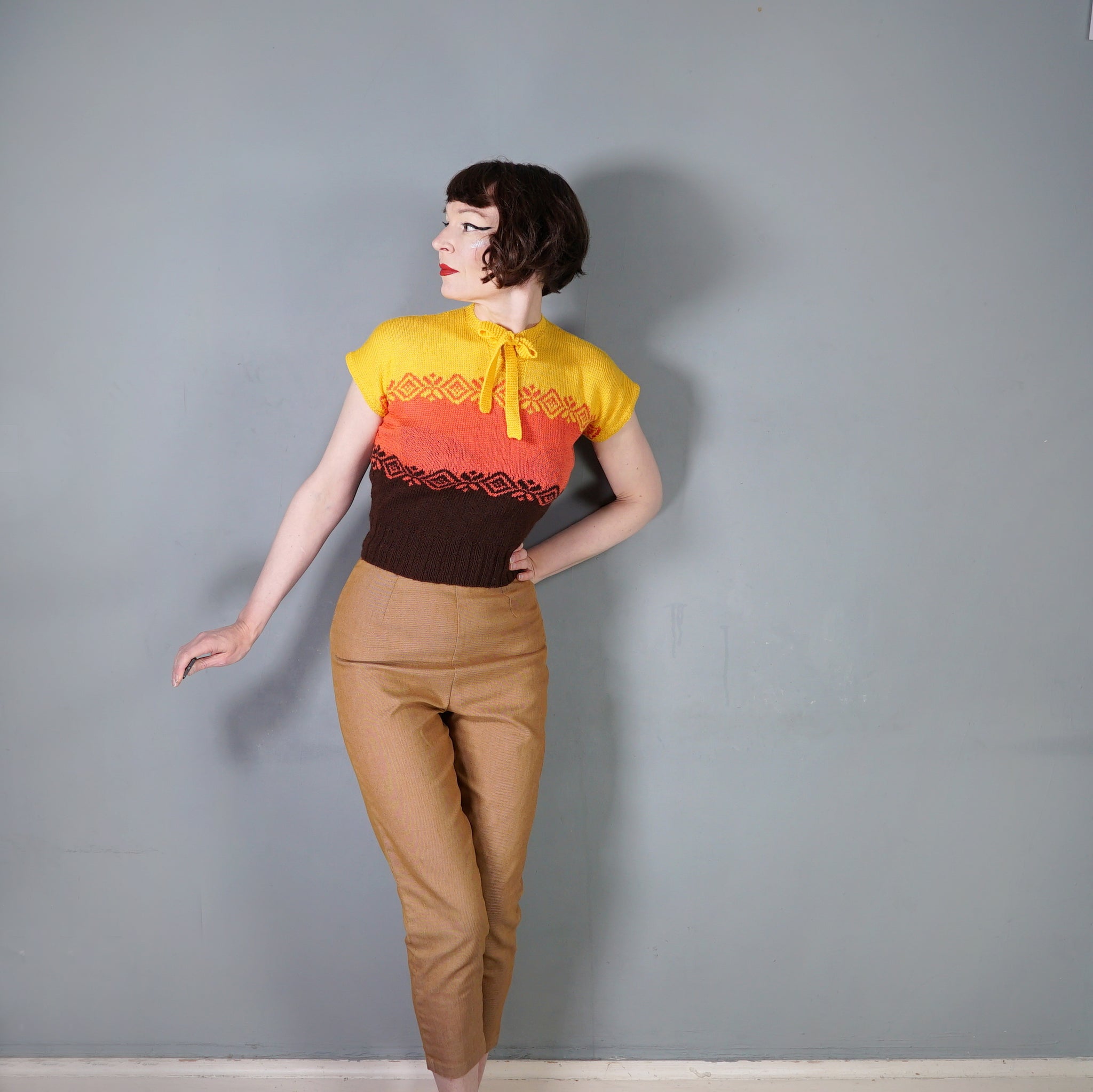Soft handknitted jumper in a 40s style with a tri-colour colourblock design in bright yellow, coral and dark brown. Short batwing sleeve and cut bow tie collar. Cropped length with wide ribbed waist. No labels. Very soft. The different yarns have slightly different textures - the yellow feels like wool, the brown like acrylic and the coral like a rayon maybe. Really lovely seasonal knit!