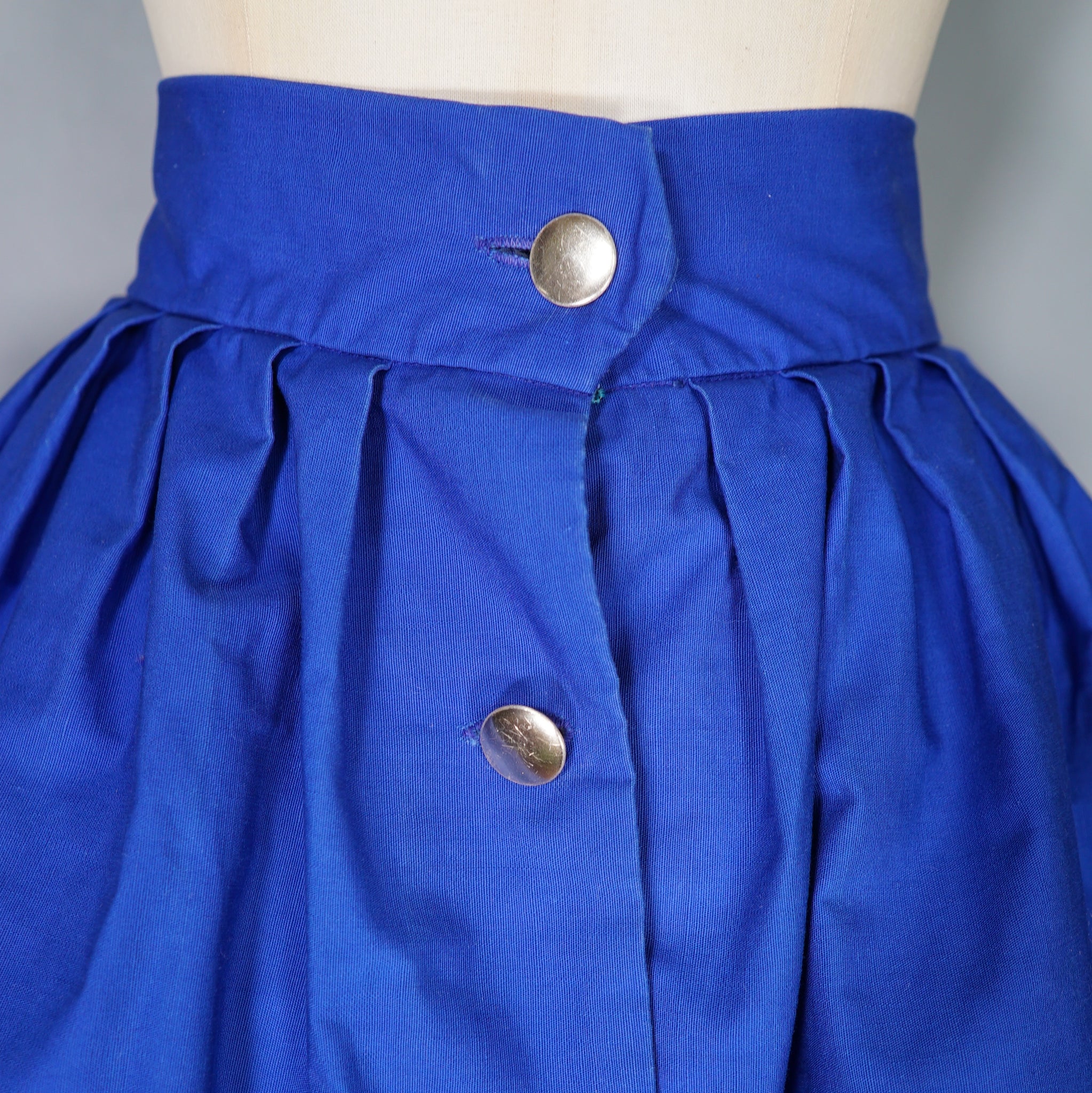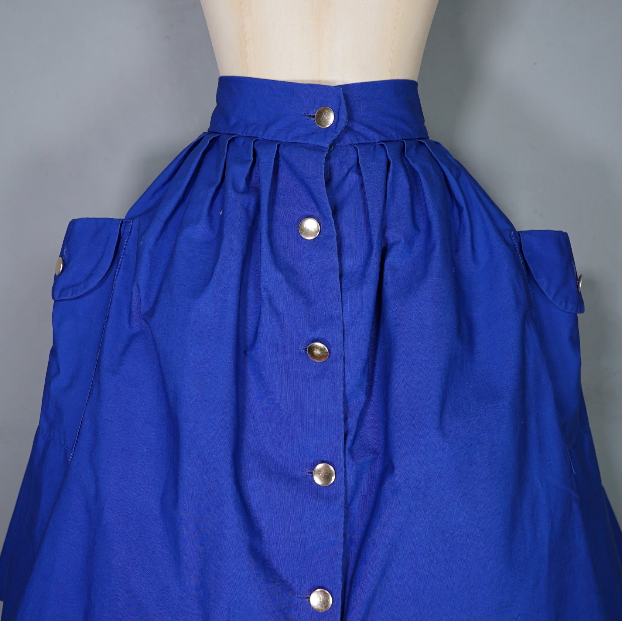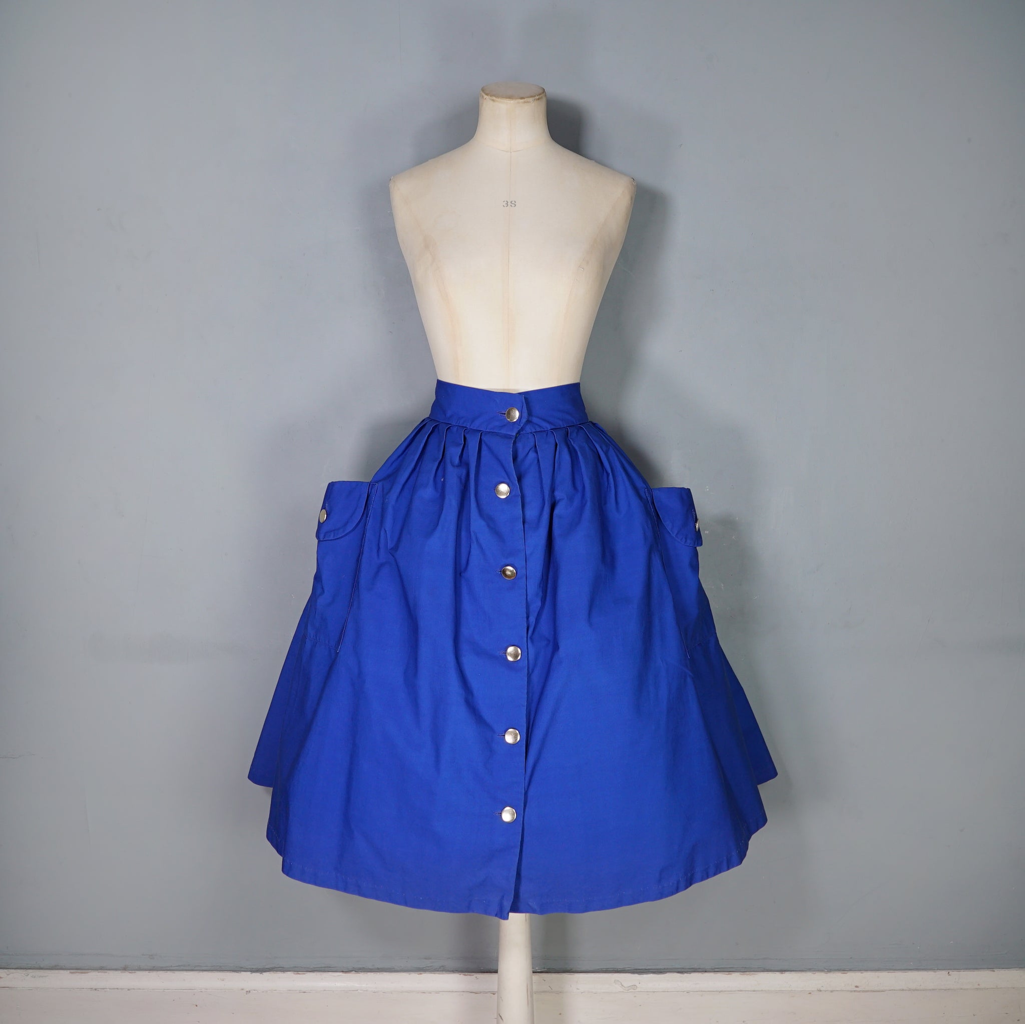 Smart and so versatile 50s/60s full skirt in a rich blue shade and a lovely thicker cotton that holds the shape and silhouette beautifully. Front fastens with gold toned shank buttons. And deep pockets with buttoned flap on the hip. Wide firm waistband and a generous full fit sewn in neat pleats. Midi length. Lovely colourful addition!