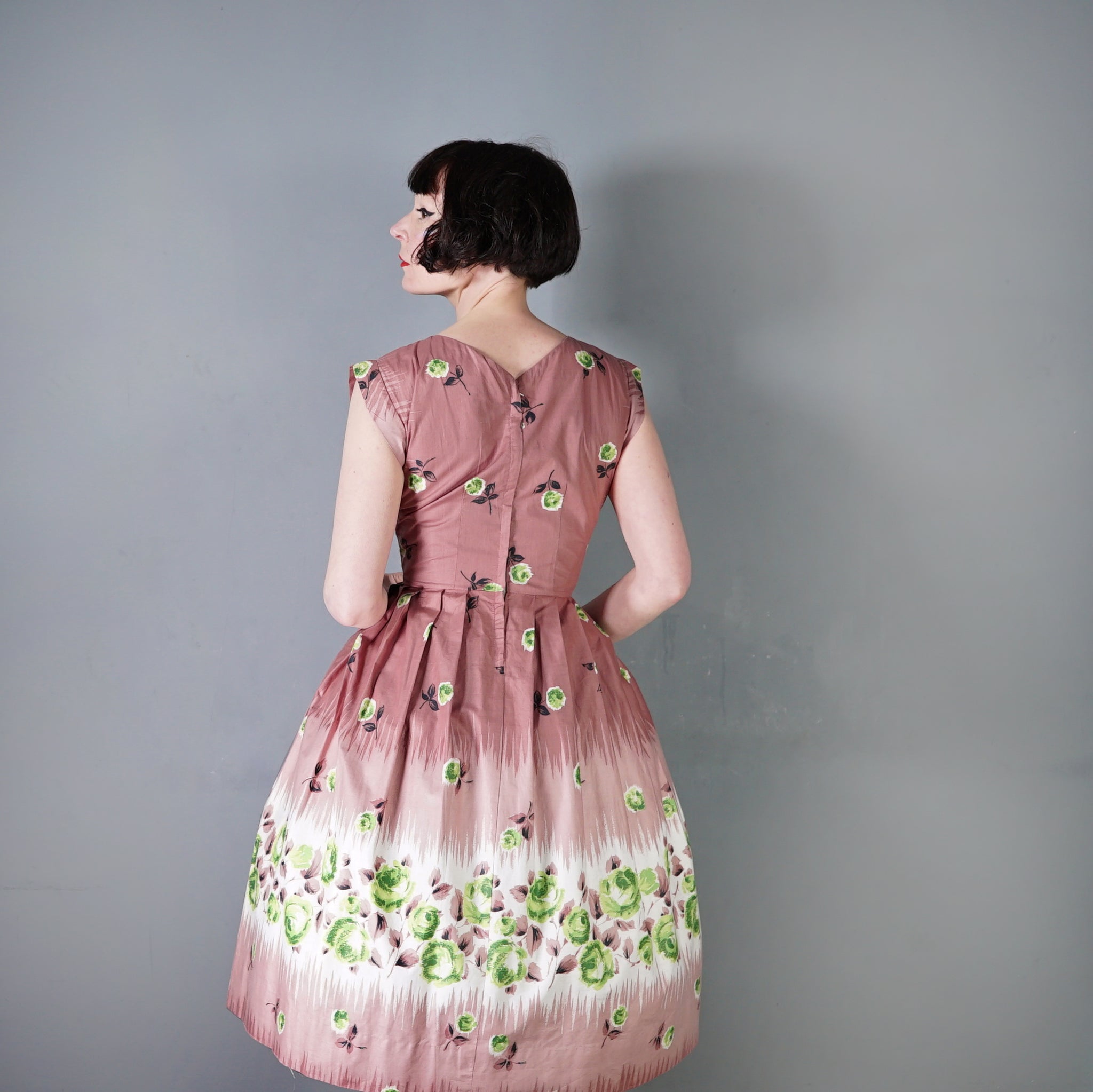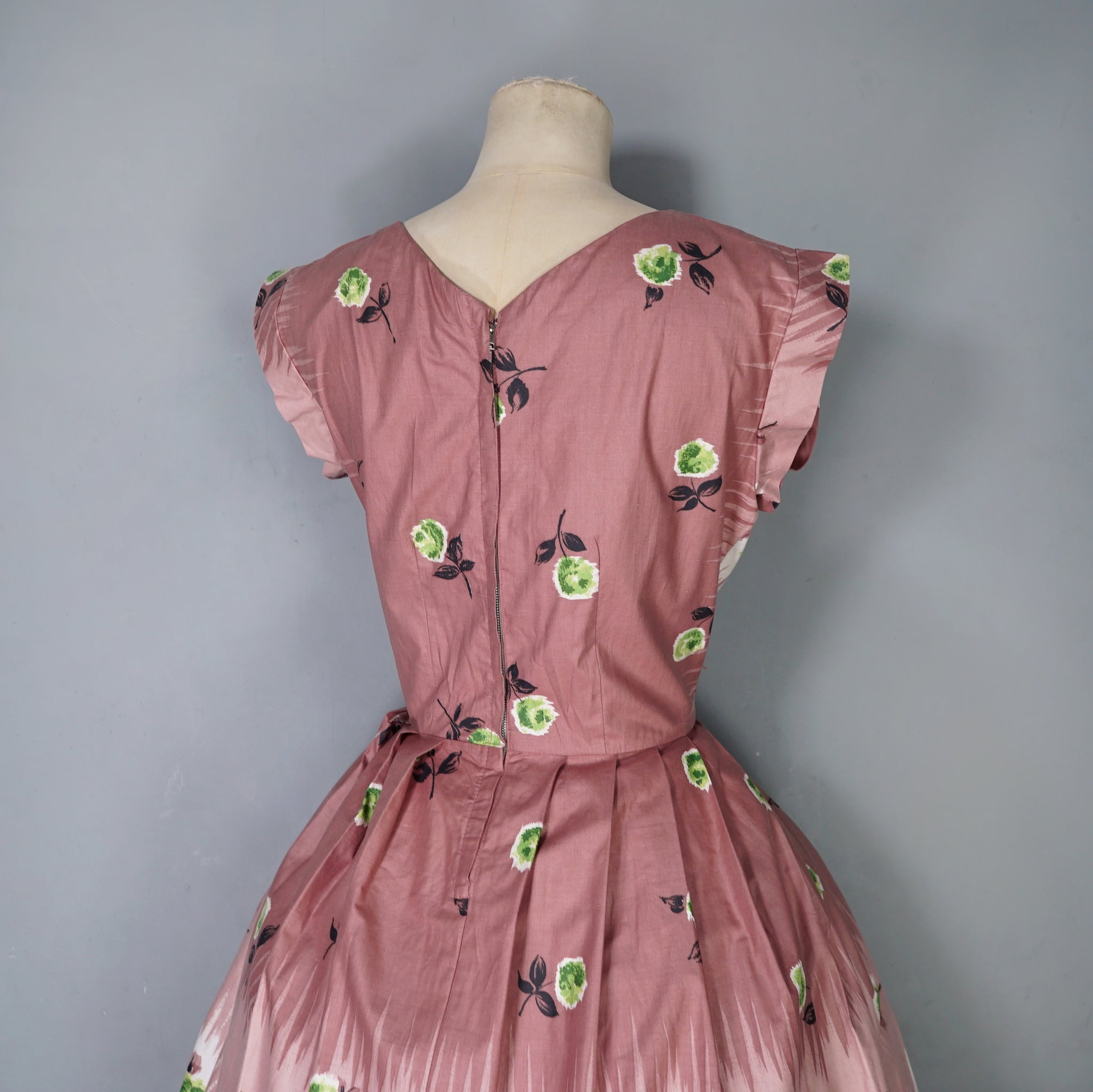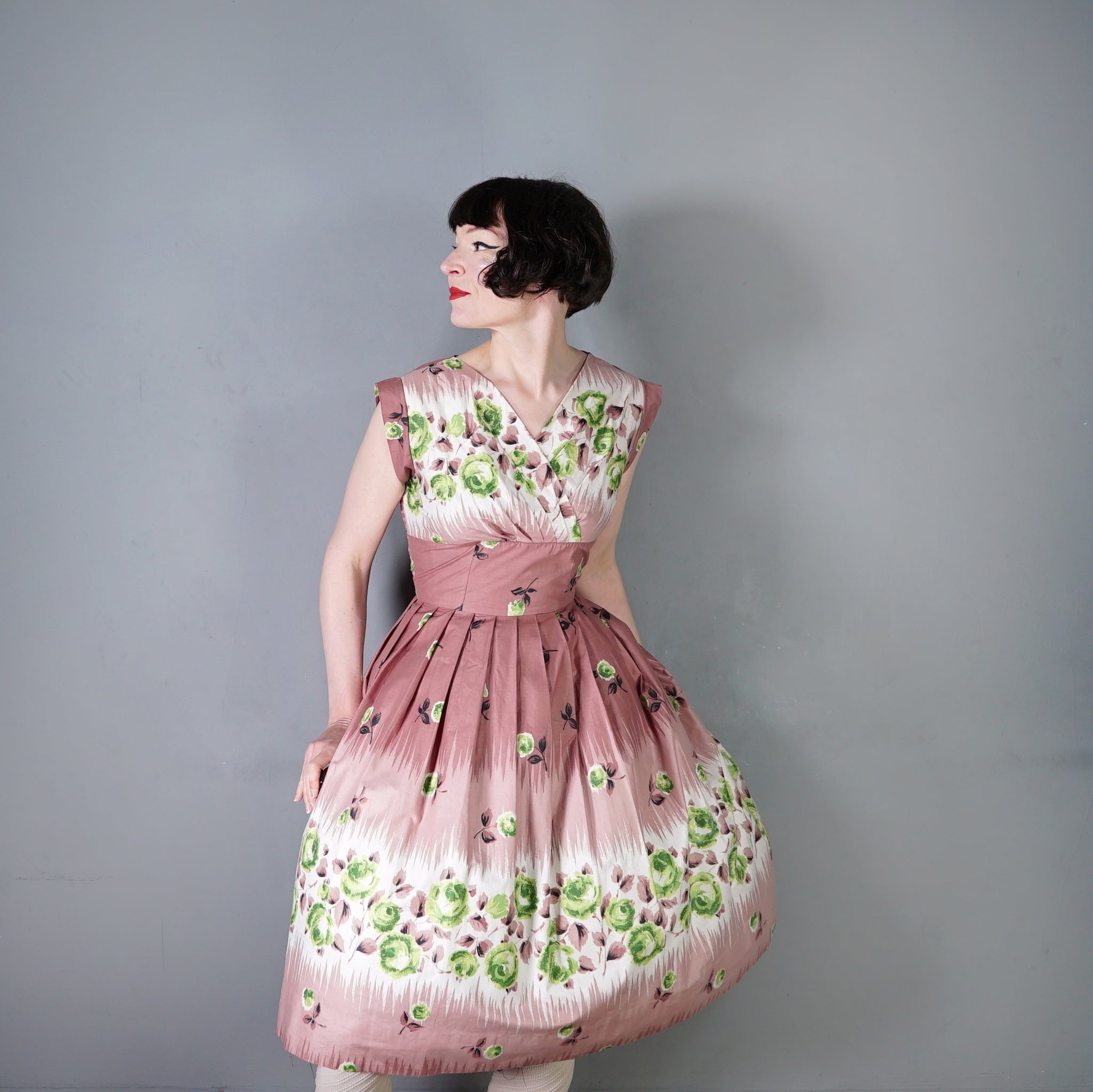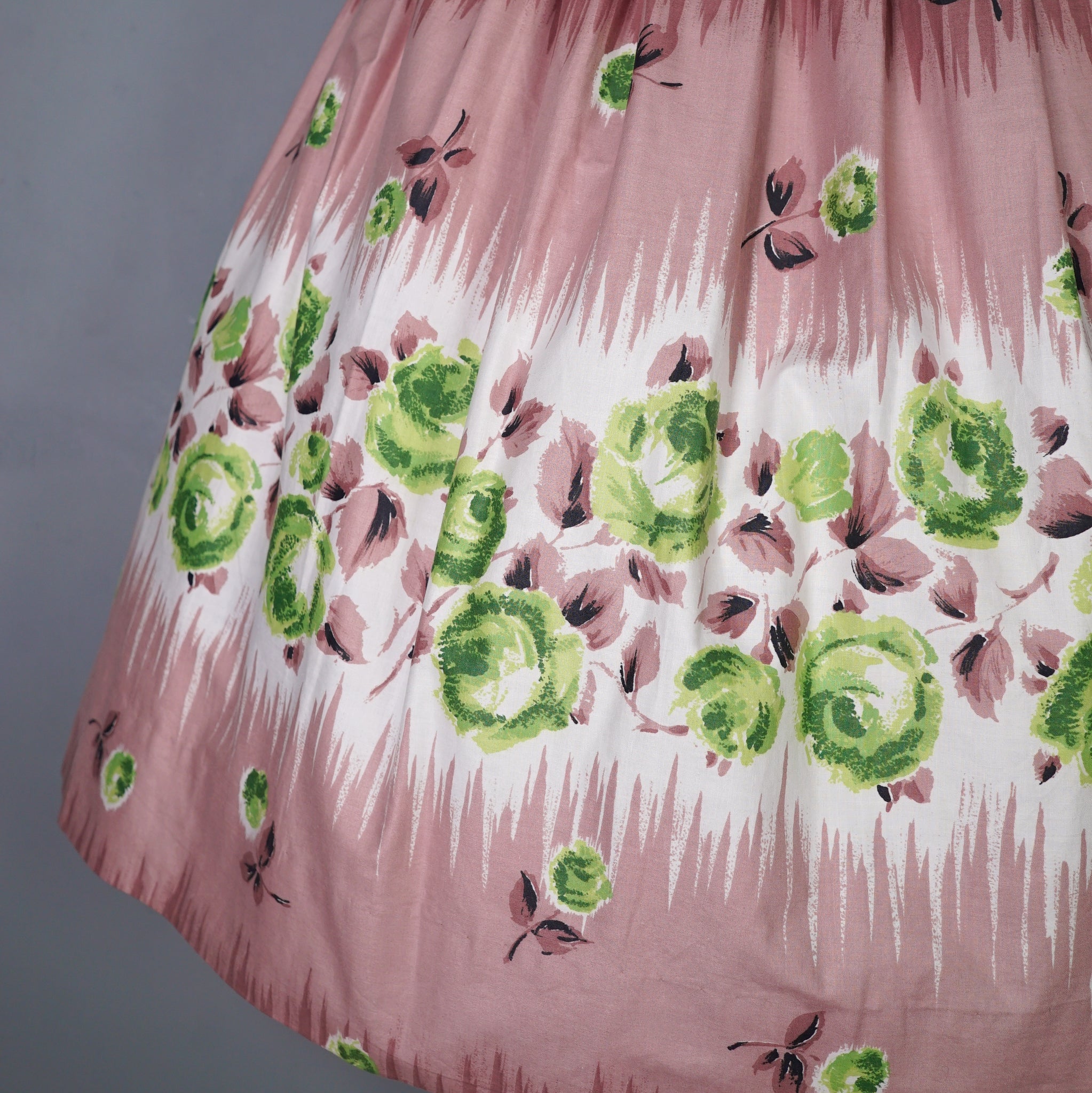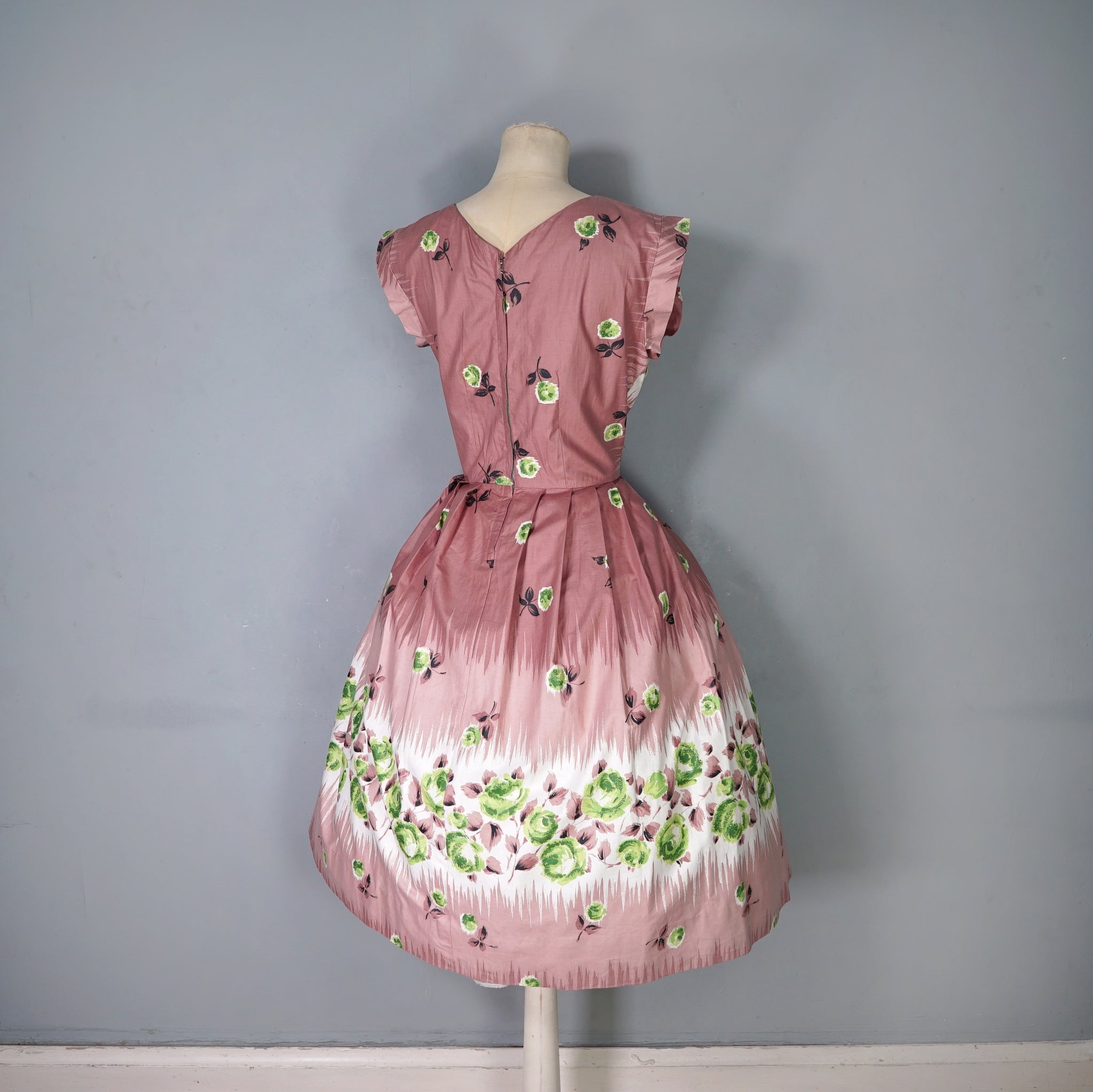 Delightful brown cotton day dress with the loveliest painterly green rose print. Wide fitted waist and a shelfy empire bustline with a overlapping v-neck with gathers and a short sleeve with cuffs. Skirt is full, sewn in neat wide gathers. Midi length. Back metal zipper. No labels. Just gorgeous.