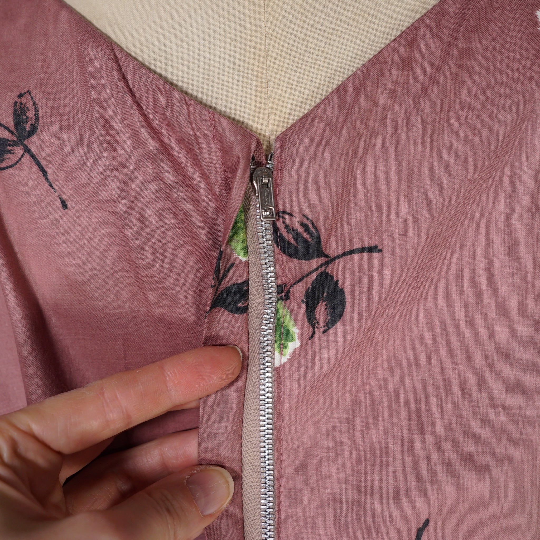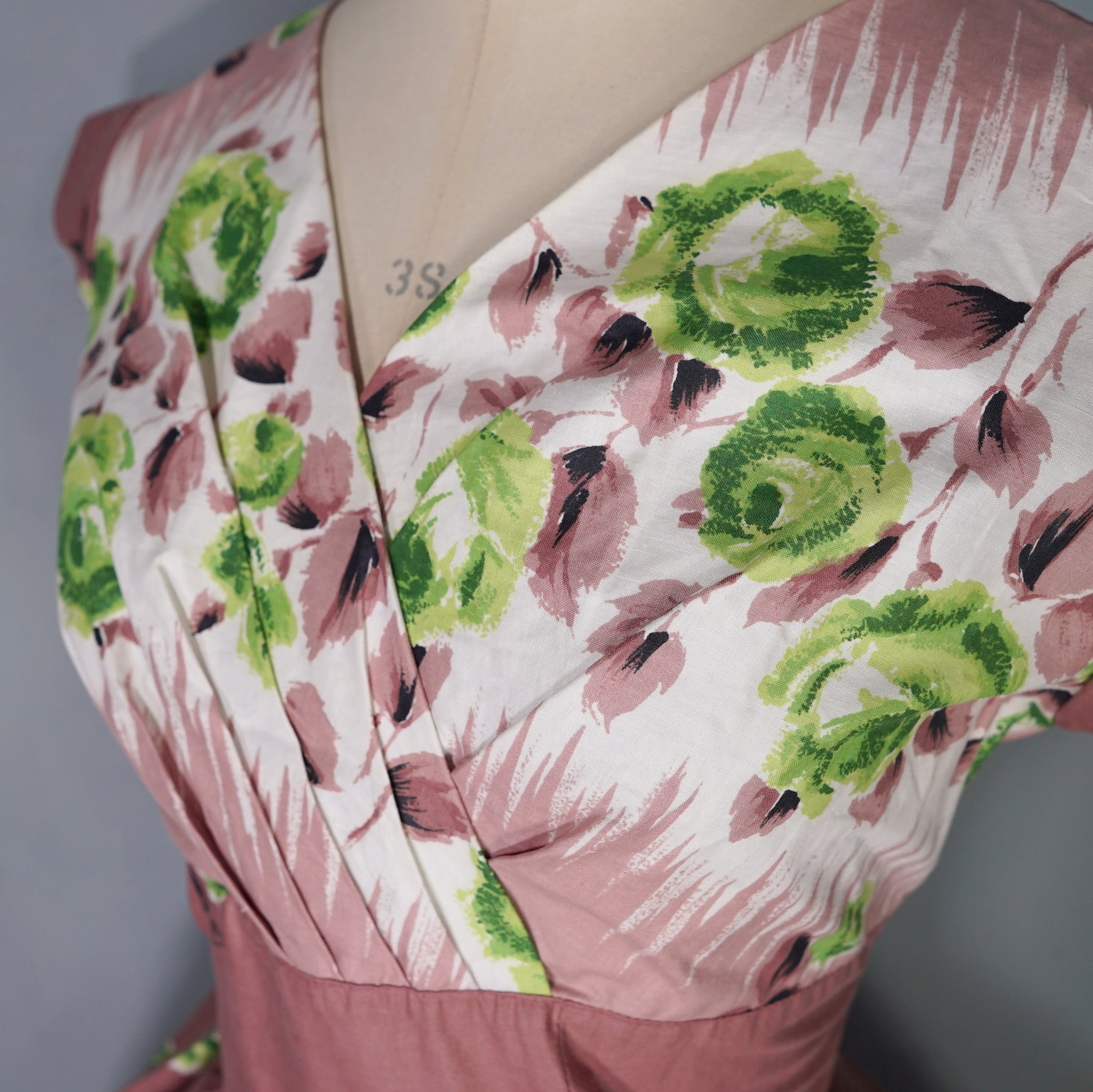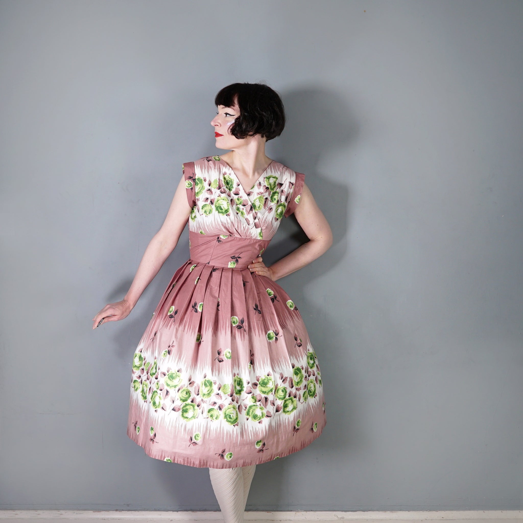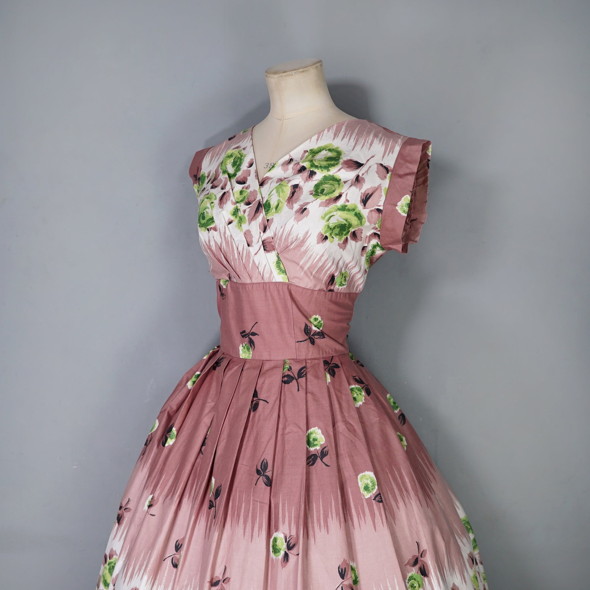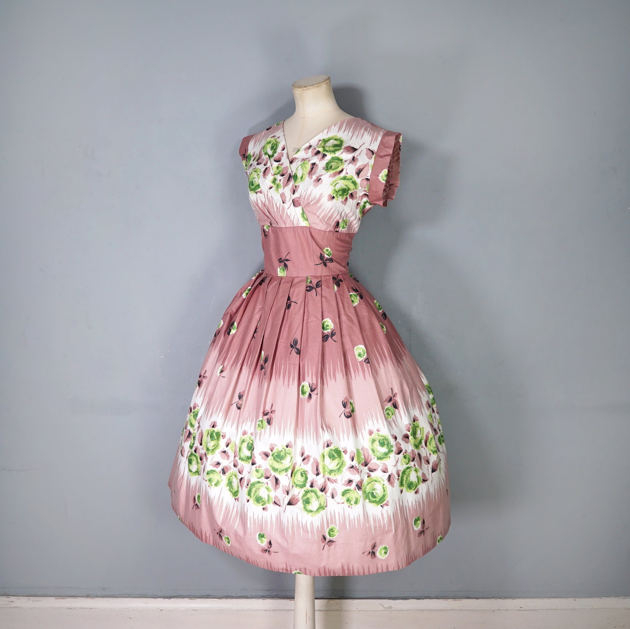 Delightful brown cotton day dress with the loveliest painterly green rose print. Wide fitted waist and a shelfy empire bustline with a overlapping v-neck with gathers and a short sleeve with cuffs. Skirt is full, sewn in neat wide gathers. Midi length. Back metal zipper. No labels. Just gorgeous.
