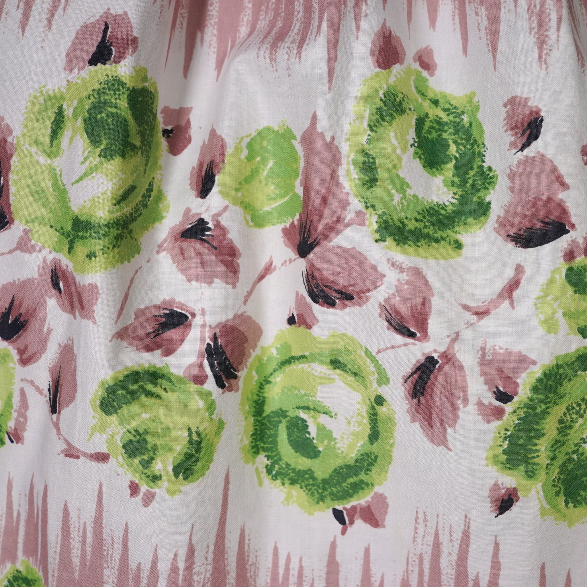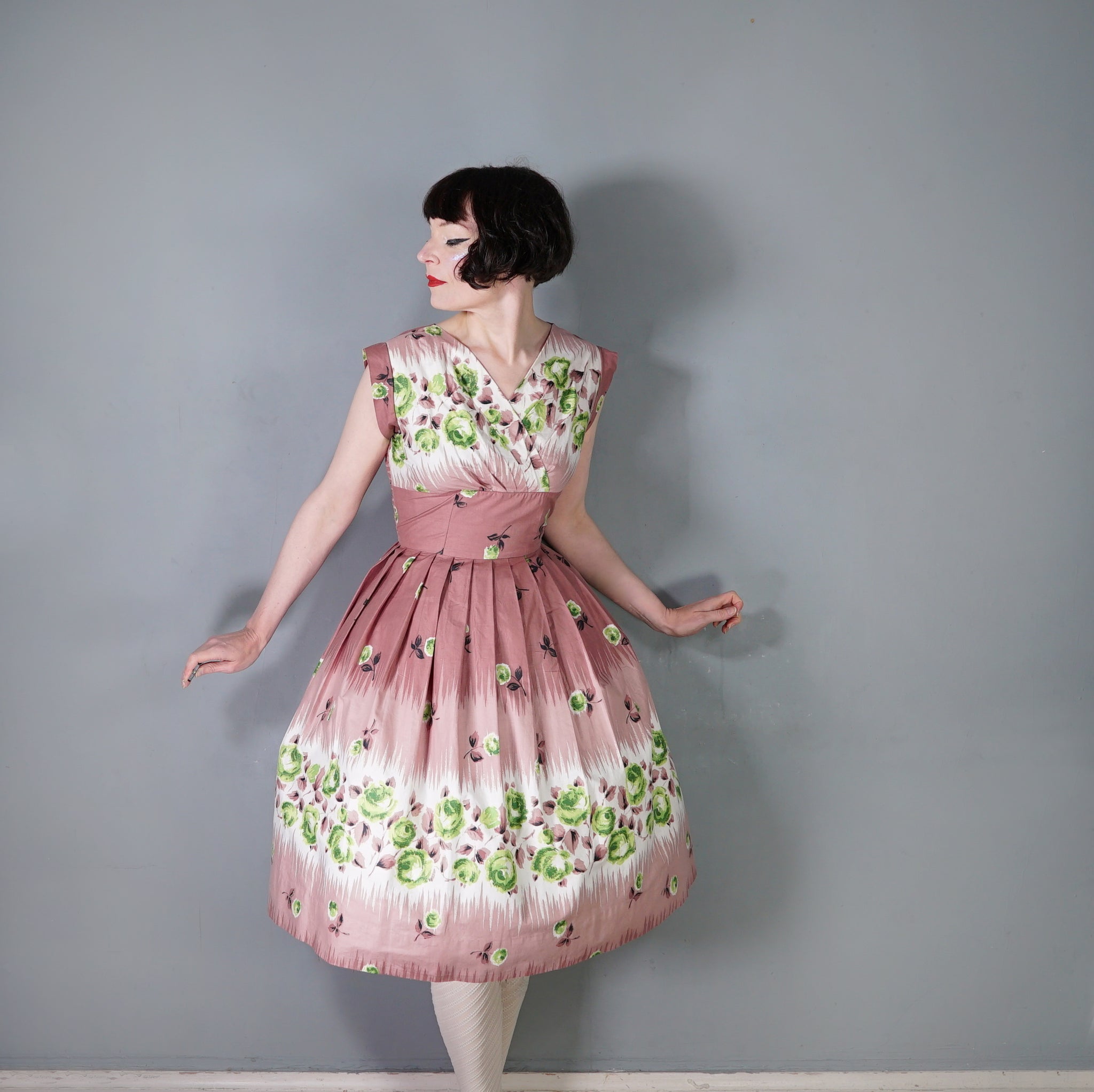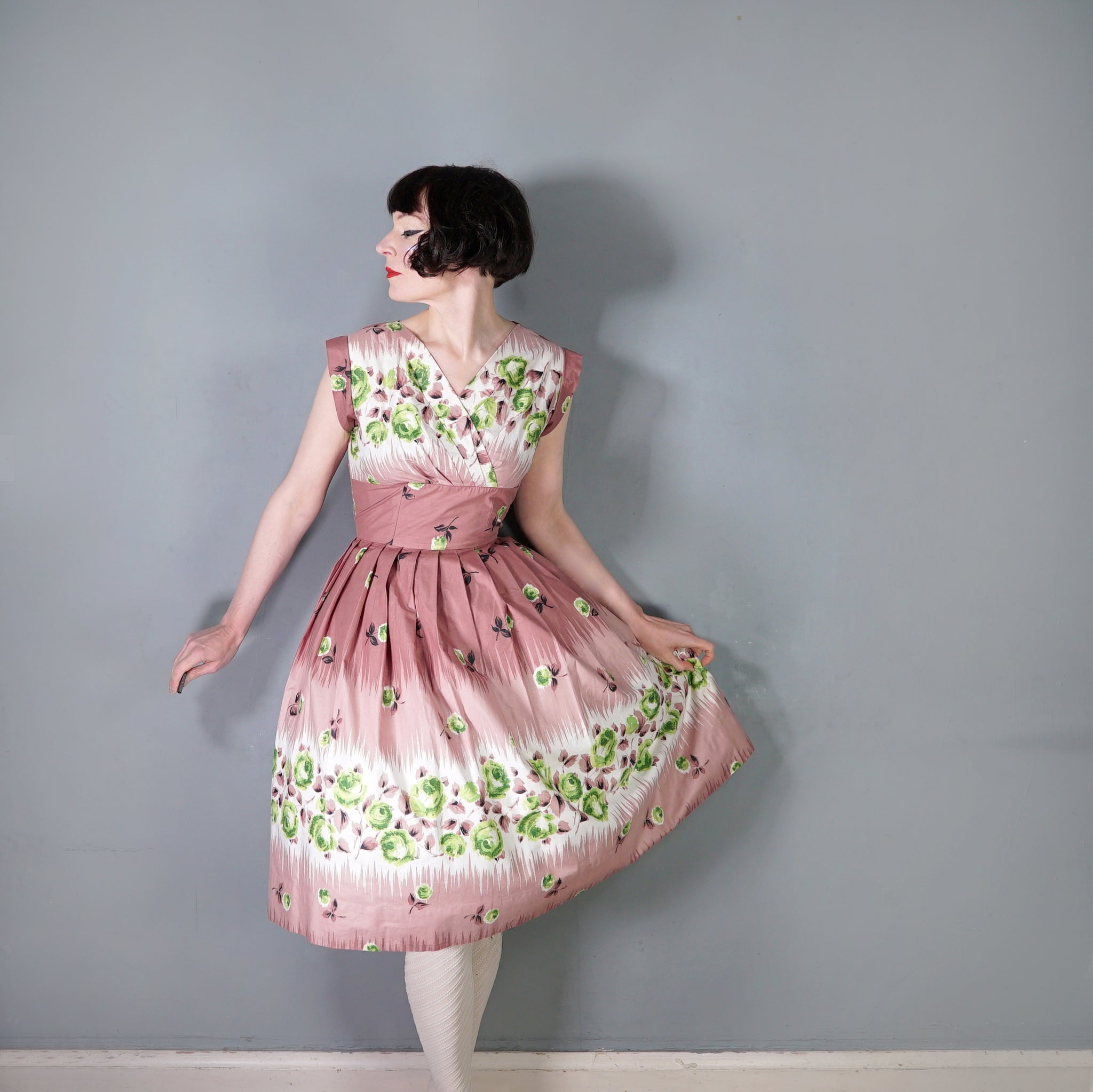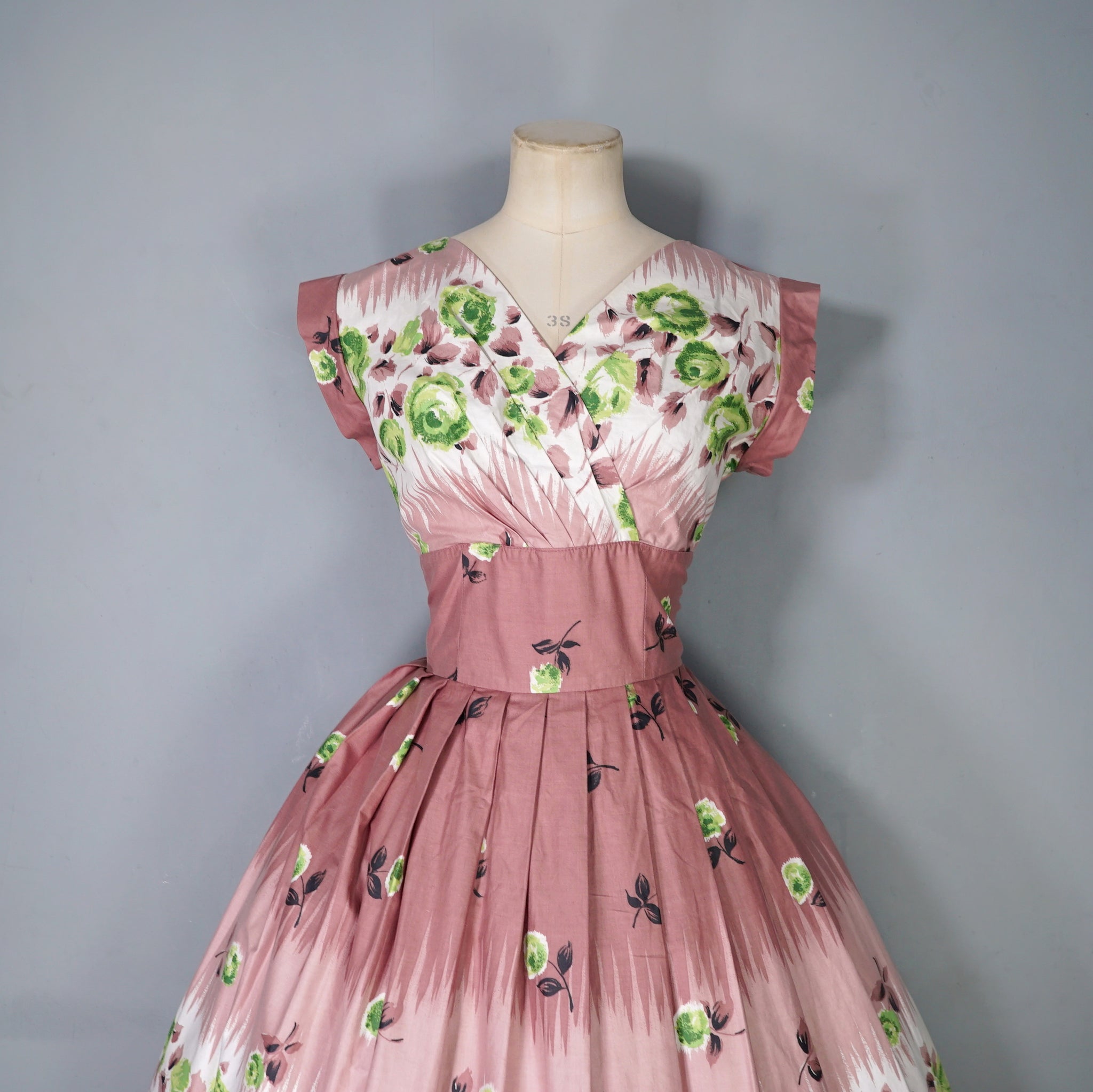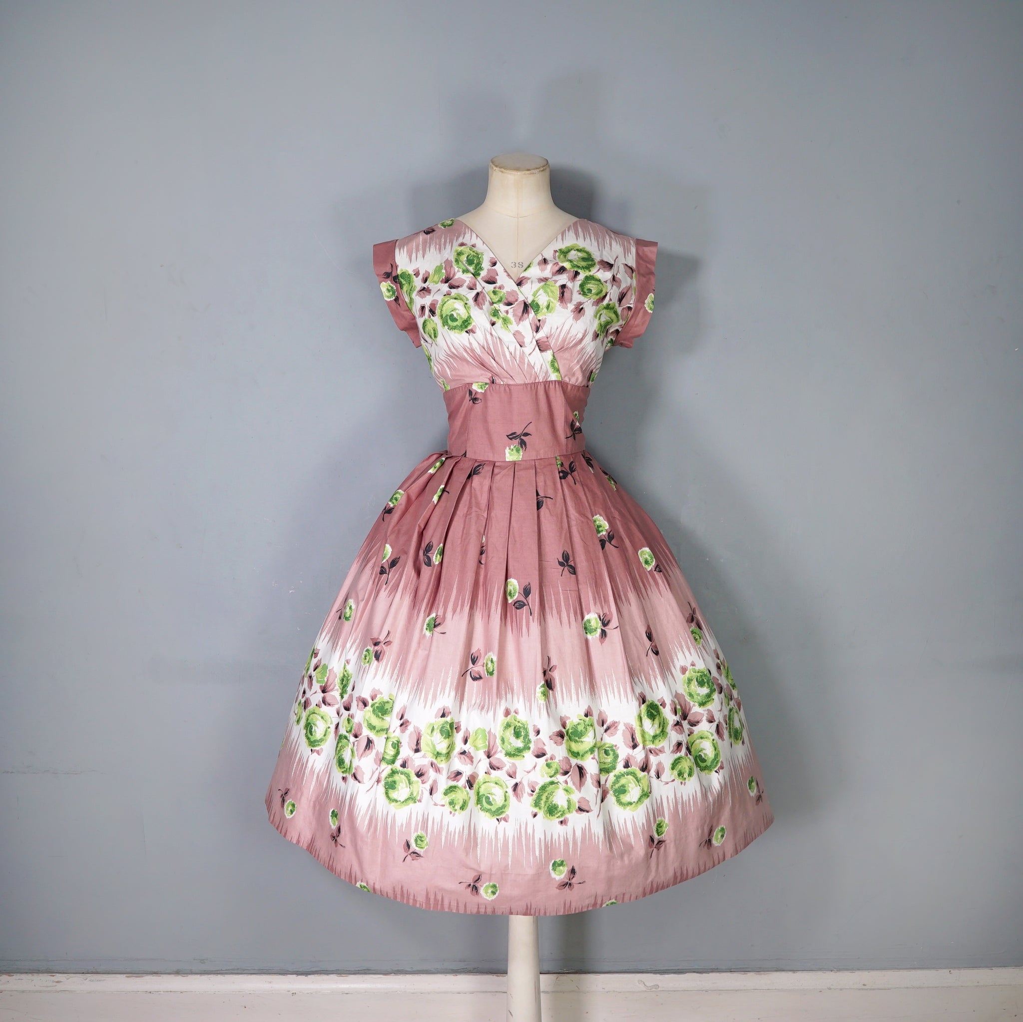 Delightful brown cotton day dress with the loveliest painterly green rose print. Wide fitted waist and a shelfy empire bustline with a overlapping v-neck with gathers and a short sleeve with cuffs. Skirt is full, sewn in neat wide gathers. Midi length. Back metal zipper. No labels. Just gorgeous.
