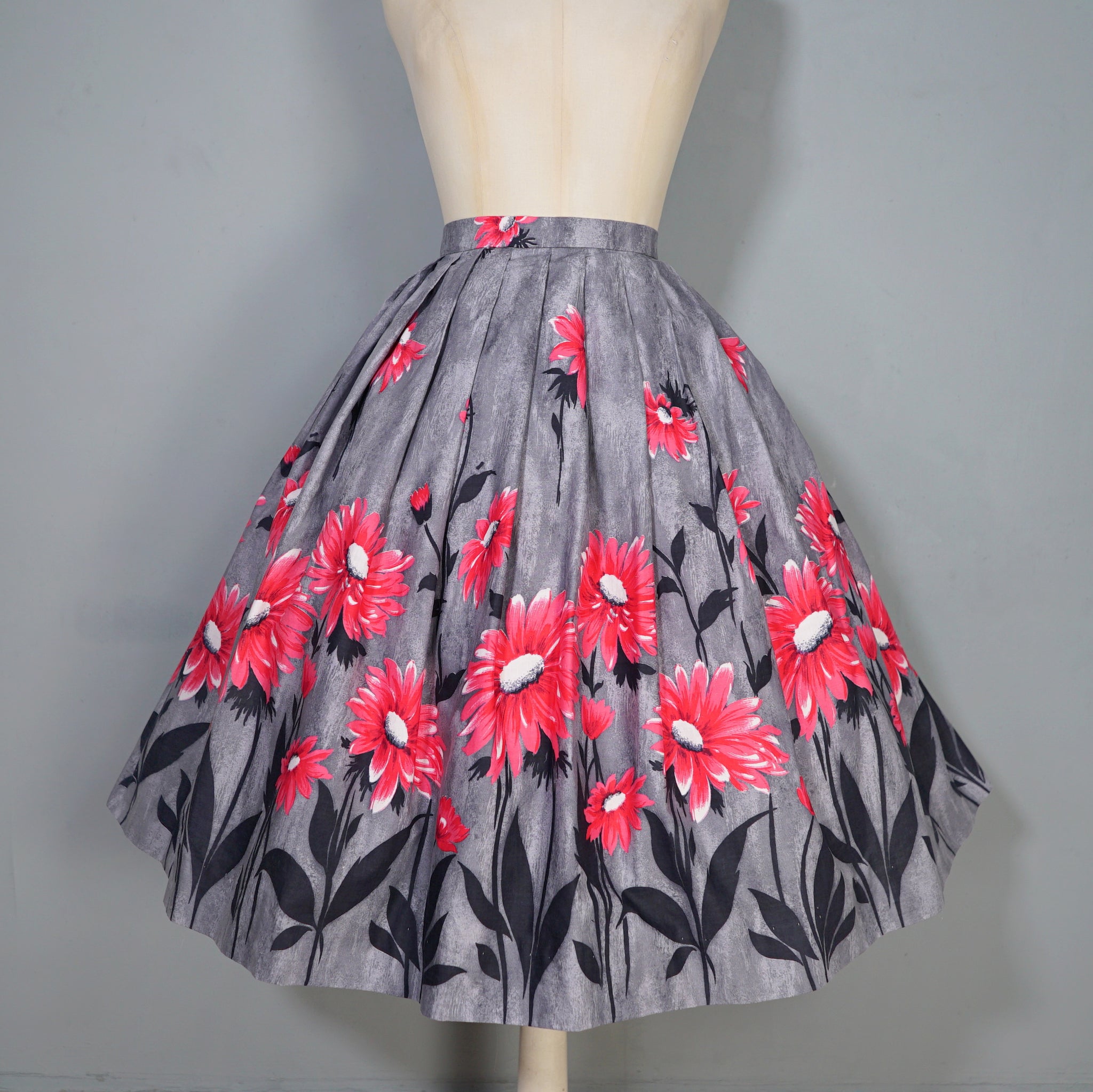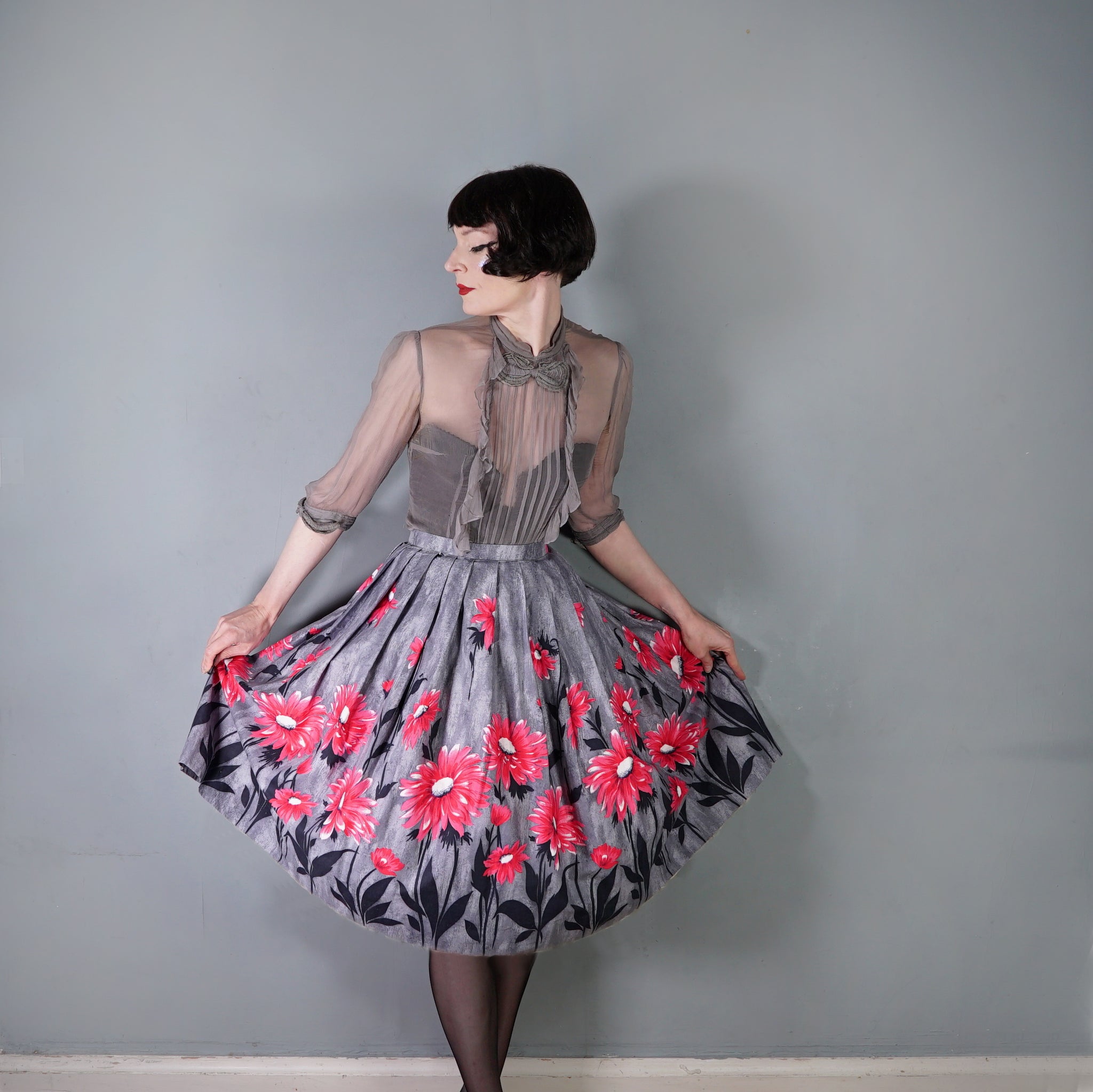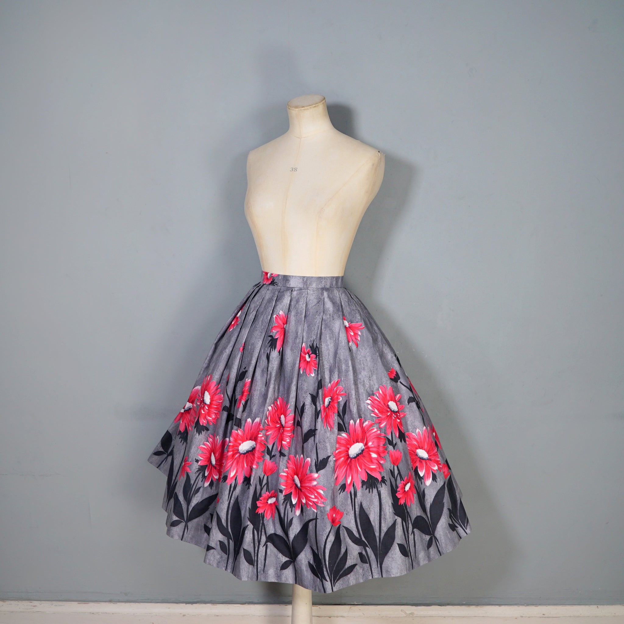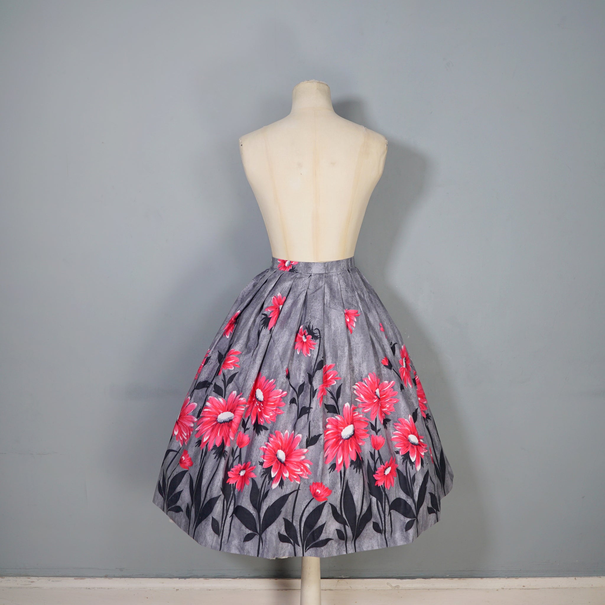 Late 50s or early 60s cotton full skirt in a painterly dark grey with a vivid pink and black floral border print. Higgh waistband with a metal zip and a button and fabric loop to fasten. Sewn in wide neat pleats to the waistband which gives the skirt a lovely full fit. No labels, possibly handmade.