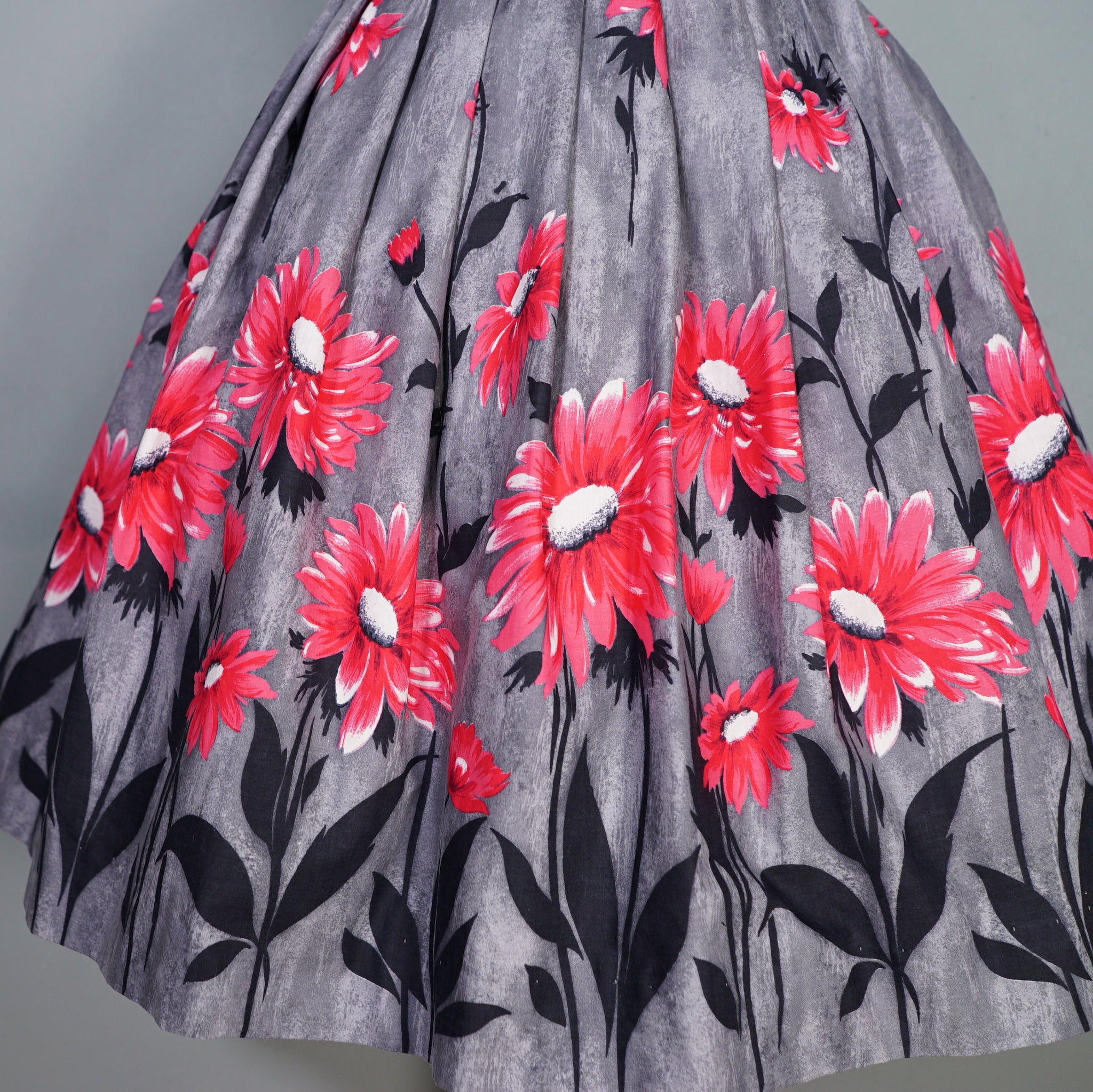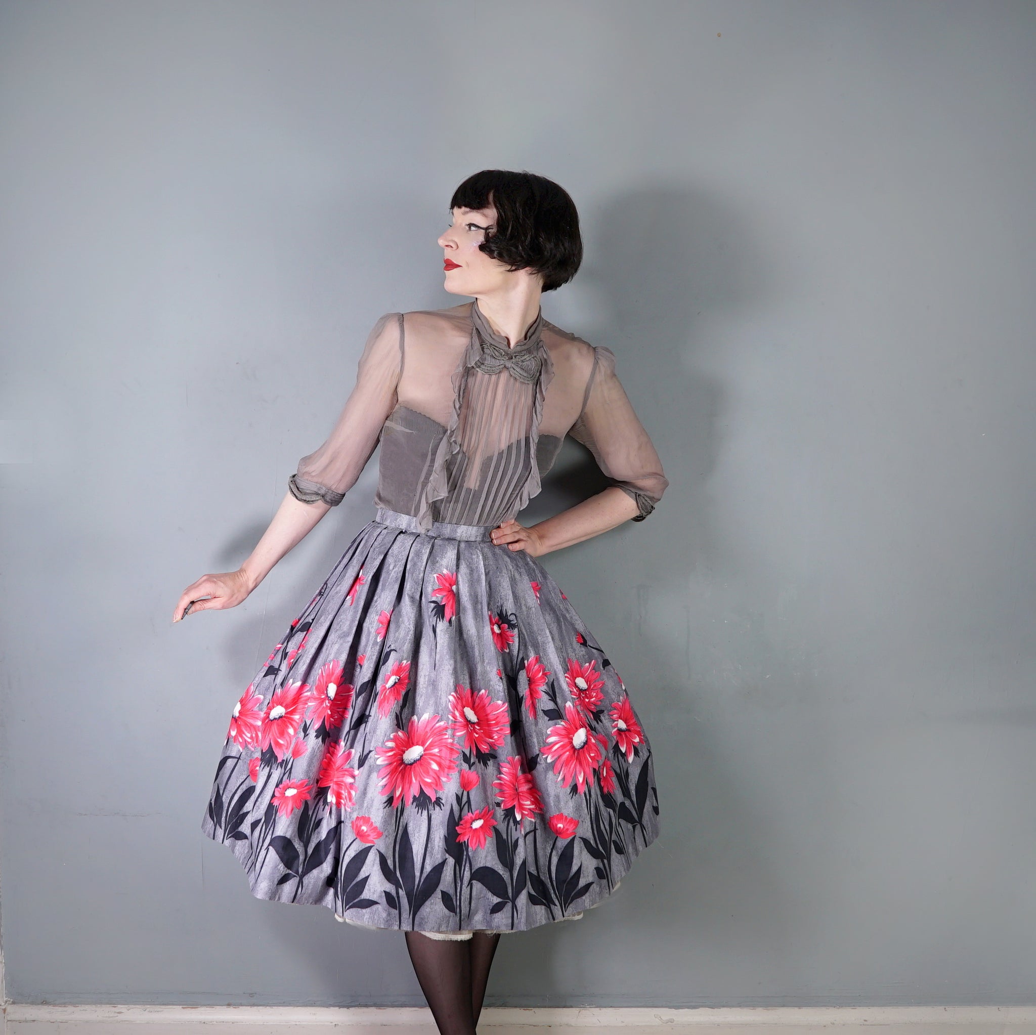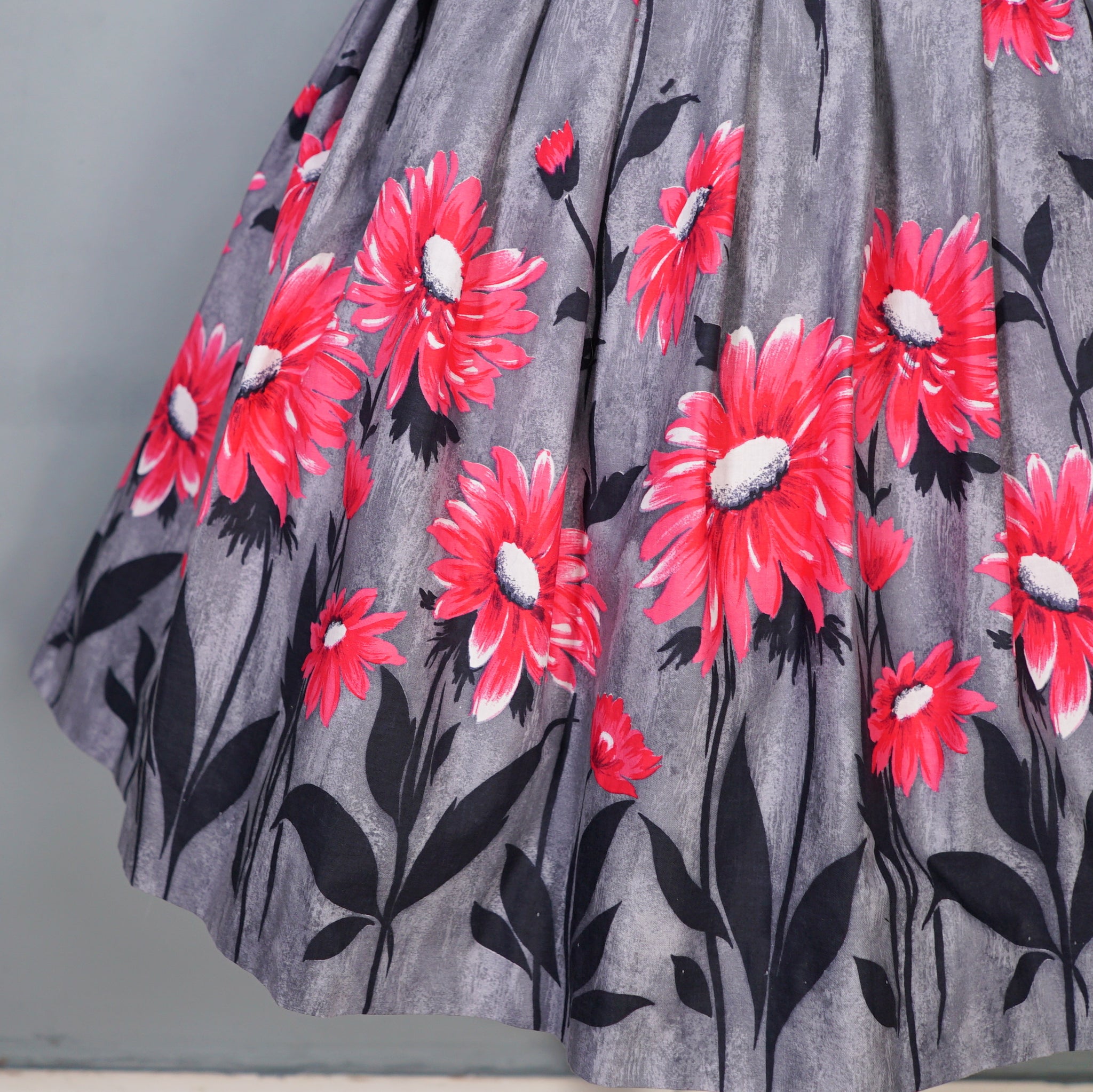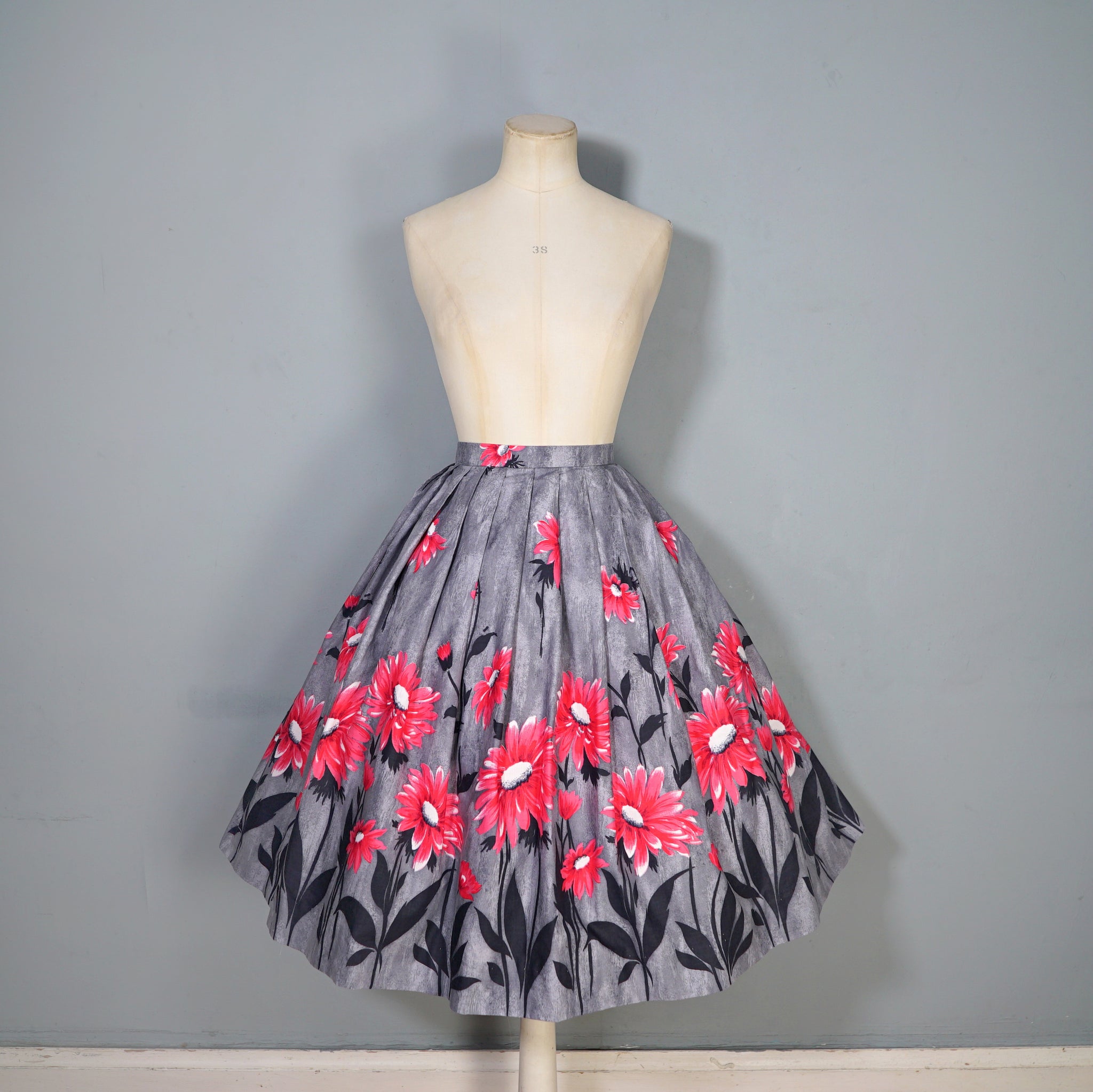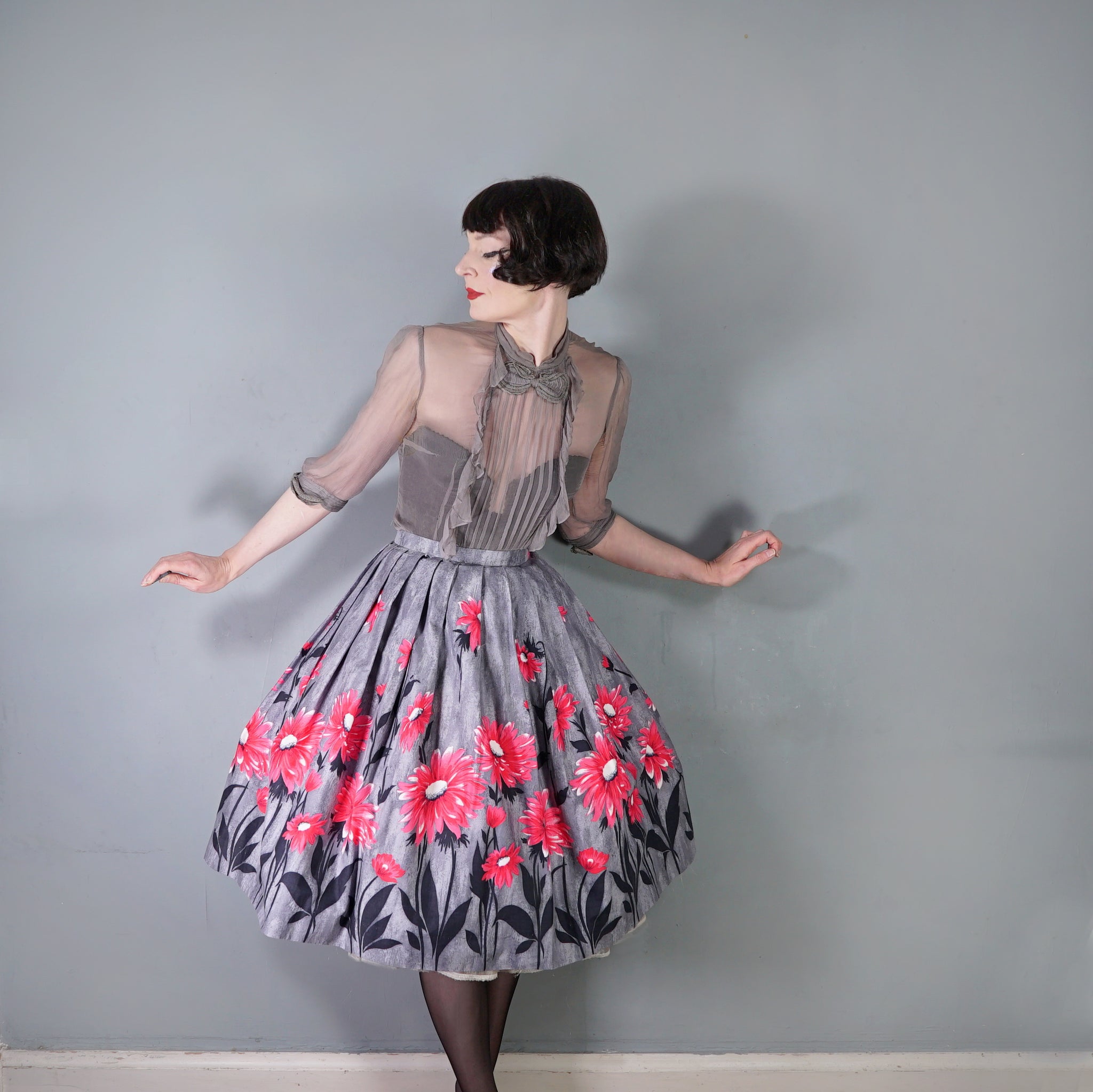 Late 50s or early 60s cotton full skirt in a painterly dark grey with a vivid pink and black floral border print. Higgh waistband with a metal zip and a button and fabric loop to fasten. Sewn in wide neat pleats to the waistband which gives the skirt a lovely full fit. No labels, possibly handmade.