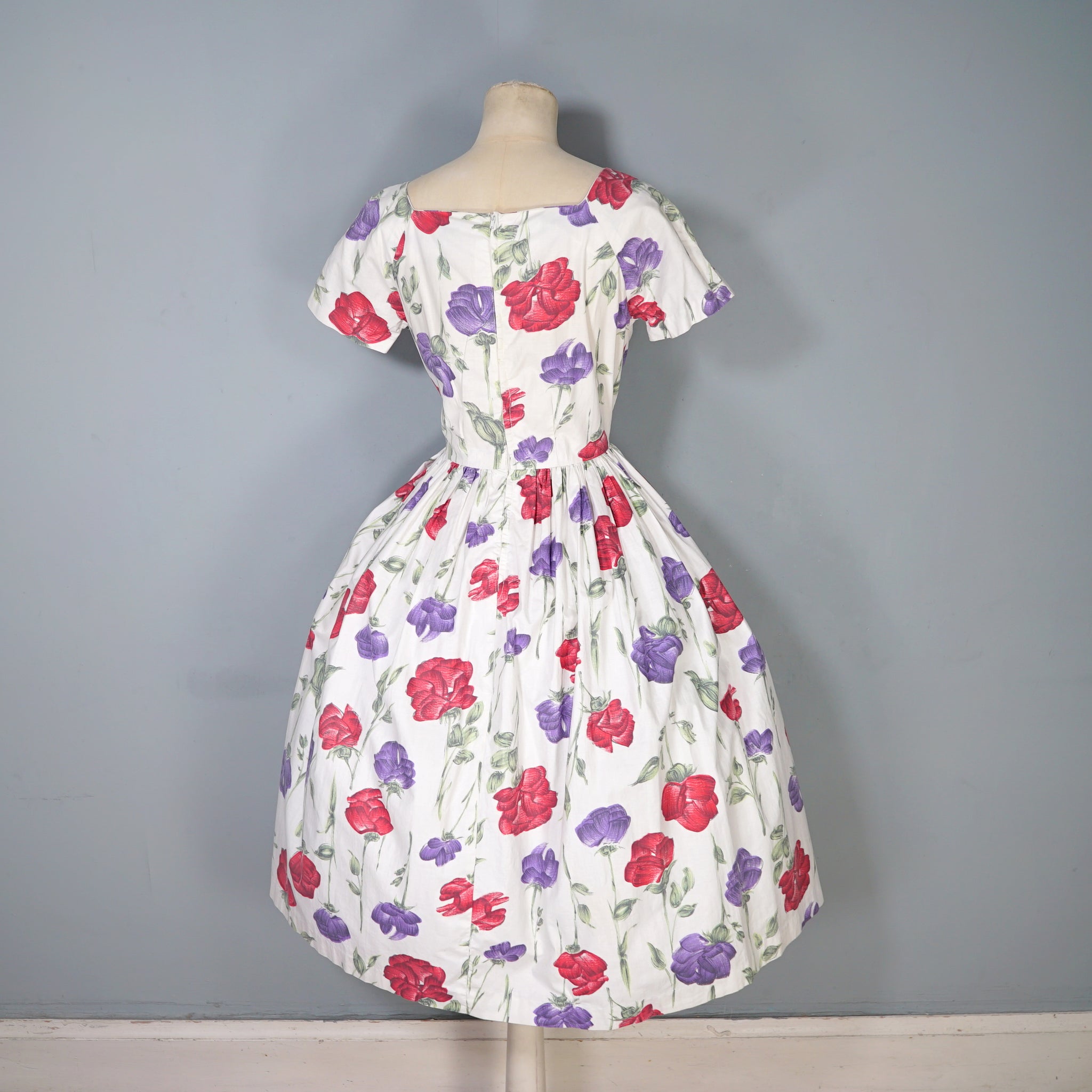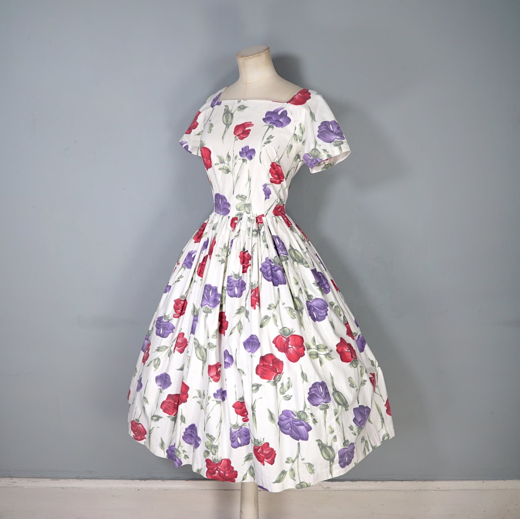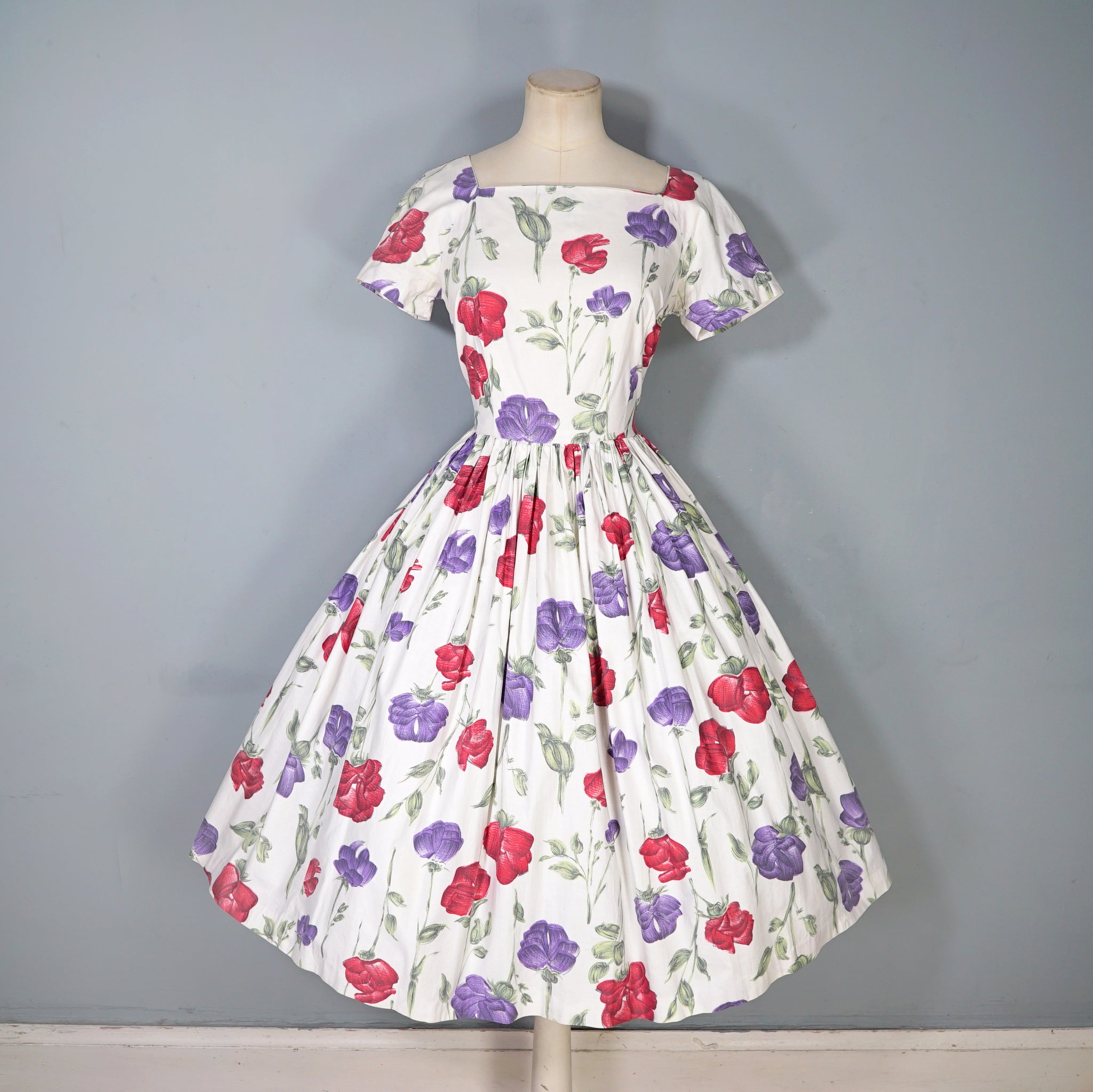Handmade 50s cotton dress in cream with a painterly floral pattern of red and purple roses with green stems. Fitted bodice with short raglan sleeves and a wide square neck. Fitted waist and generously full skrit sewn in small gathers for a swishy sweep. Back metal zipper to fasten. No labels.
