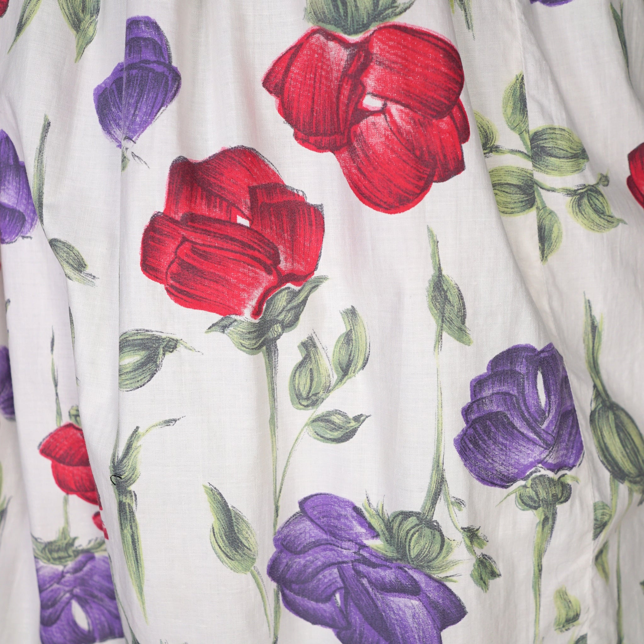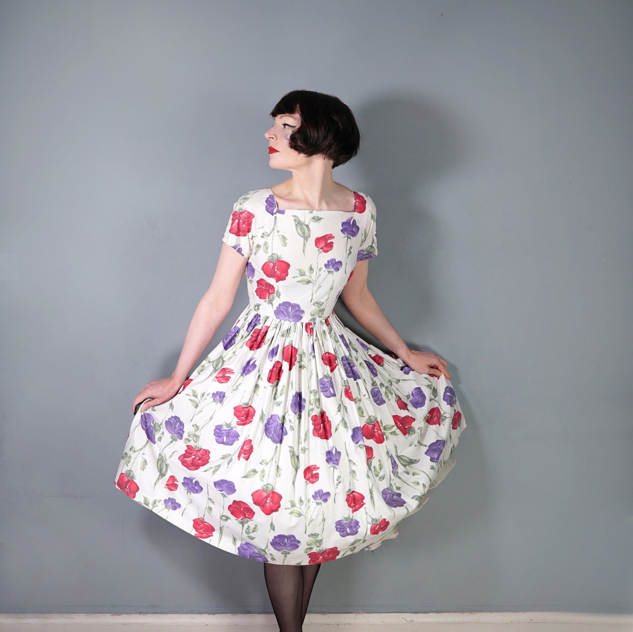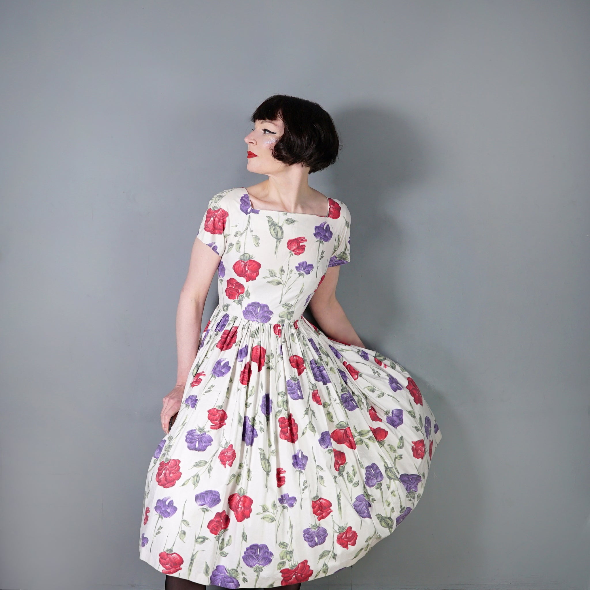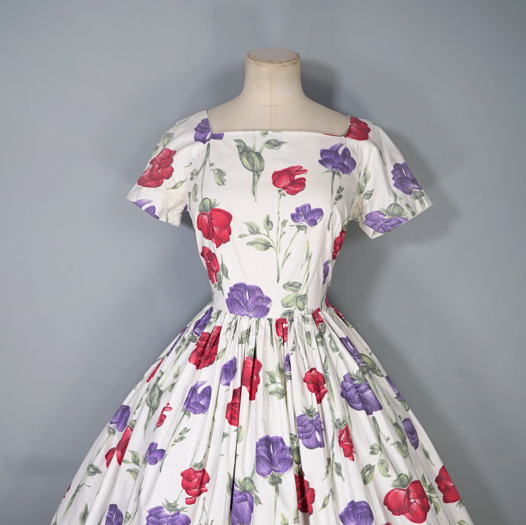 Handmade 50s cotton dress in cream with a painterly floral pattern of red and purple roses with green stems. Fitted bodice with short raglan sleeves and a wide square neck. Fitted waist and generously full skrit sewn in small gathers for a swishy sweep. Back metal zipper to fasten. No labels.