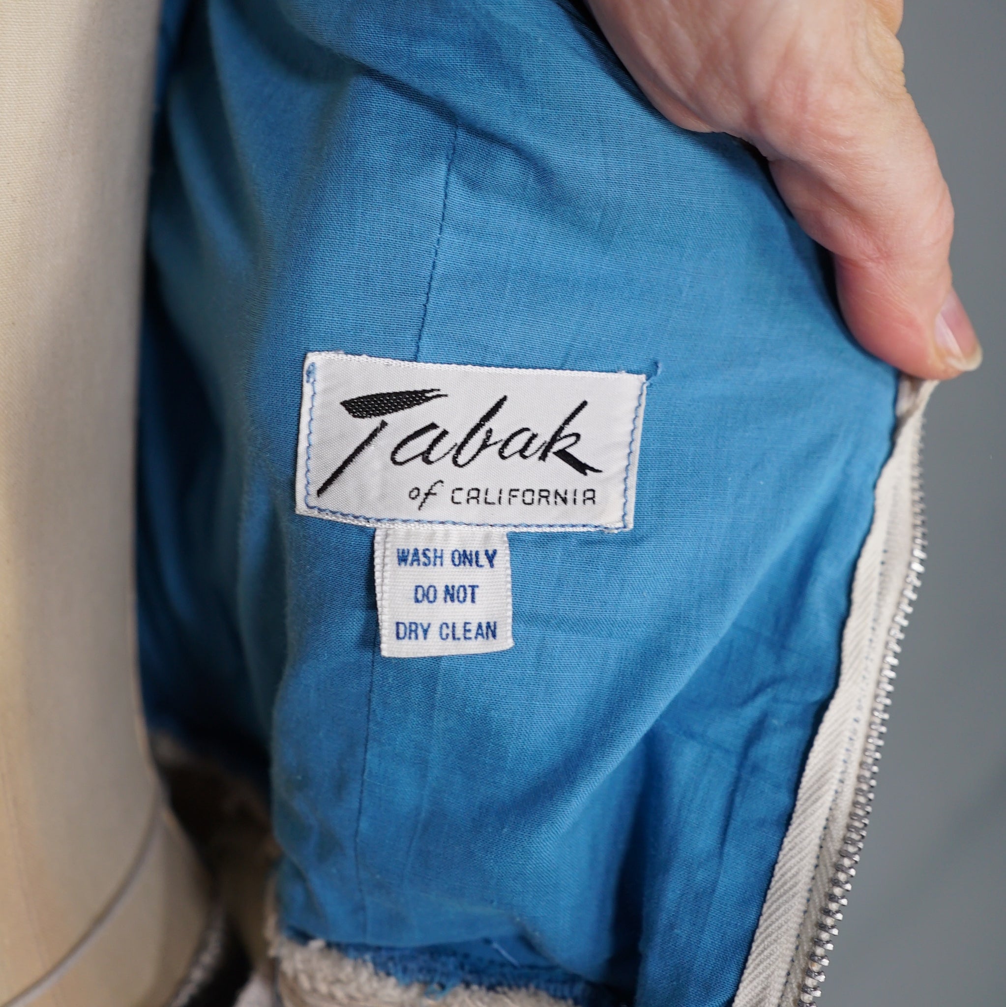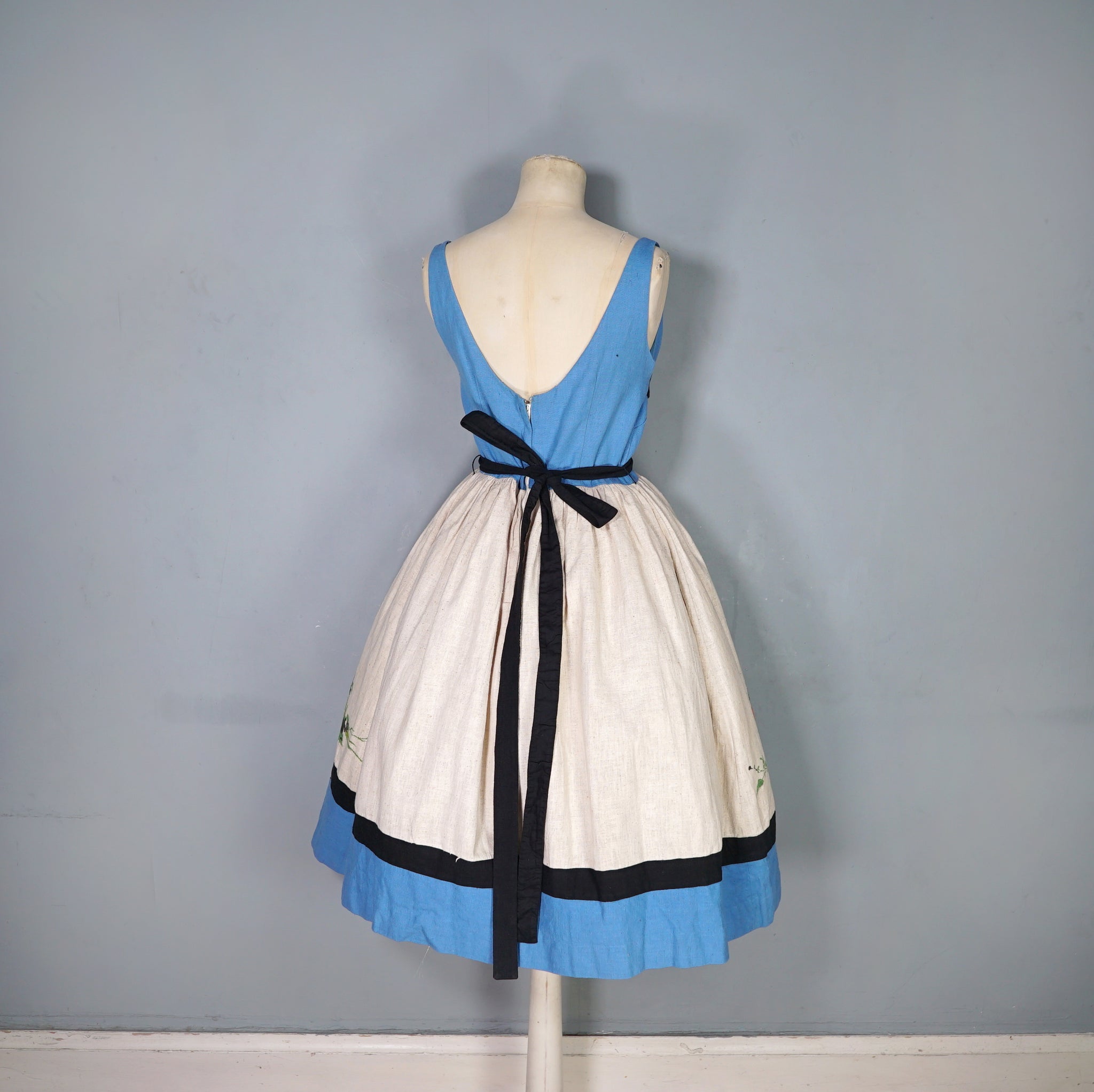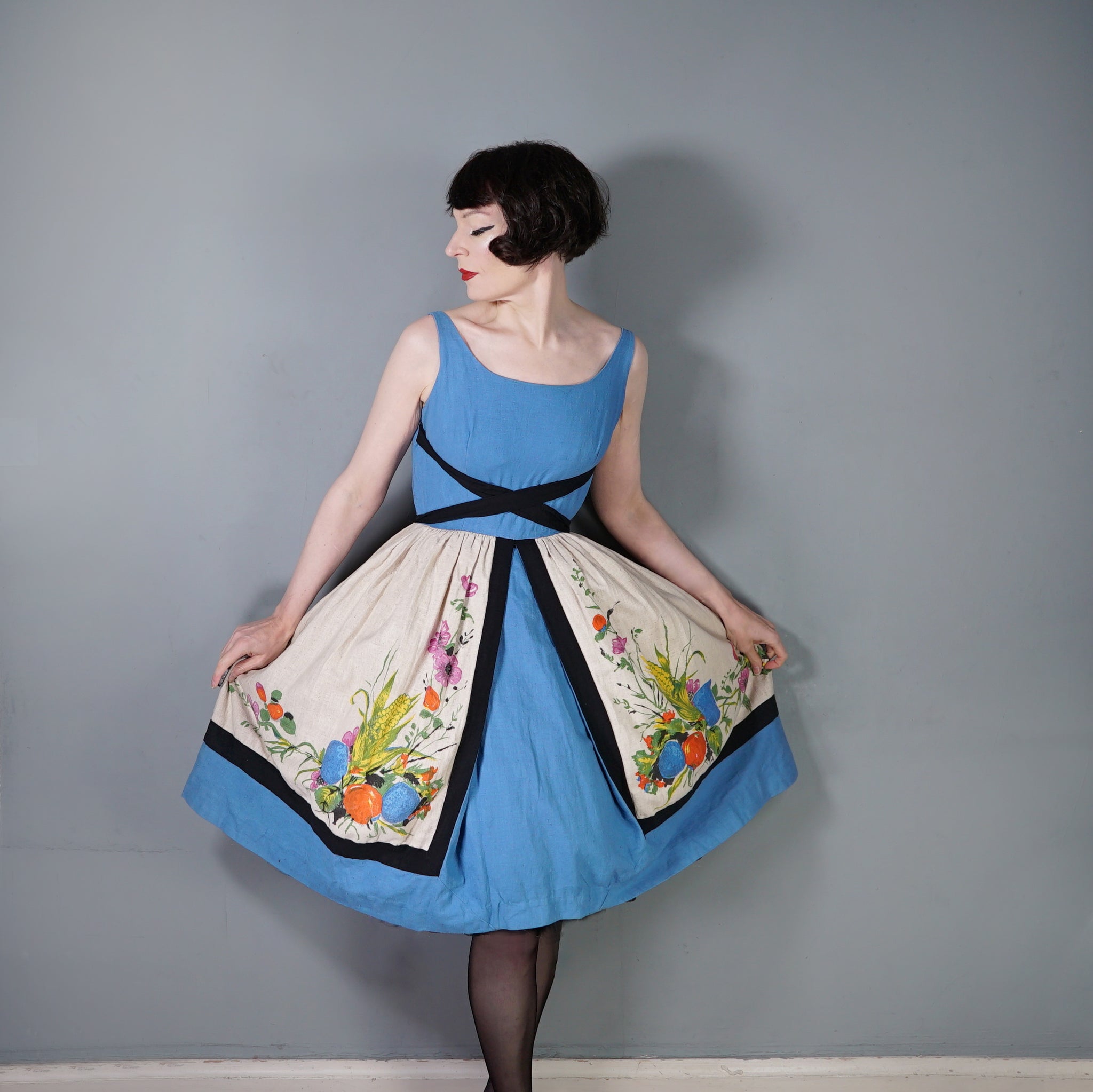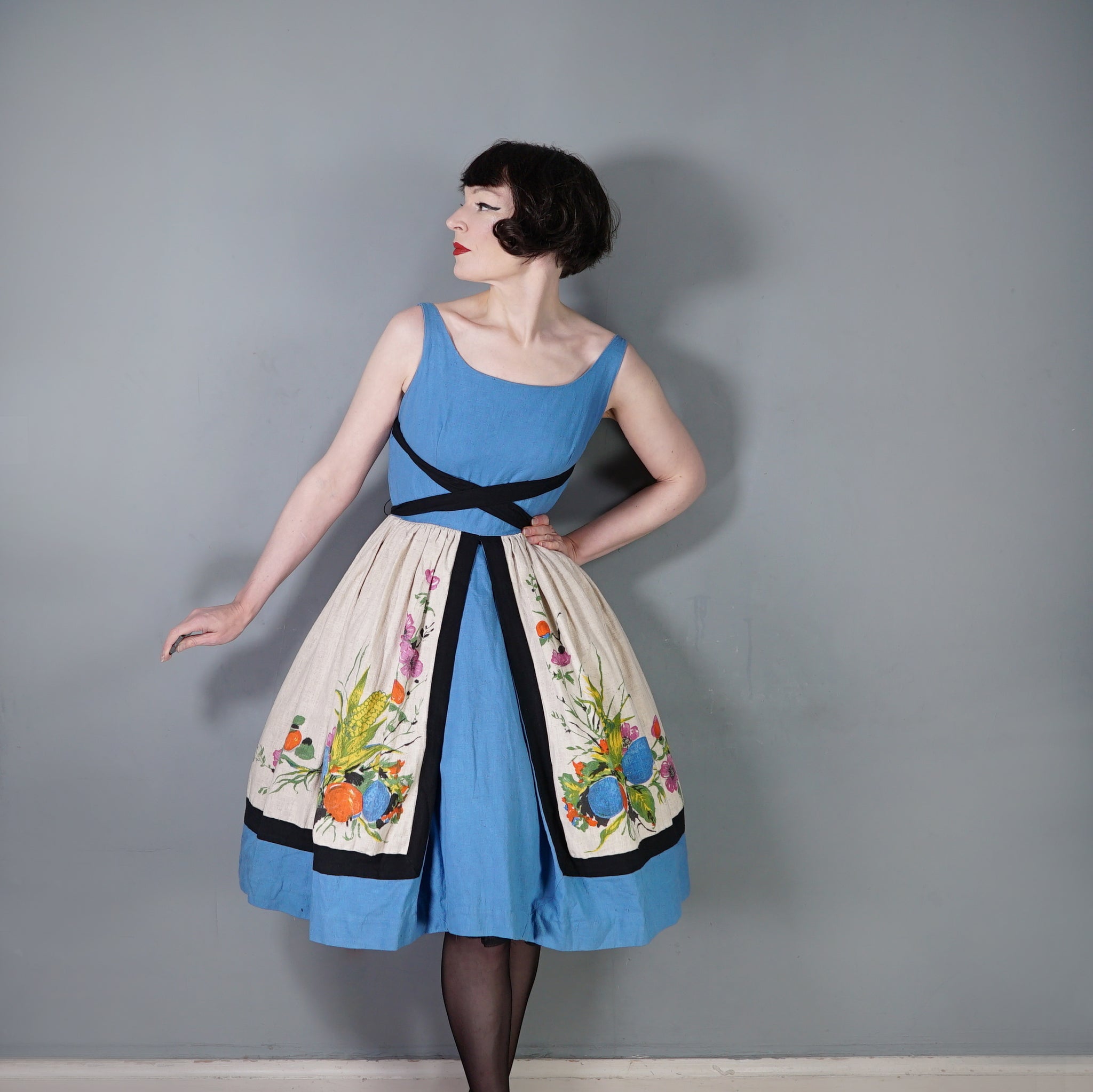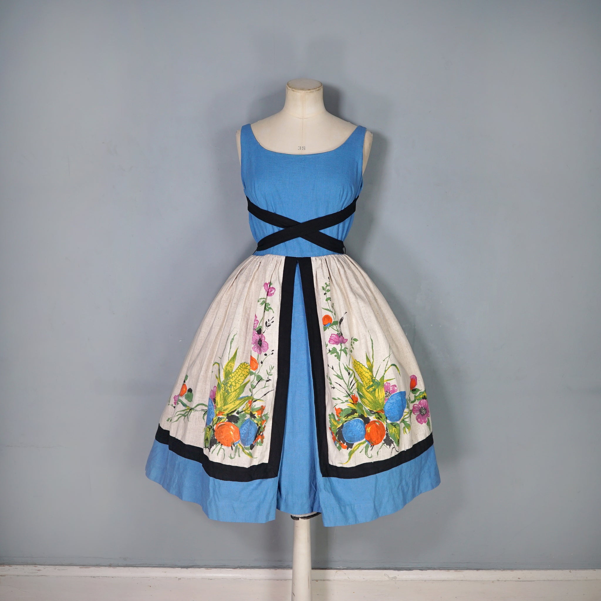 Amazing little cottagecore harvest dress in a thicker canvas cotton and linen fabric, beautifully rustic and holds the shape so nicely. Fitted bodice with a deep scoop neck and lower cut back and attached long black straps to tie around the bodice, can be worn multiple ways, but looks fab crossed over the waist and underbust and tie up at the back. Waist cinches the silhouette in and the skirt is fabulously full, with a curtaining design of printed ecru fabric with lavish floral bouquets and fruit and corncobs - such fun. This is trimmed in wide black bands for effect and hem and front picks up the blue of the bodice. Back metal zip to fasten. Label is Tabak of California. Approx 60s/early 70s era, but looks classic 50s! The deep neck and sleeveless cut also works really well worn over a blouse or top.