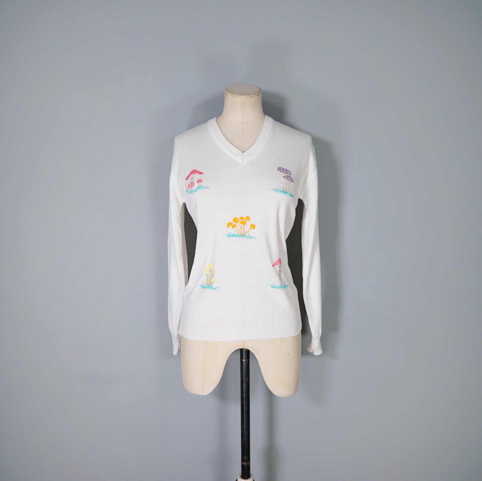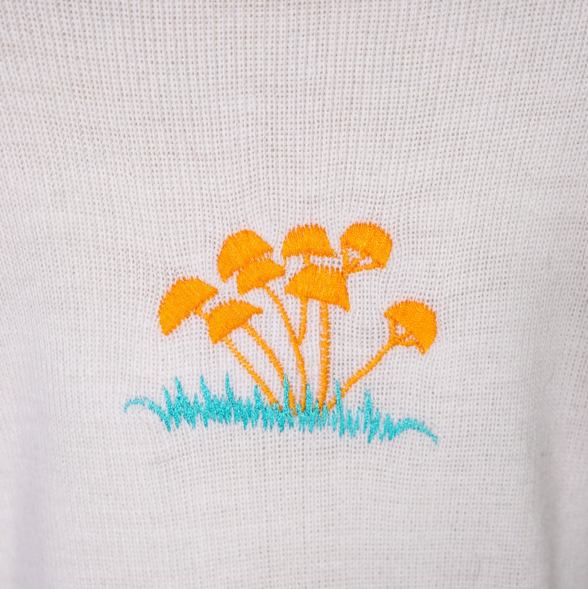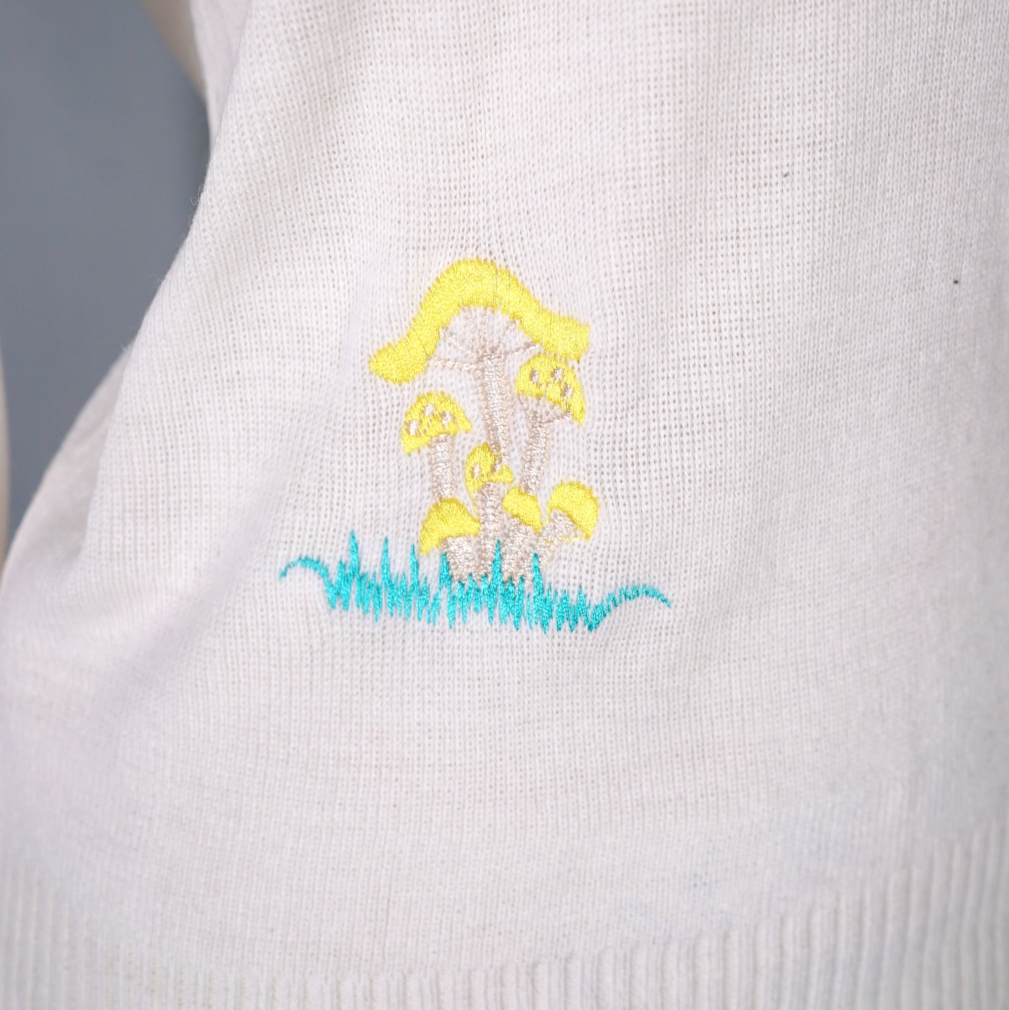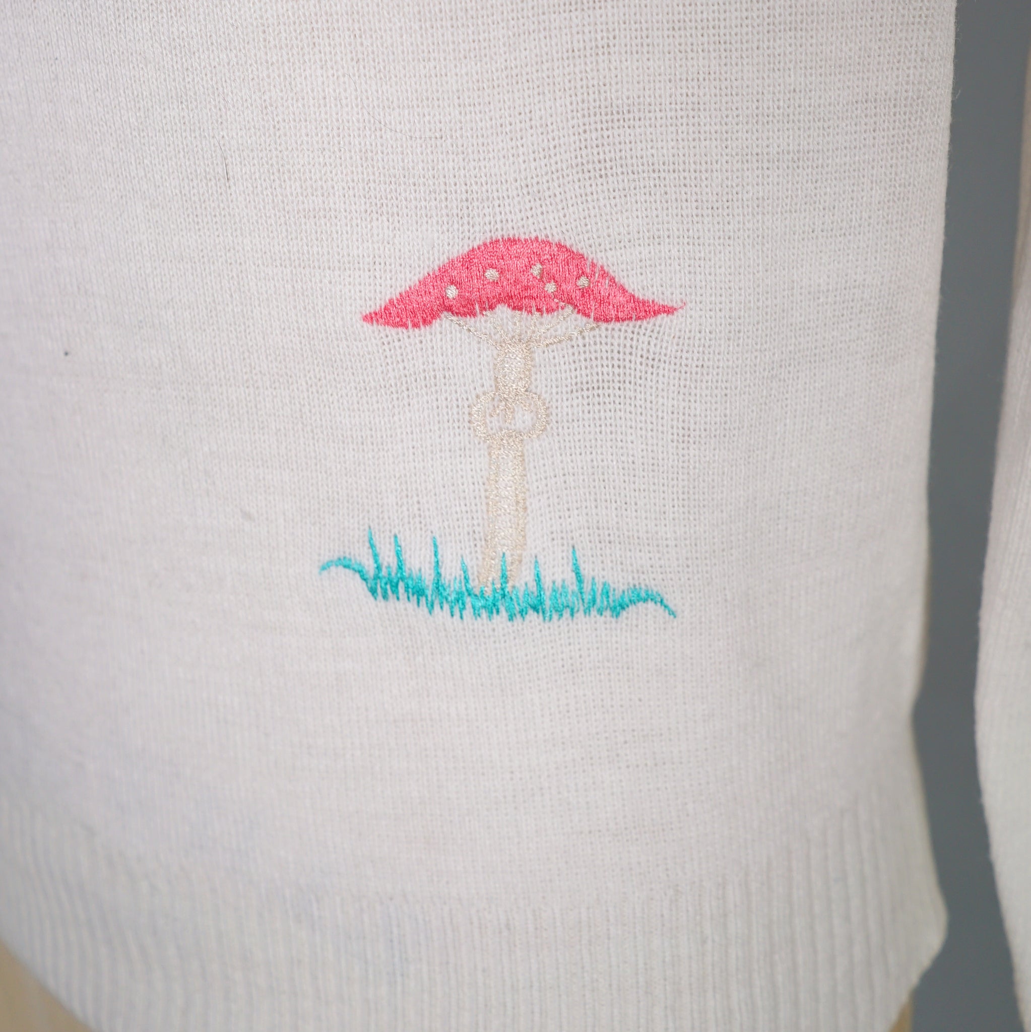 70s TIGIWEAR WHITE FINE ACRYLIC KNIT JUMPER WITH EMBROIDERED MUSHROOMS - M
