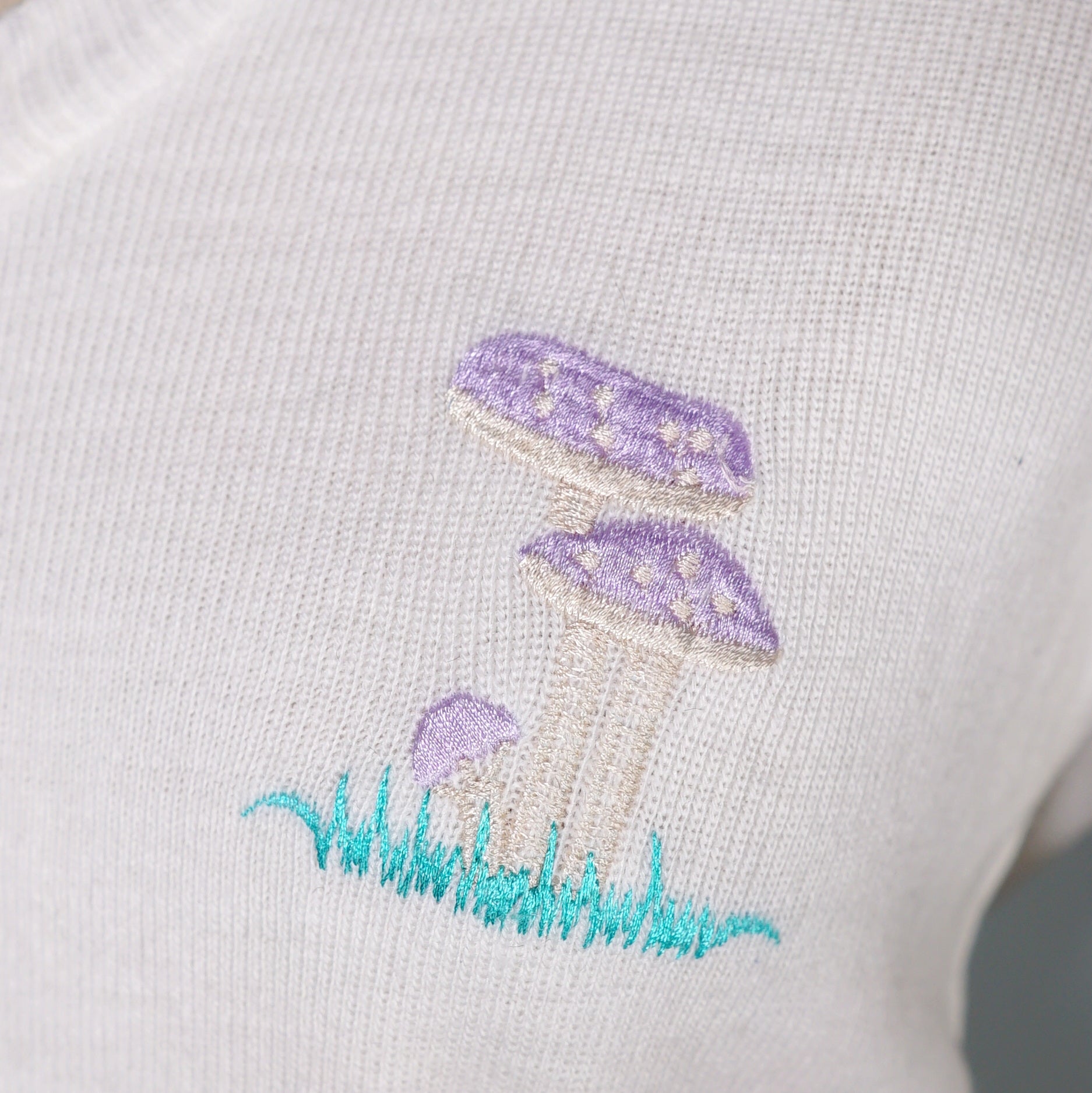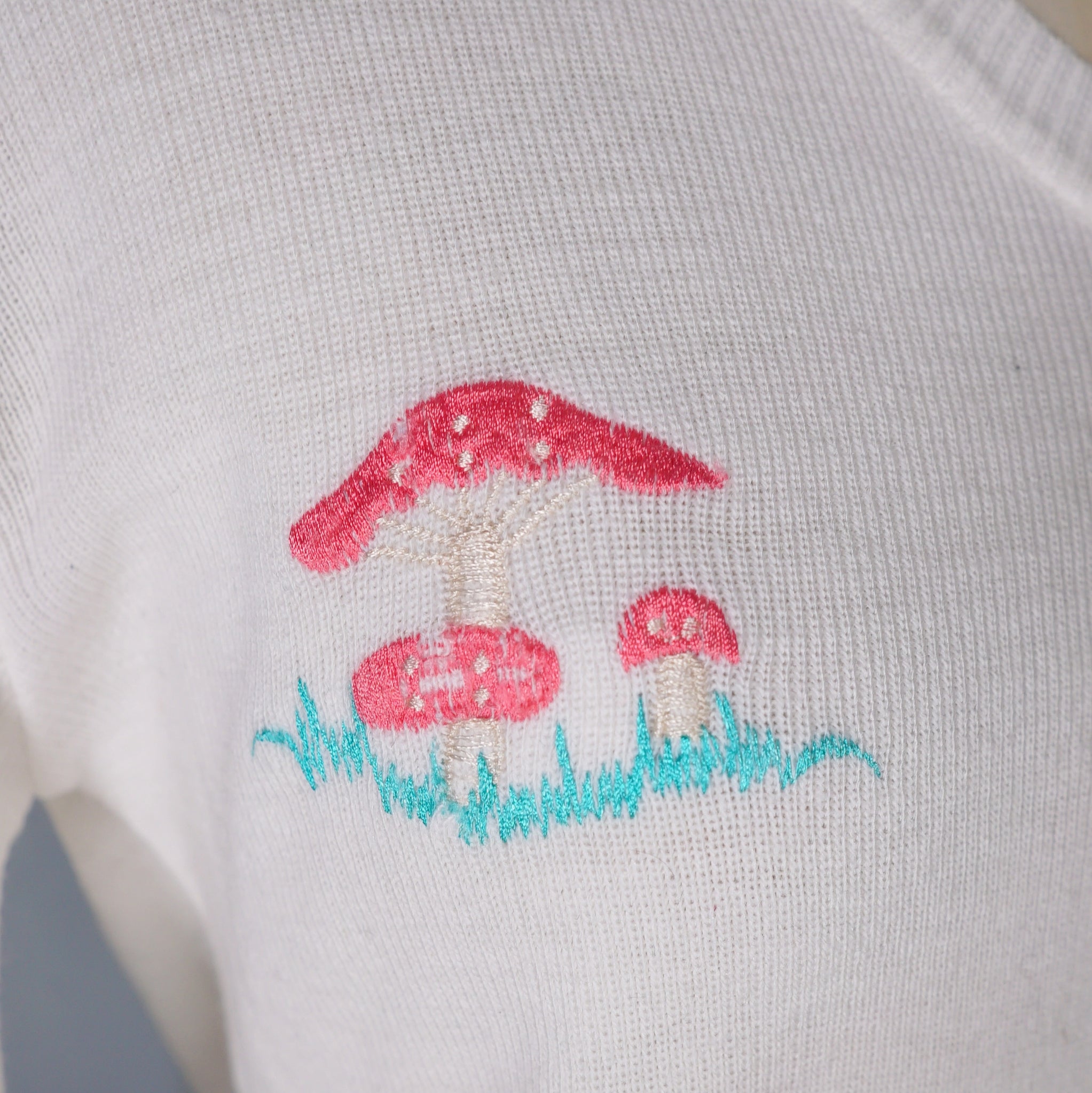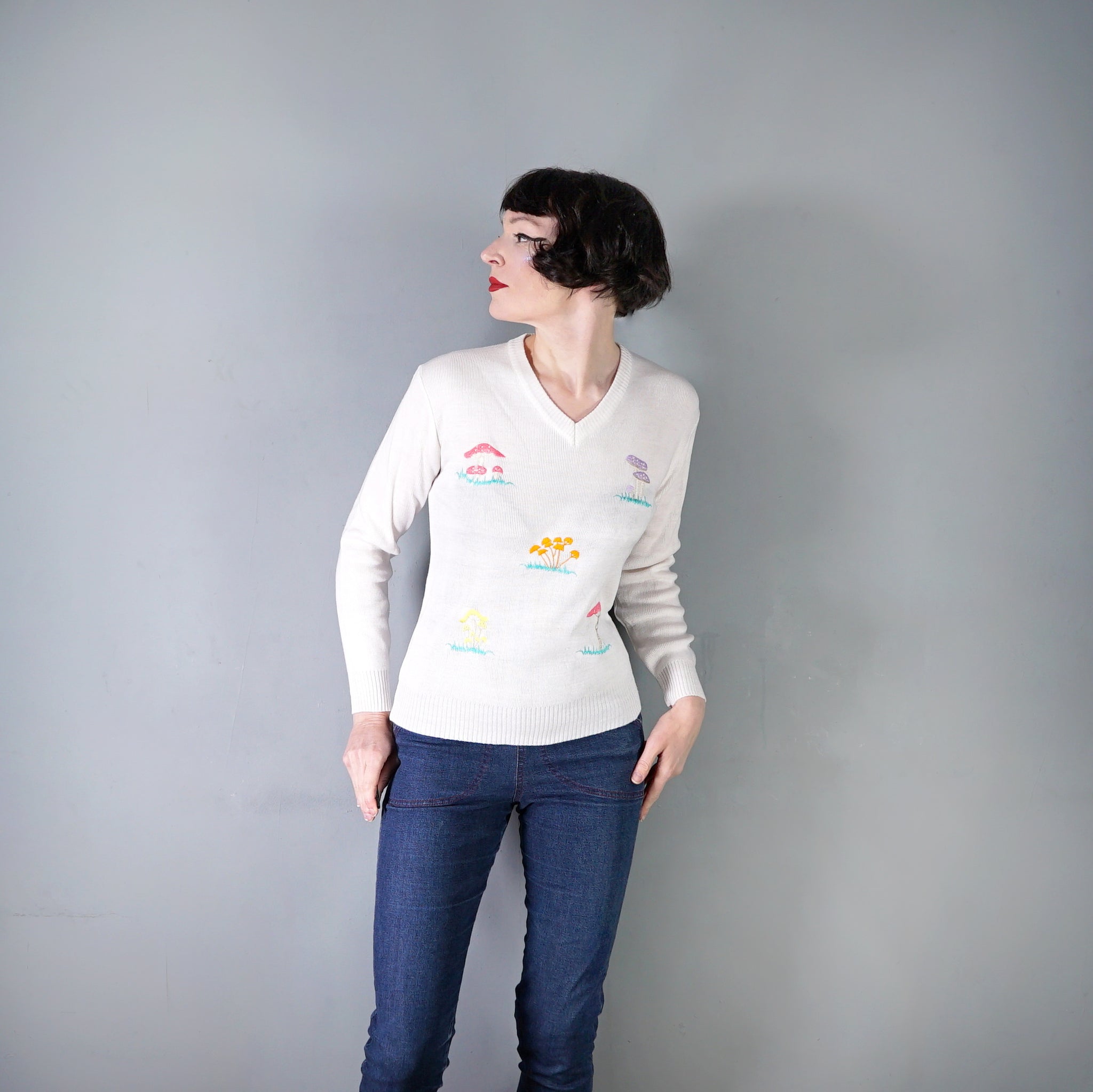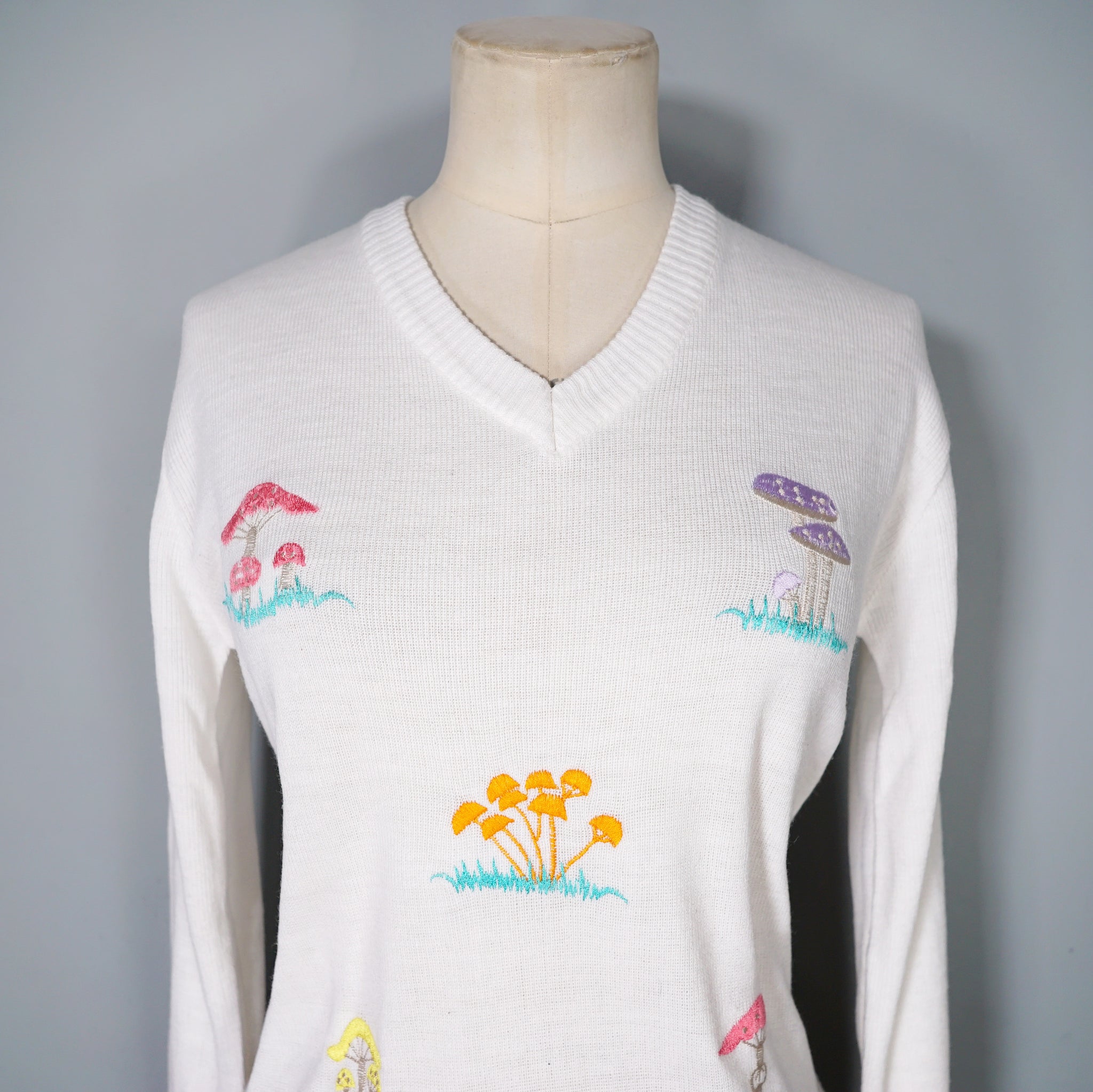 70s TIGIWEAR WHITE FINE ACRYLIC KNIT JUMPER WITH EMBROIDERED MUSHROOMS - M