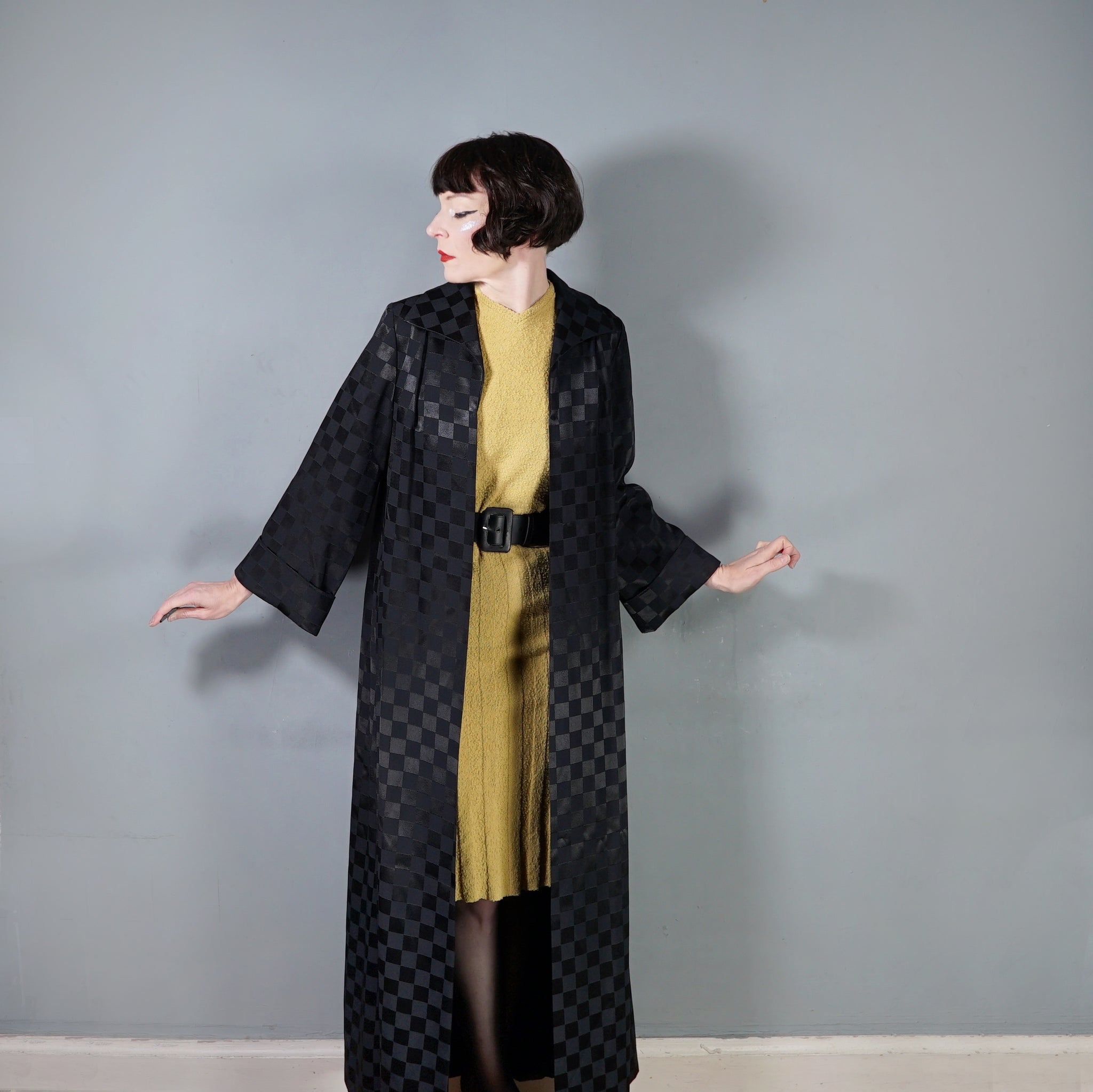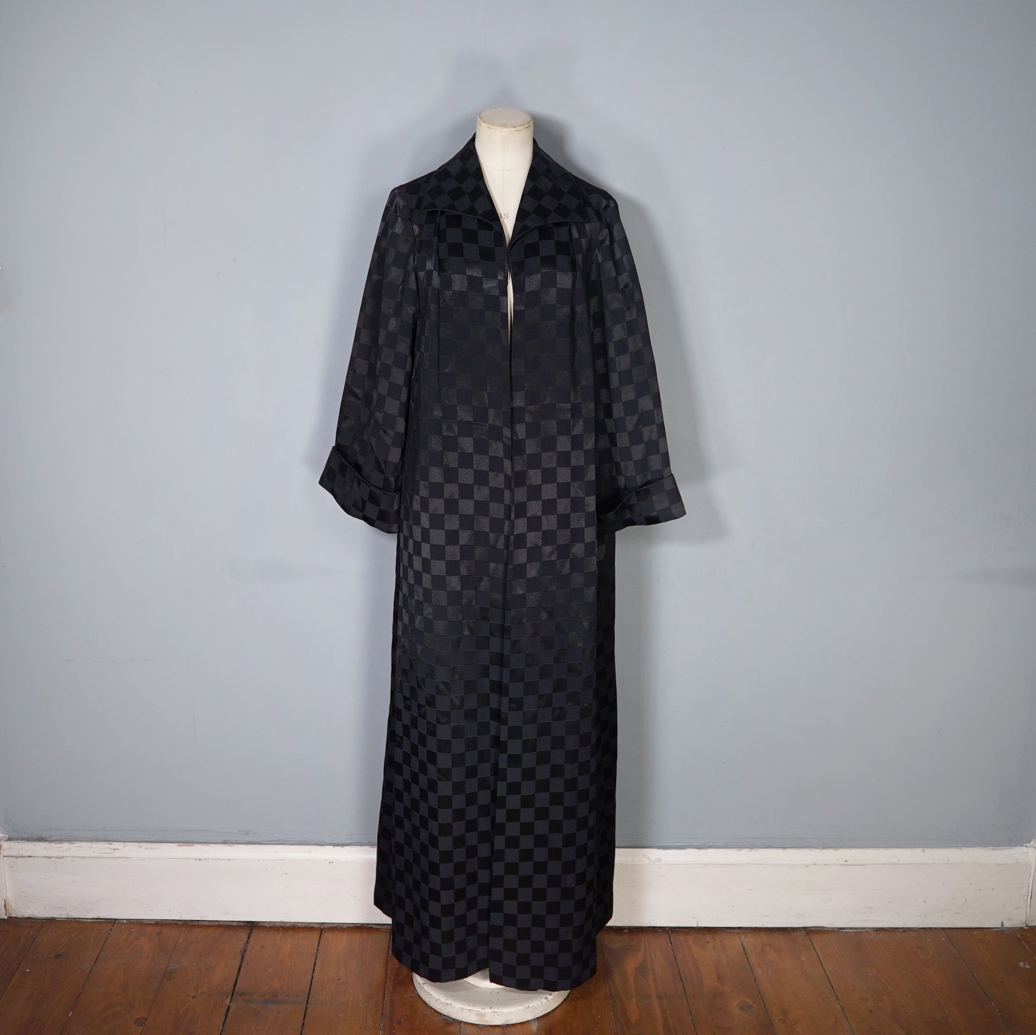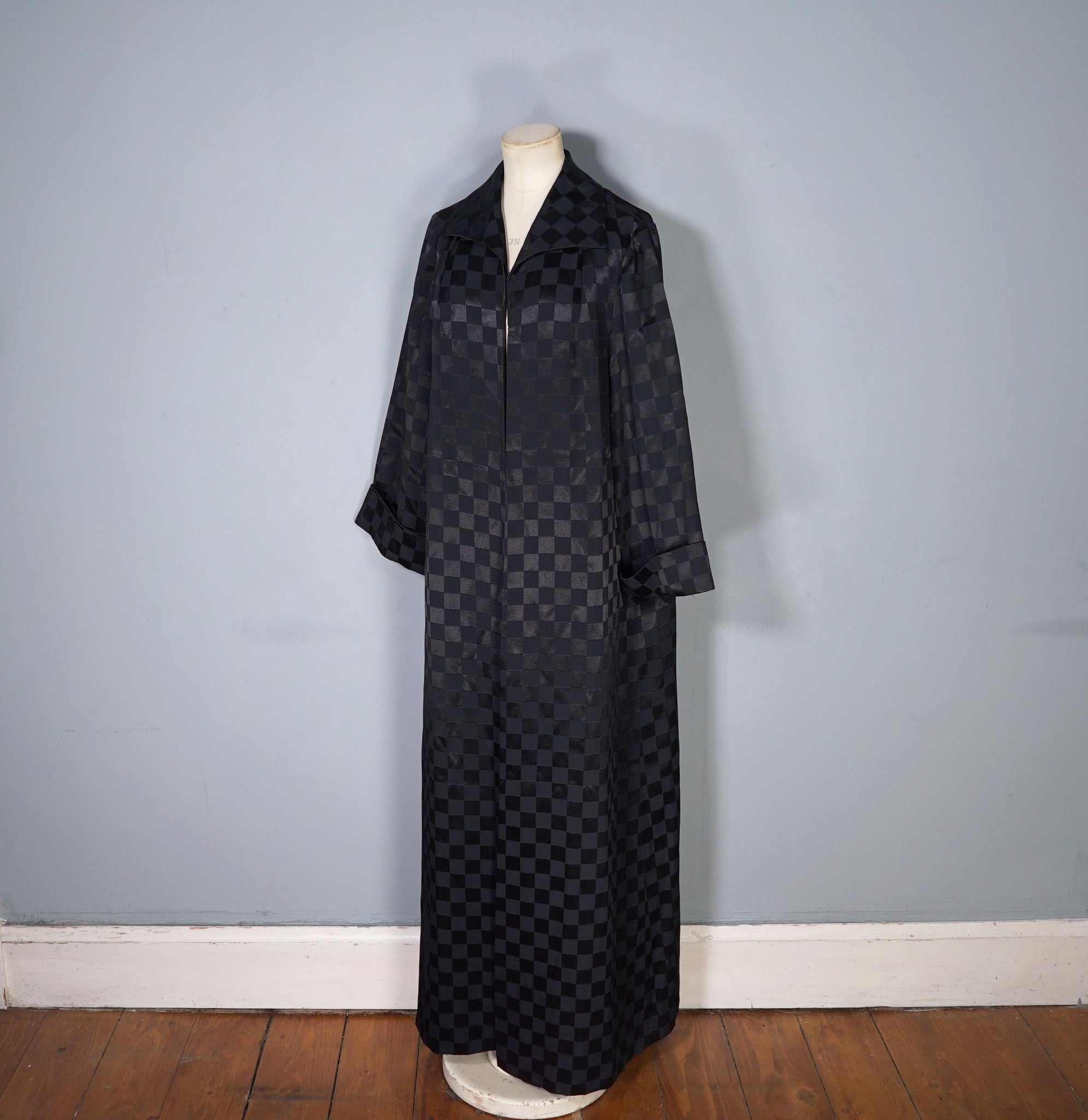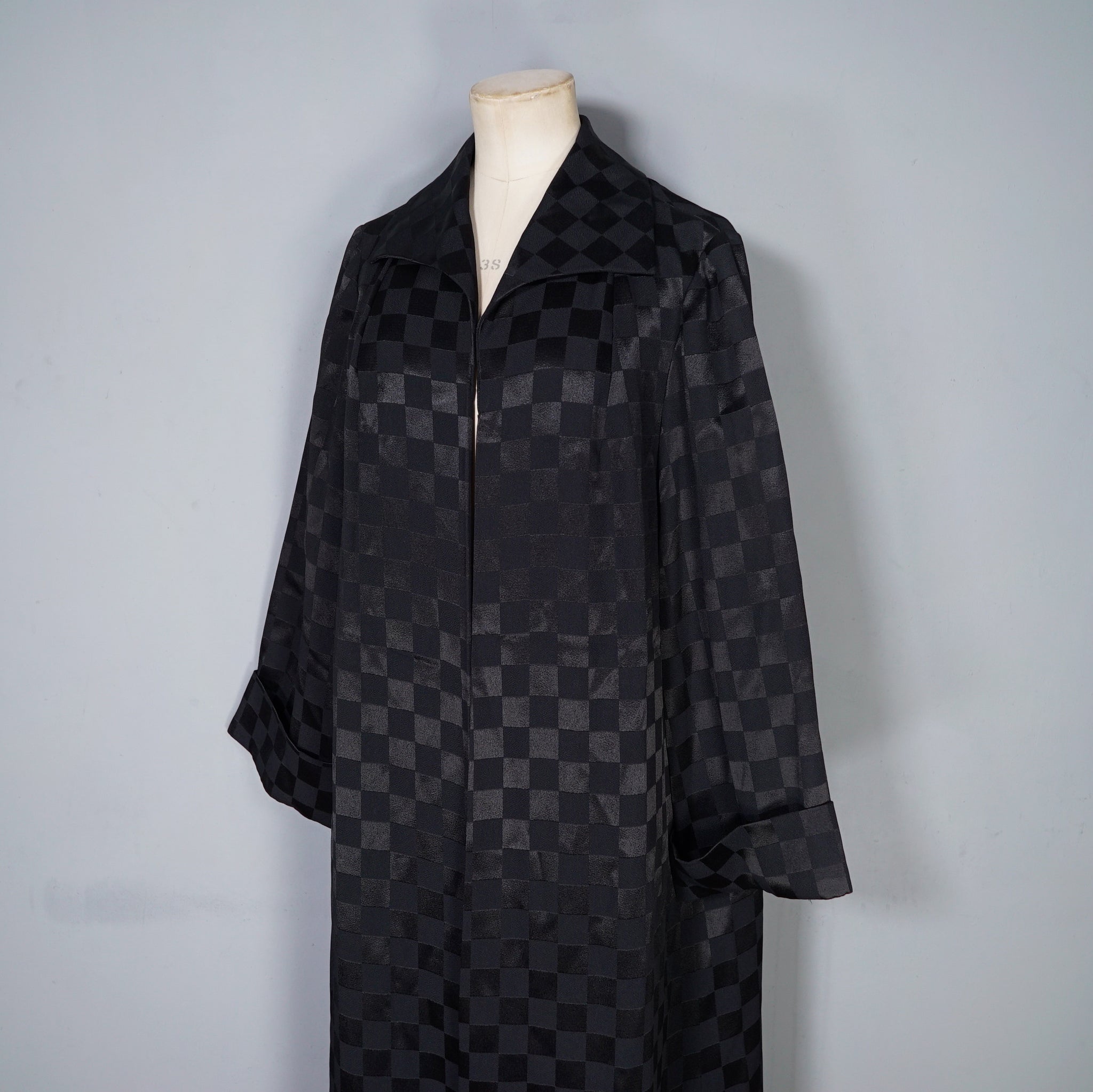 Ahhhmazing 60s maxi evening coat in a textured matt-shiny black checkerboard synthetic satin. Long maxi length with an open front and wide big sleeves with turn up cuffs. Large folded collar to the neckline. Back features a big open pleat to give this a drapey fullness. Fully lined in light triacetate. Label is Eastex.