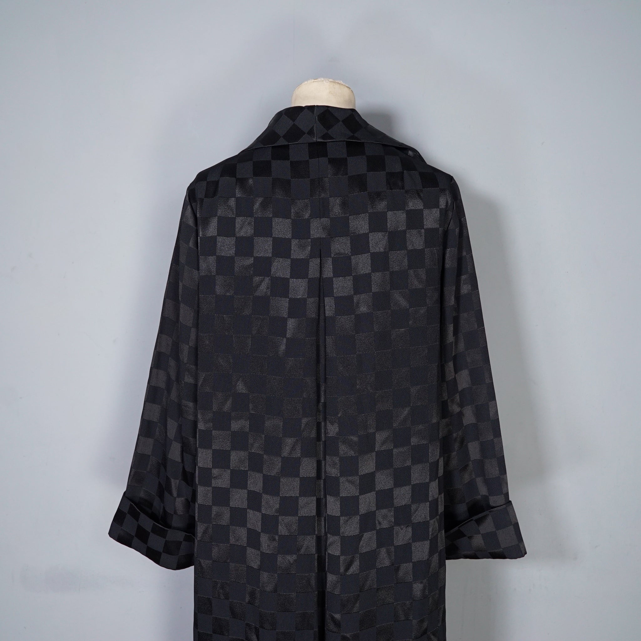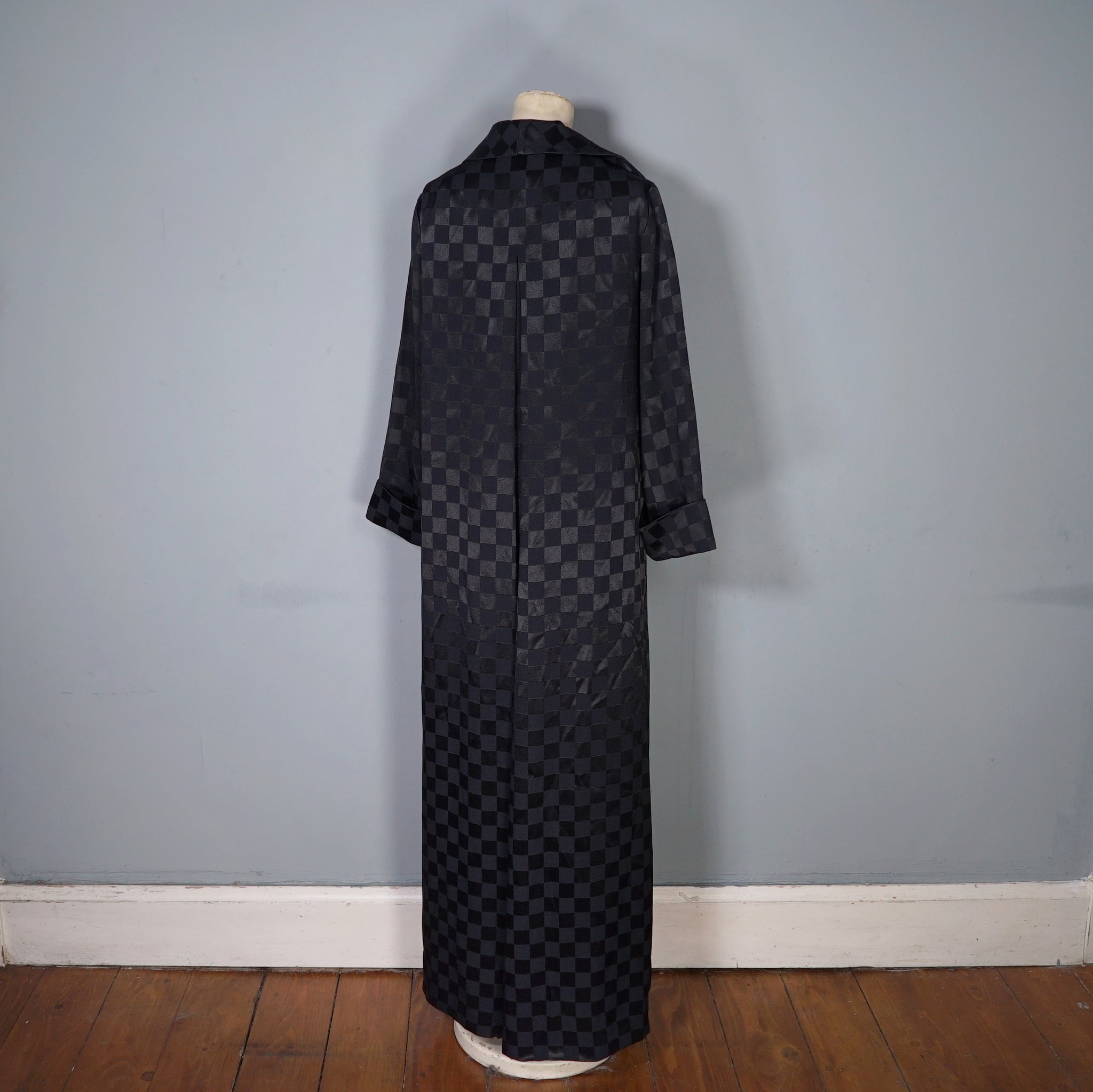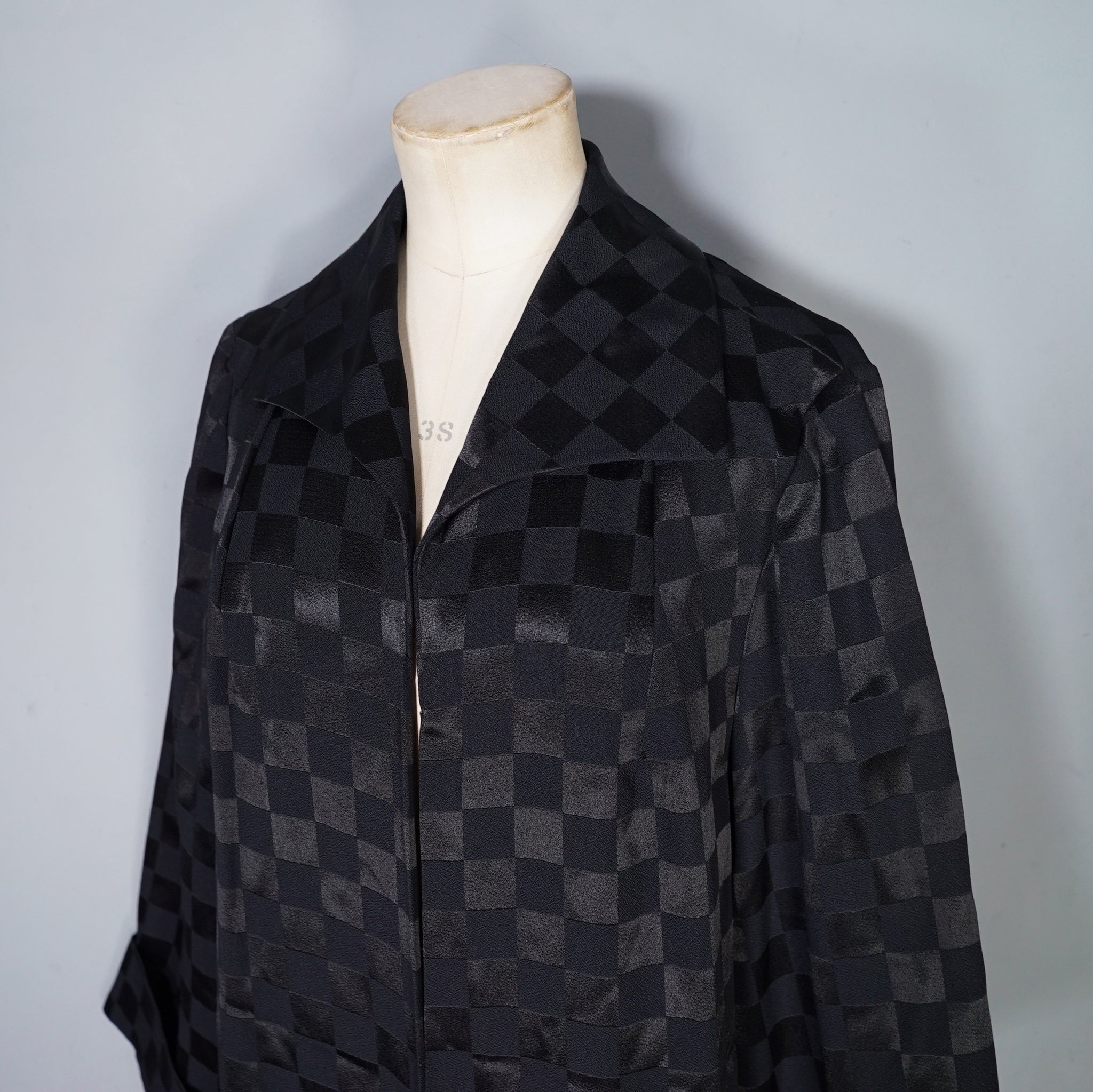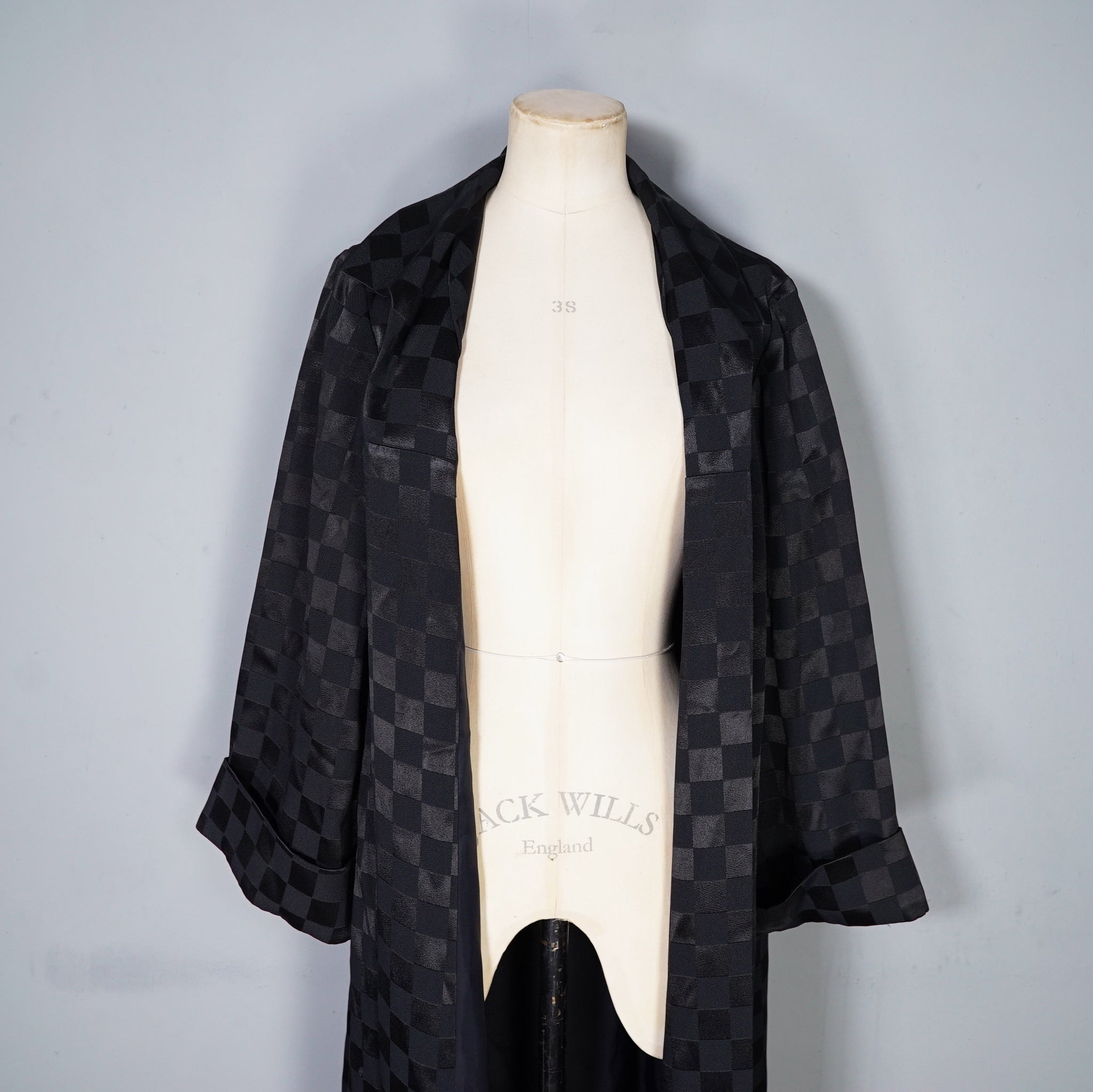 Ahhhmazing 60s maxi evening coat in a textured matt-shiny black checkerboard synthetic satin. Long maxi length with an open front and wide big sleeves with turn up cuffs. Large folded collar to the neckline. Back features a big open pleat to give this a drapey fullness. Fully lined in light triacetate. Label is Eastex.