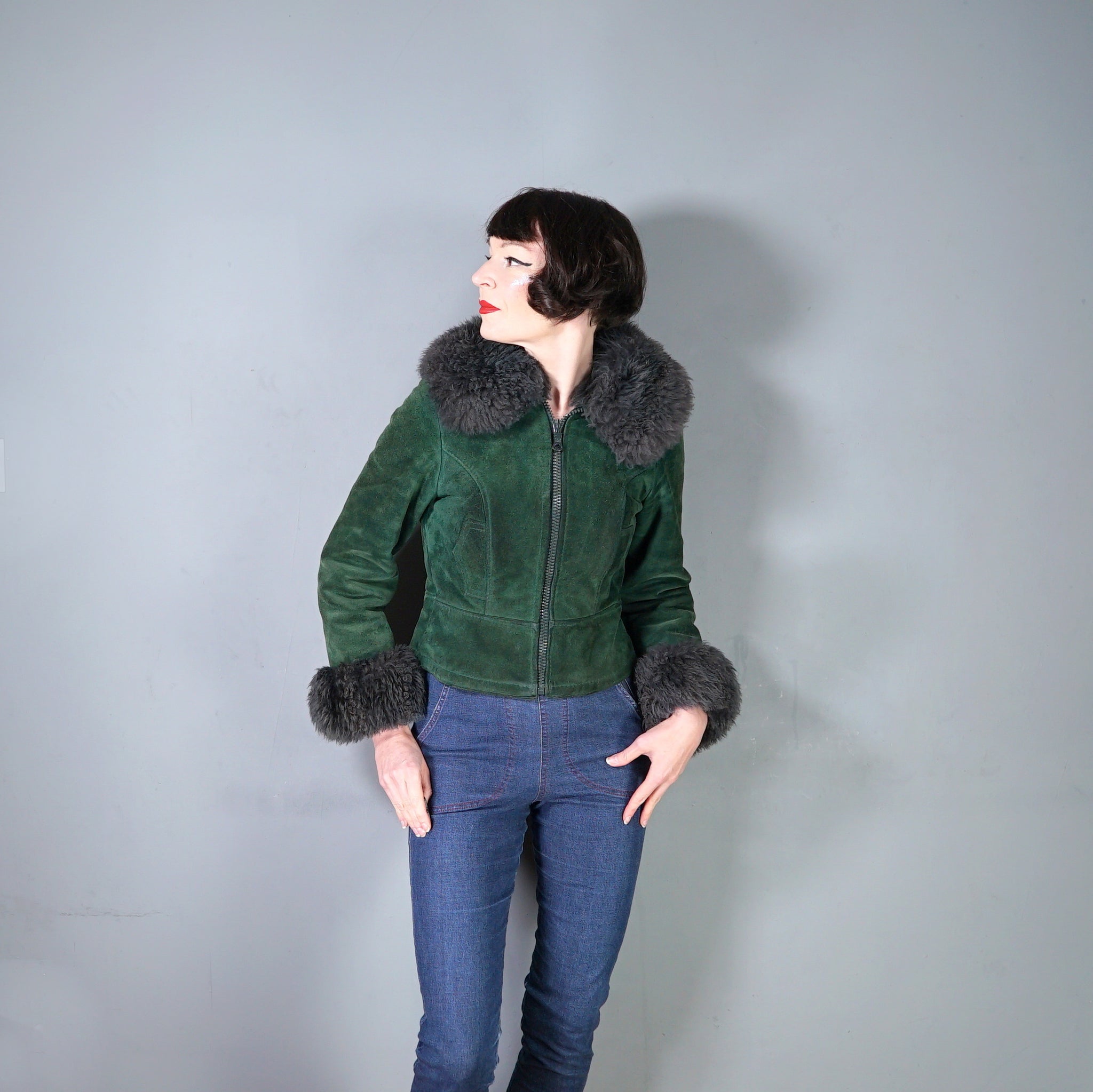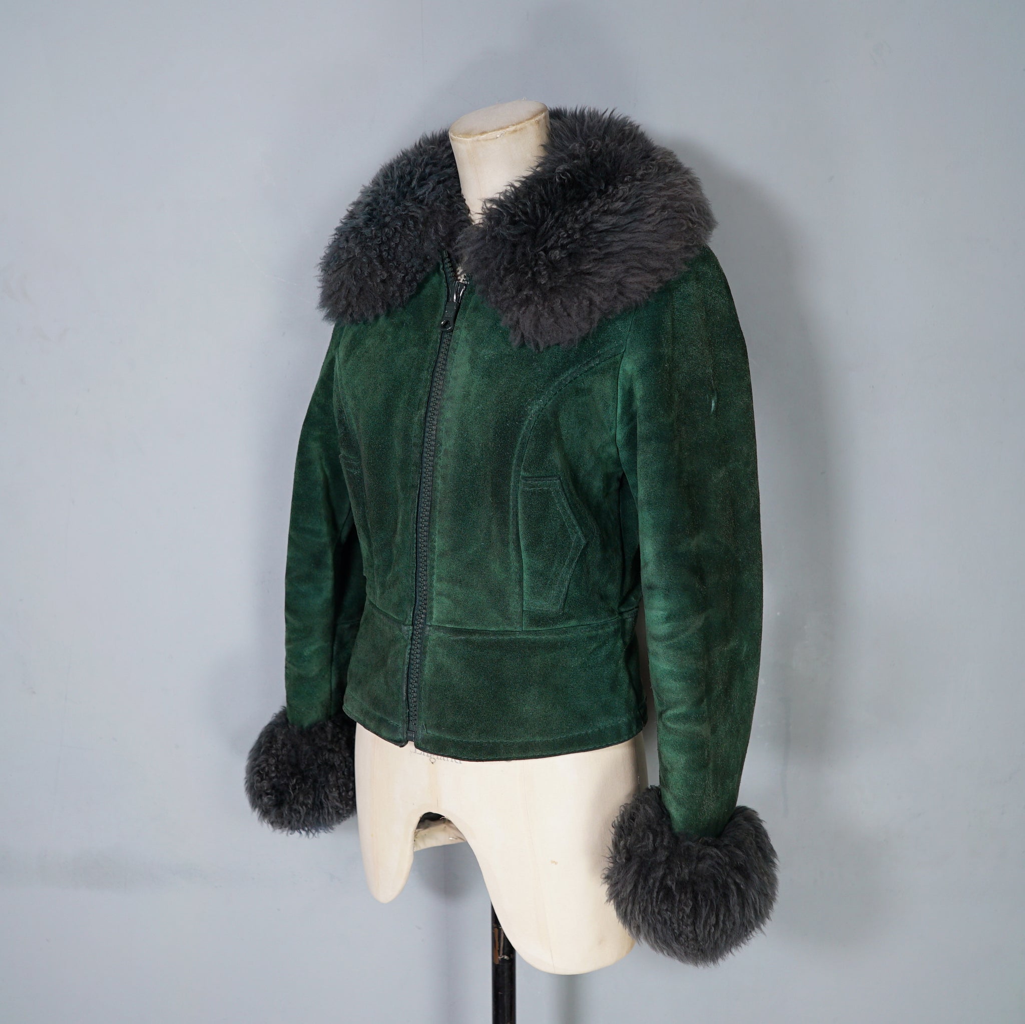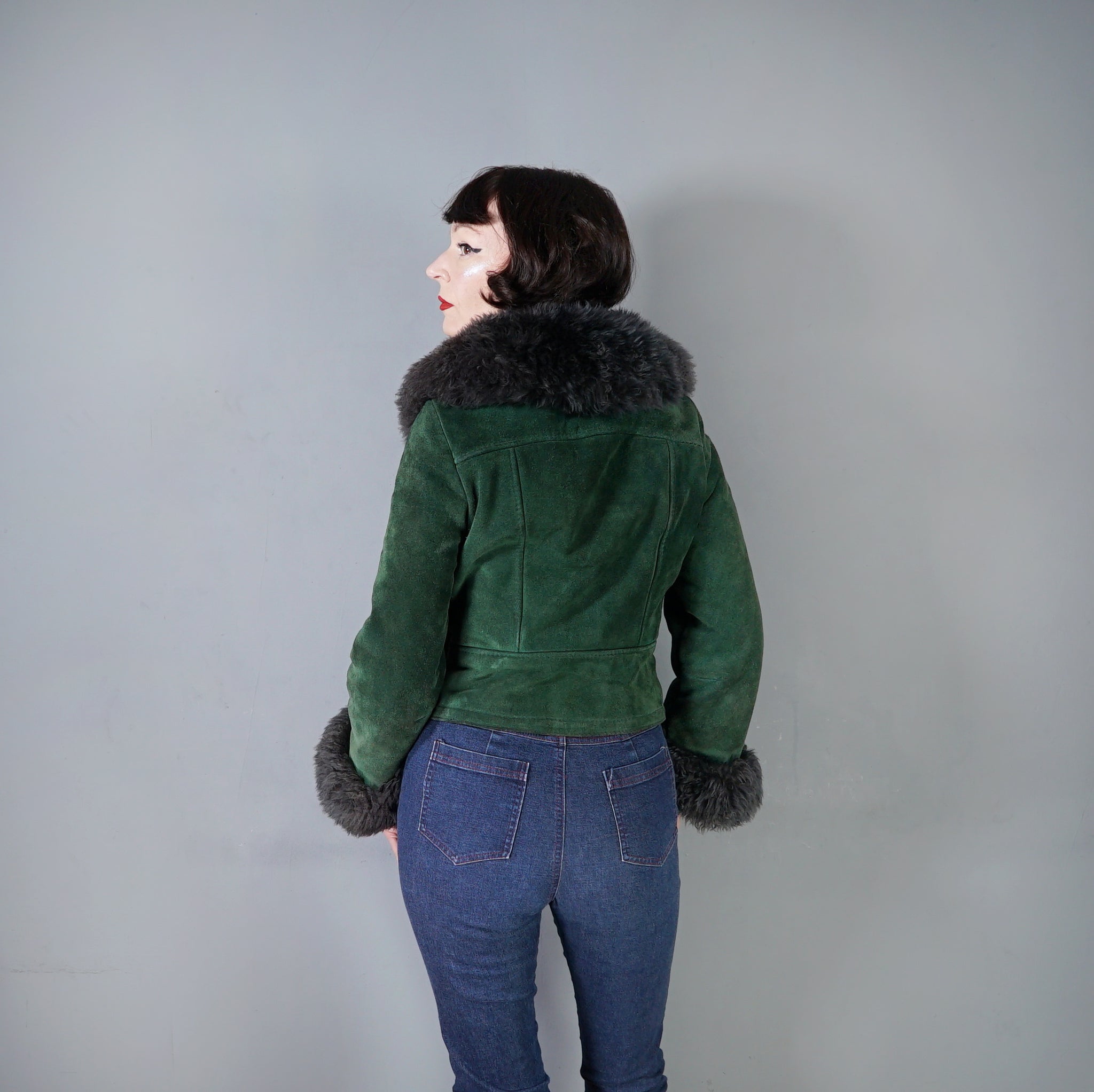 This is a beauty and sooooo cosy. Deep green suede 70s C&A real suede cropped jacket with soft fleece lining and fantastic soft fluffy dark grey sheepskin collar and cuffs. Fitted waist and decorative, not functional pocket flaps to the waist. Chunky plastic front zip to do up. Shorter length, finishes on the top of the hip.