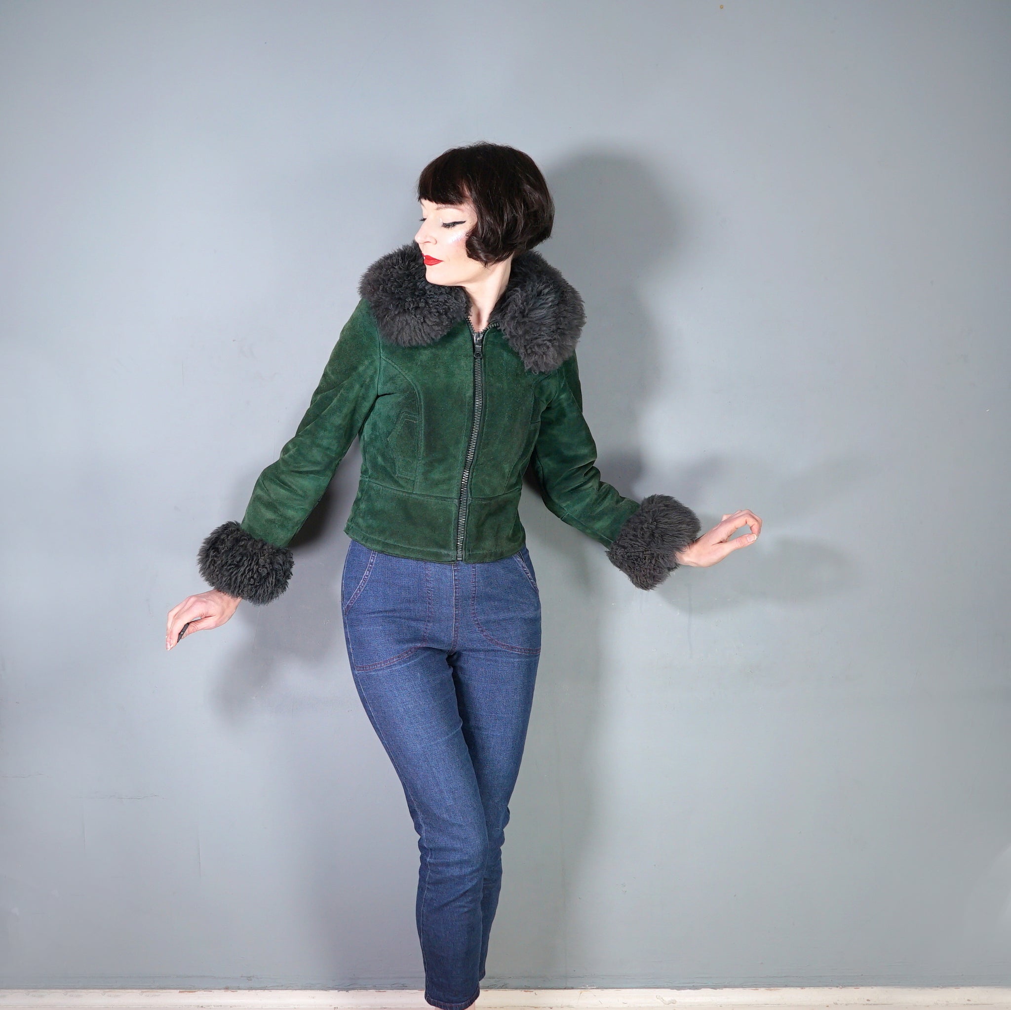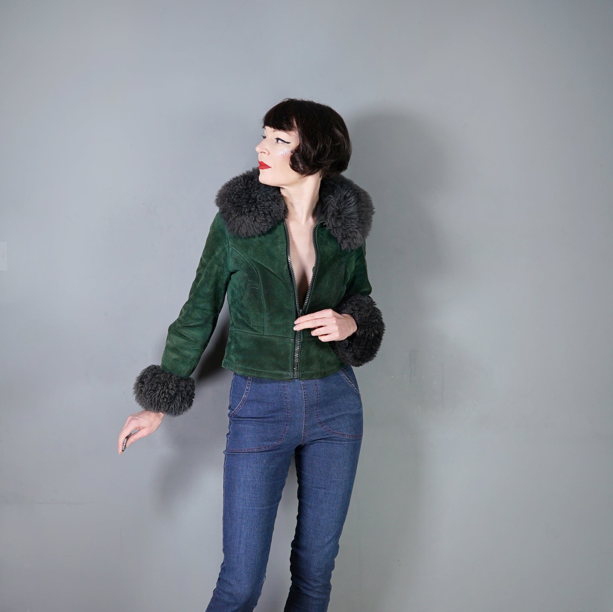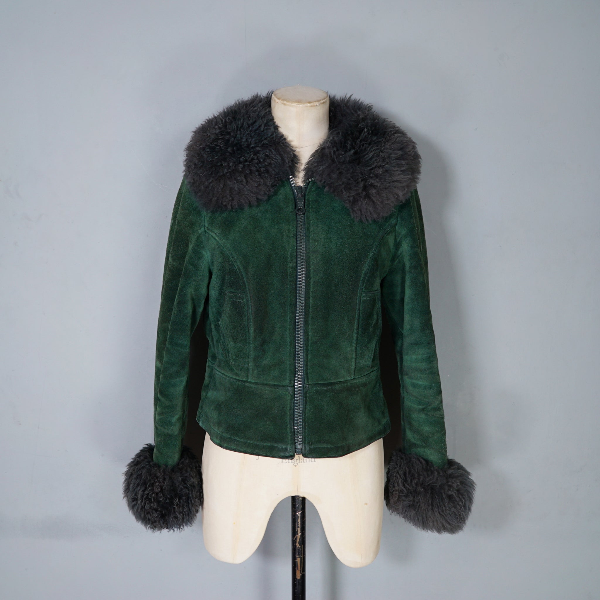 This is a beauty and sooooo cosy. Deep green suede 70s C&A real suede cropped jacket with soft fleece lining and fantastic soft fluffy dark grey sheepskin collar and cuffs. Fitted waist and decorative, not functional pocket flaps to the waist. Chunky plastic front zip to do up. Shorter length, finishes on the top of the hip.