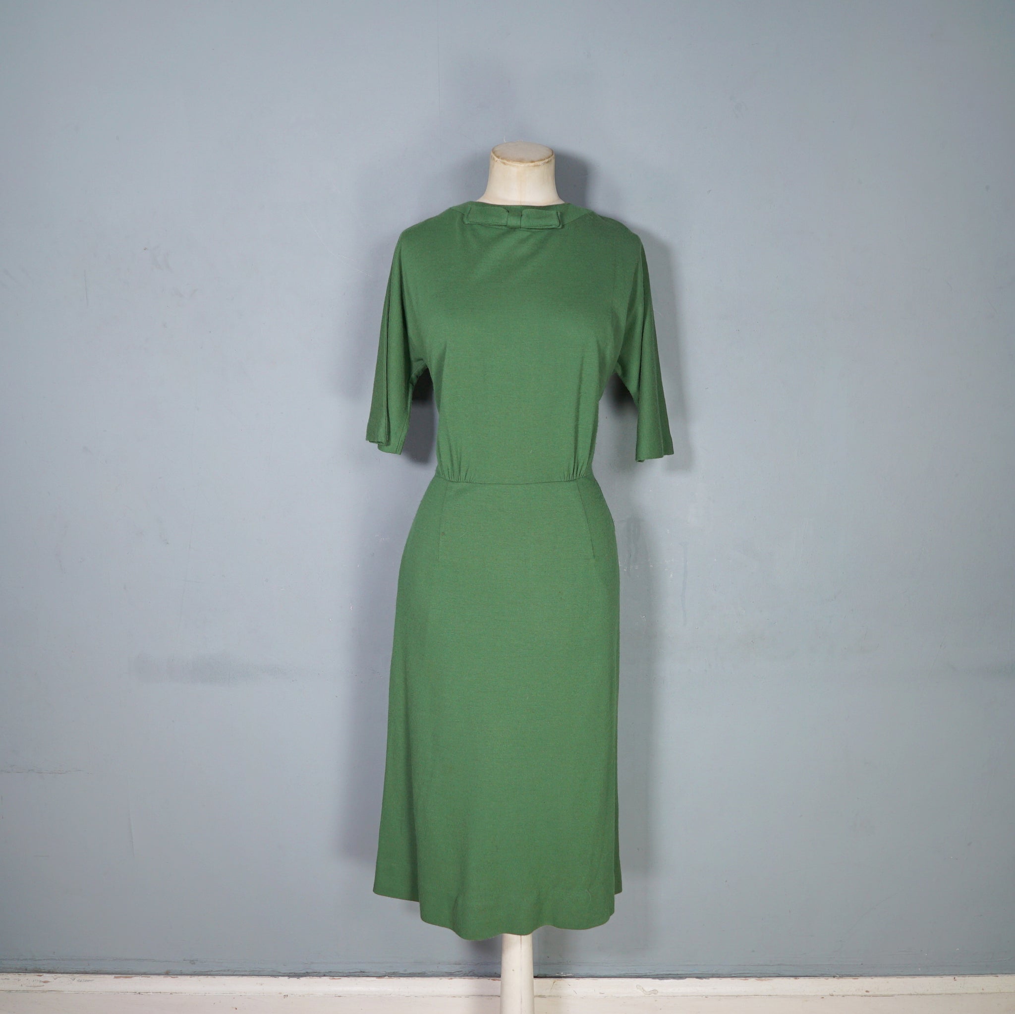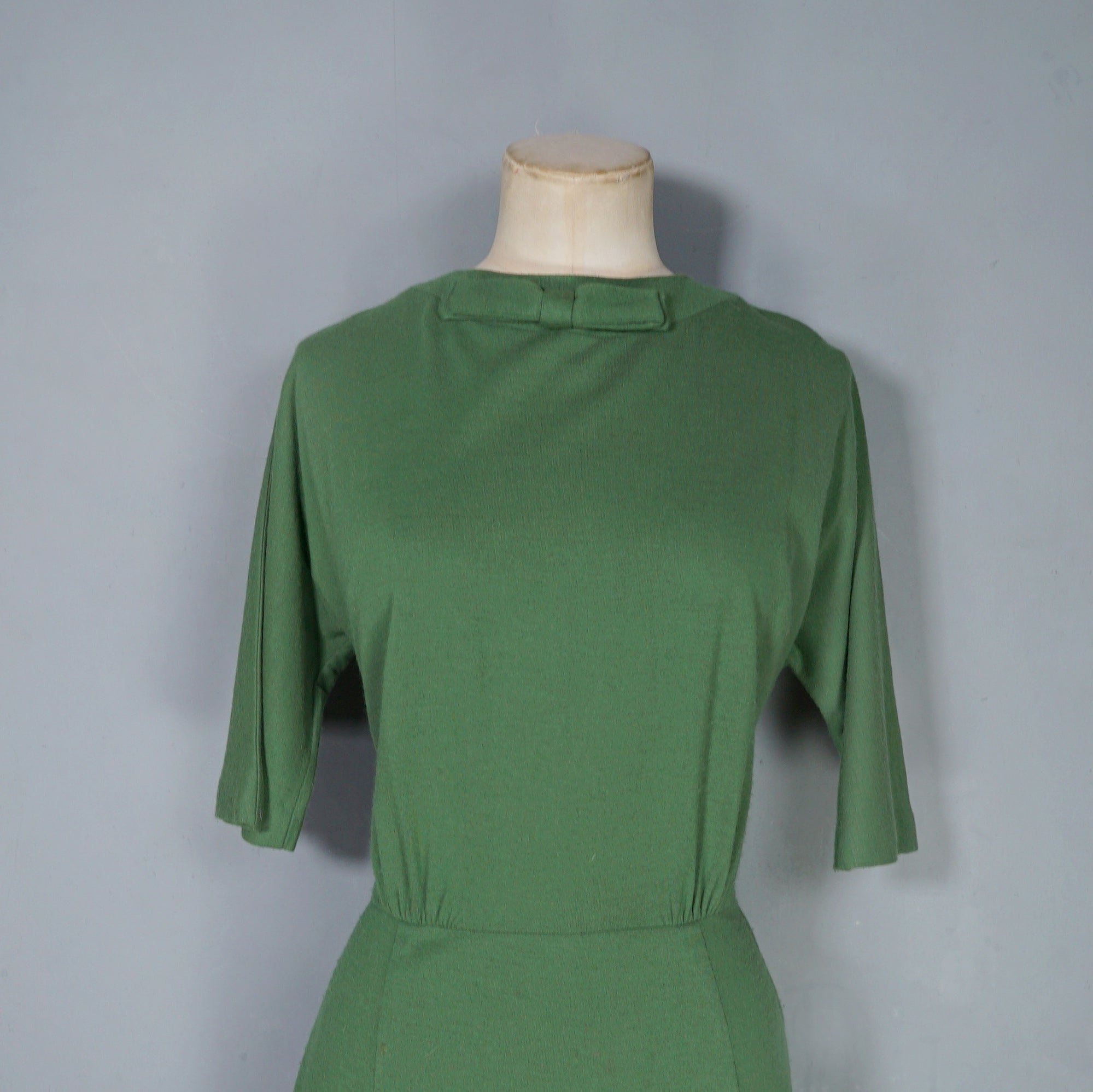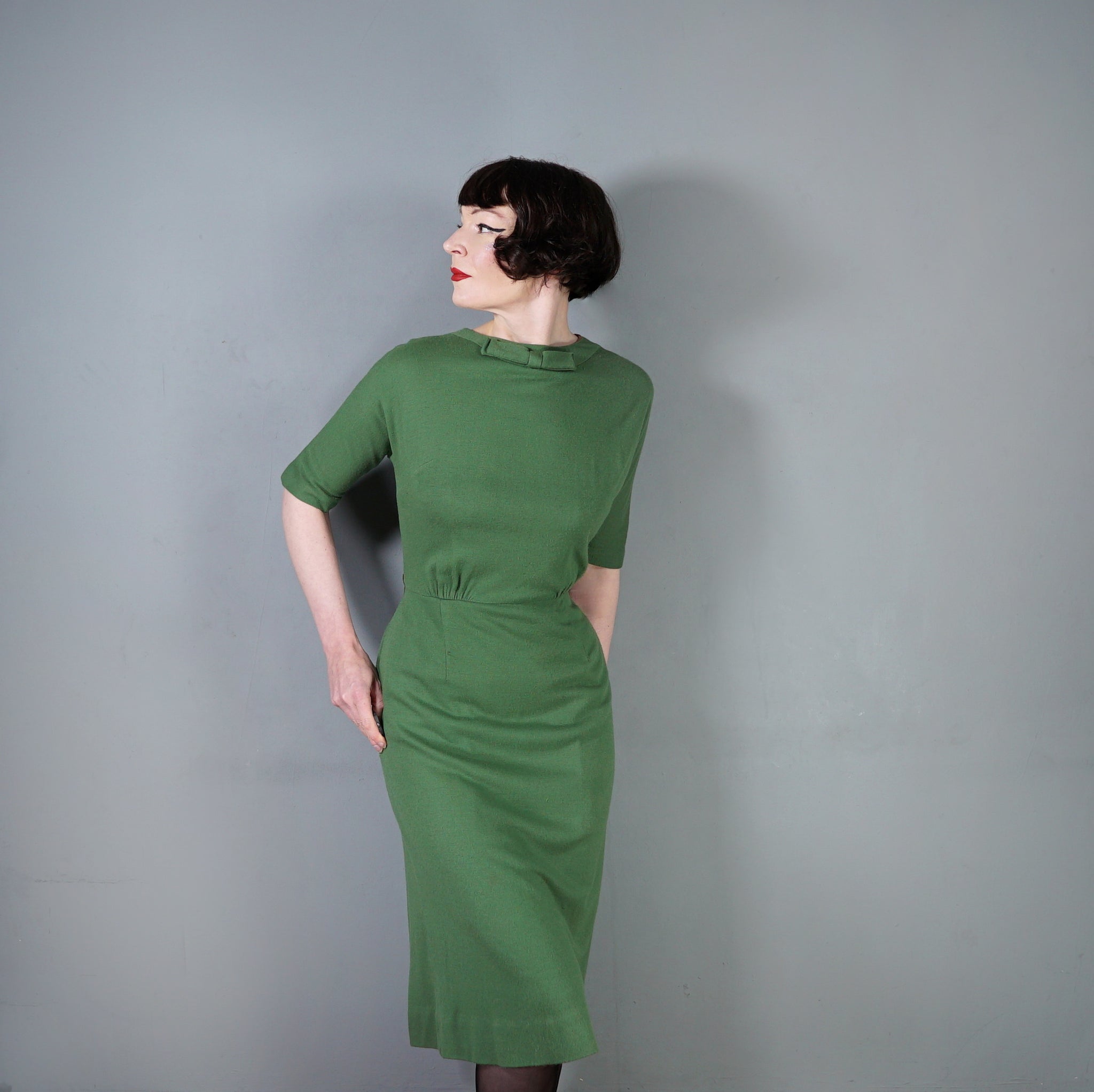 60s SOFT GREEN WOOL FITTED DRESS WITH NECK BOW AND BACK BUTTONING - M
