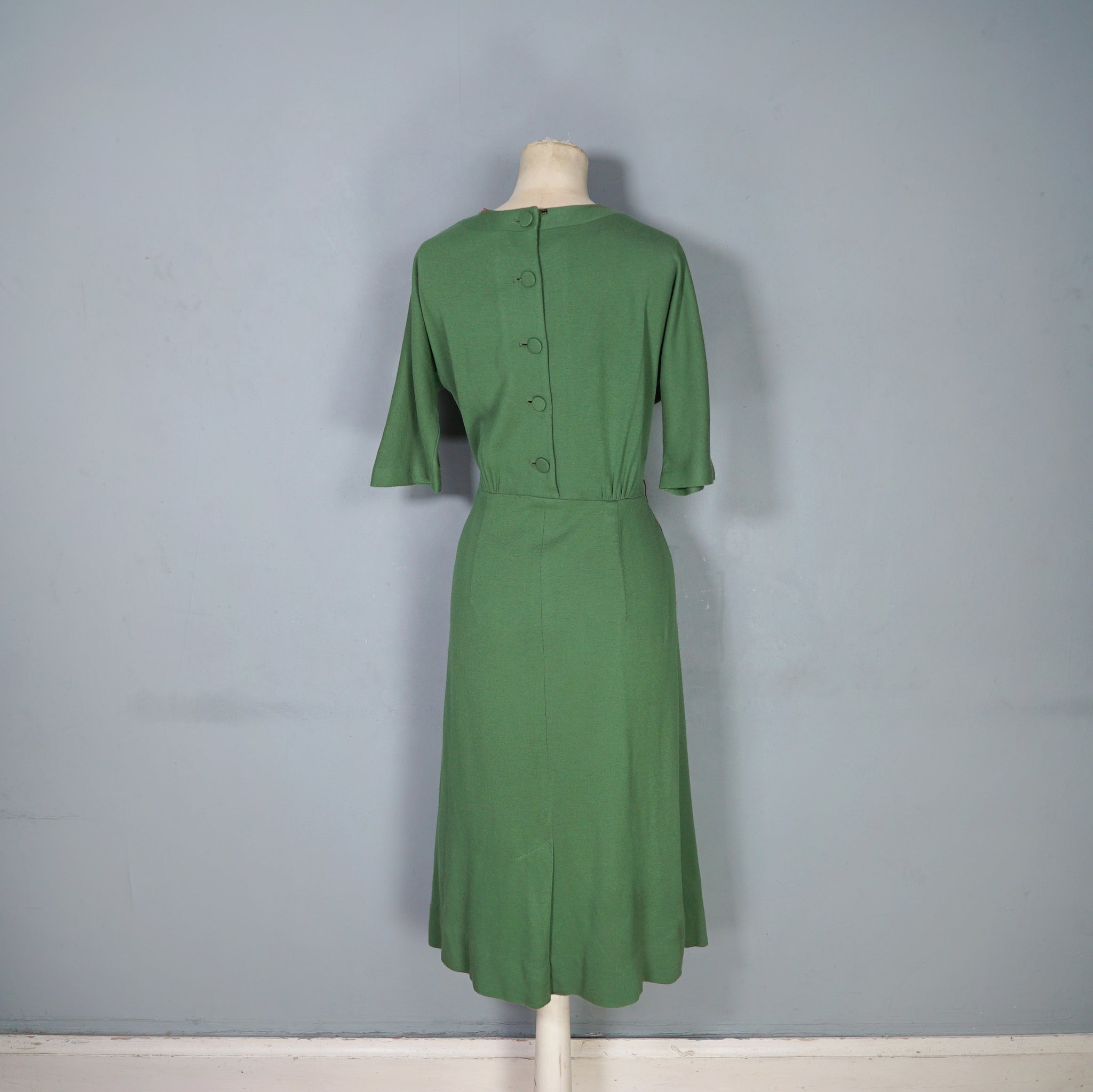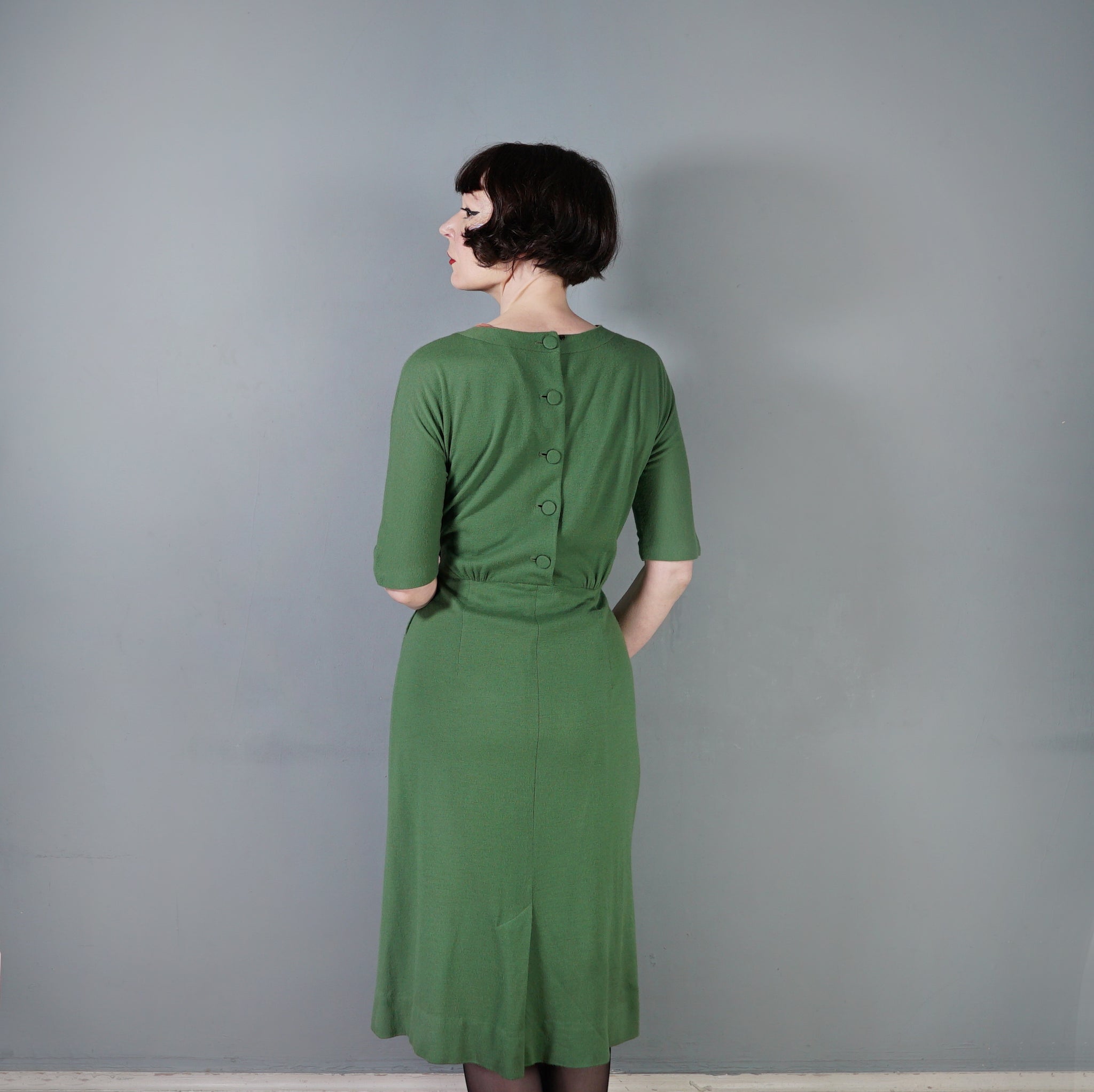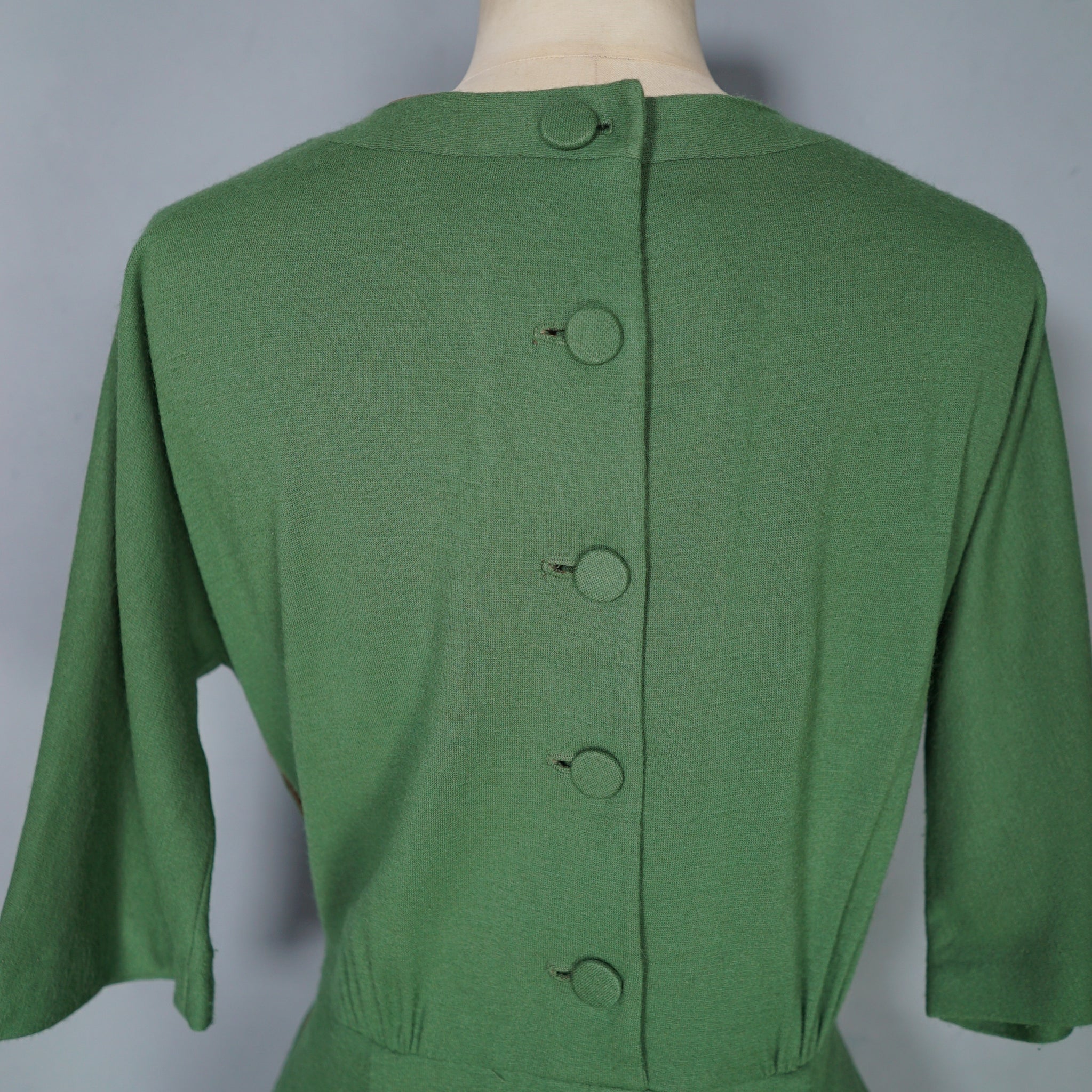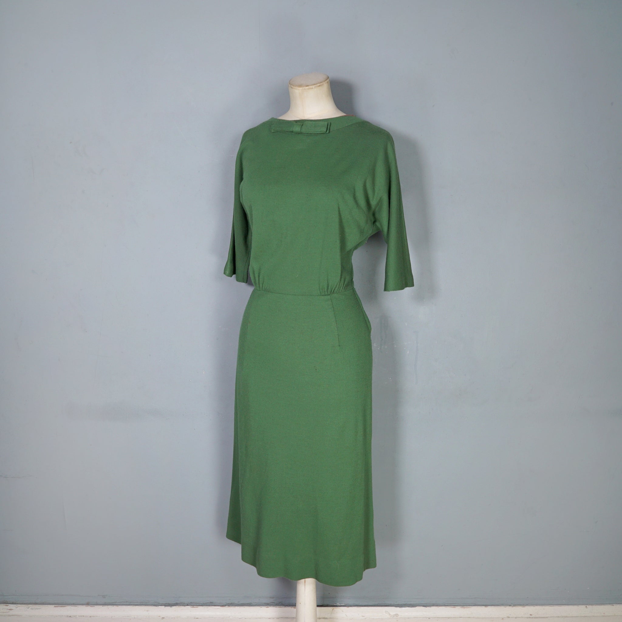 60s SOFT GREEN WOOL FITTED DRESS WITH NECK BOW AND BACK BUTTONING - M