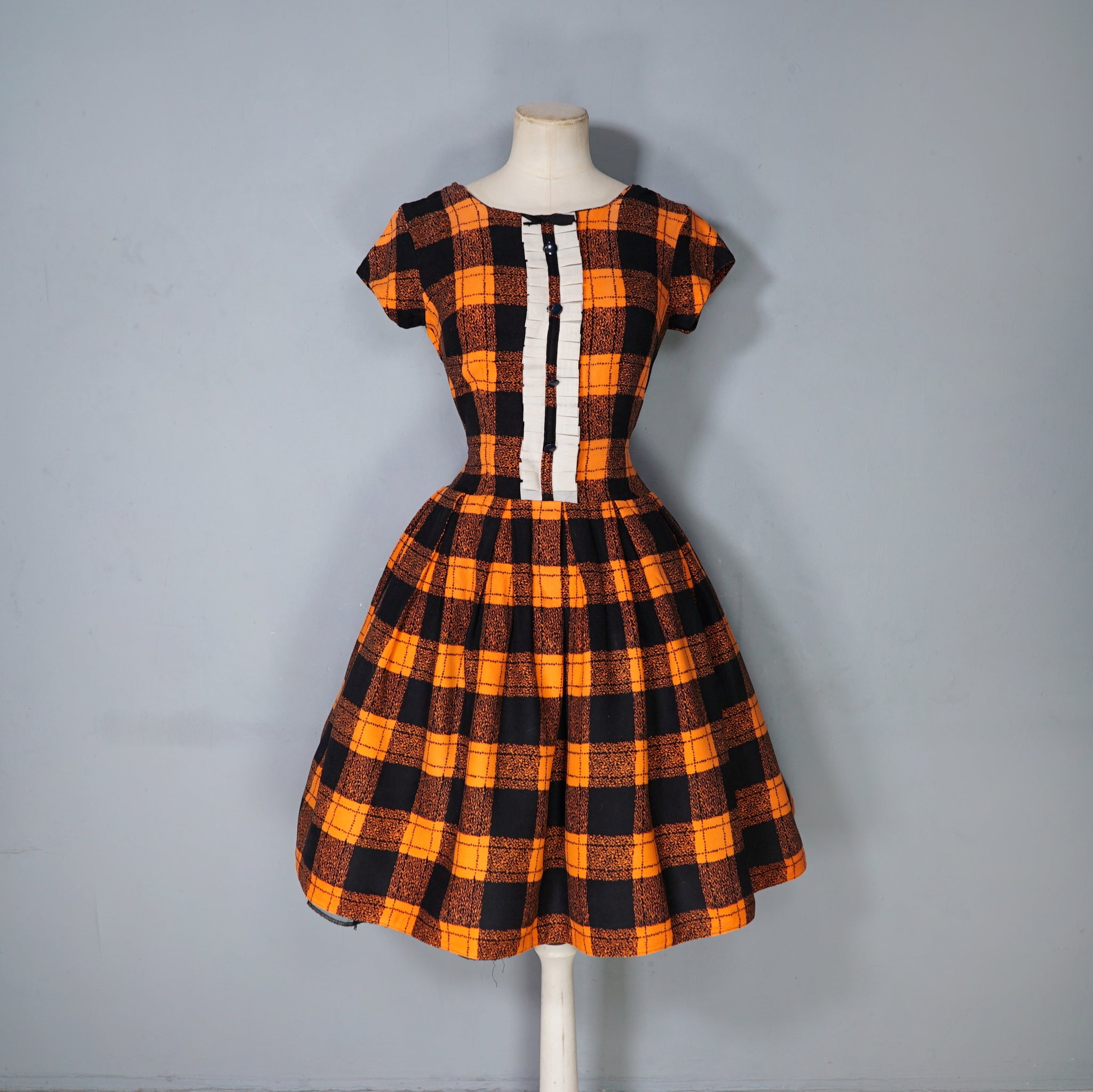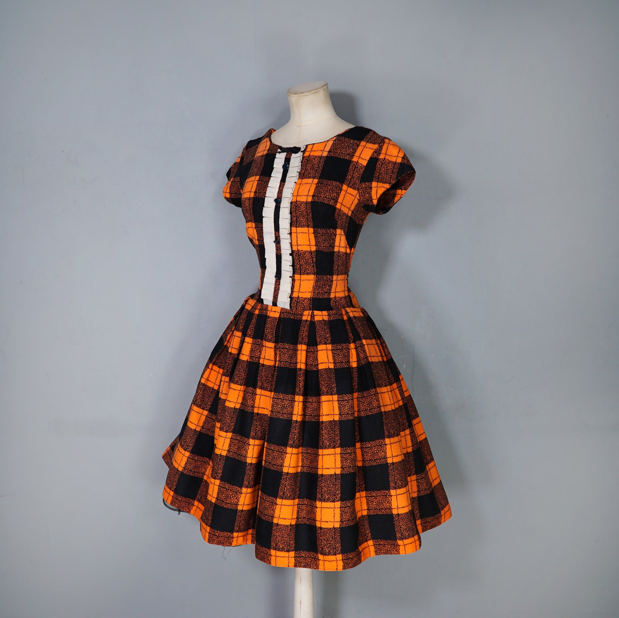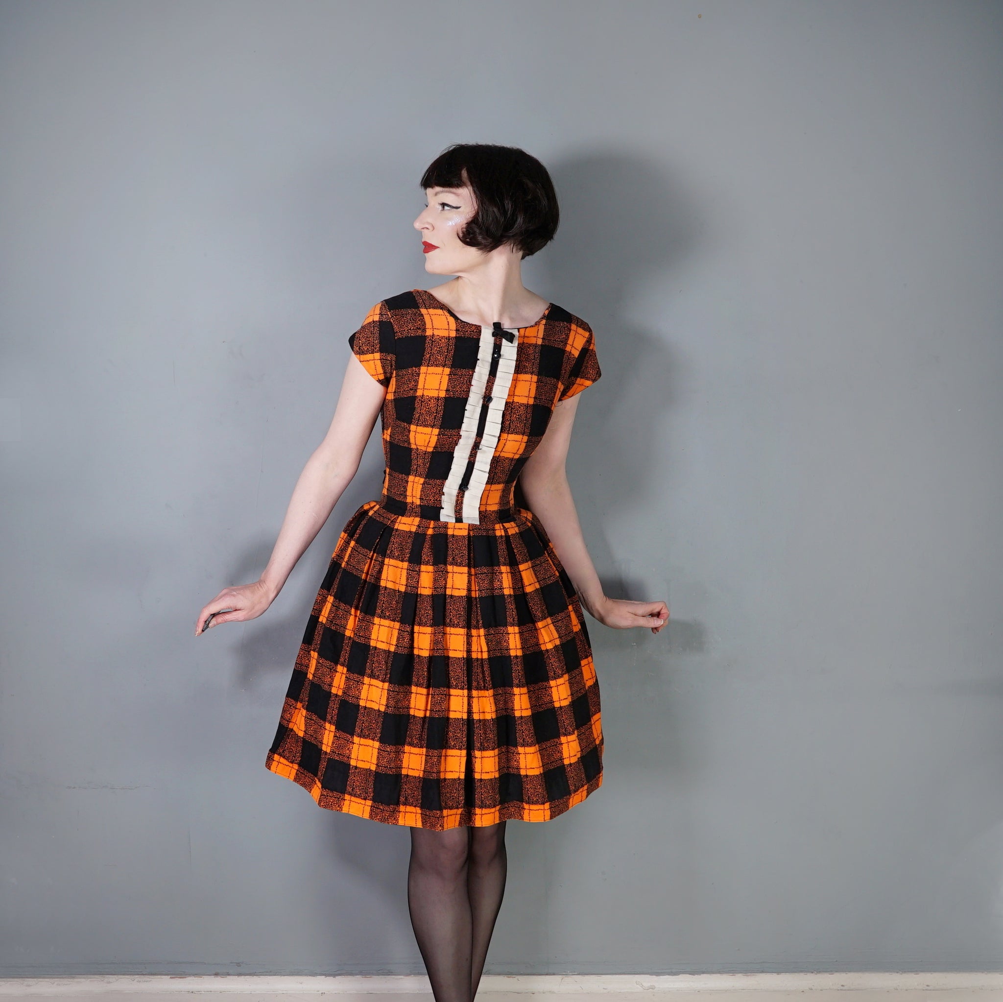 Soft warm flannel day dress in a pumpkin orange and black plaid check. Drop waisted bodice with waist straps to cinch in the waistband and a cute white ruffle bib with decorative buttons to the chest. Short sleeve. High collarless neck. Skirt is sewn in wide box pleats. Cute flippy fit with approx knee length. Back metal zipper.