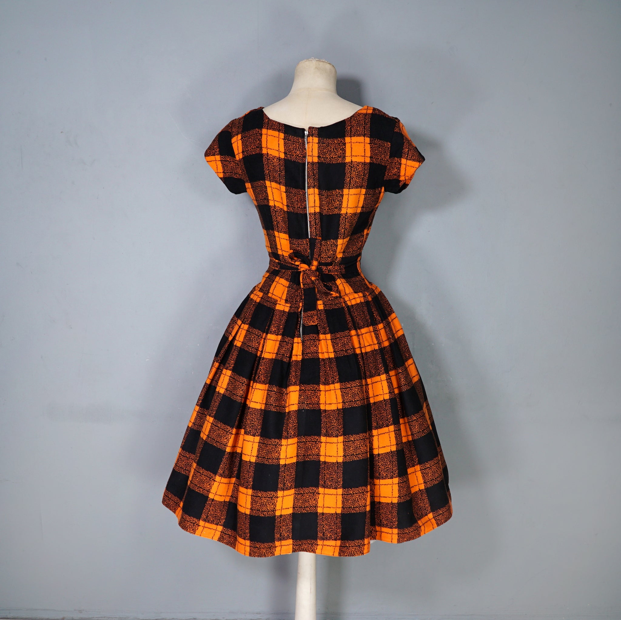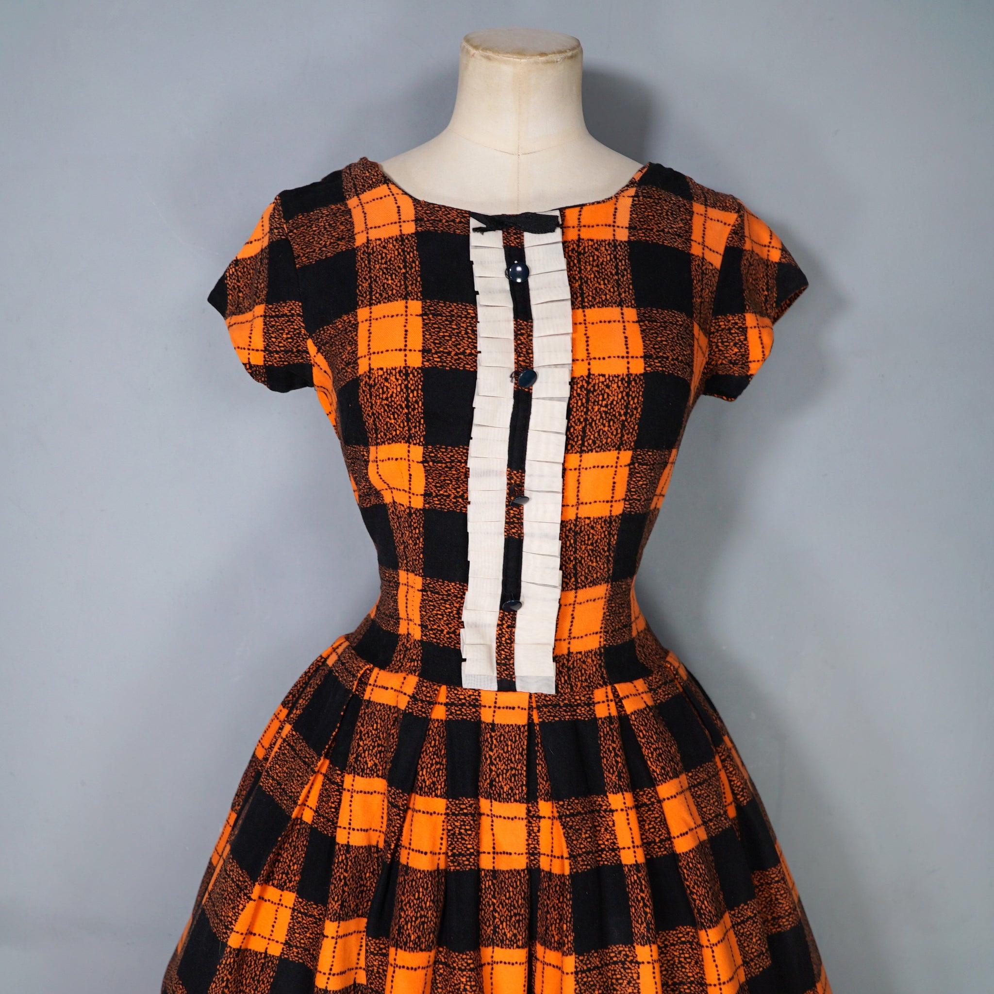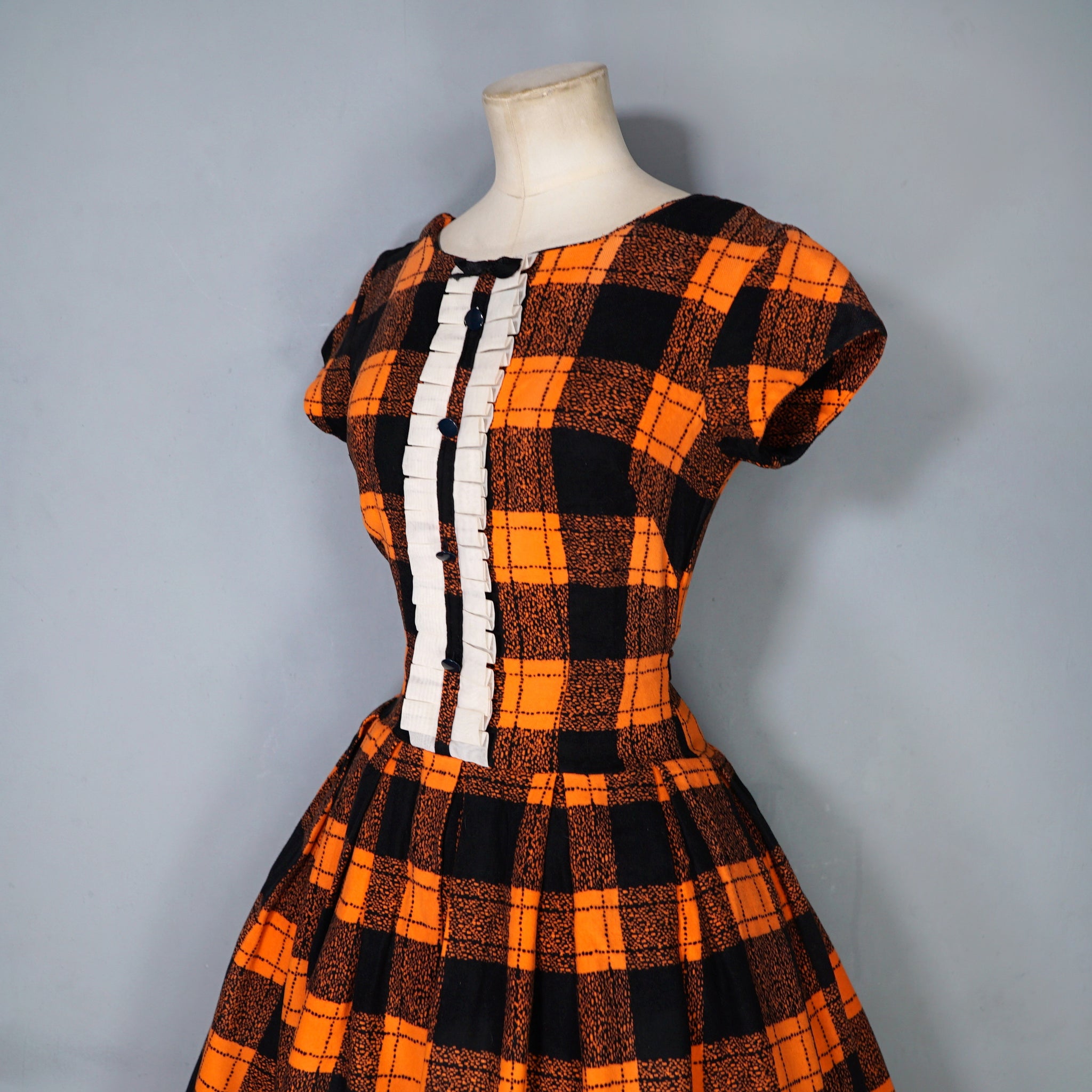 Soft warm flannel day dress in a pumpkin orange and black plaid check. Drop waisted bodice with waist straps to cinch in the waistband and a cute white ruffle bib with decorative buttons to the chest. Short sleeve. High collarless neck. Skirt is sewn in wide box pleats. Cute flippy fit with approx knee length. Back metal zipper.