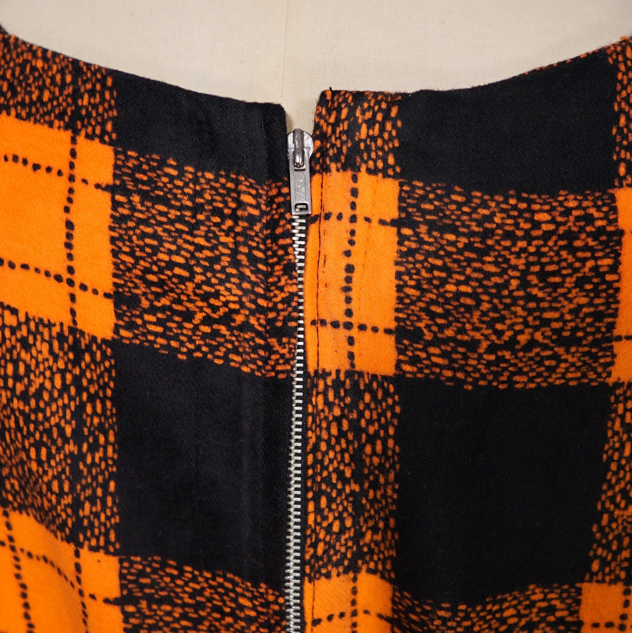60s ORANGE BLACK SOFT WARM FLANNEL FULL SKIRT DRESS WITH RUFFLE - XS-S