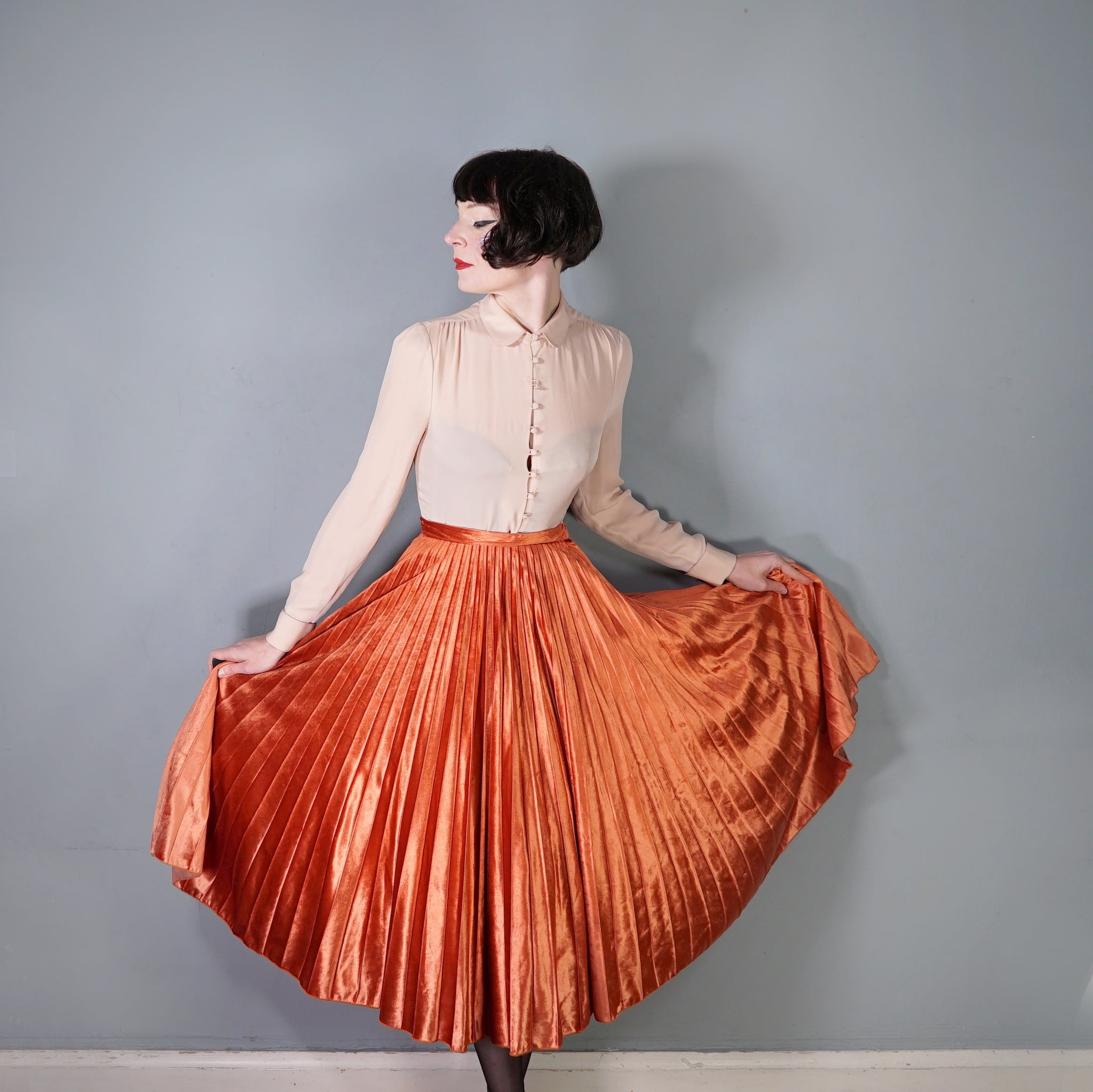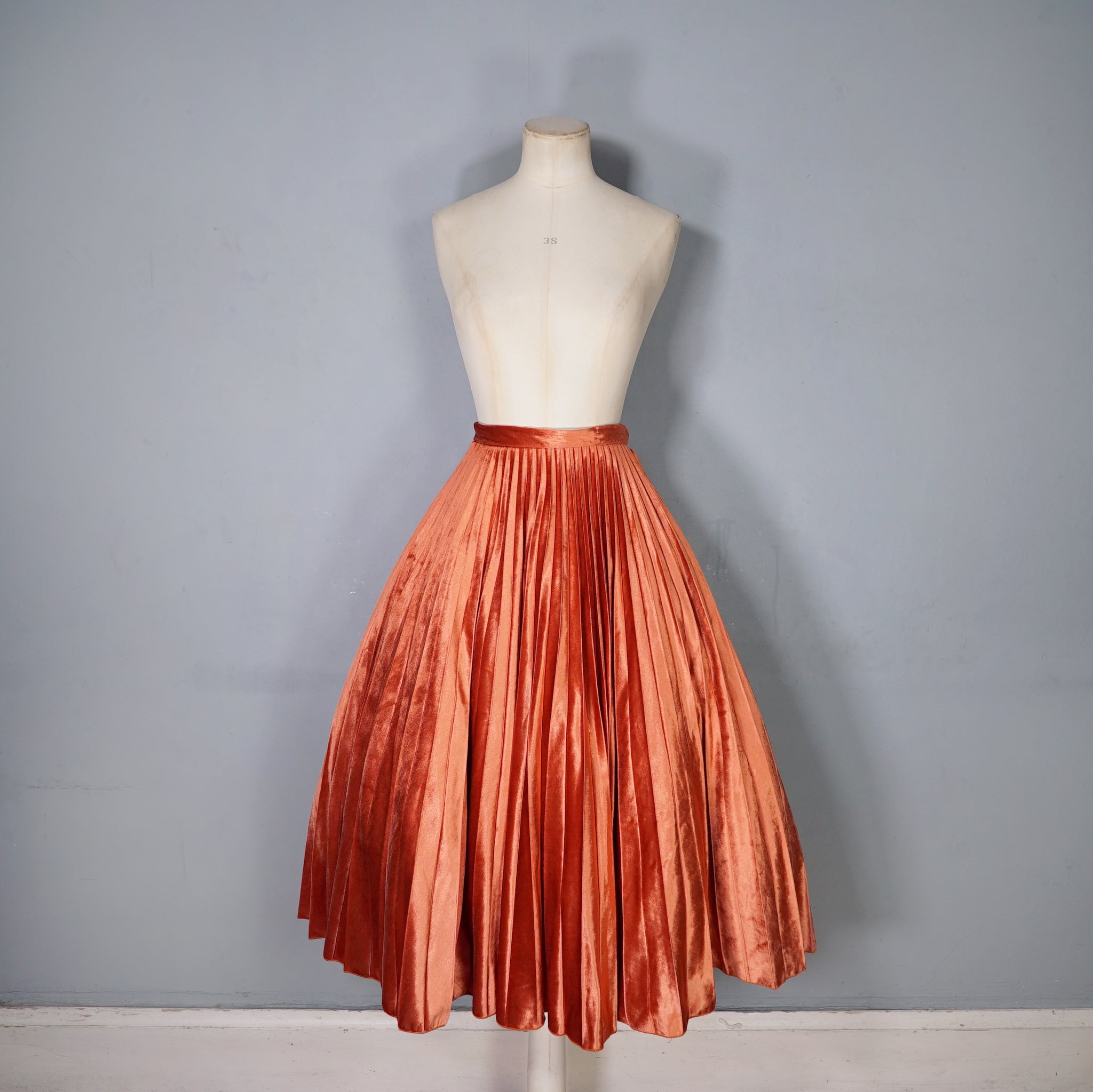 Lustrous pumpking orange velour skirt from the 1970s. High fitted waistband with hook and nylon zip to fasten. Skirt is pleated and has a full skirted sweep. Label is Craigmere, made in England. Triacetate and nylon synthetic velvet, beautifully soft and such a fab sheen. The perfect autumn skirt.