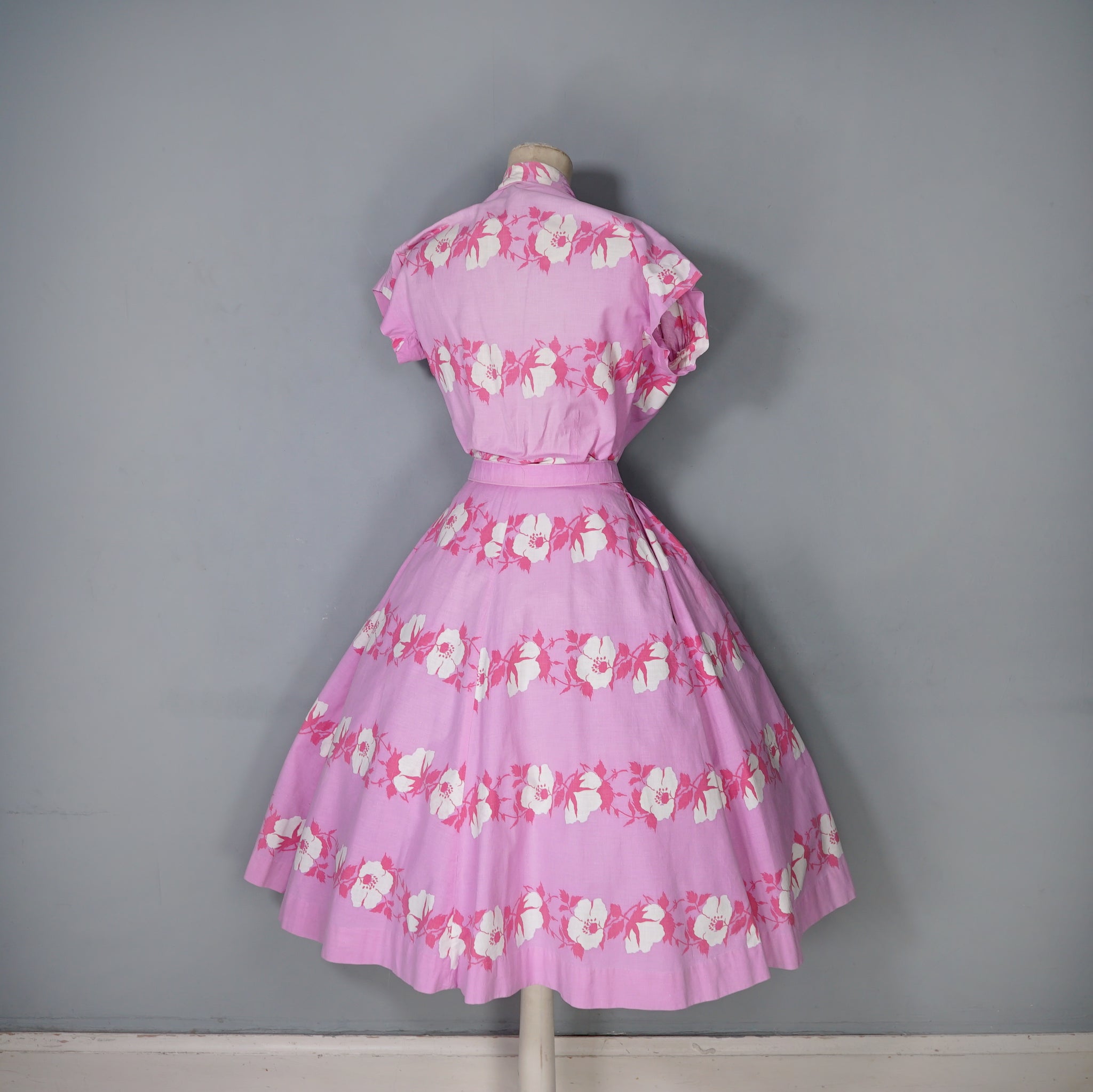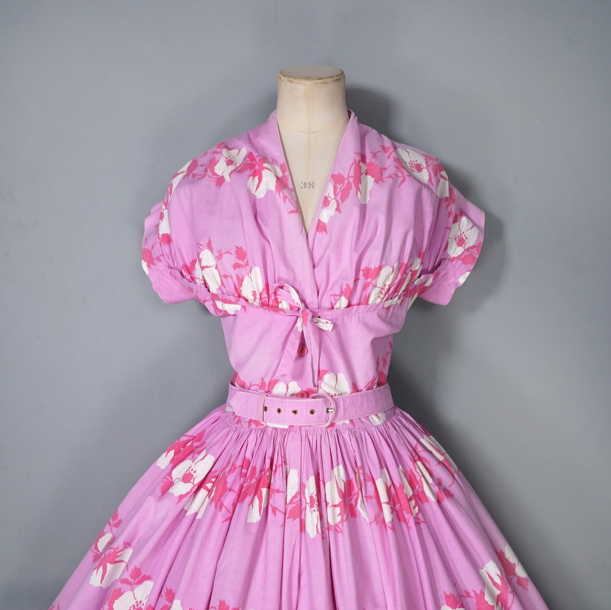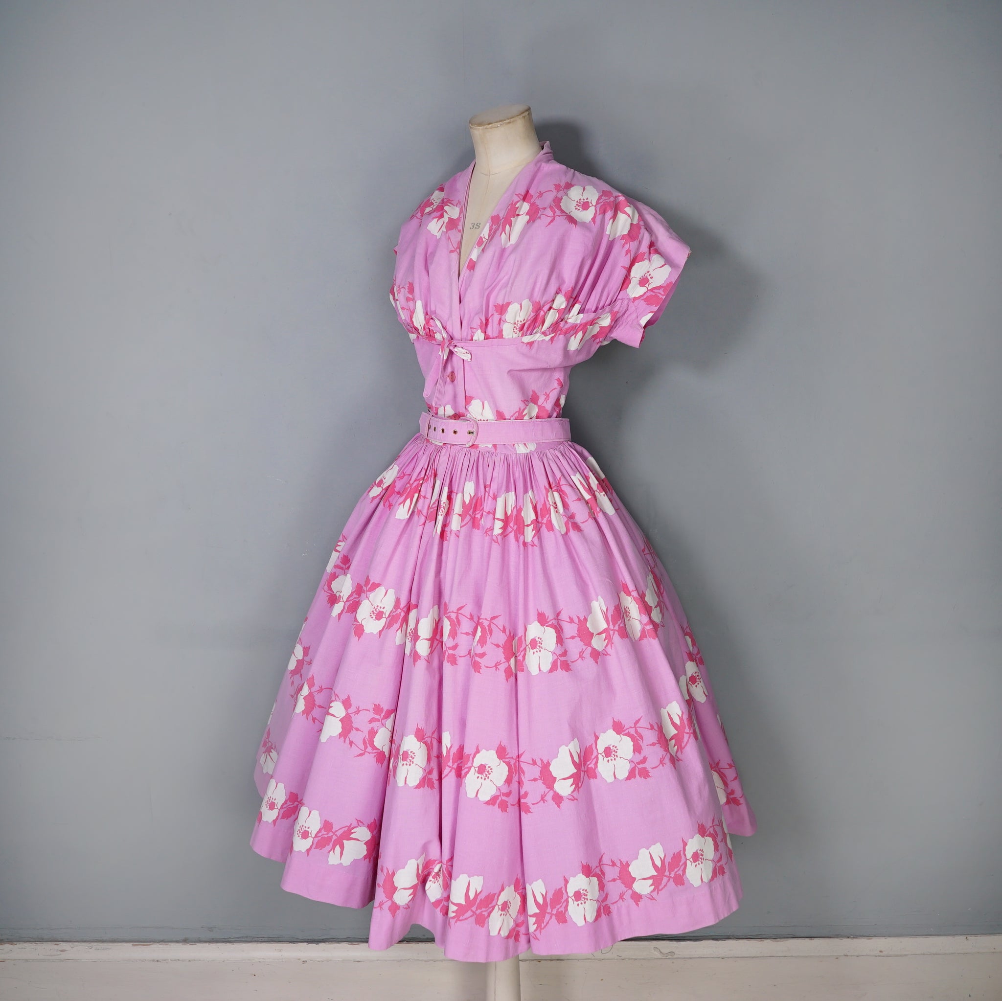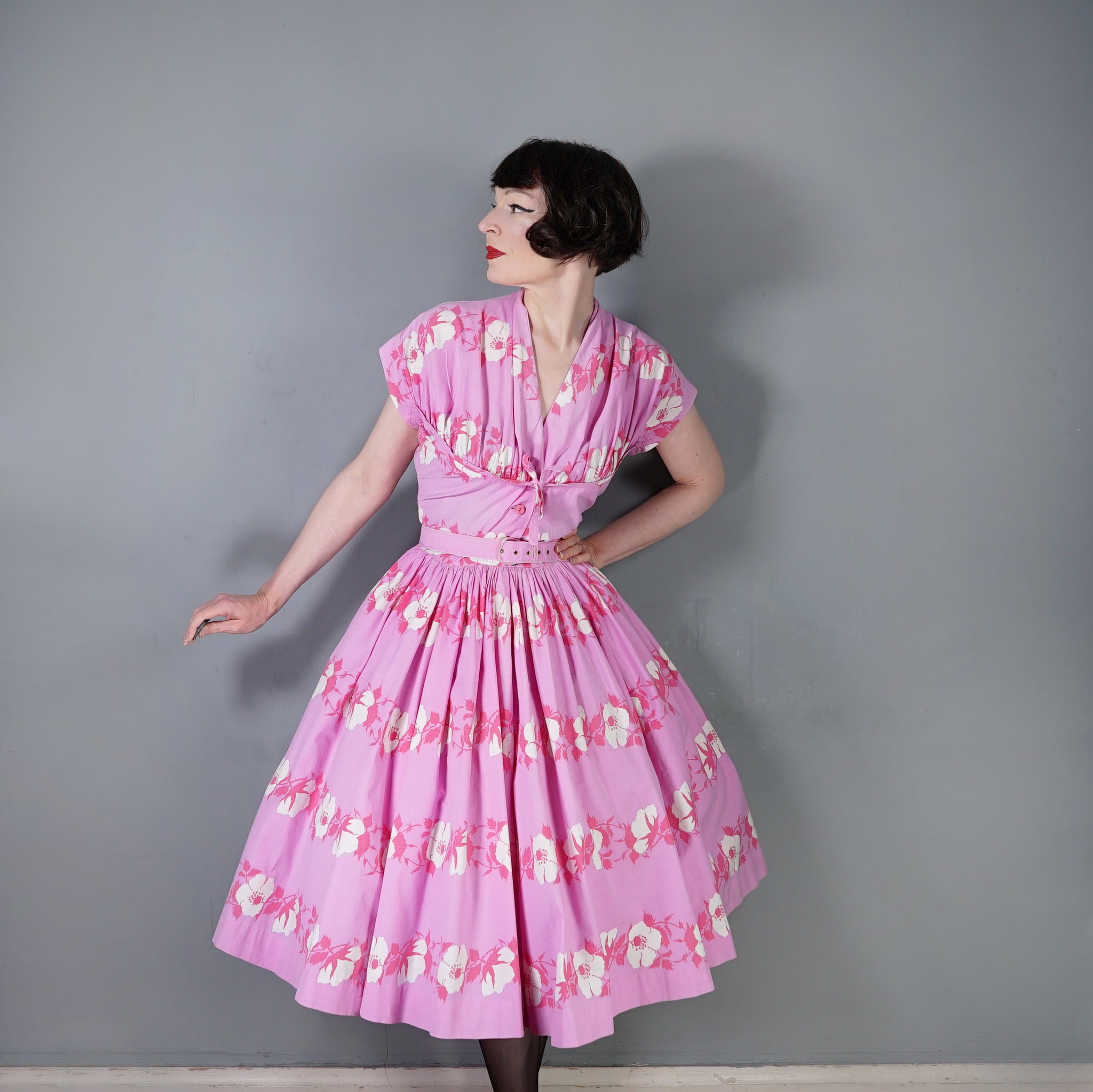 Absolutely stunning Horrockses Fashion 50s dress in a rich lilacy pink with a big floral print of white and pink in garland bands. Fitted bodice with a deep v-neck and gathered bustline with a curved underbust with a small tie bow to the front. Short dolman sleeve with triangular underarm gusset design. Two buttons to the front of the waist and a hook at the waistband. The slilhouette has a strongly cinched in waistline, with matching belt and a glorious, lavisihly full skirt sewn in gathers. Absolutely stunning!
