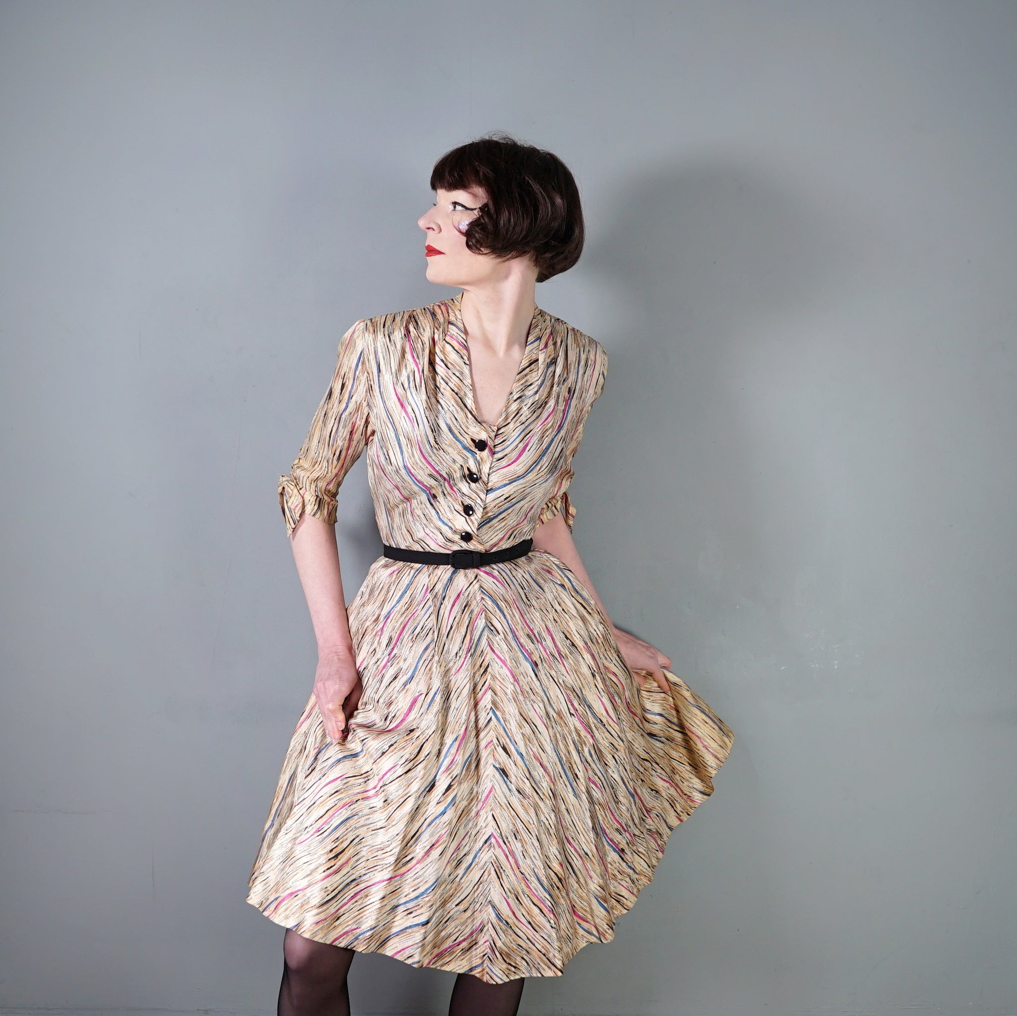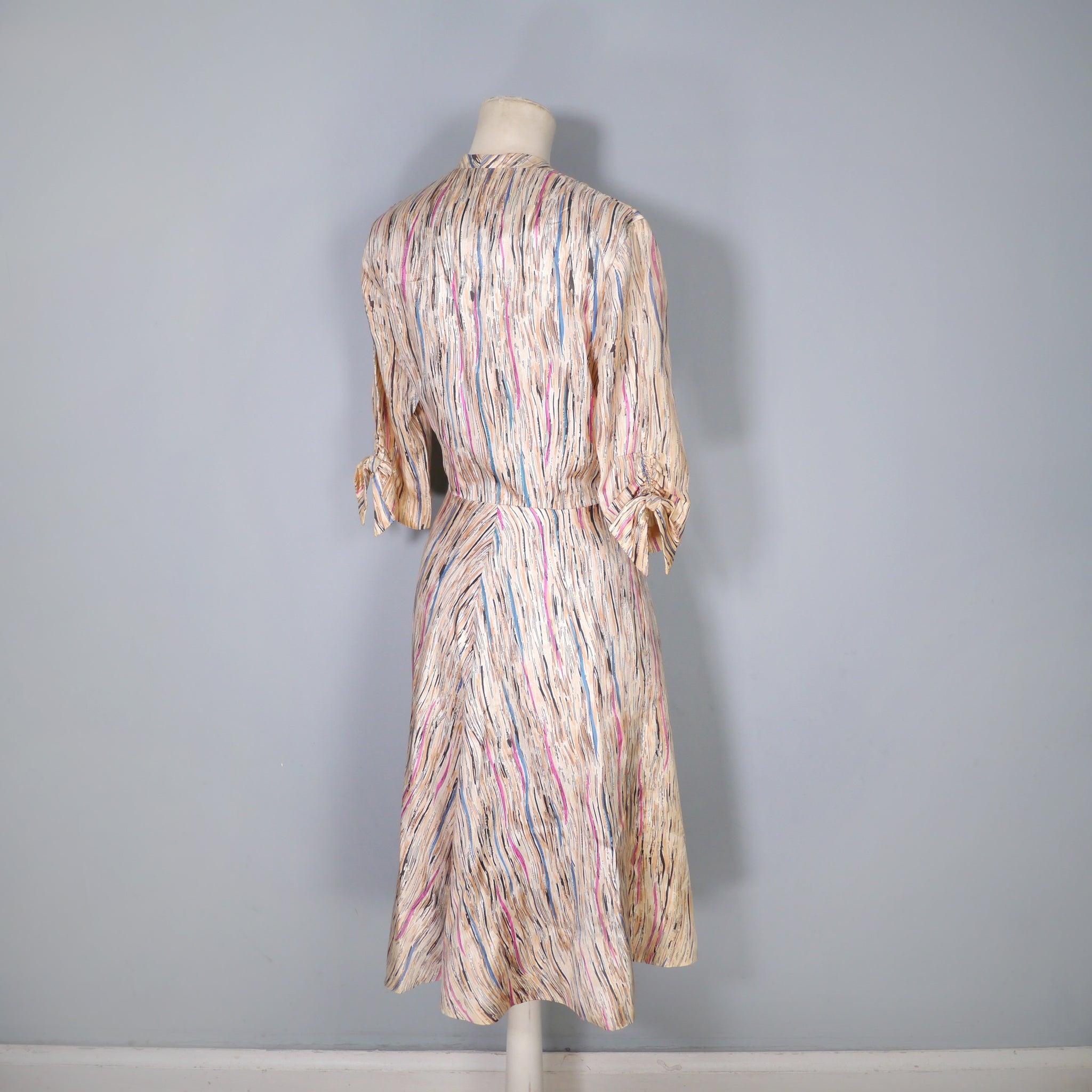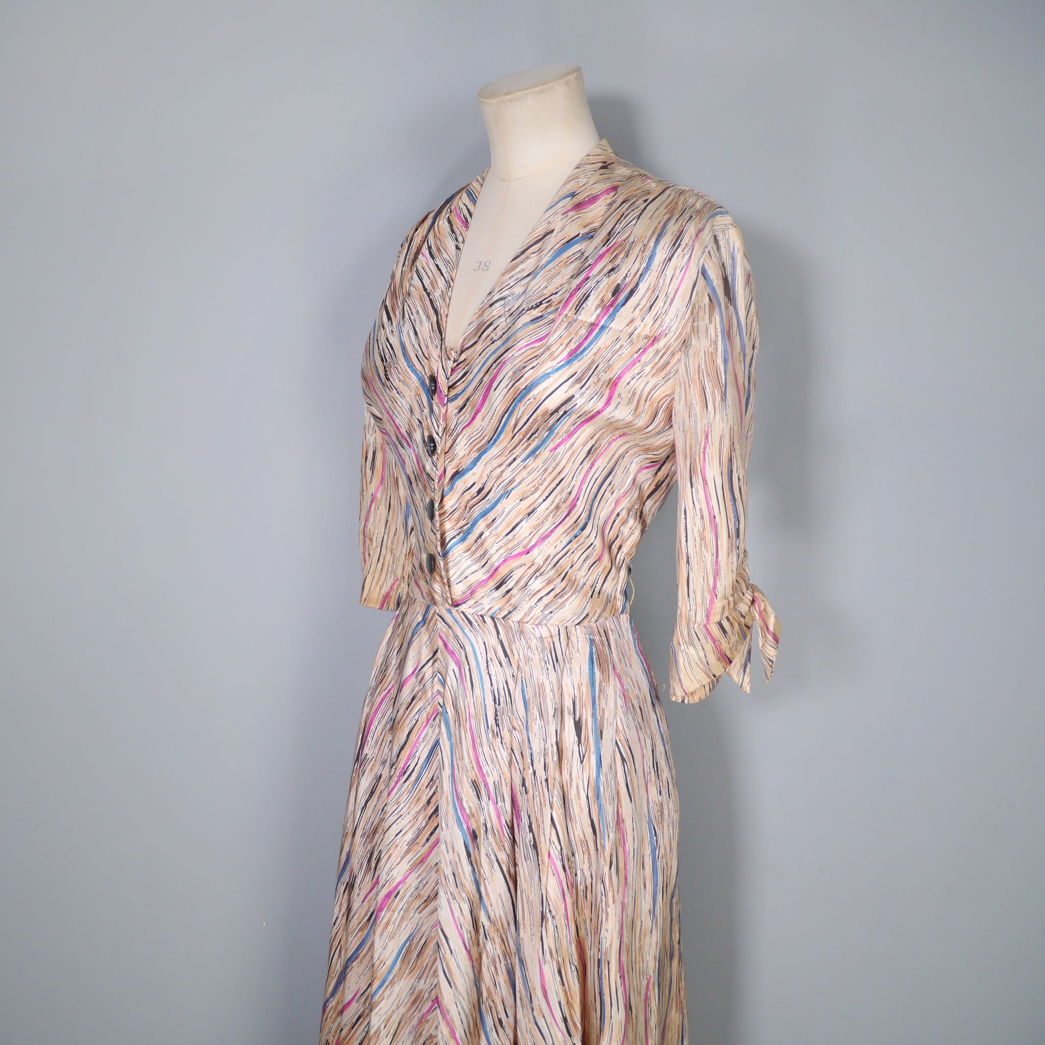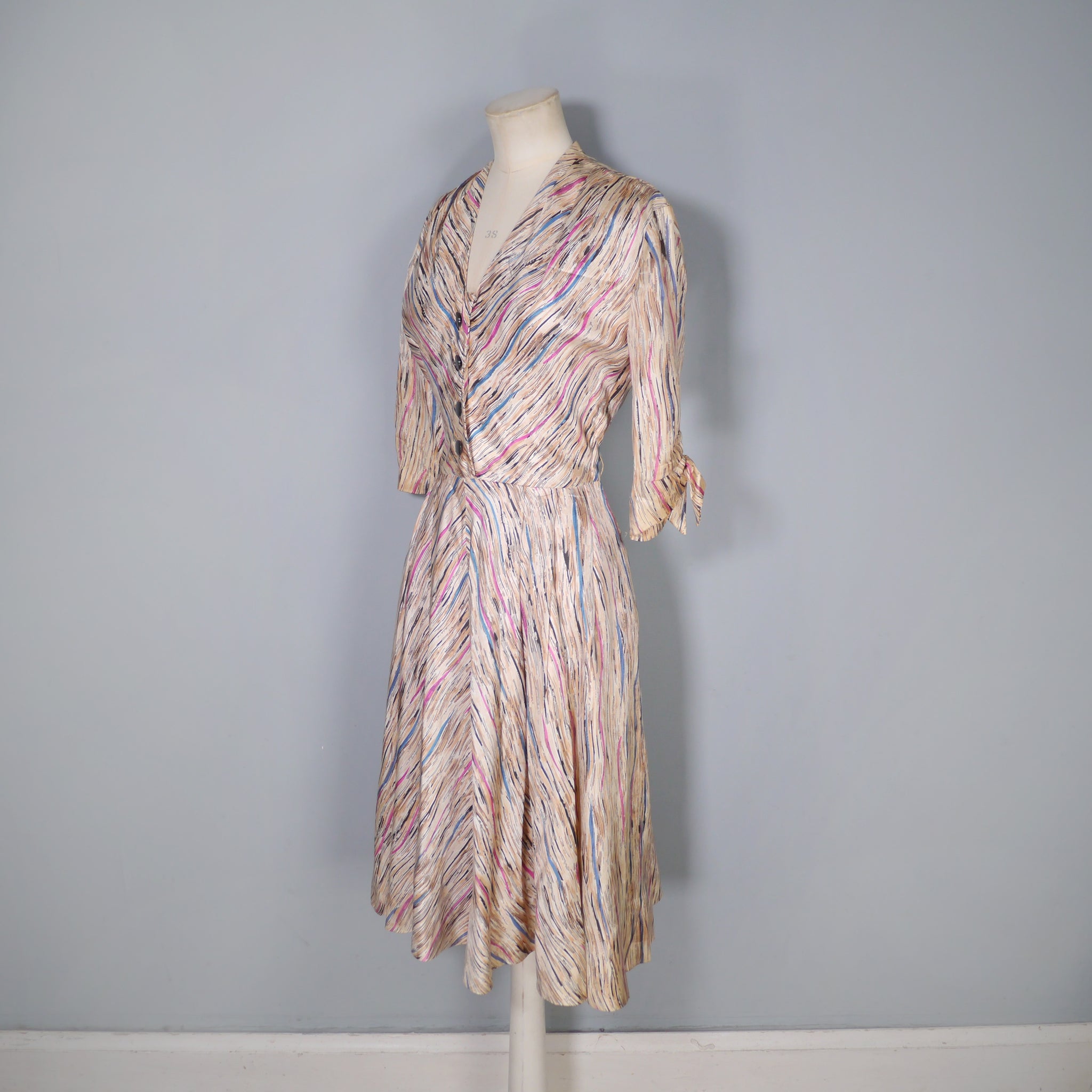 Soft silky bias cut late 40s dress by Leslie Fay. Slightly glossy silky fabric in a soft yellowy cream colour with a linear brushed print in black with streaks of purple, petrol blue and mauve lines running through it. Bias cut shirt bodice with four black buttons to the chest. V-neck with small shoulder pleats. Half sleeve with gathered stitches on the cuff, adorned with a little bow. Fitted waistband. Full skirt, sewn in four panels on the bias. Handy concealed slot pockets in the side seam, which we all LOVE! Side metal zipper to fasten.