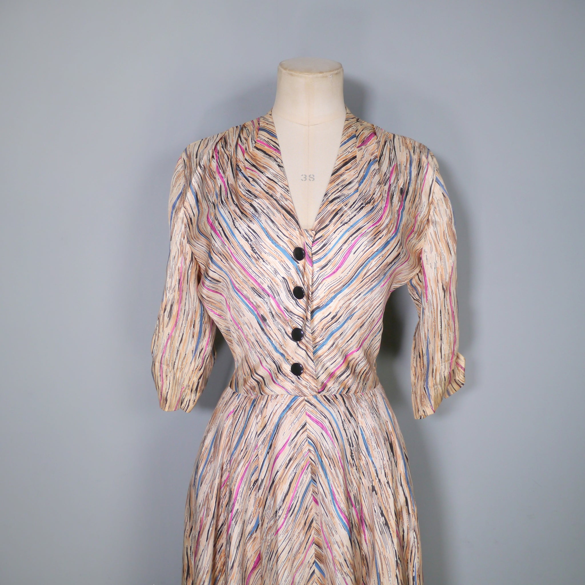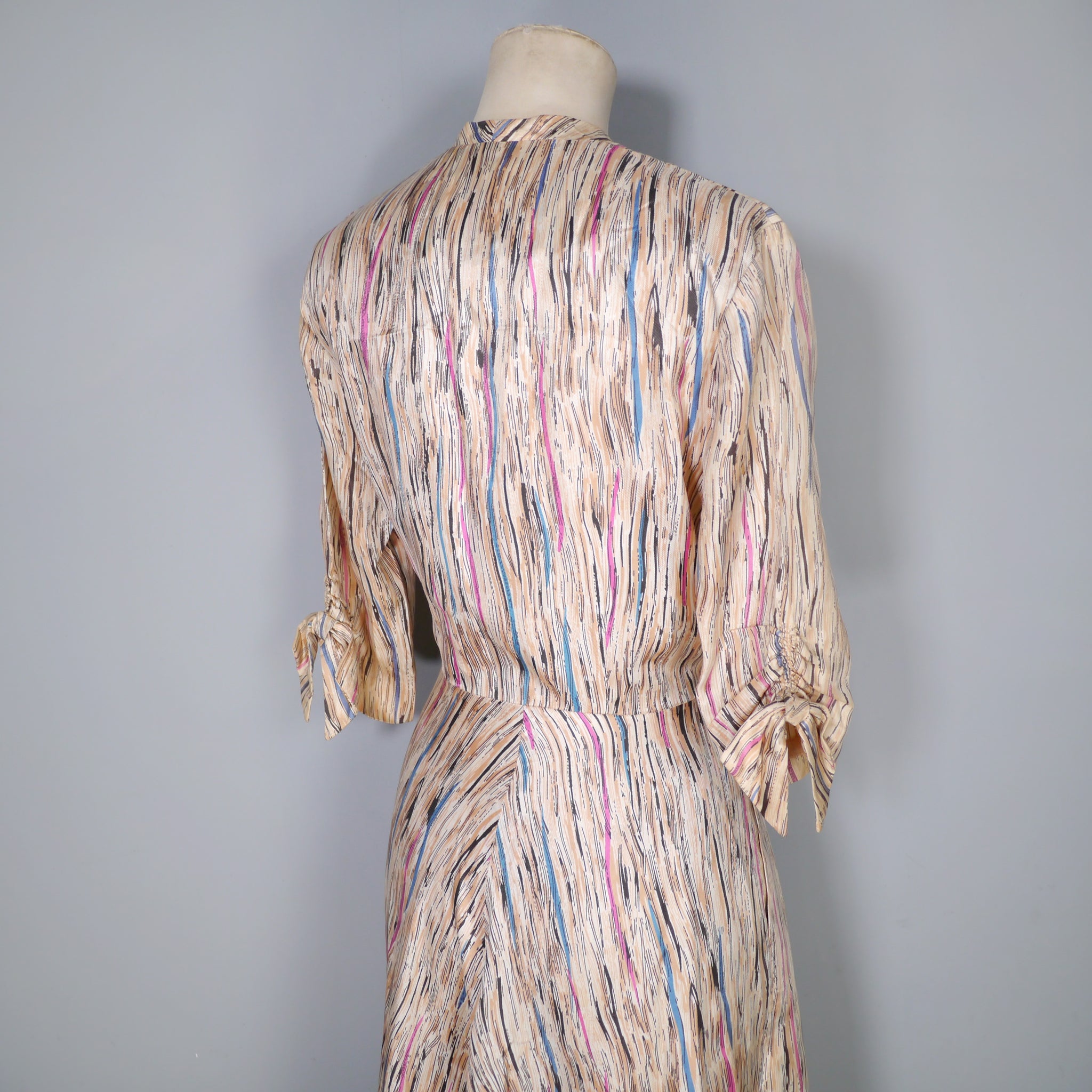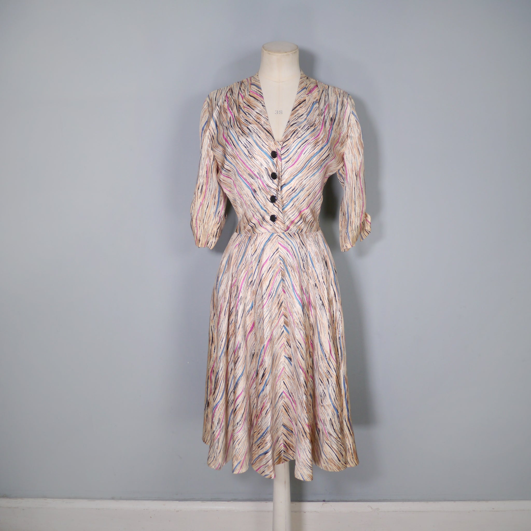 Soft silky bias cut late 40s dress by Leslie Fay. Slightly glossy silky fabric in a soft yellowy cream colour with a linear brushed print in black with streaks of purple, petrol blue and mauve lines running through it. Bias cut shirt bodice with four black buttons to the chest. V-neck with small shoulder pleats. Half sleeve with gathered stitches on the cuff, adorned with a little bow. Fitted waistband. Full skirt, sewn in four panels on the bias. Handy concealed slot pockets in the side seam, which we all LOVE! Side metal zipper to fasten.