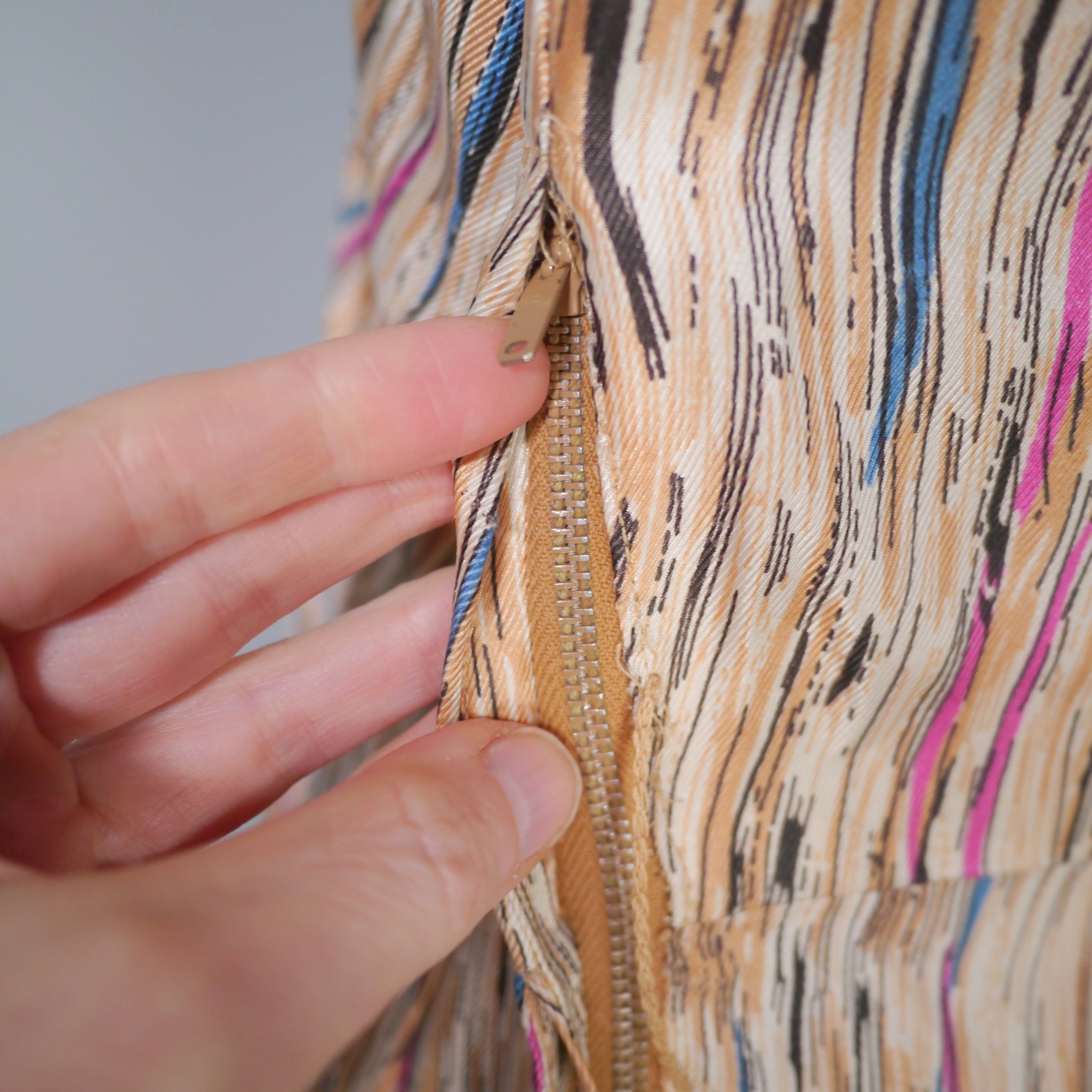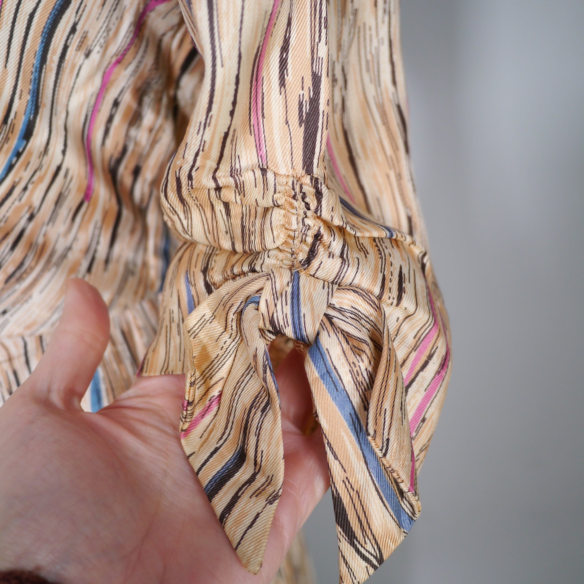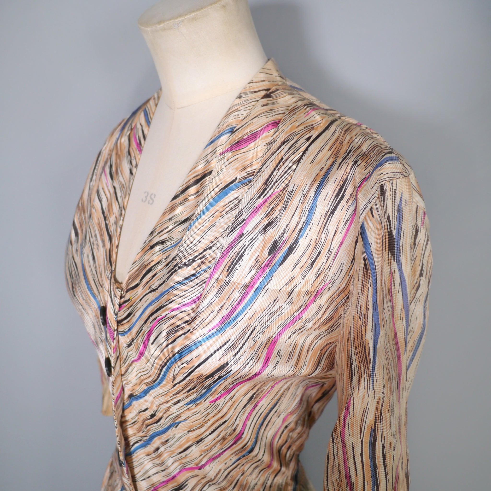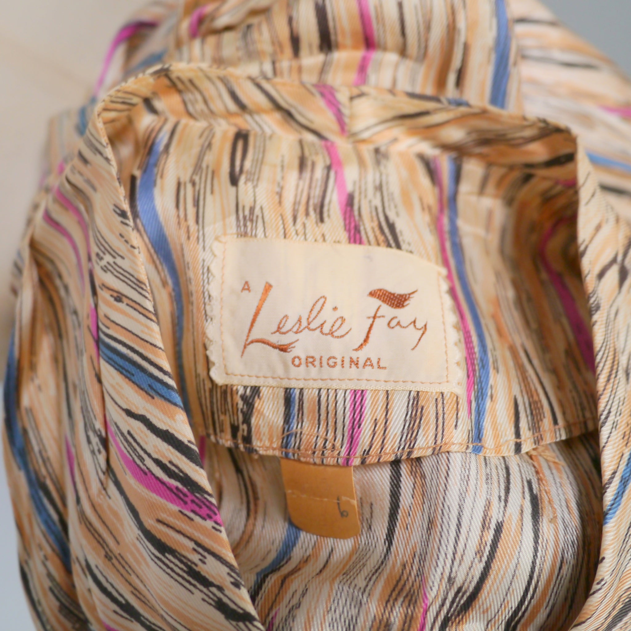 Soft silky bias cut late 40s dress by Leslie Fay. Slightly glossy silky fabric in a soft yellowy cream colour with a linear brushed print in black with streaks of purple, petrol blue and mauve lines running through it. Bias cut shirt bodice with four black buttons to the chest. V-neck with small shoulder pleats. Half sleeve with gathered stitches on the cuff, adorned with a little bow. Fitted waistband. Full skirt, sewn in four panels on the bias. Handy concealed slot pockets in the side seam, which we all LOVE! Side metal zipper to fasten.