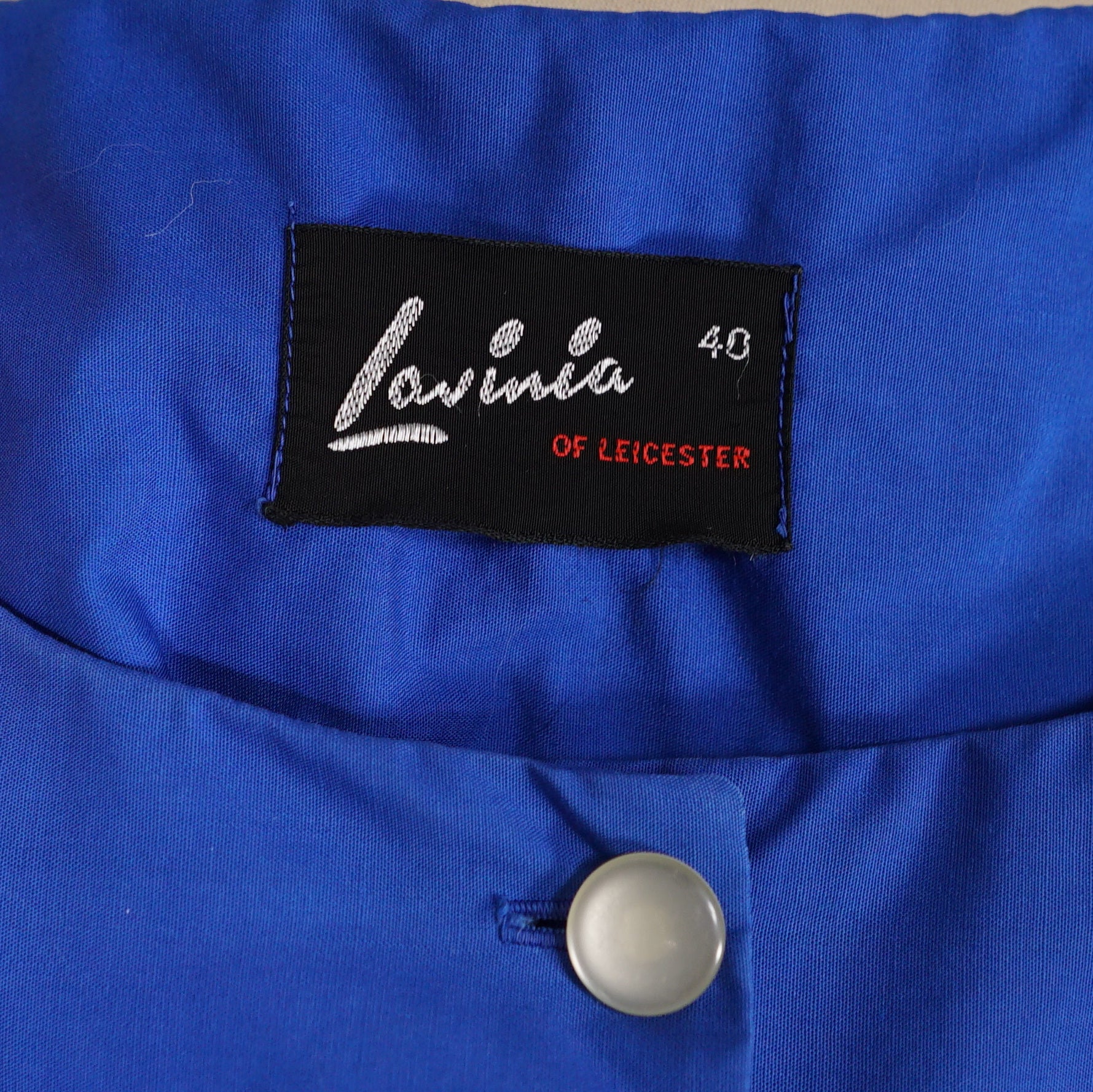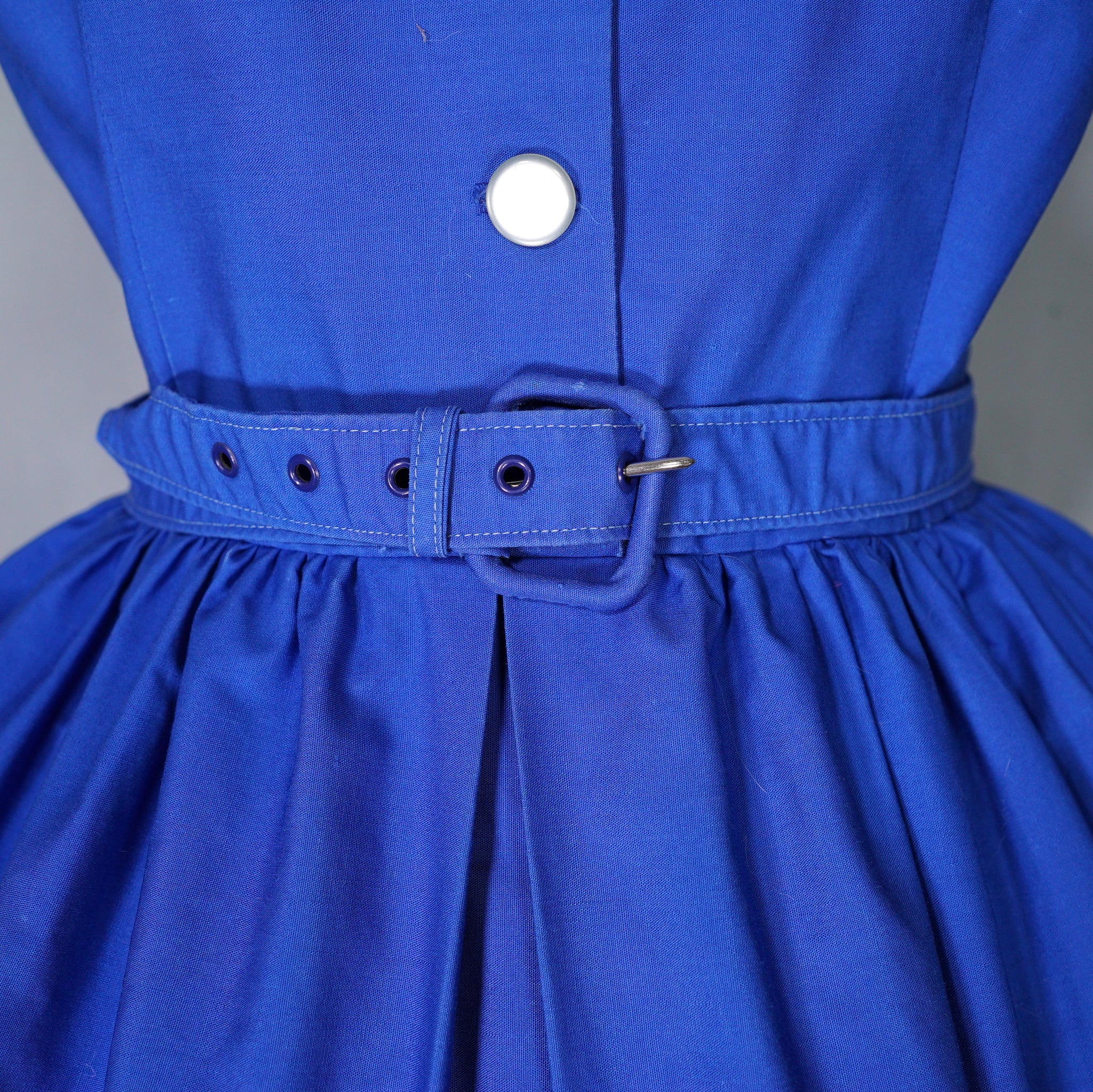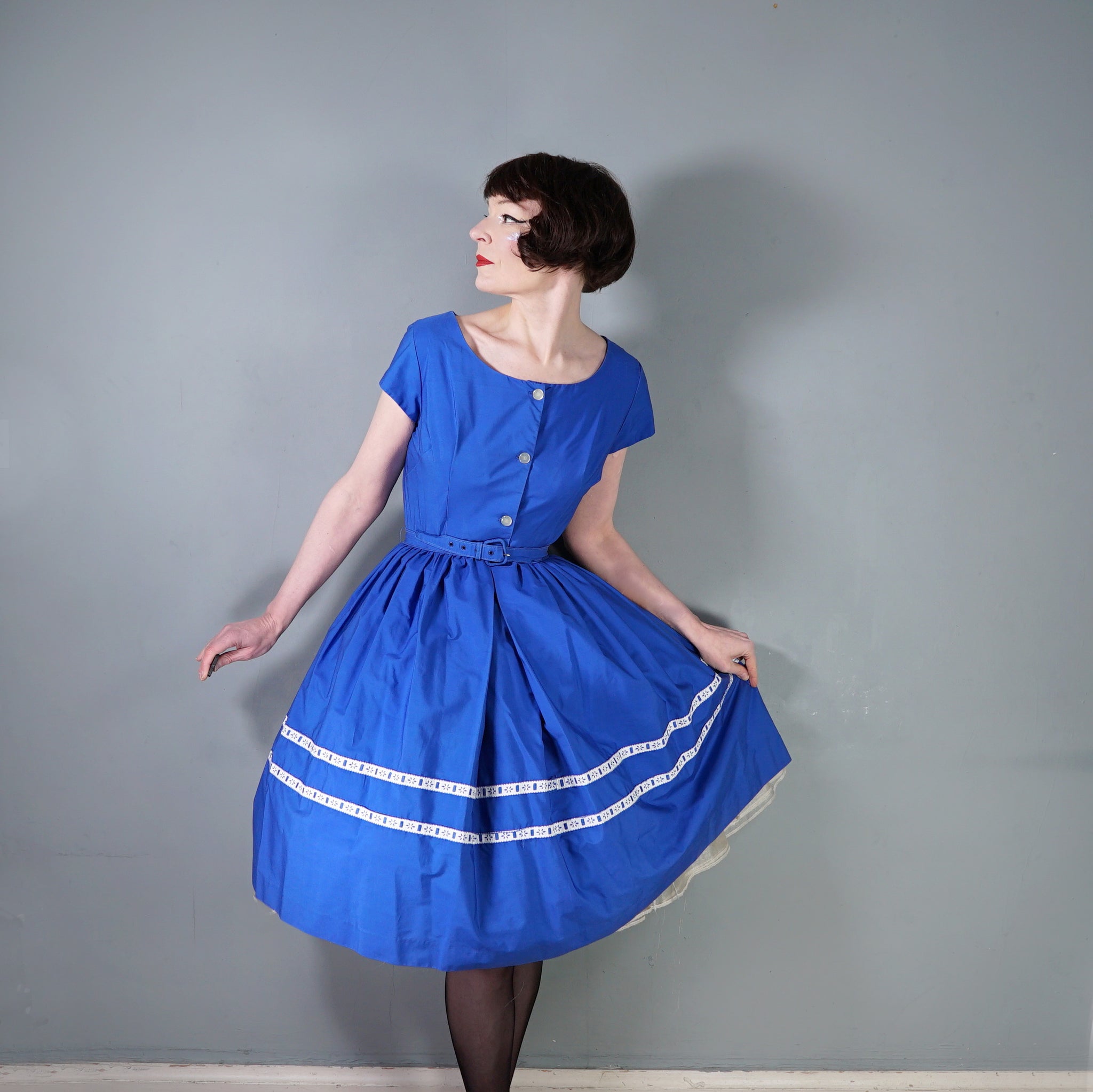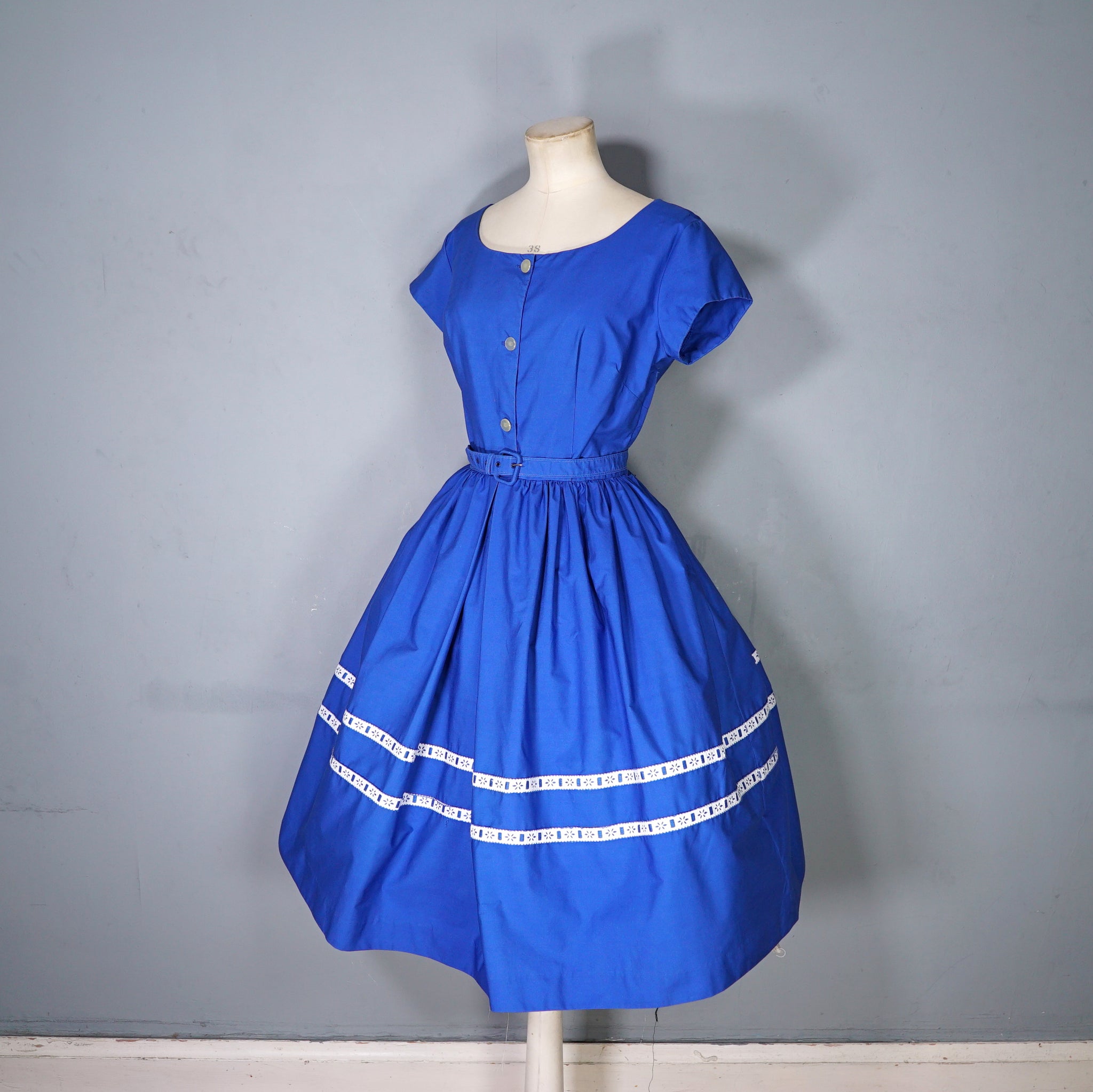 Early 60s day dress by Lavinia of Leicester in a lovely deep blue coloured thicker cotton. Shirtwaist style with three small buttons to the front of the bodice and a deep scooped neckline. Short sleeve. Fitted waist with matching belt. Full skirt sewn in gathers with two rows of white ribbon trims around the hem. Side metal zipper to fasten.
