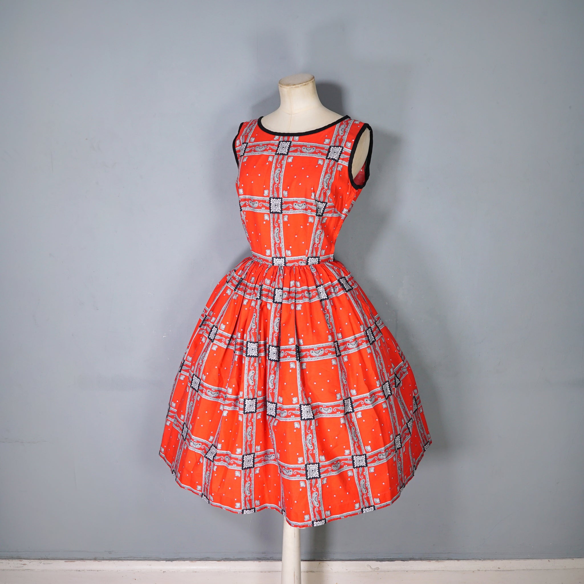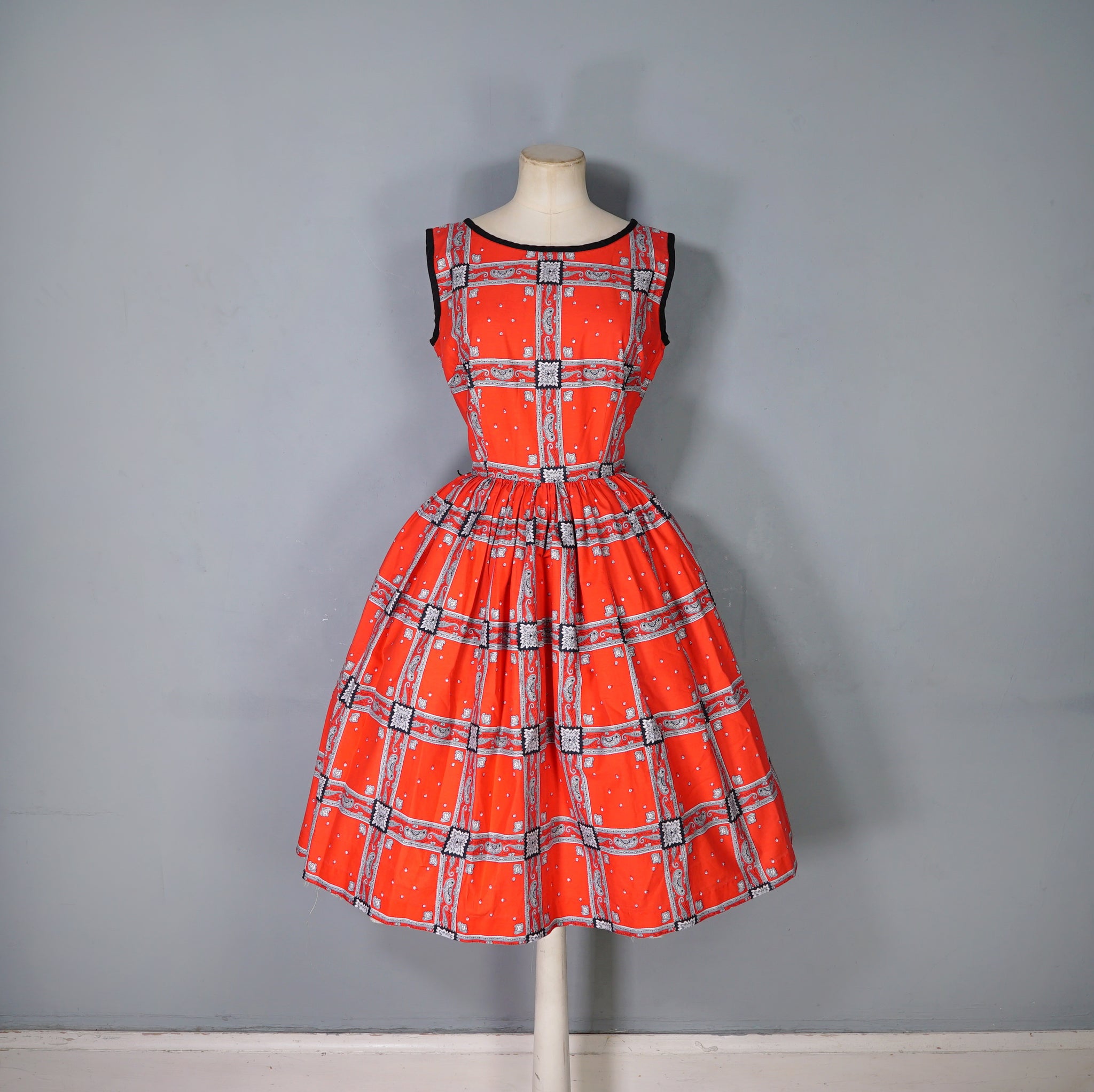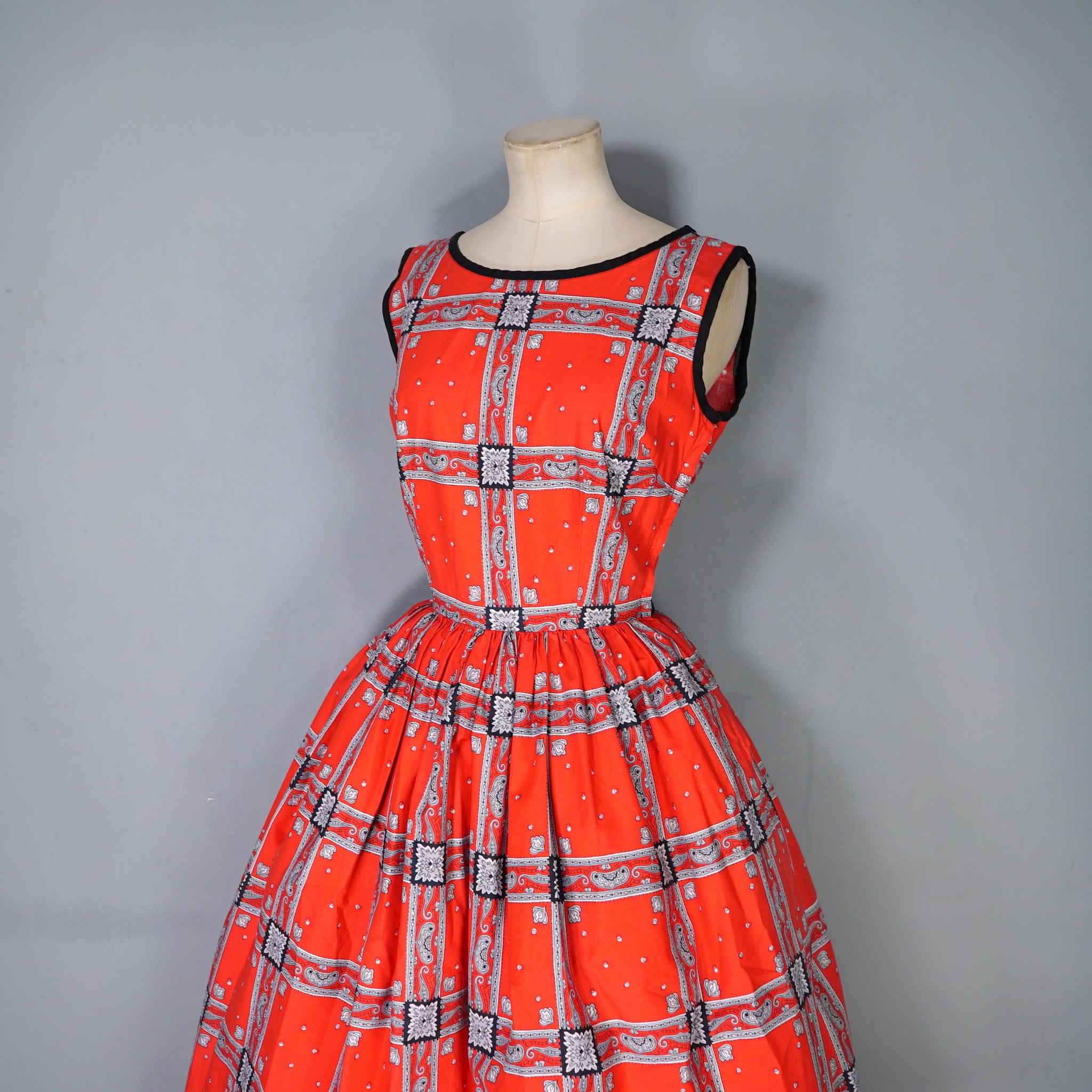 Striking colourful red late 50s / early 60s cotton day dress in a really rich red with a hanky/scarf print in black and grey. Fitted bodice with sleeveless cut and black neck and arm piping. Wide rounded neck. Fitted waistband with a side metal zip. Full skirt sewn in gathers. No makers labels.