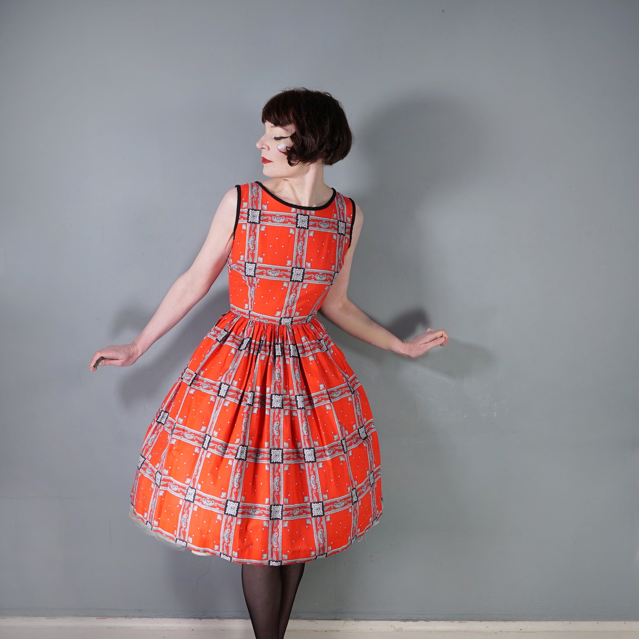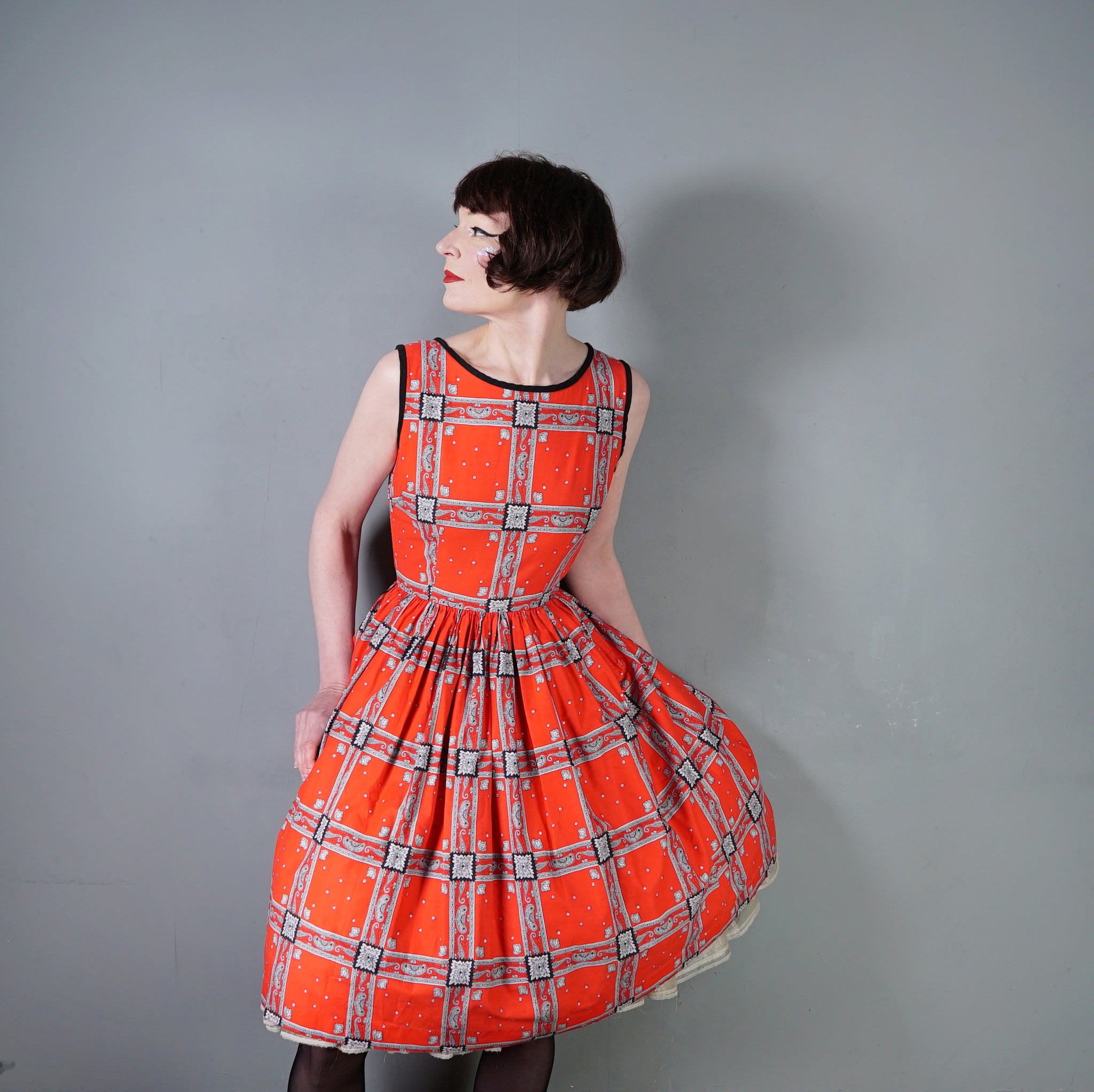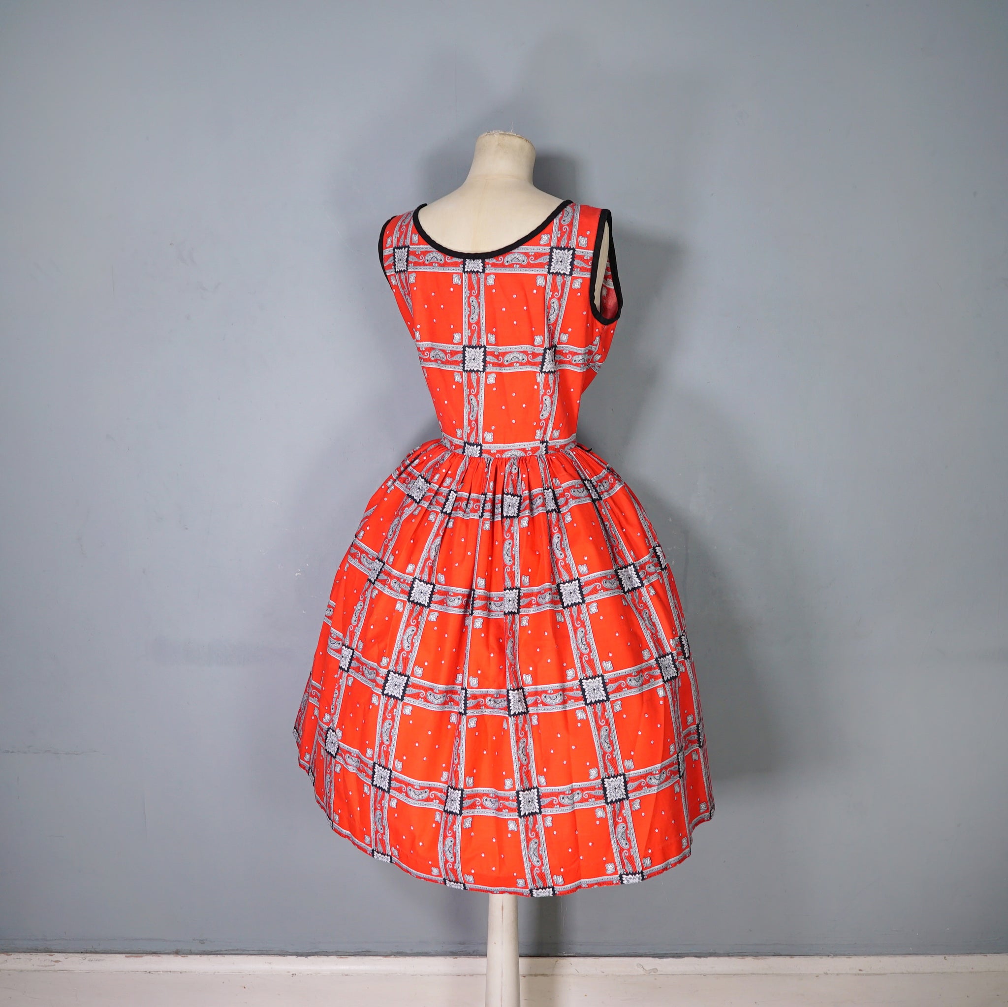 Striking colourful red late 50s / early 60s cotton day dress in a really rich red with a hanky/scarf print in black and grey. Fitted bodice with sleeveless cut and black neck and arm piping. Wide rounded neck. Fitted waistband with a side metal zip. Full skirt sewn in gathers. No makers labels.