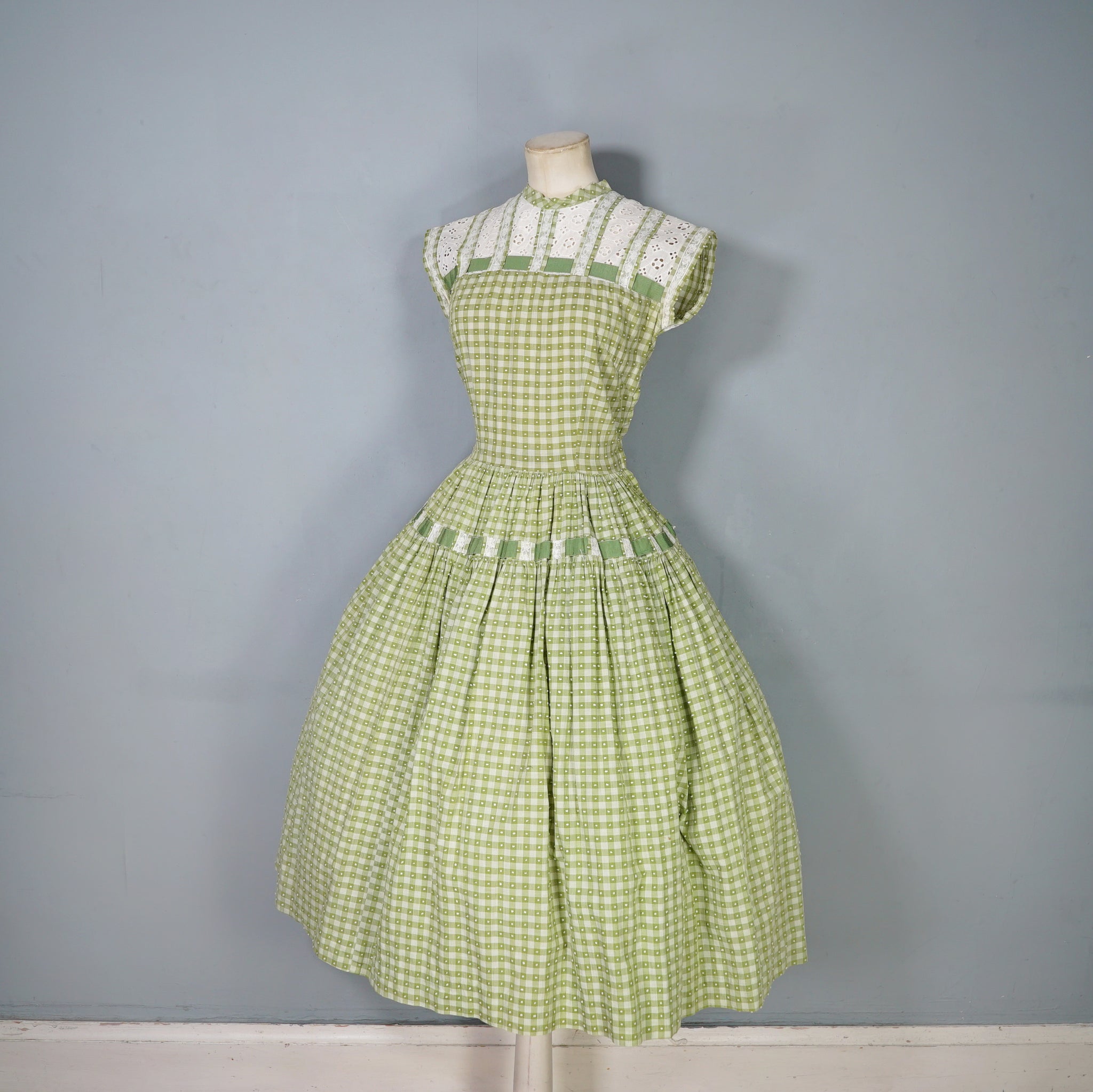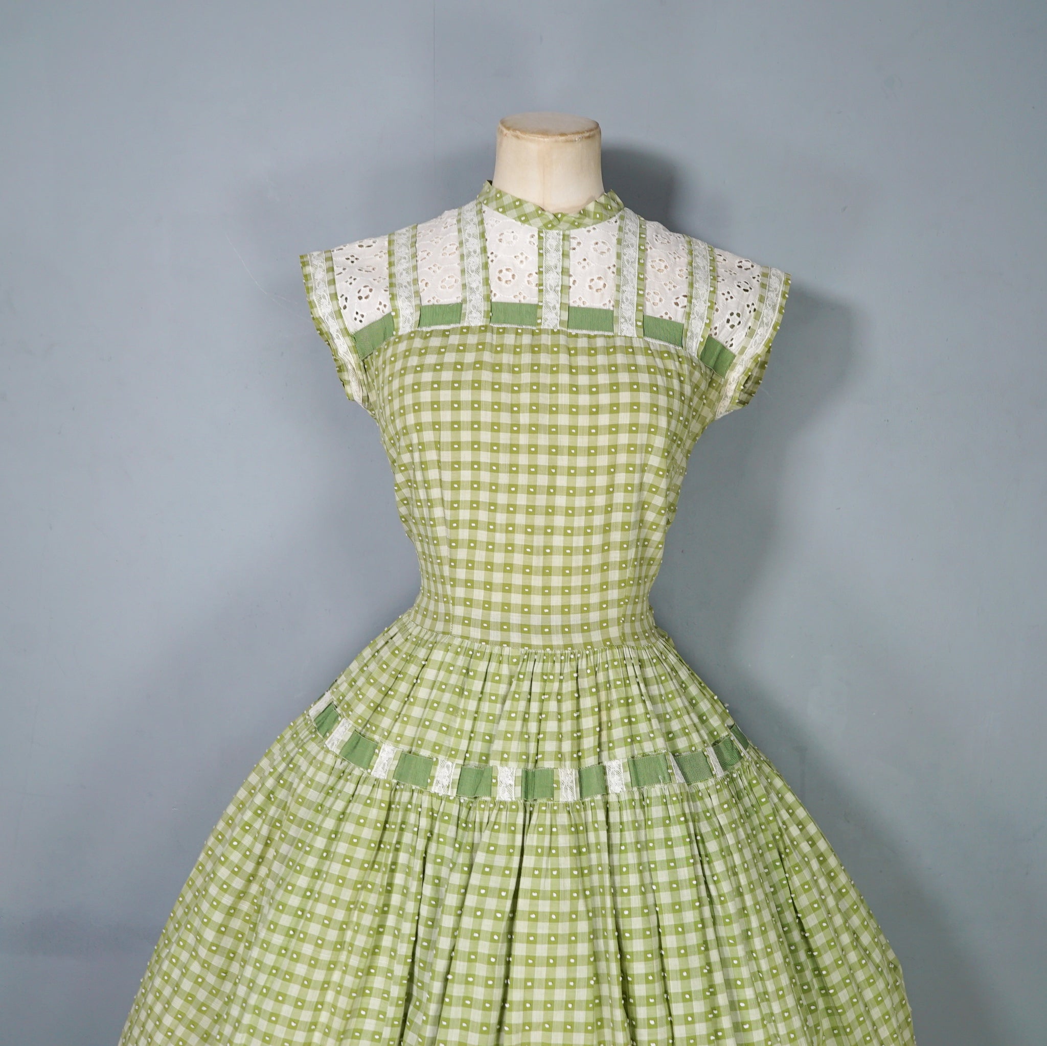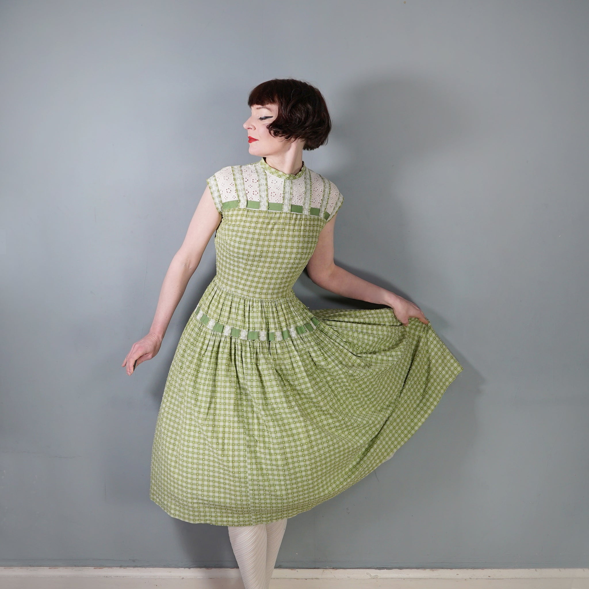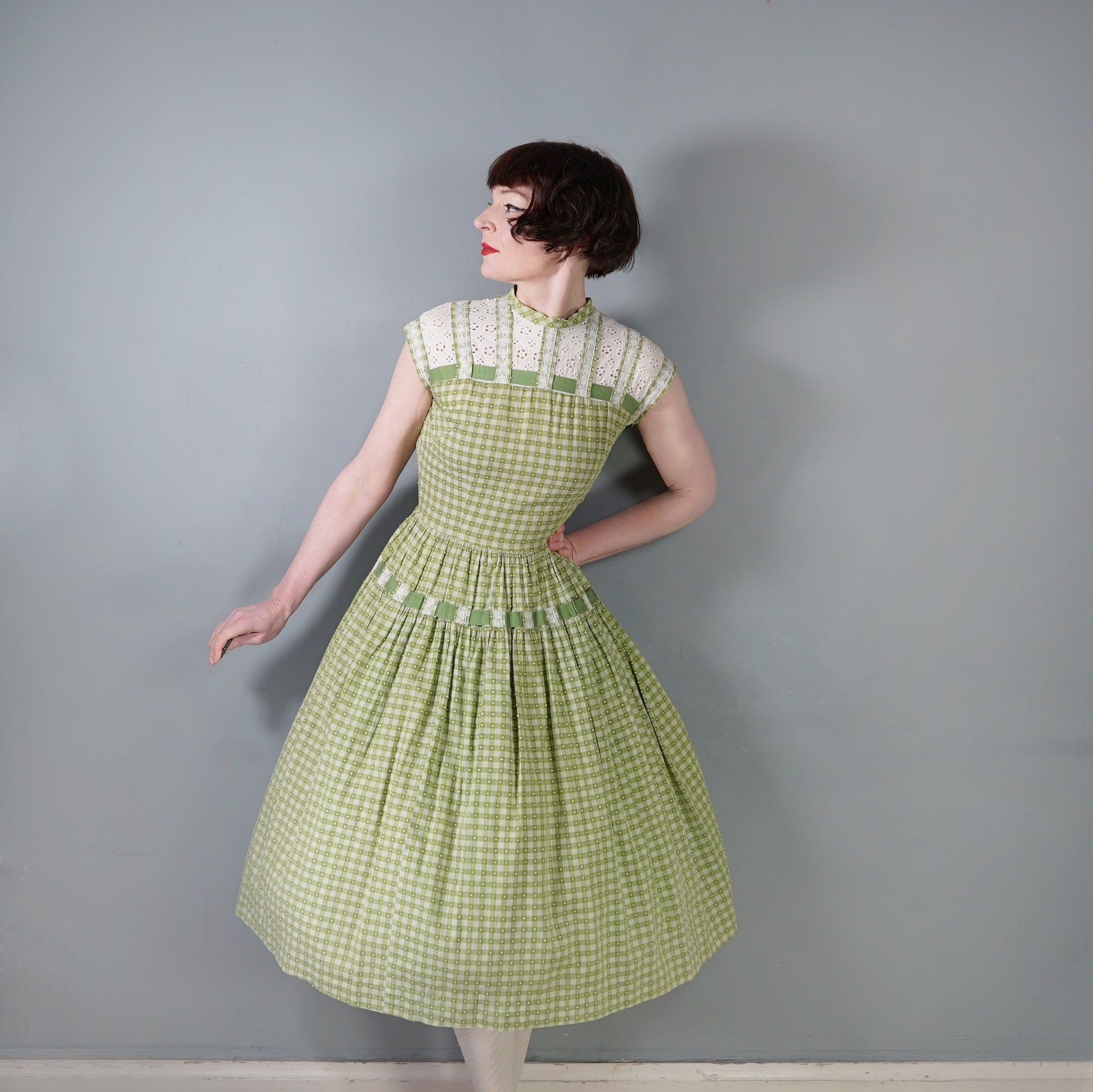 Elegant green checkered light cotton dress from the 1950s by Vicky Vaugn. Gorgeous cotton with green checks and small textured bobble pattern. Neck and is finished with a high neck and a broderie anglaise band with checkered lace bands and green grosgrain ribbon. Bodice is fitted with a darted bust and fastens to the back with white buttons. Waist cinches the silhouette in and the skirt is very full with a generous midi length and a small lace and grosgrain band running over the upper hip. Side metal zipper to fasten.