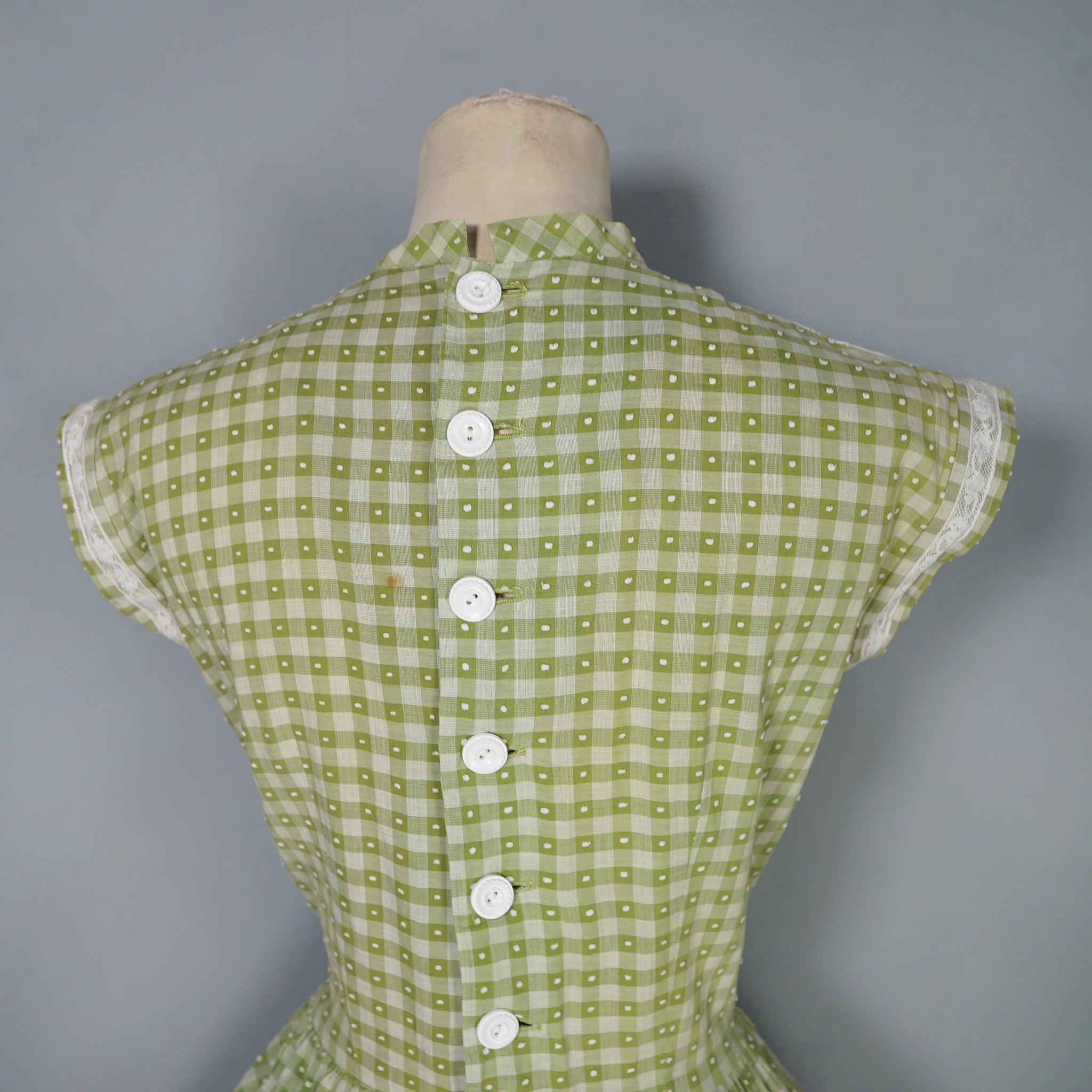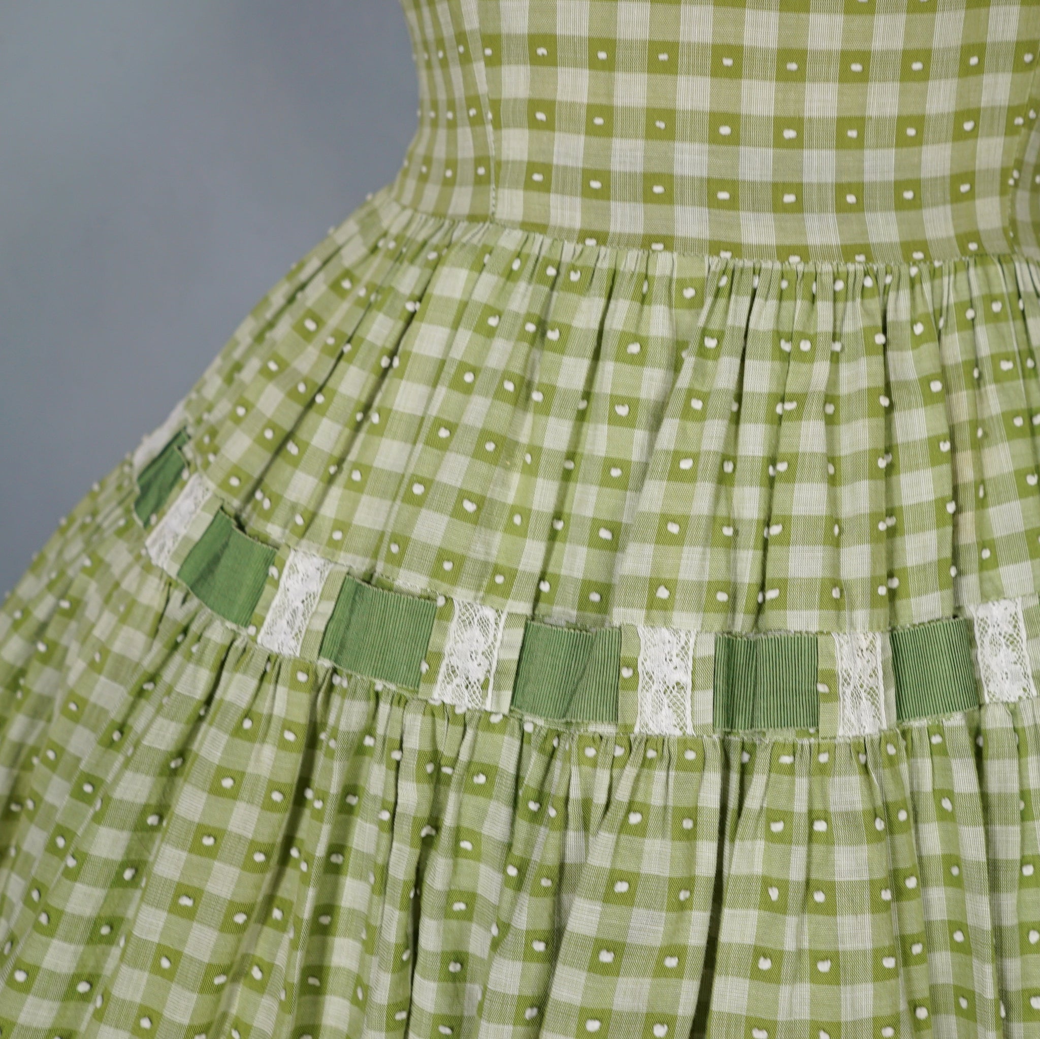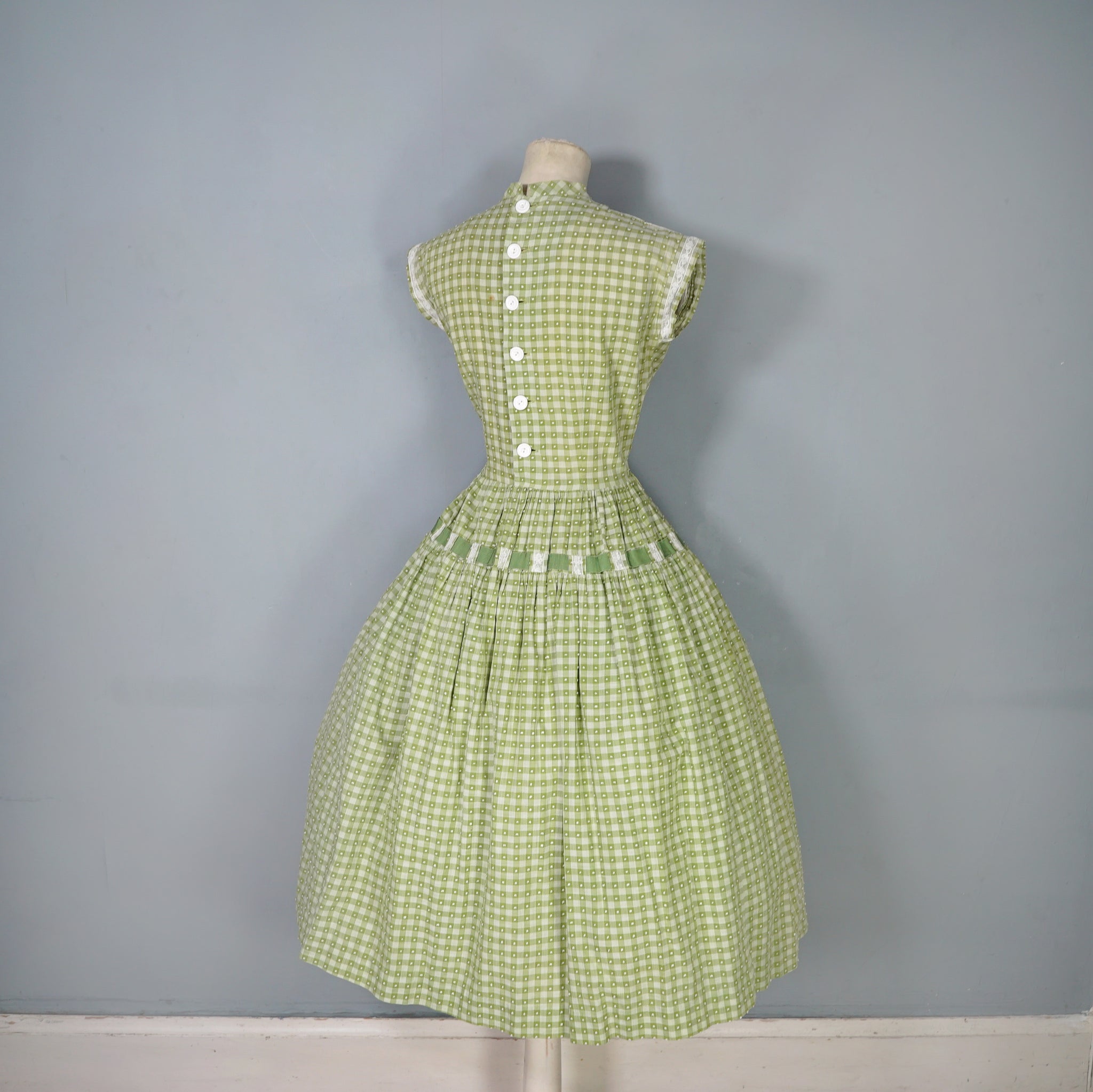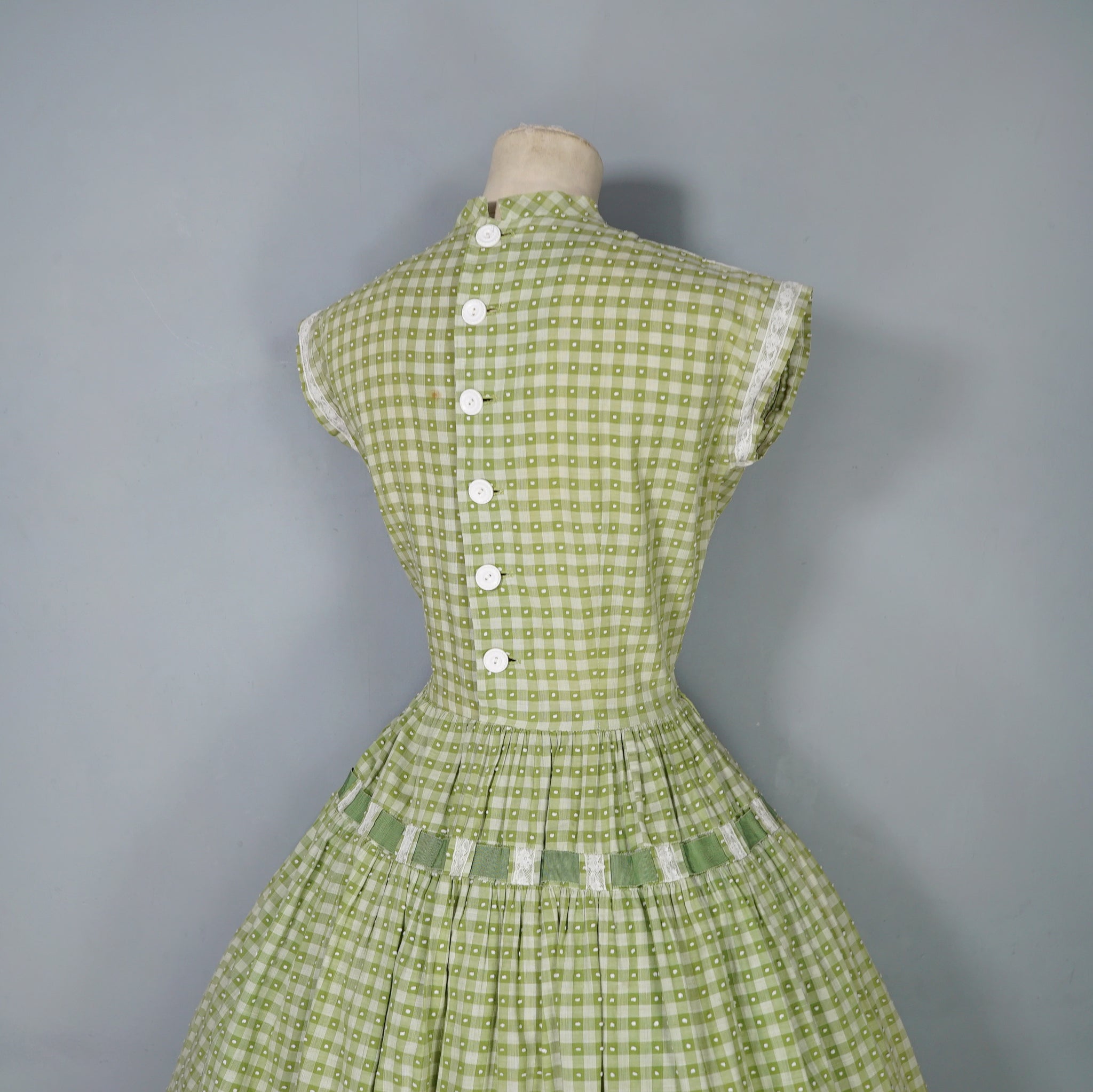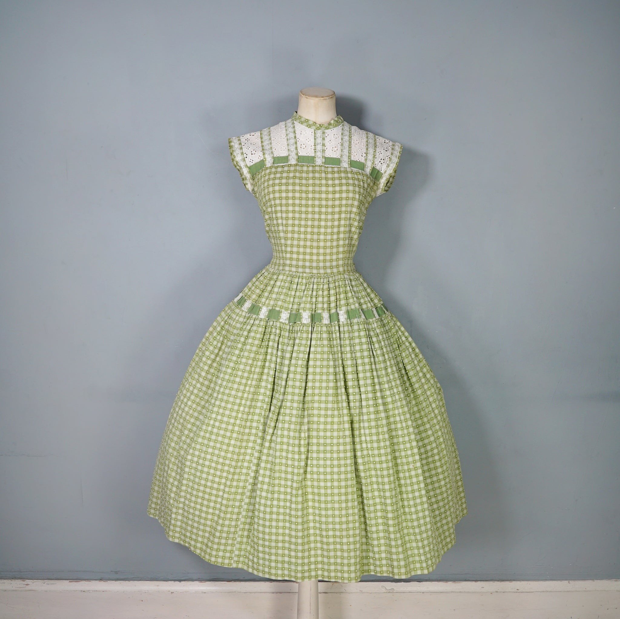 Elegant green checkered light cotton dress from the 1950s by Vicky Vaugn. Gorgeous cotton with green checks and small textured bobble pattern. Neck and is finished with a high neck and a broderie anglaise band with checkered lace bands and green grosgrain ribbon. Bodice is fitted with a darted bust and fastens to the back with white buttons. Waist cinches the silhouette in and the skirt is very full with a generous midi length and a small lace and grosgrain band running over the upper hip. Side metal zipper to fasten.
