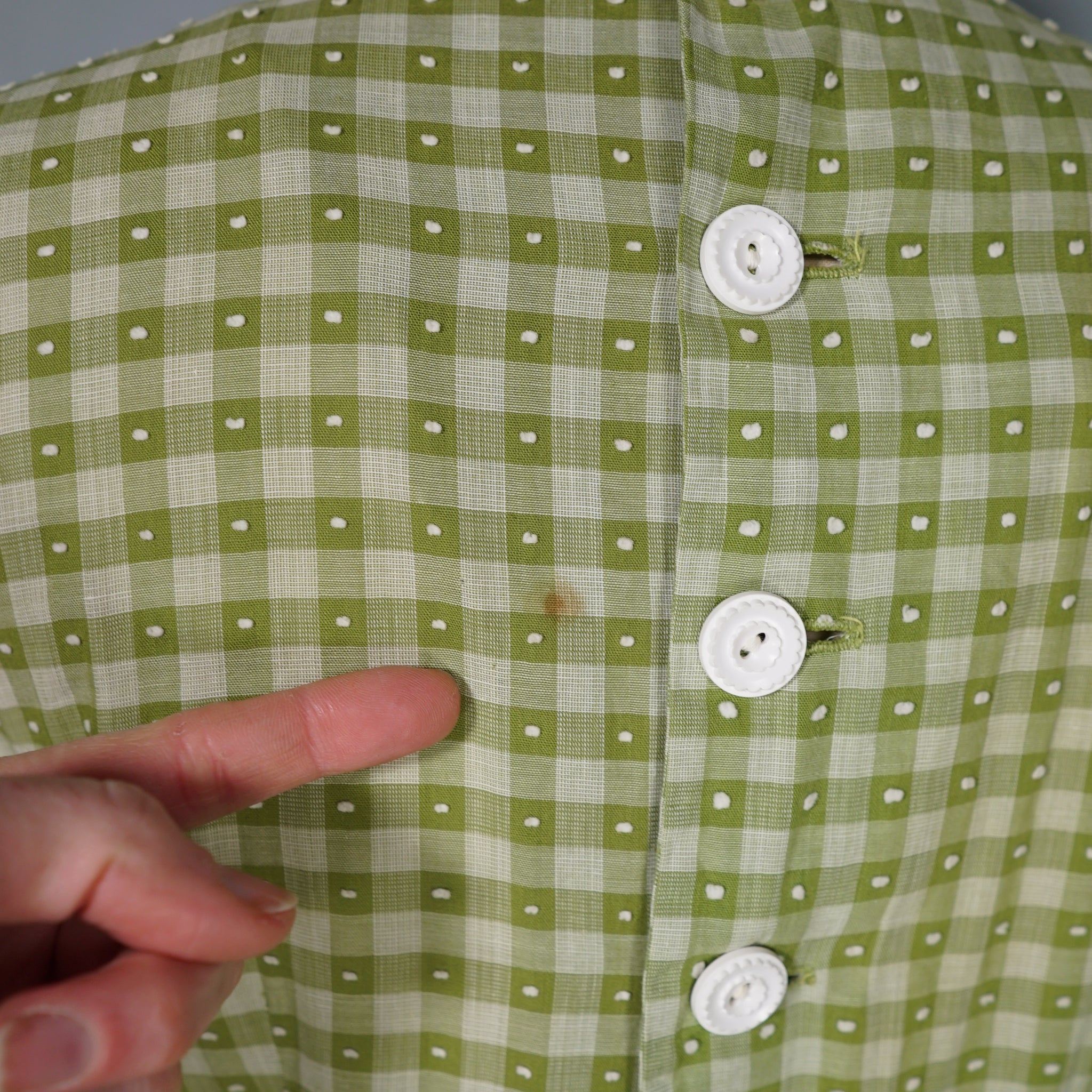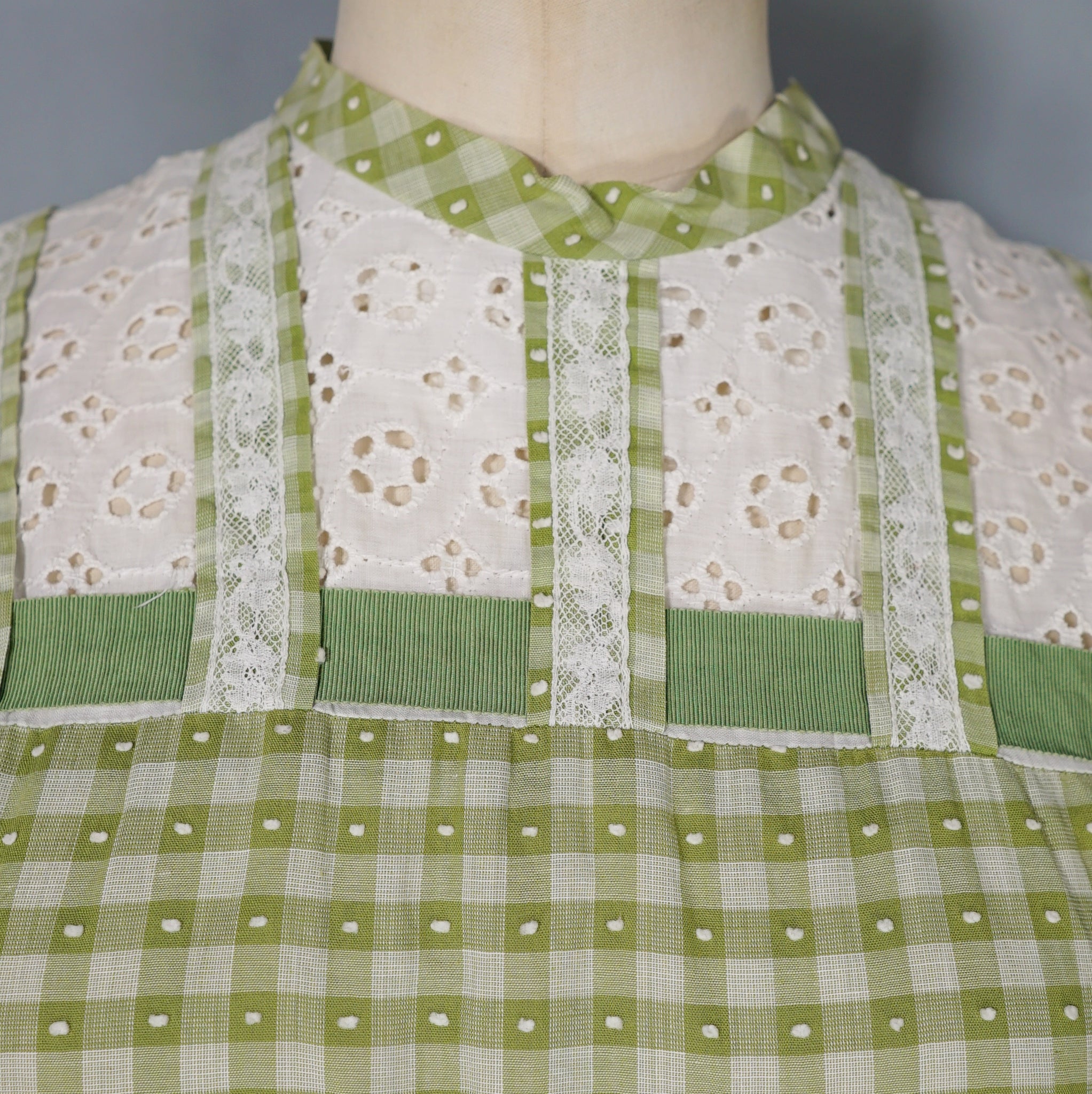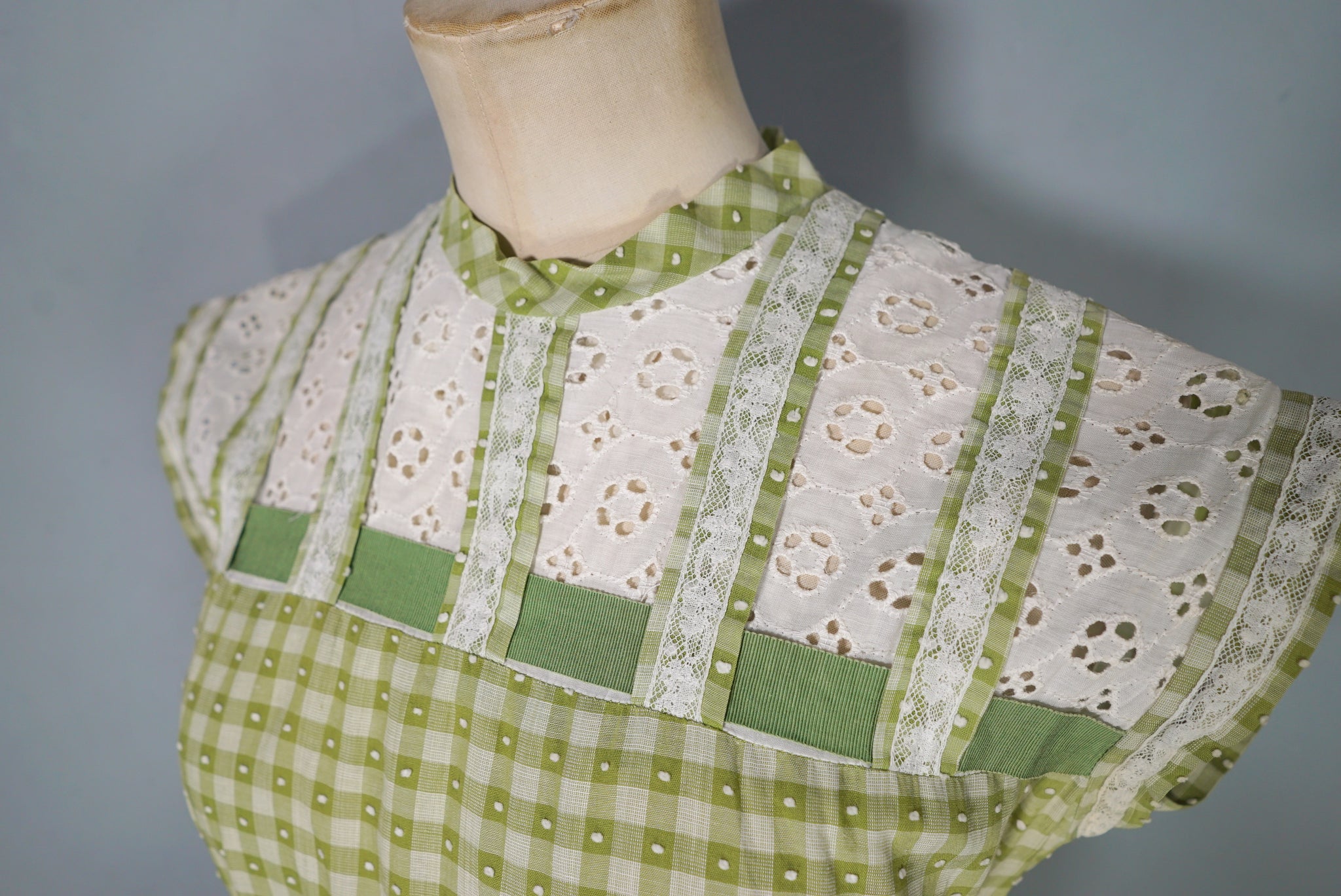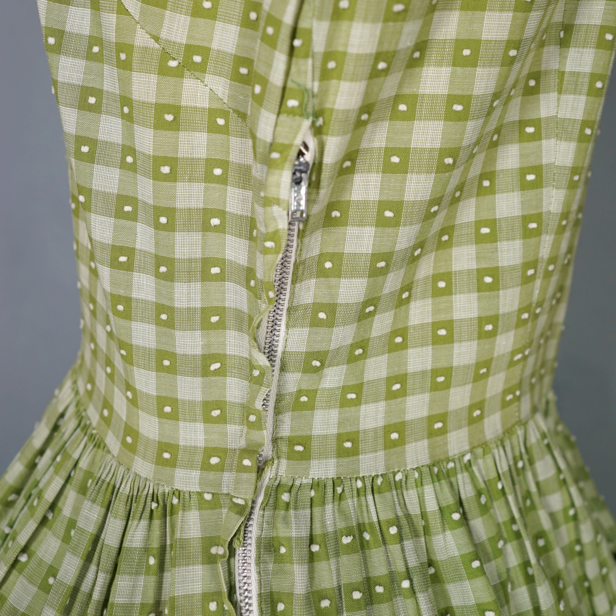 Elegant green checkered light cotton dress from the 1950s by Vicky Vaugn. Gorgeous cotton with green checks and small textured bobble pattern. Neck and is finished with a high neck and a broderie anglaise band with checkered lace bands and green grosgrain ribbon. Bodice is fitted with a darted bust and fastens to the back with white buttons. Waist cinches the silhouette in and the skirt is very full with a generous midi length and a small lace and grosgrain band running over the upper hip. Side metal zipper to fasten.