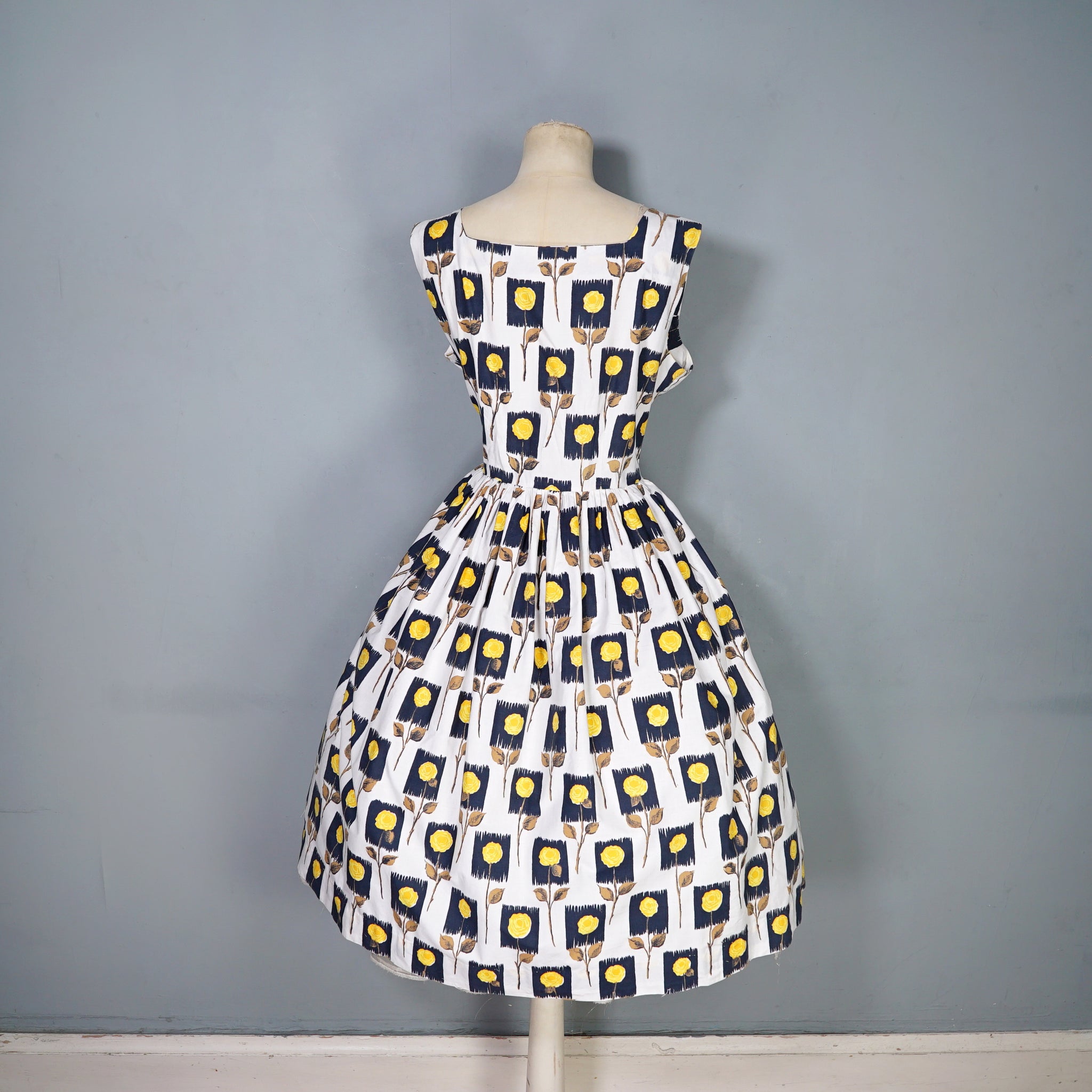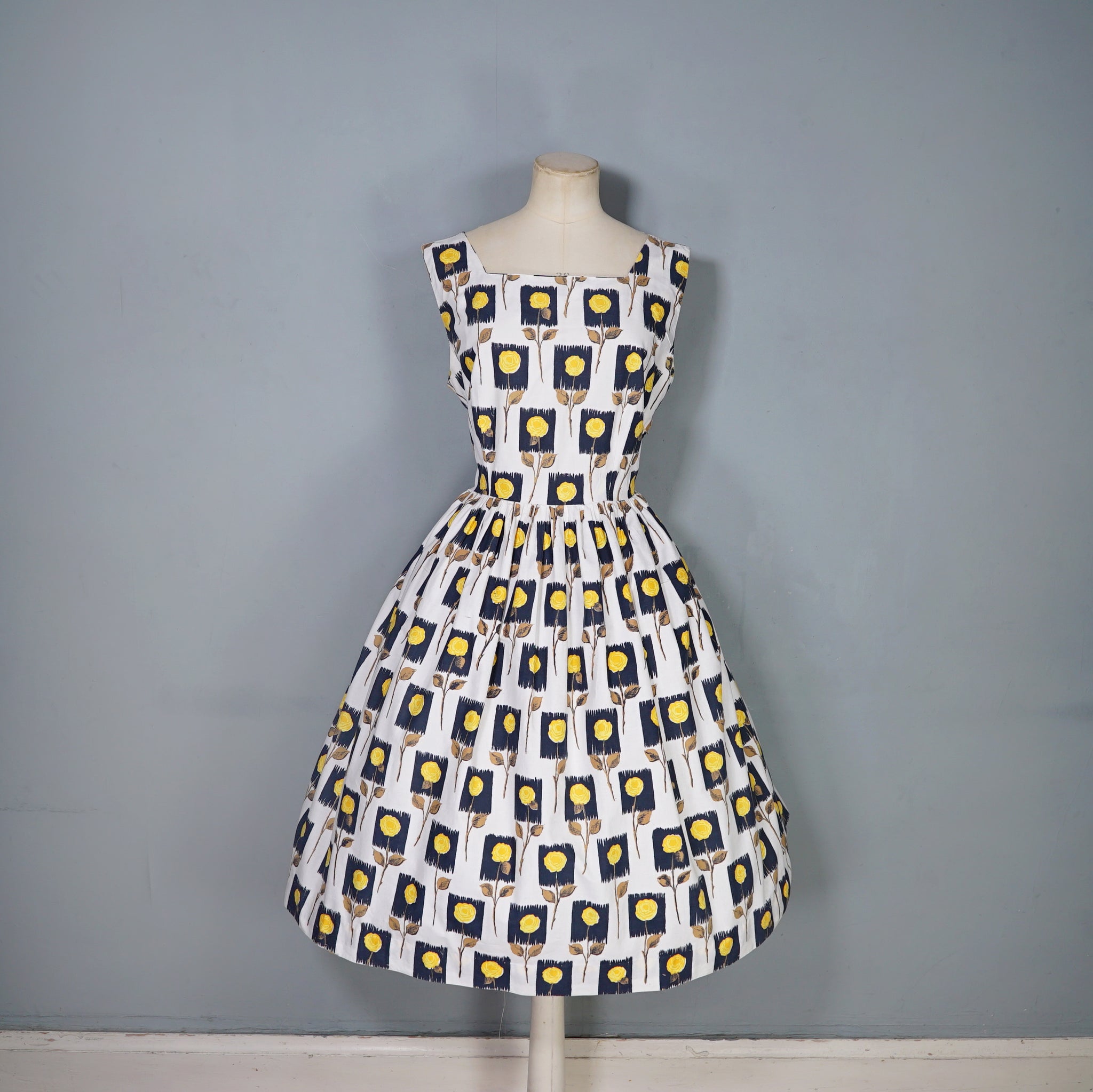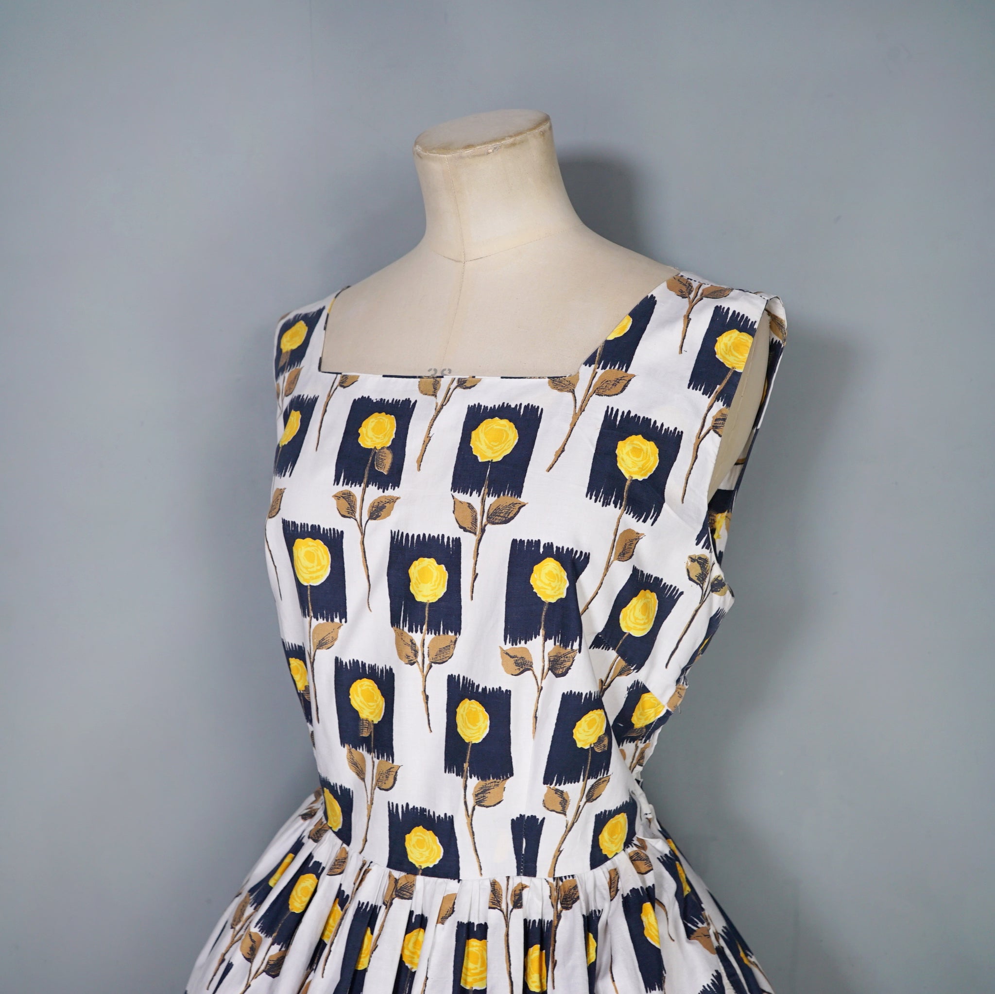 Lovely cotton day dress in white with a black and yellow stemmed rose print. Fitted sleeveless bodice with a wide square neck. Fitted waistband and full midi skirt sewn in gathers. Side metal zipper to fasten. No labels, just a small size tag to the back of the neck. Approx early 60s era, but still very much in the vein of the 50s.