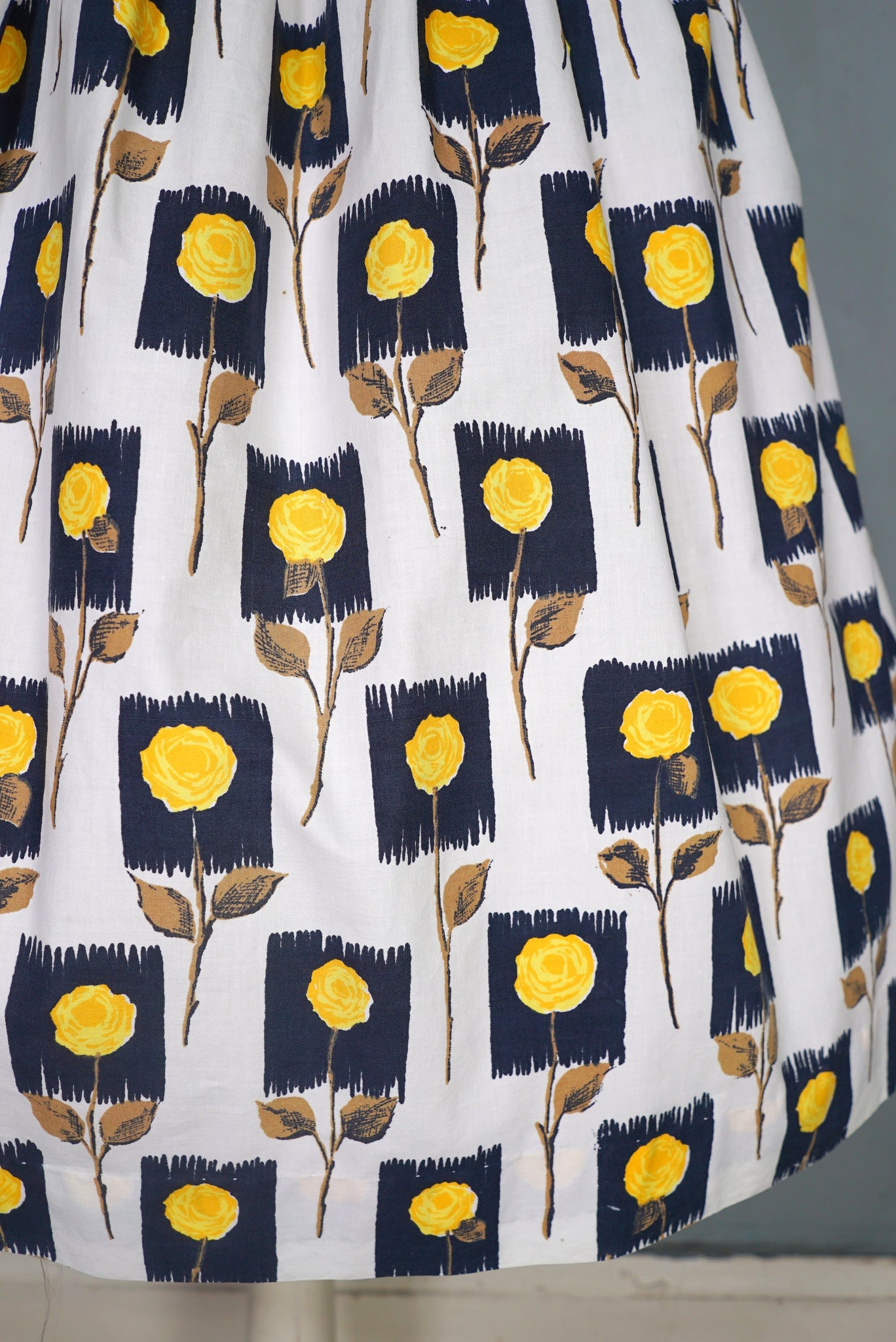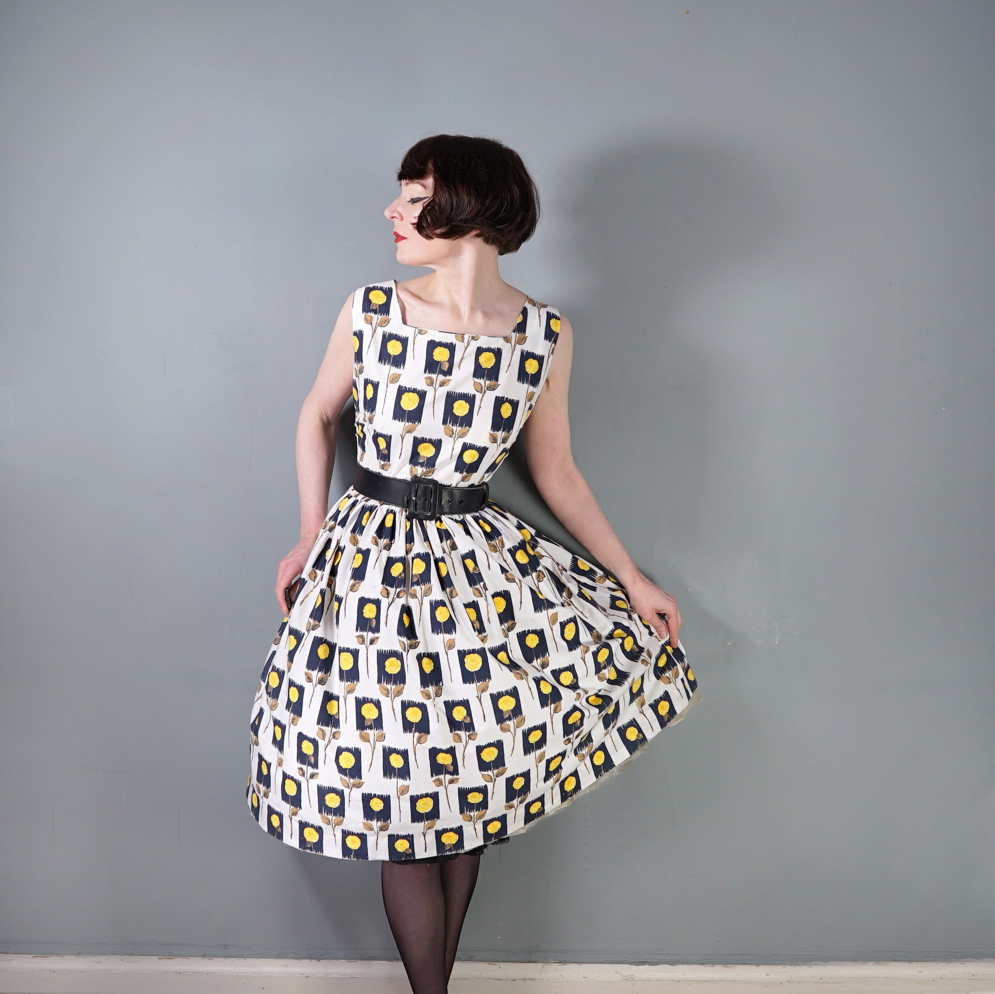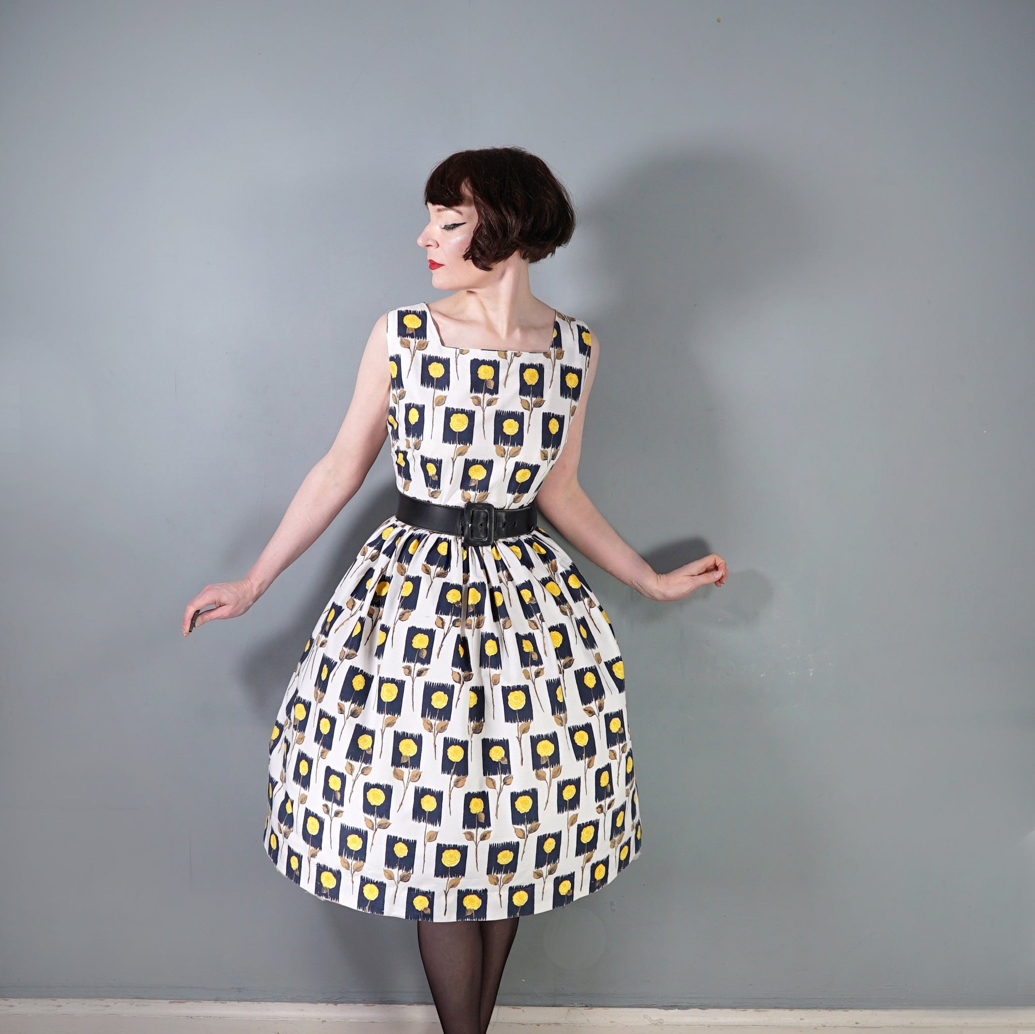 Lovely cotton day dress in white with a black and yellow stemmed rose print. Fitted sleeveless bodice with a wide square neck. Fitted waistband and full midi skirt sewn in gathers. Side metal zipper to fasten. No labels, just a small size tag to the back of the neck. Approx early 60s era, but still very much in the vein of the 50s.